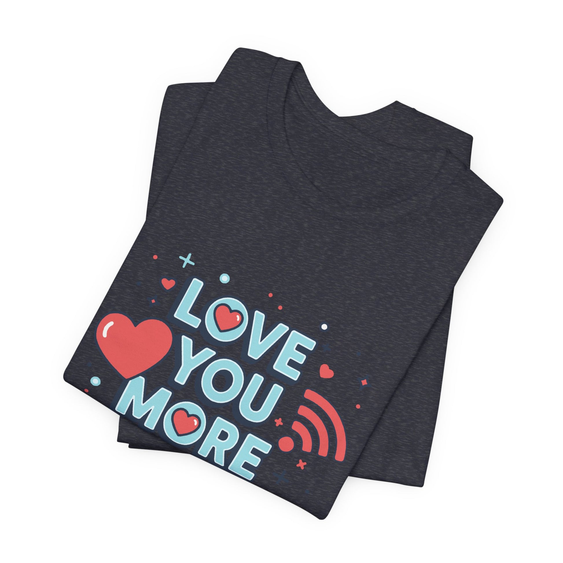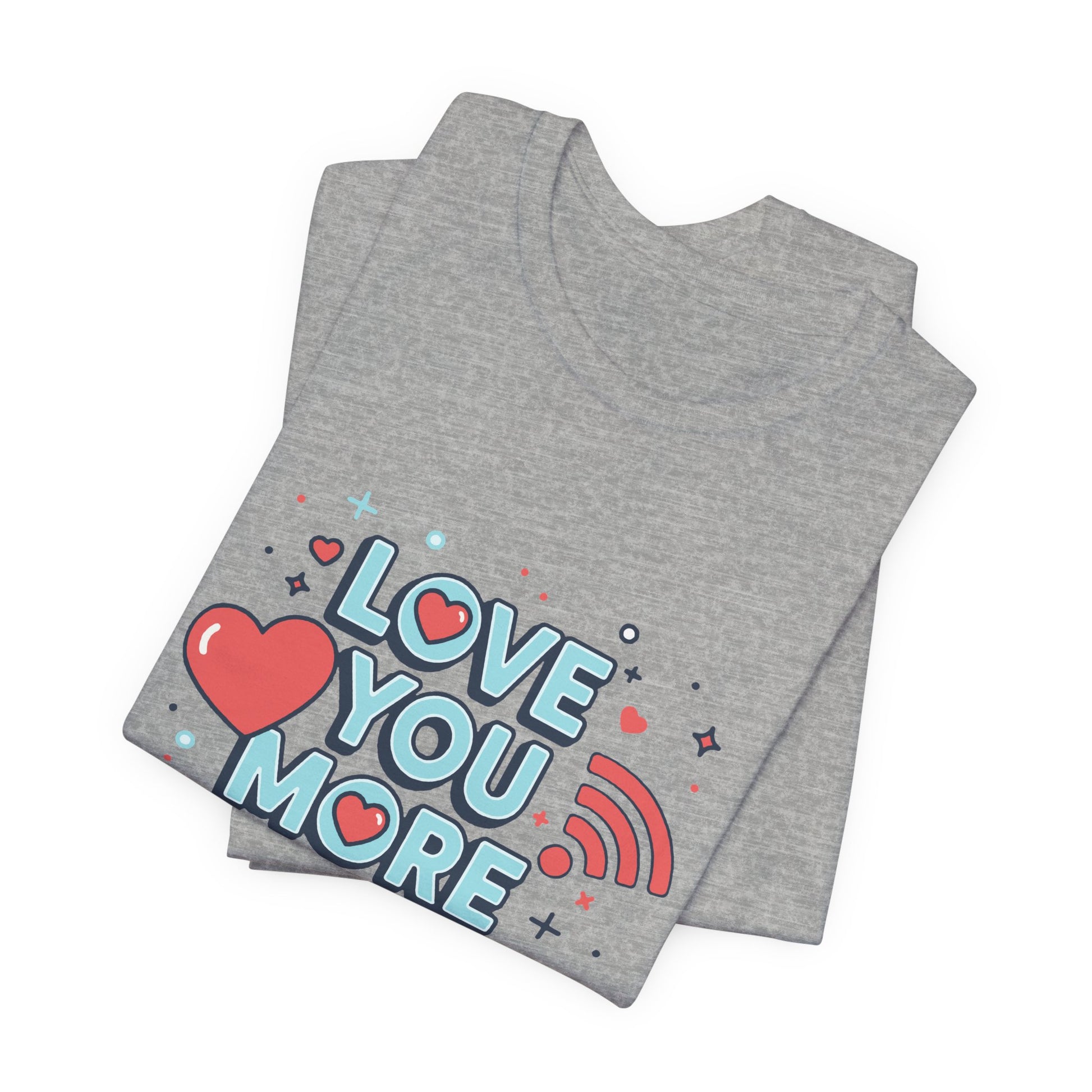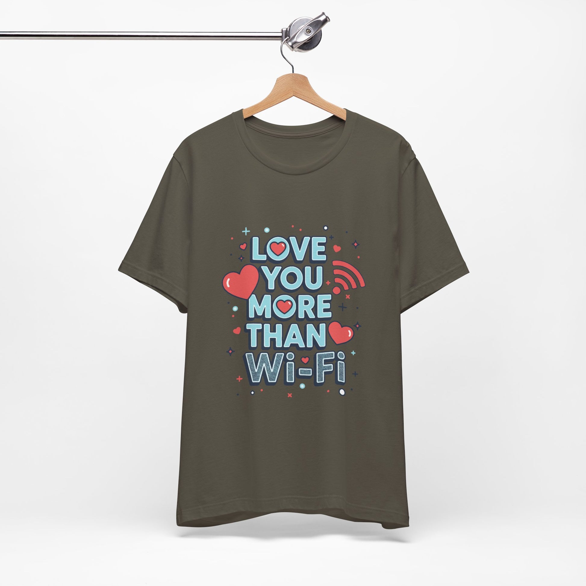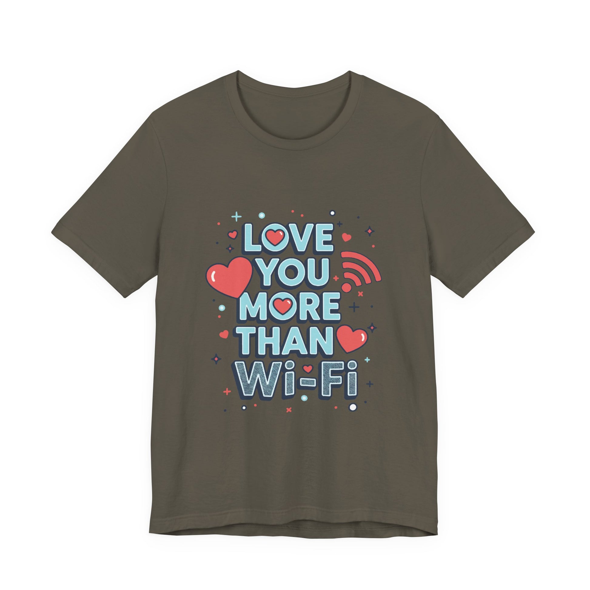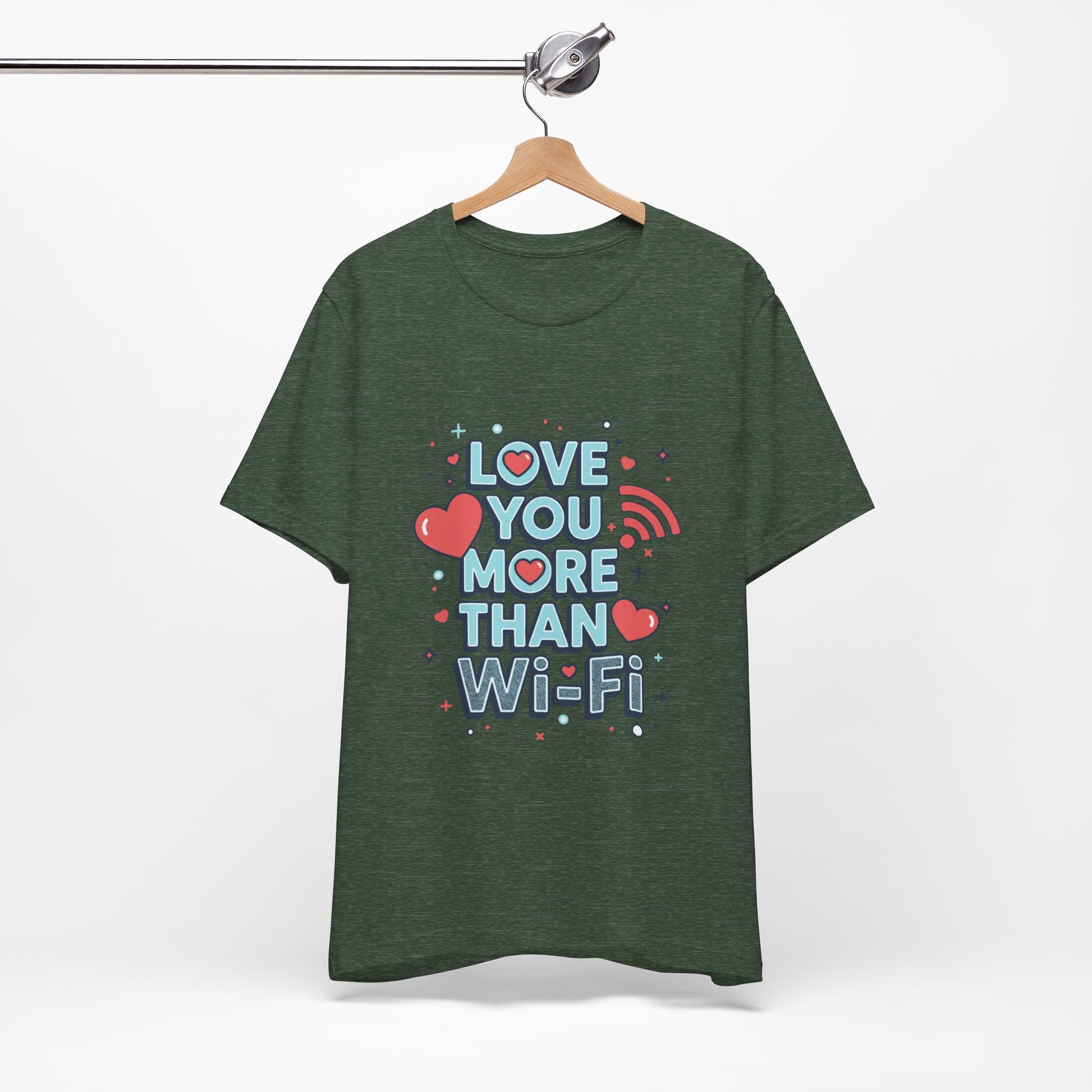 Lightweight and soft, this tee puts a little playful romance on your chest: a bright, hand-lettered block that reads “Love You More Than Wi‑Fi,” accented with hearts and a tiny signal icon. The airy 100% Airlume combed and ring‑spun cotton feels breathable for all-day wear and layers cleanly under jackets or sweaters. Side seams and shoulder tape keep the shape crisp through washes. It’s a casual, honest way to say what you feel—whether you’re lounging at home, grabbing coffee with your person, or sending a flirty snapshot midday.