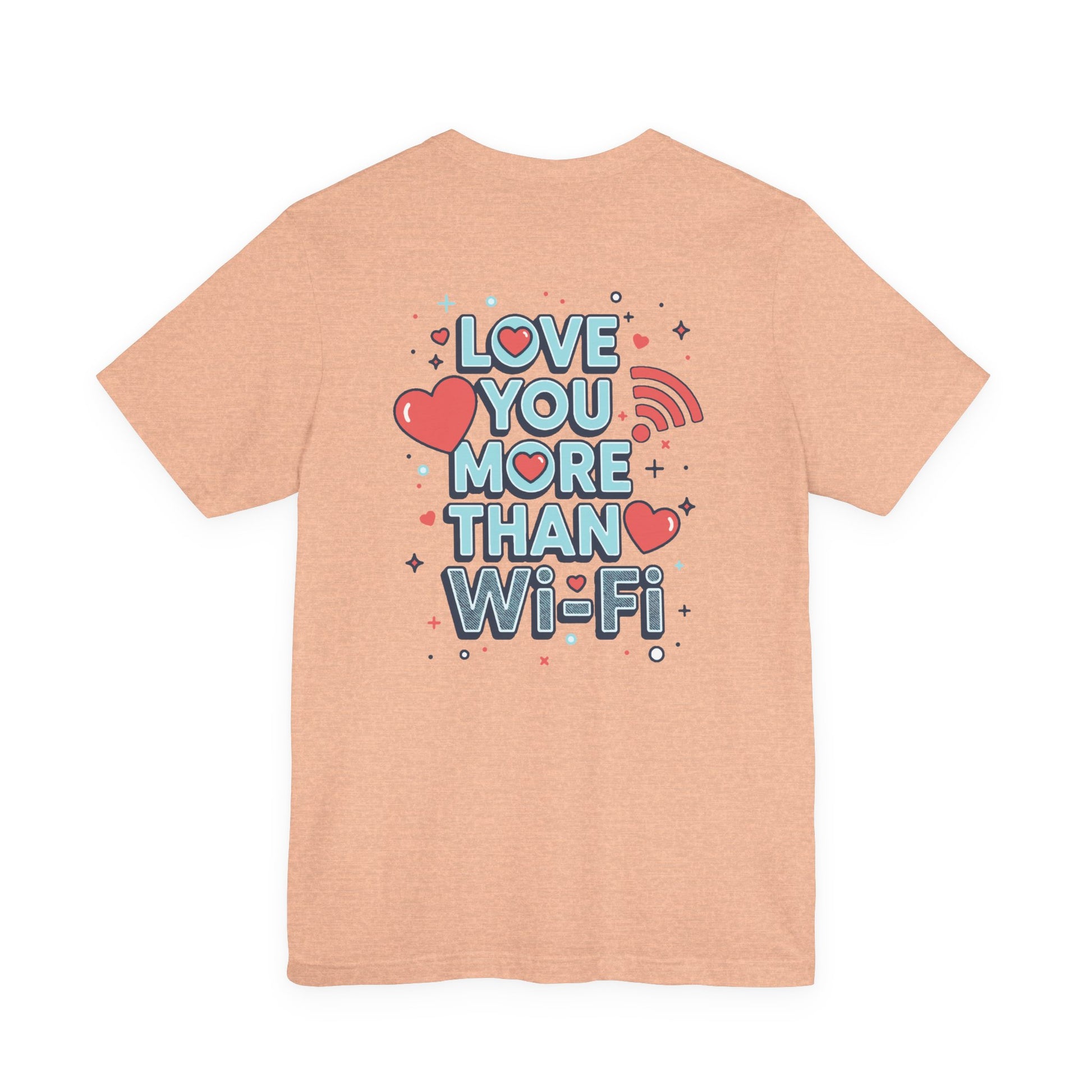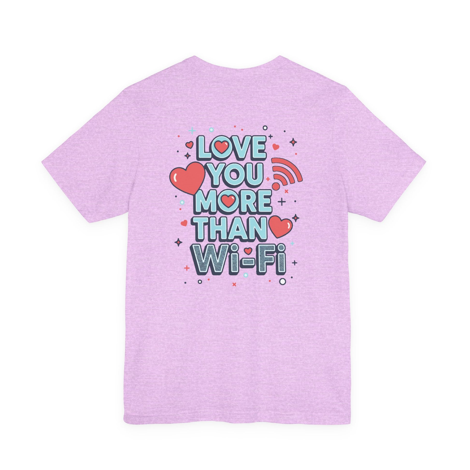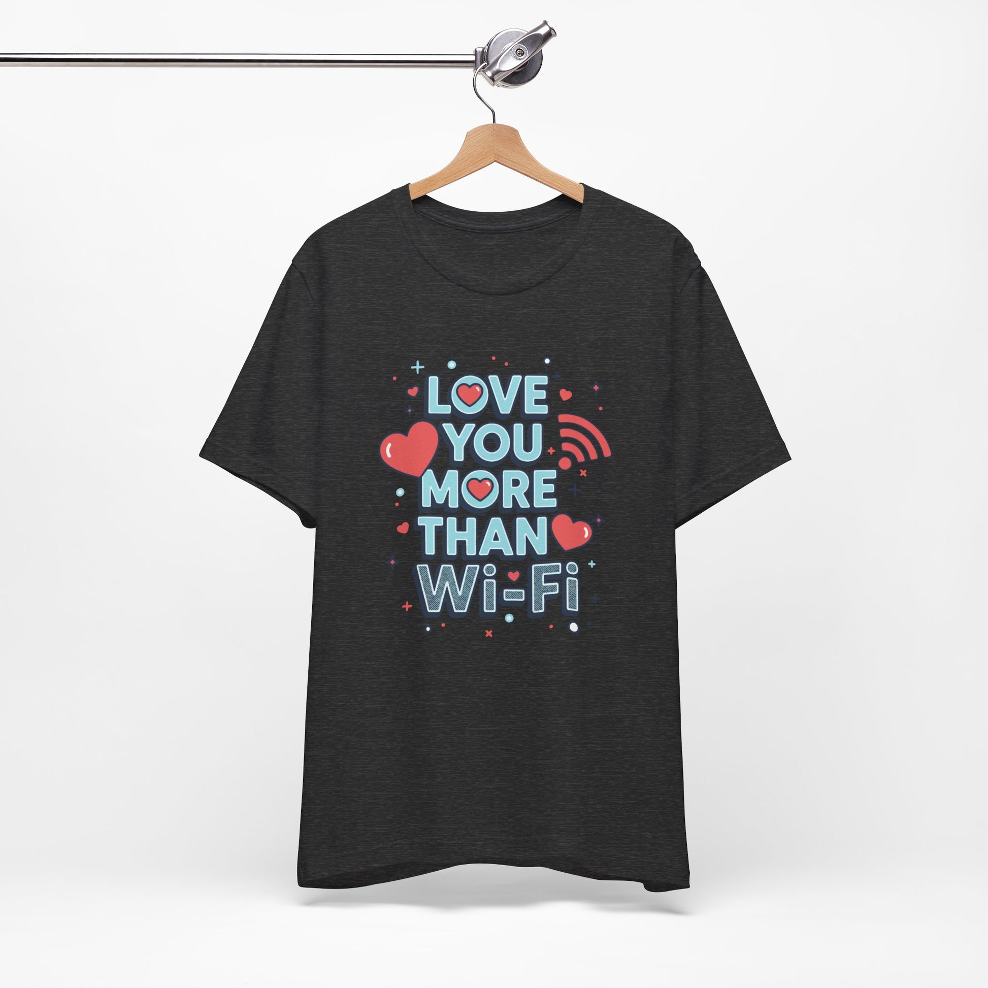 Soft, breathable tee that speaks the language of modern romance with a wink. The lightweight cotton feels cool against the skin, while the playful, retro-inspired print—bold letters, hearts, and a Wi‑Fi icon—reads clearly from a distance. It slips easily into weekend routines: movie nights on the couch, lazy coffee dates, or wandering the city hunting for the best signal (and the best people). Wear it when you want to say something sweet without saying a word. The crew neckline and clean retail fit make it easy to layer under jackets or wear on its own. Ethically made and comfortable enough for everyday life, this tee turns a simple message into a small, honest statement of affection.