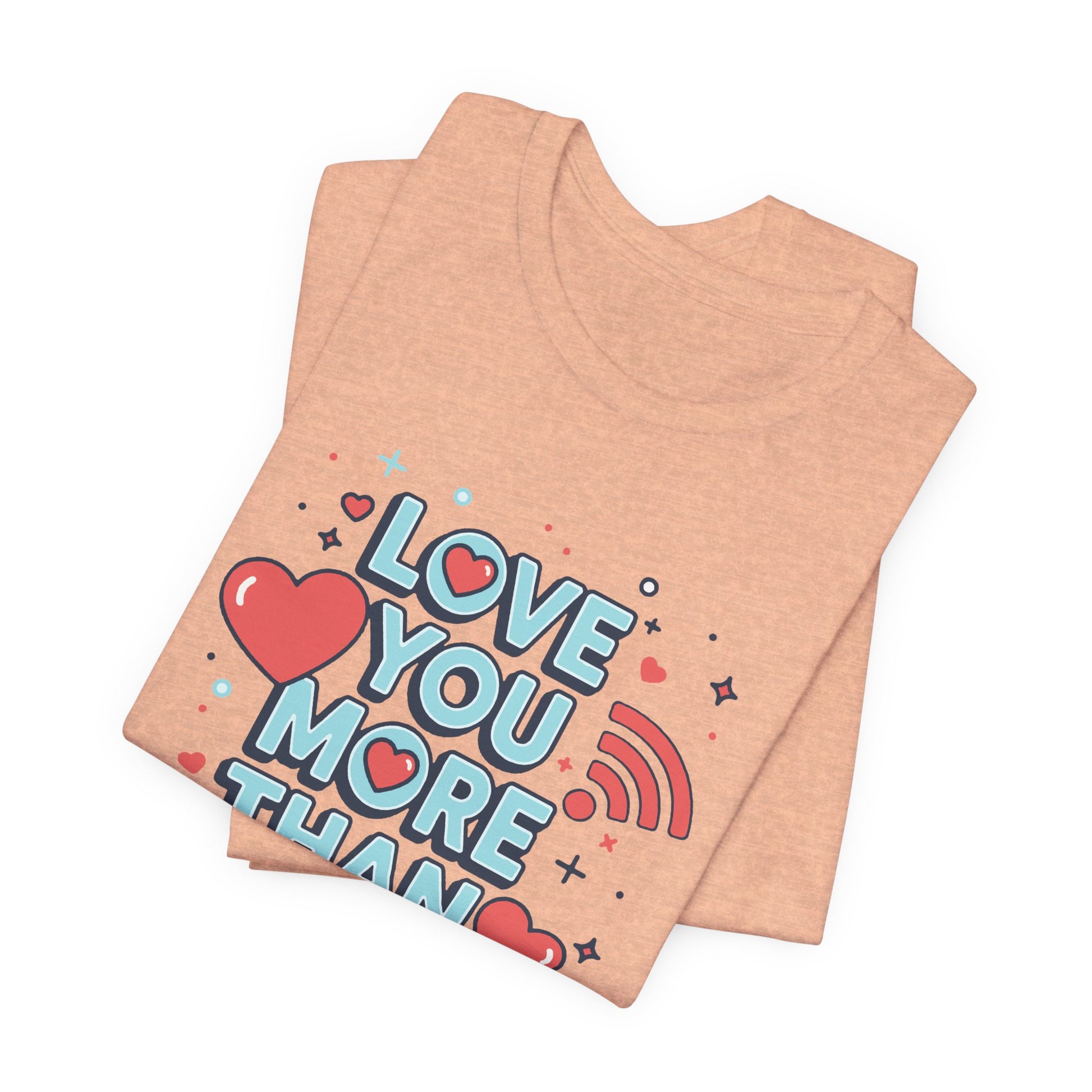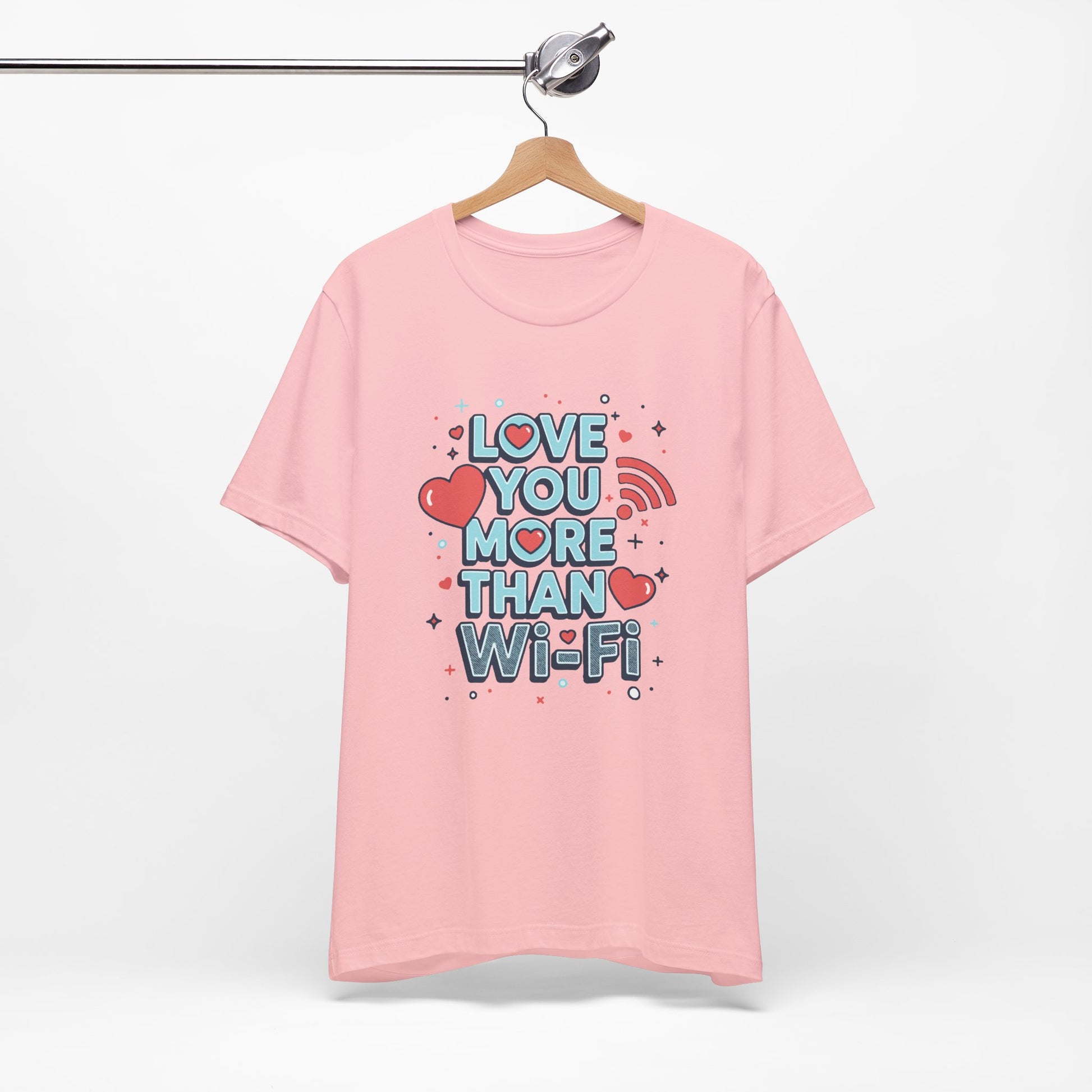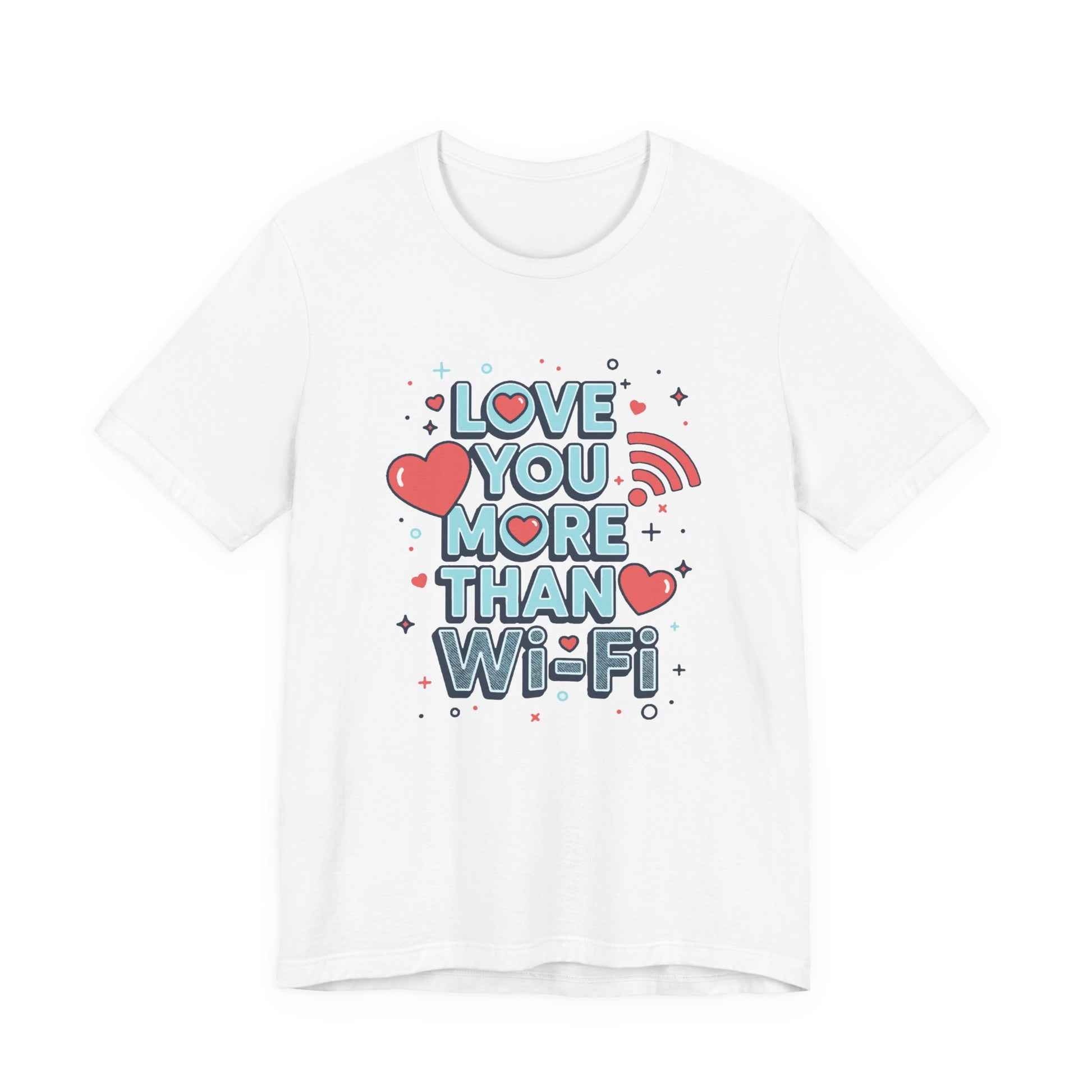 Soft, breathable tee that speaks the language of modern romance with a wink. The lightweight cotton feels cool against the skin, while the playful, retro-inspired print—bold letters, hearts, and a Wi‑Fi icon—reads clearly from a distance. It slips easily into weekend routines: movie nights on the couch, lazy coffee dates, or wandering the city hunting for the best signal (and the best people). Wear it when you want to say something sweet without saying a word. The crew neckline and clean retail fit make it easy to layer under jackets or wear on its own. Ethically made and comfortable enough for everyday life, this tee turns a simple message into a small, honest statement of affection.