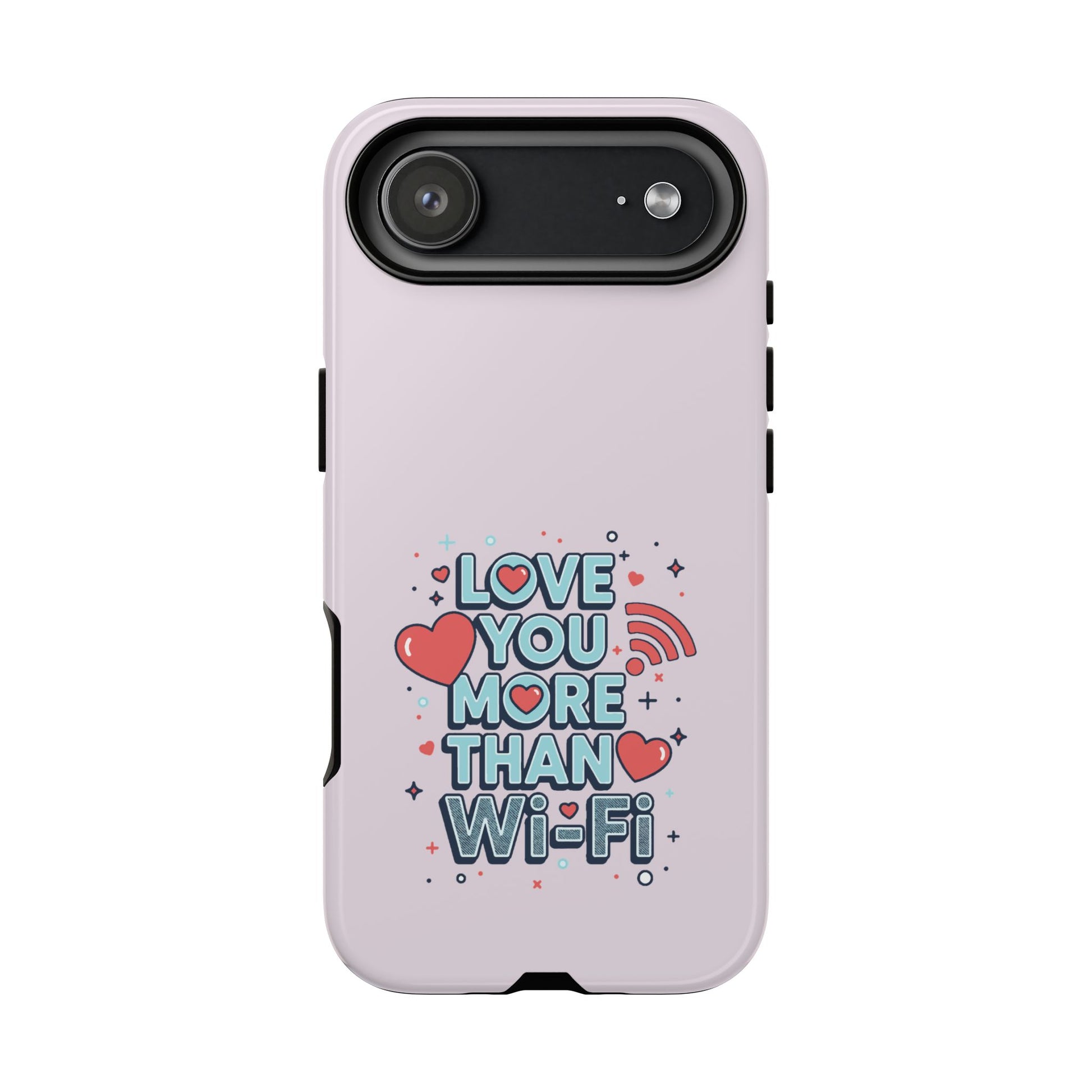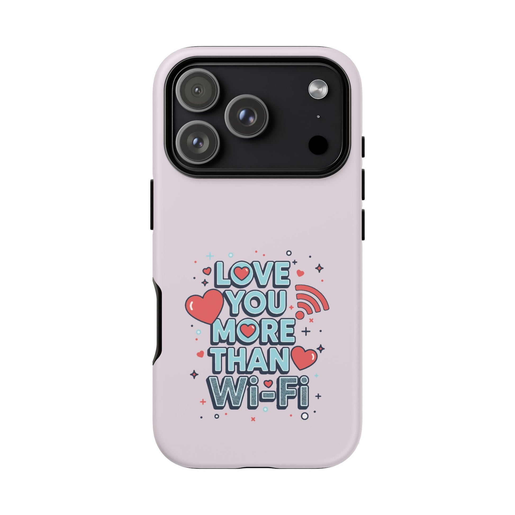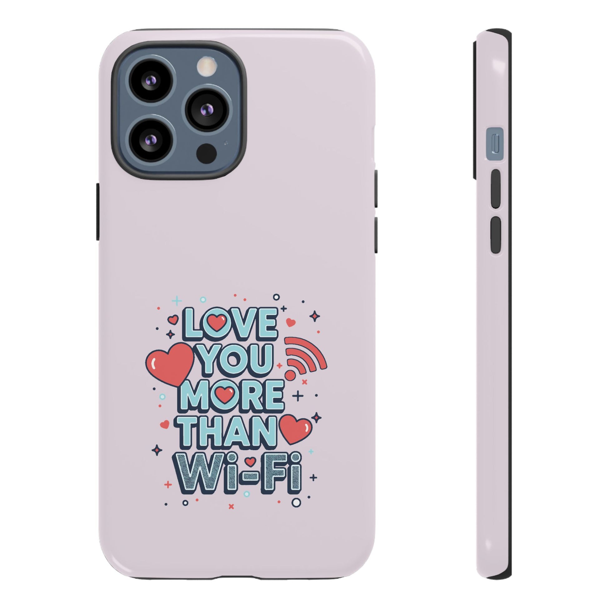 A slim, tough phone case that blends playful romance with dependable protection. The soft pastel backdrop showcases a cheerful, retro-inspired graphic that reads “Love You More Than Wi‑Fi,” surrounded by hearts and tiny starbursts—a lighthearted way to carry a little affection every day. Built as a dual-layer shell with a rigid polycarbonate exterior and a soft TPU silicone liner, the case absorbs shocks from drops while keeping ports open and charging simple. UV-resistant printing and a glossy or matte finish keep the artwork vivid outdoors, and the clear-fit design works with wireless charging. This case fits into everyday life as a small, affectionate statement piece for someone who likes tech, kitschy charm, and reliable protection.