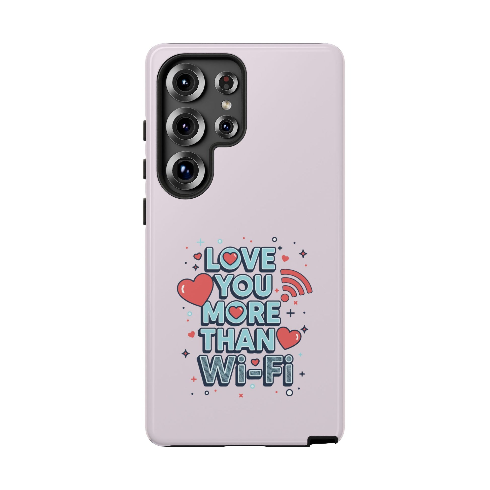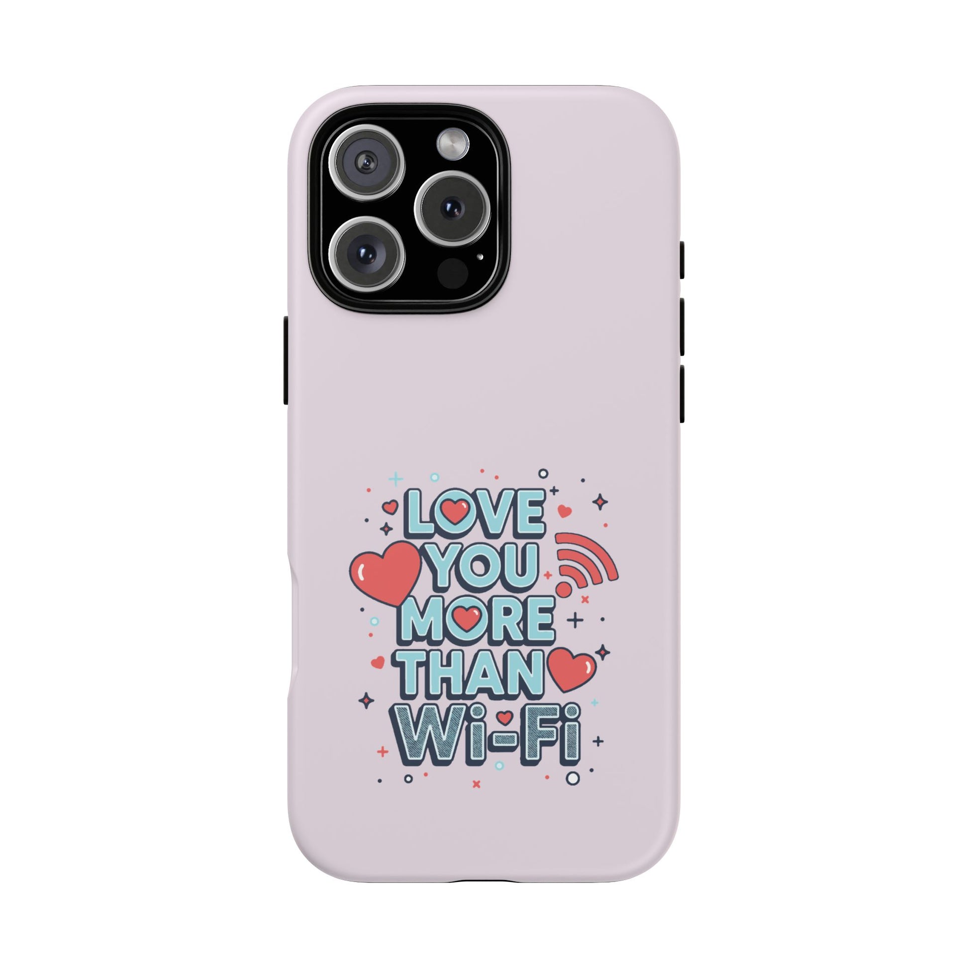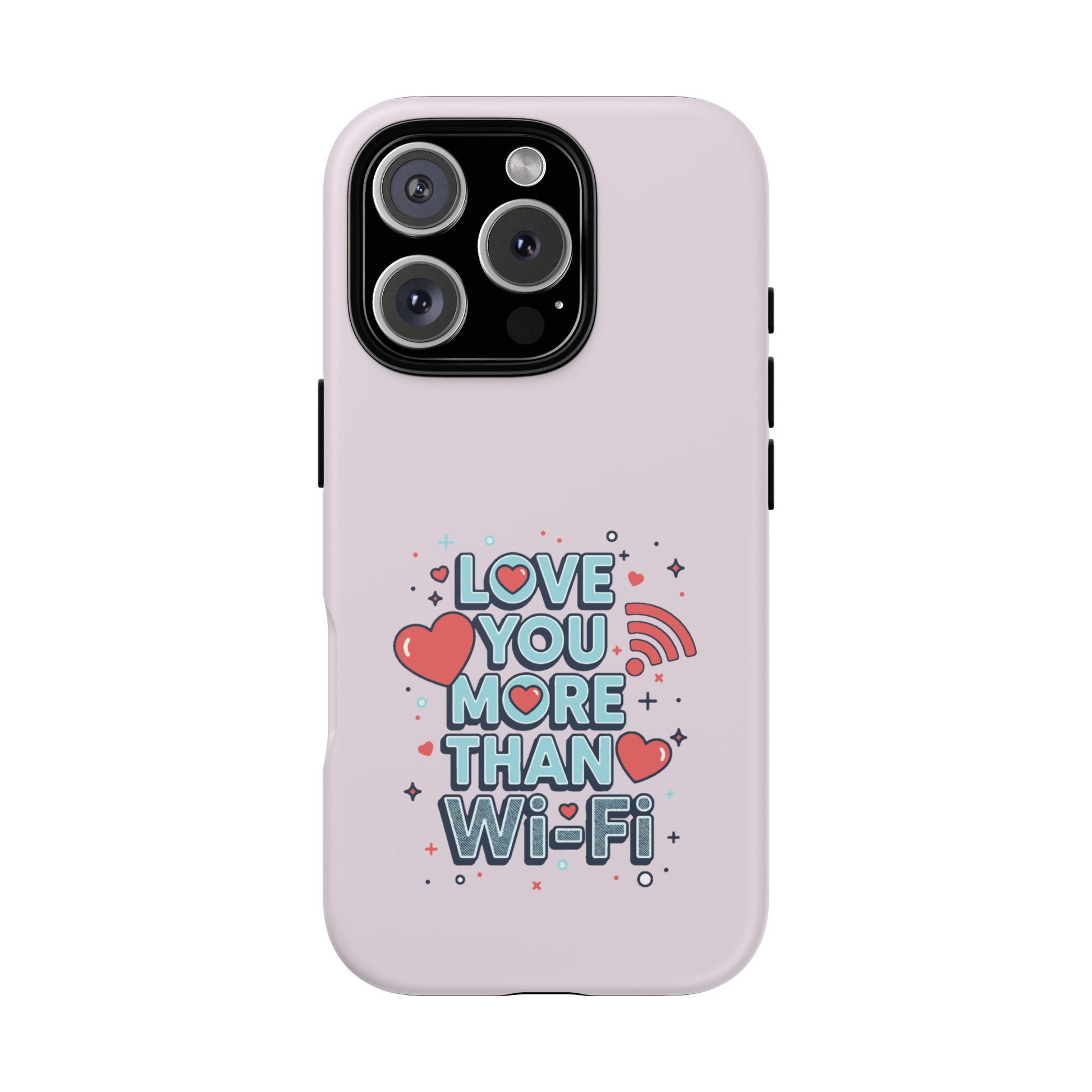 A slim, tough phone case that blends playful romance with dependable protection. The soft pastel backdrop showcases a cheerful, retro-inspired graphic that reads “Love You More Than Wi‑Fi,” surrounded by hearts and tiny starbursts—a lighthearted way to carry a little affection every day. Built as a dual-layer shell with a rigid polycarbonate exterior and a soft TPU silicone liner, the case absorbs shocks from drops while keeping ports open and charging simple. UV-resistant printing and a glossy or matte finish keep the artwork vivid outdoors, and the clear-fit design works with wireless charging. This case fits into everyday life as a small, affectionate statement piece for someone who likes tech, kitschy charm, and reliable protection.