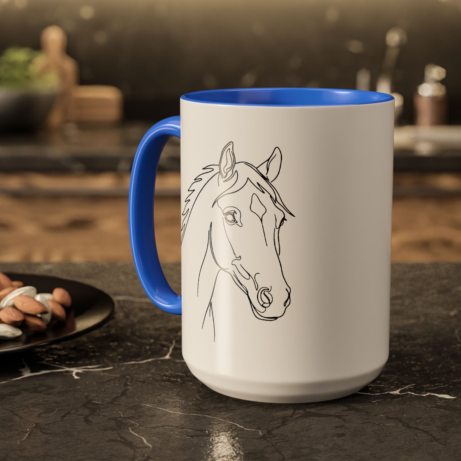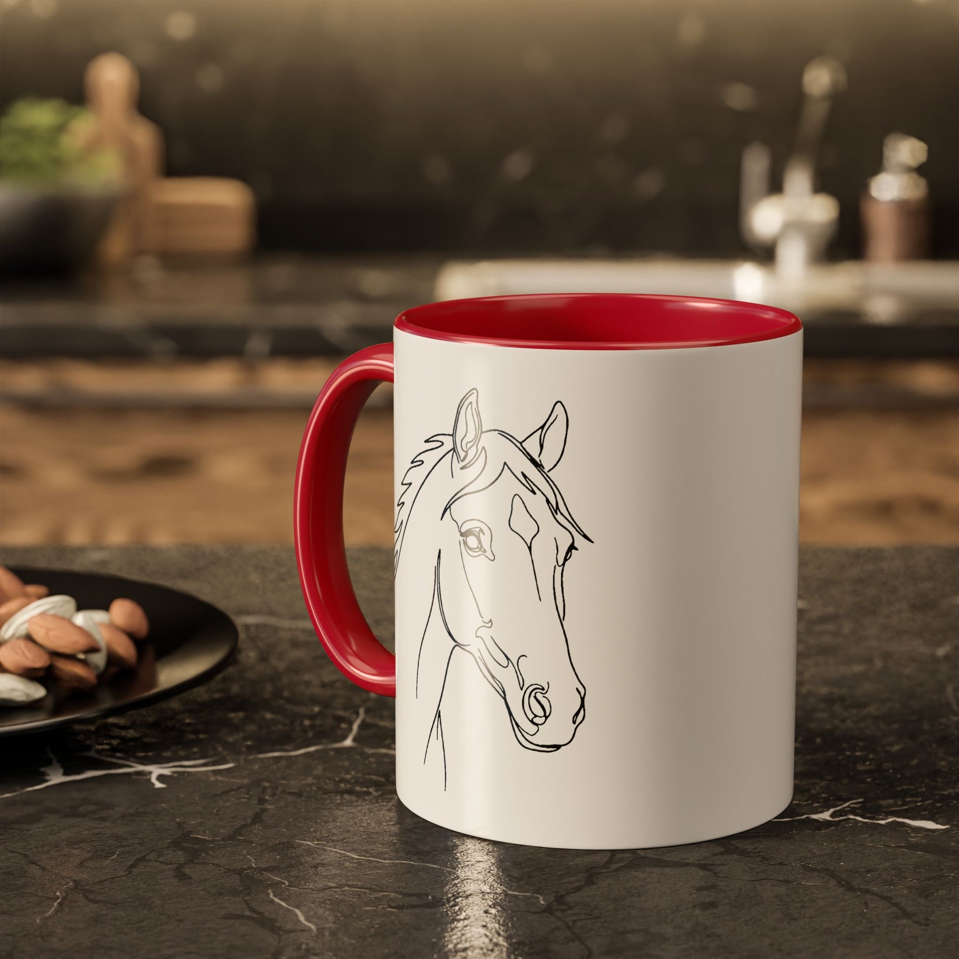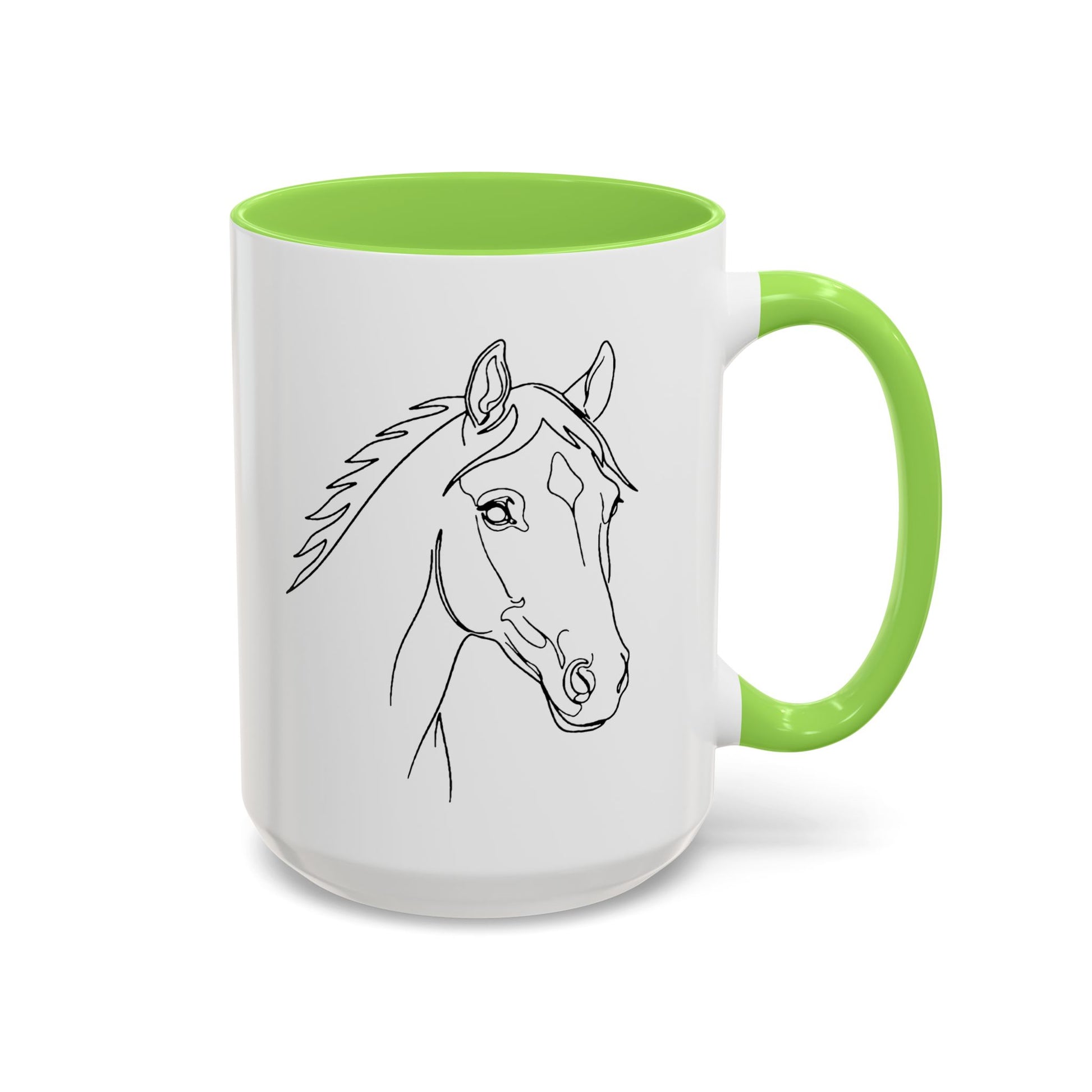 A bright, glossy ceramic mug that brings a calm, equine presence to everyday moments. The delicate, hand-sketched horse profile wraps the white surface with quiet lines and gentle expression. Choose a contrasting interior and handle from 12 vivid accent colors to make the sketch pop and match your kitchen or tack room. Brew a slow morning coffee, warm cocoa after a ride, or keep at your desk as a steady companion during long planning sessions—this mug reads like a small, steady breath in a busy day.