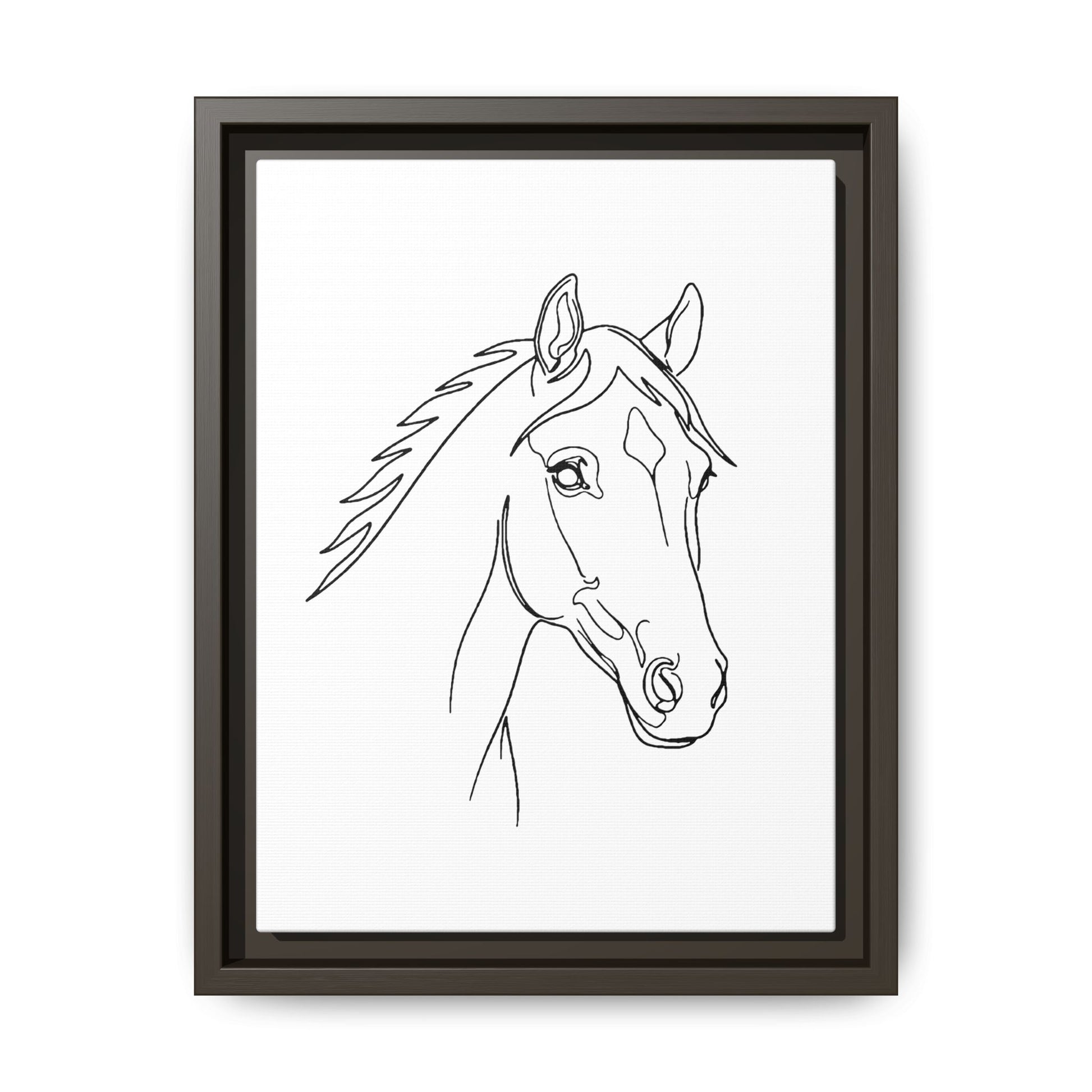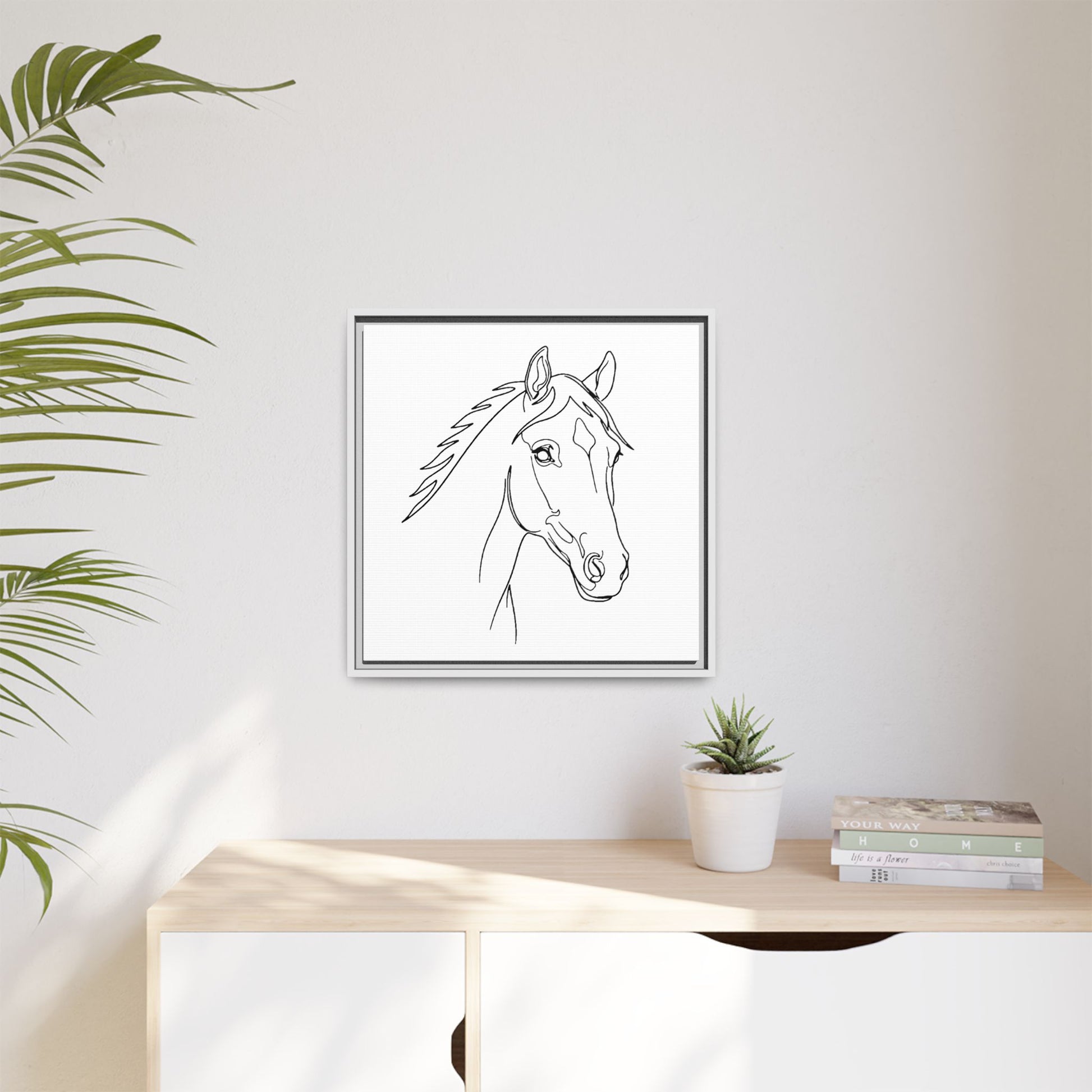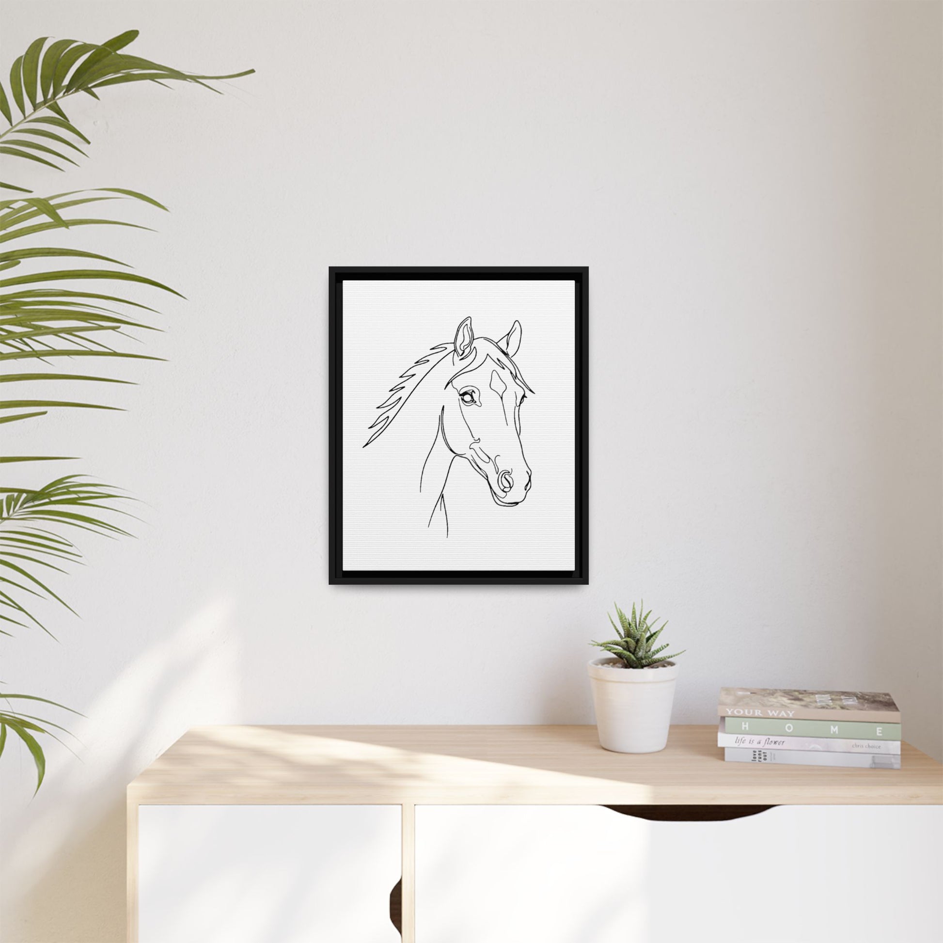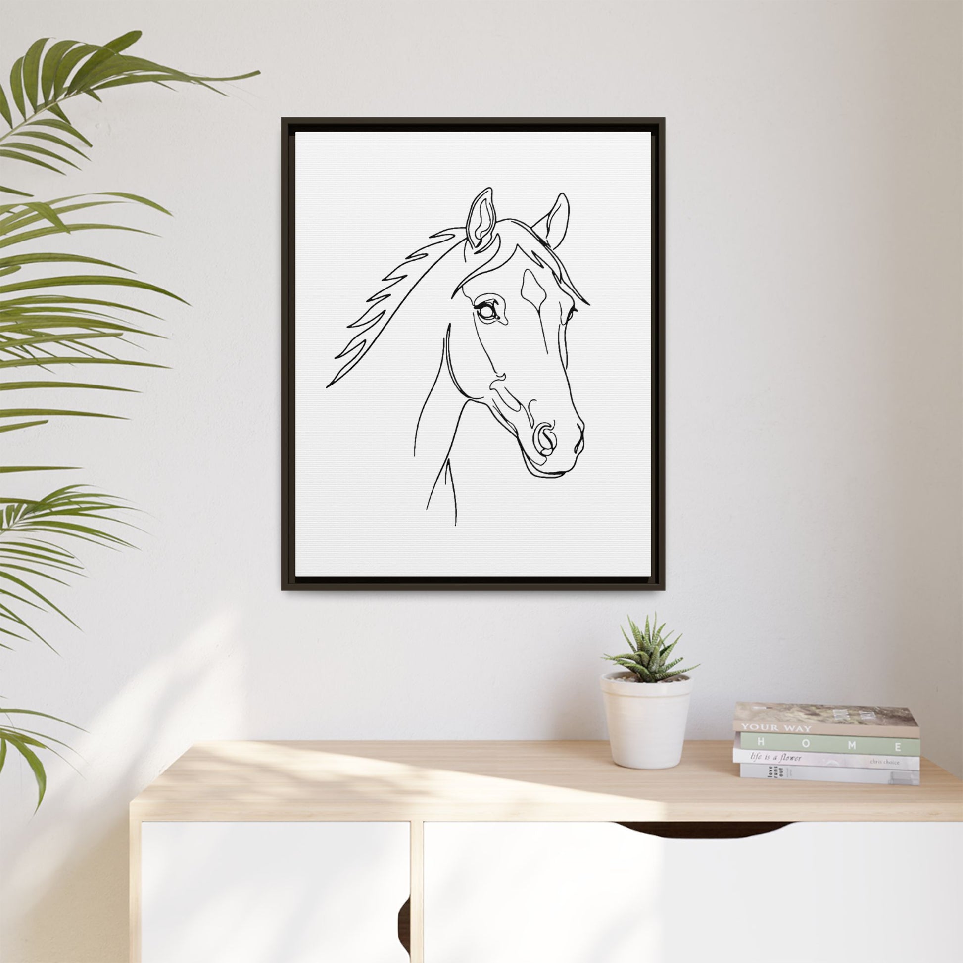 A minimalist framed matte canvas capturing the quiet elegance of a horse in one continuous line. The restrained black sketch on bright white canvas brings a calm, equine-focused presence to entryways, studios, or cozy reading nooks. Mounted on a slim pine profile with a crisp black frame, the piece feels both modern and warm—the kind of artwork that settles into a room and becomes part of the daily view. It complements natural textures like leather saddles, woven blankets, and sunlit wood, and it pairs naturally with rustic or Scandinavian interiors for moments when you want art that whispers rather than shouts.