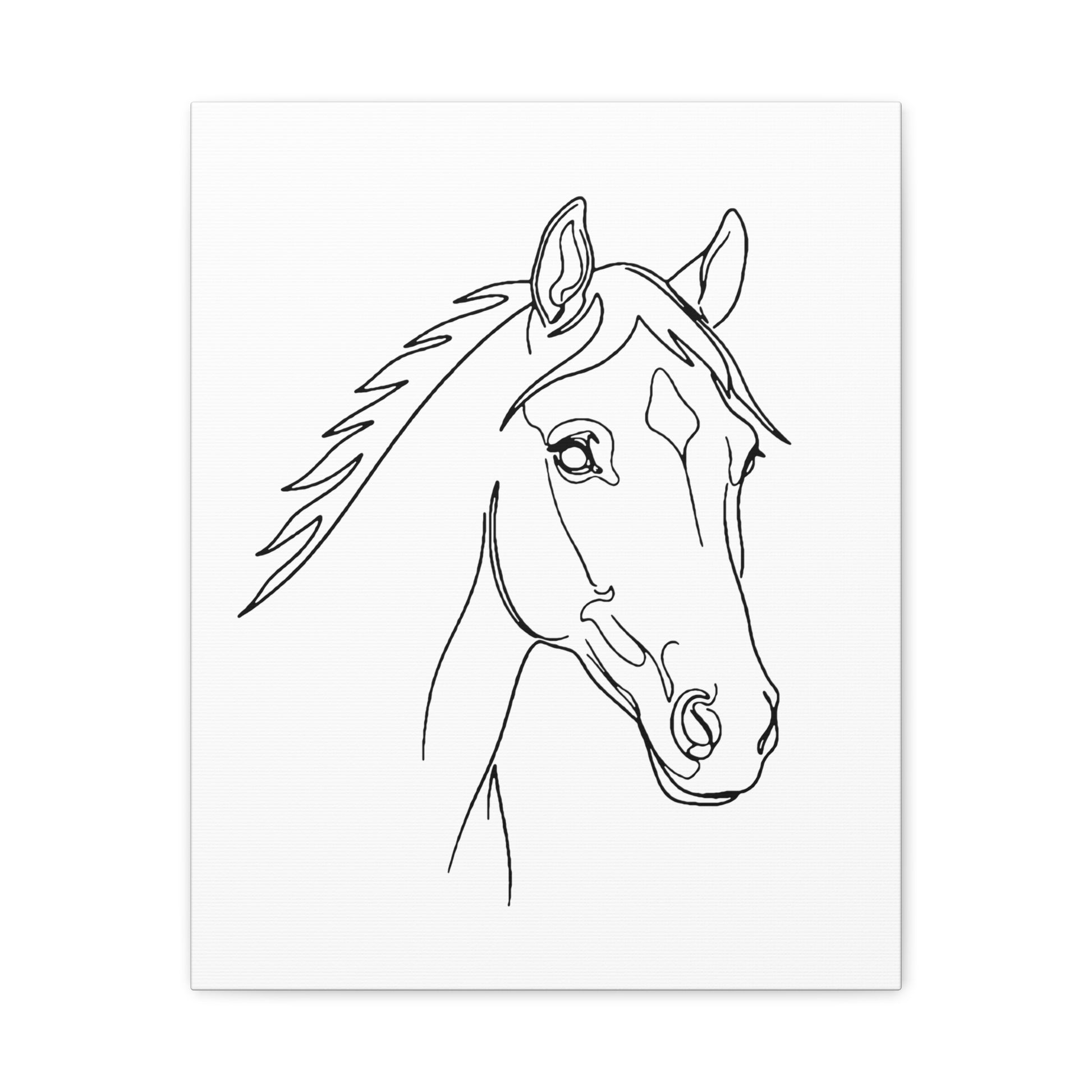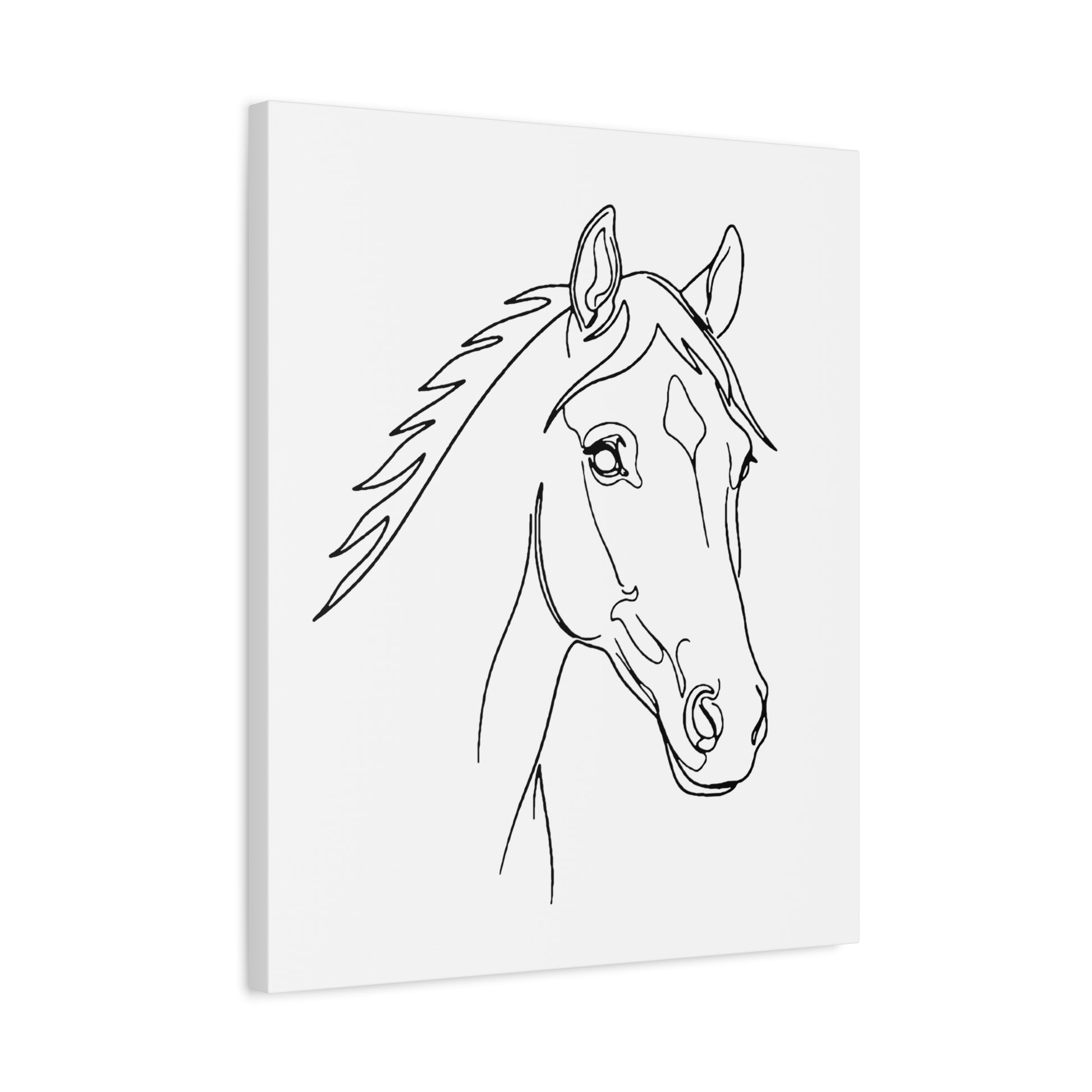 A simple, graceful horse portrait rendered in a clean black line on a matte white canvas. The stretched canvas surface keeps the drawing crisp, while the 1.25" profile adds subtle depth on the wall. It reads like a quiet sketch found in a favorite field notebook—calm, attentive, and quietly spirited. Hang it in an entryway, studio, or stable office to bring a gentle equine presence that feels personal and unforced. The understated design leaves room for surrounding décor to breathe, while the durable stretched frame and soft rubber dots keep the piece secure and flat against the wall.