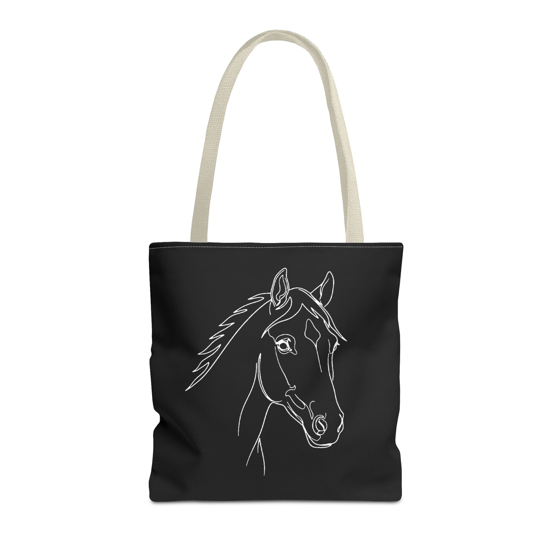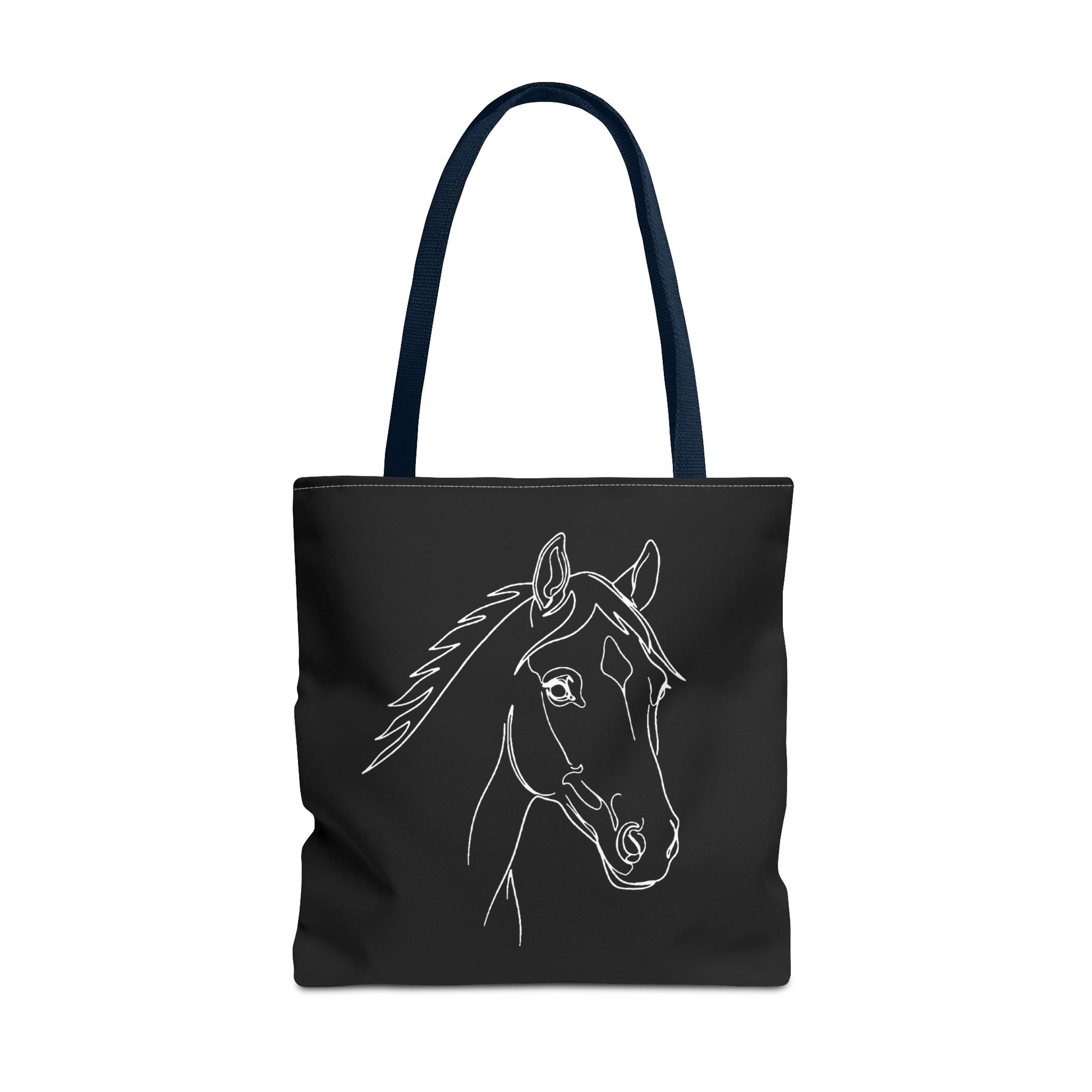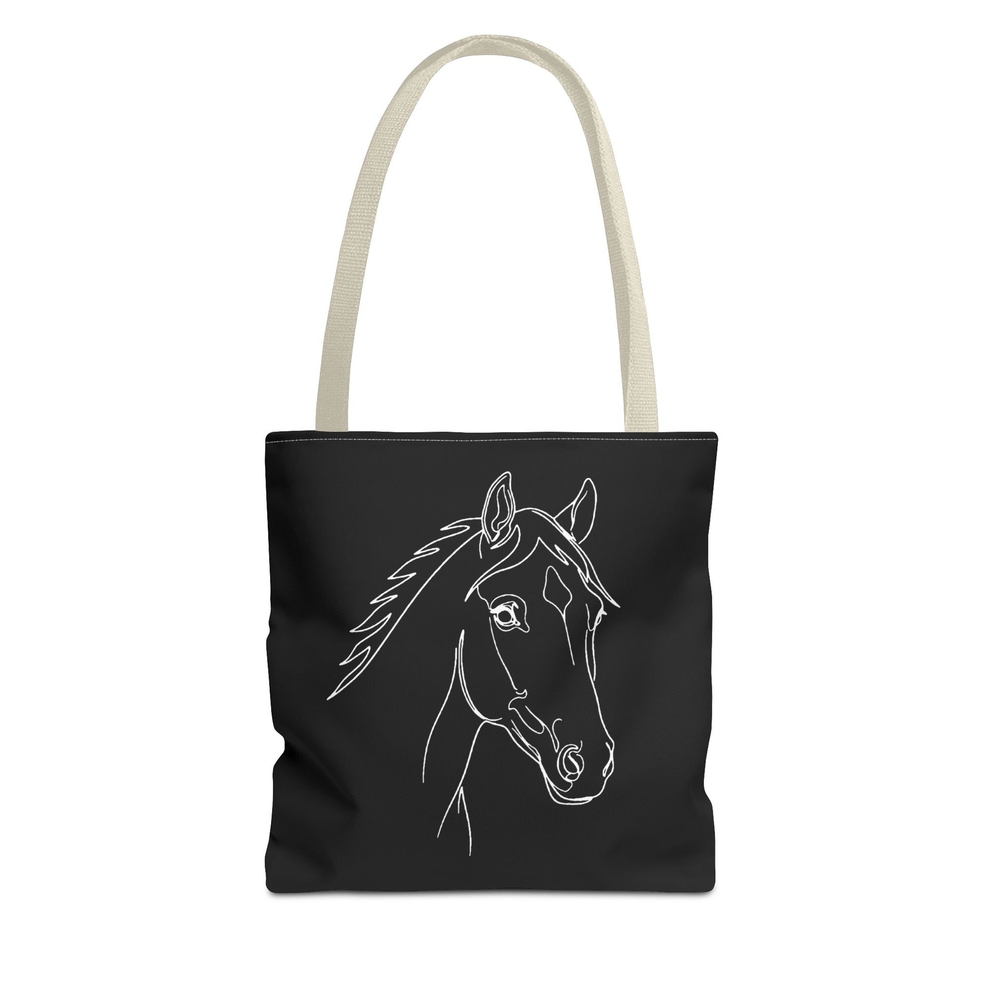 A sleek, durable tote that carries a quiet love for horses wherever you go. The minimalist single-line horse portrait sits in soft contrast against the deep black canvas, giving the bag an elegant, gallery-ready feel. Lightweight but sturdy, it stands up to weekly market runs, barn essentials, or a sketchbook and brushes for the trail. The roomy boxed corners and reinforced handles mean you can load it with feed samples, magazines, or work items without worrying about strain. Choose a handle color to complement your style and take this understated equine statement piece from stable to city with ease.