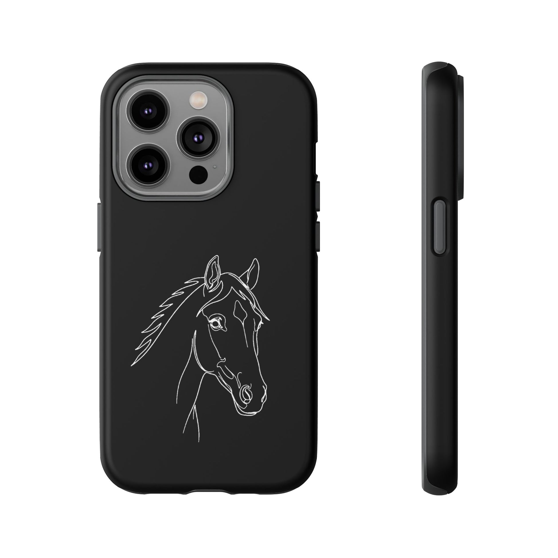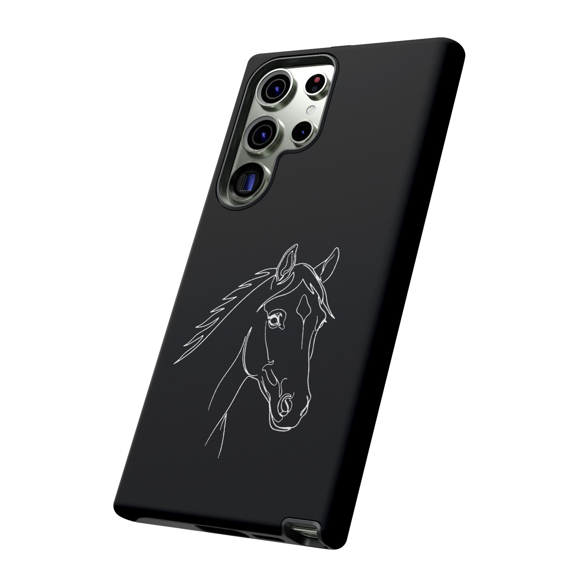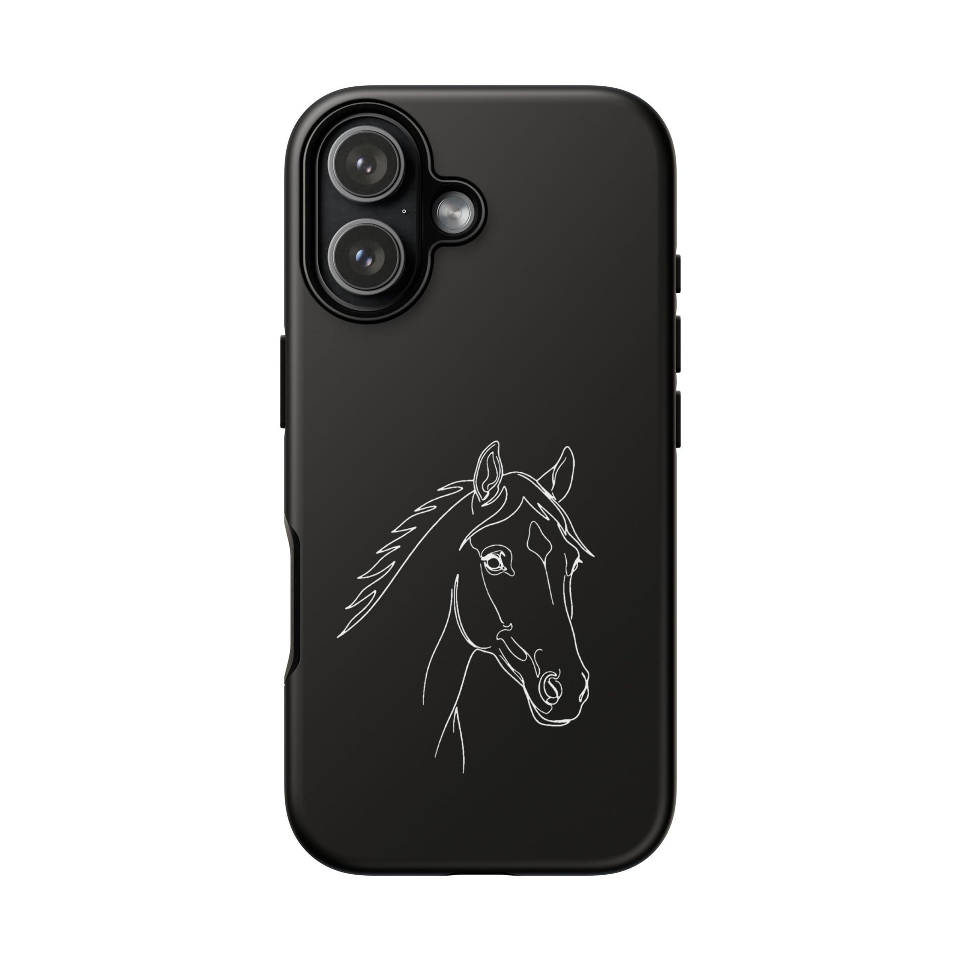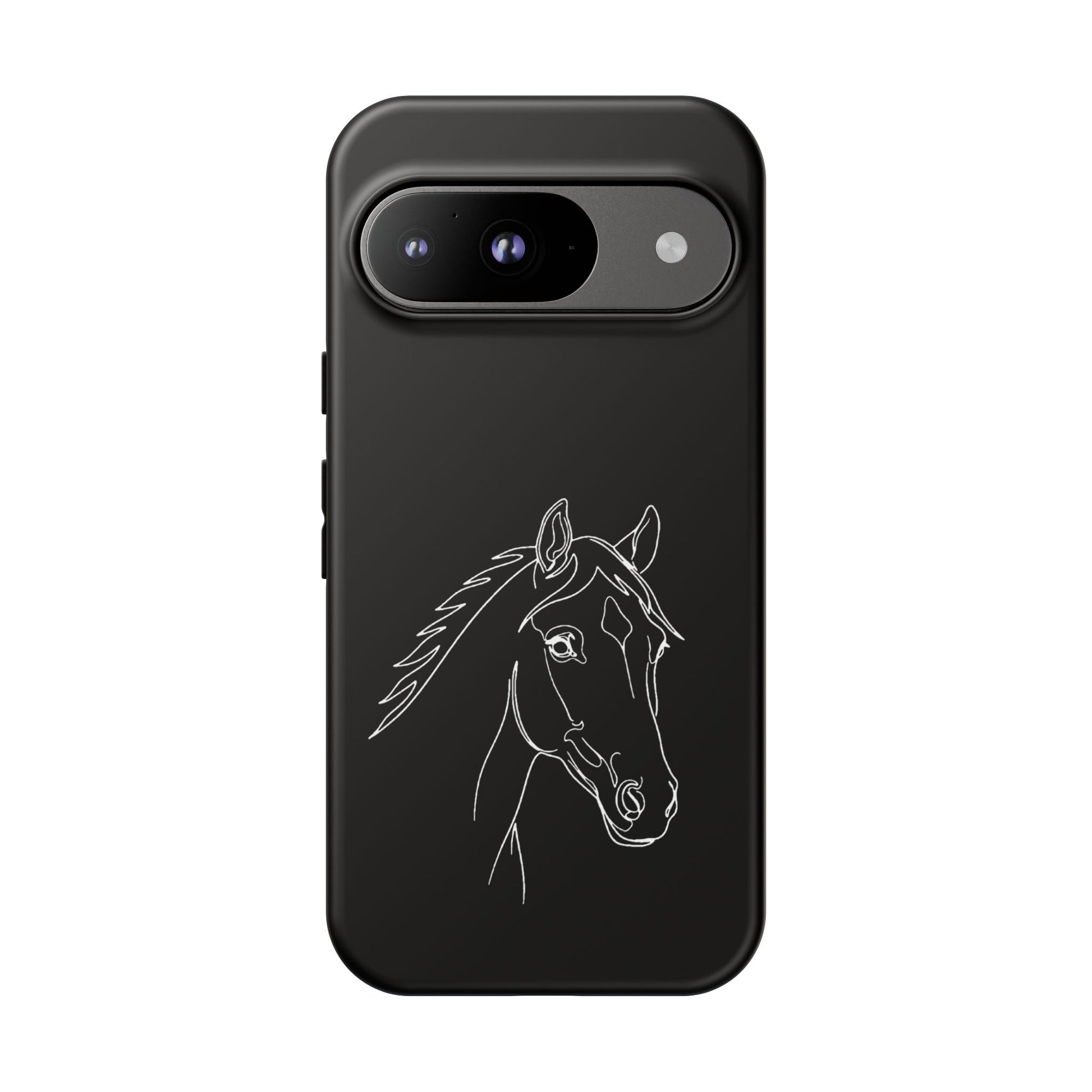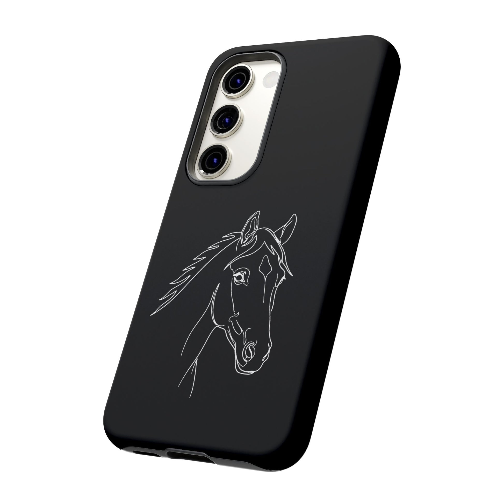 A slim, protective phone case with a hand-drawn horse sketch etched in soft white against a matte black background. The dual-layer build pairs a rigid polycarbonate shell with a shock-absorbing TPU silicone liner for everyday impact protection while maintaining a refined, equestrian-inspired look. The minimalist line-art horse sits off-center, lending quiet elegance to the case and letting the design speak to riders, trainers, and horse lovers who prefer subtle statement pieces. Lightweight and responsive, it keeps ports open and supports wireless charging so your routine stays uninterrupted. Weather-resistant inks and certified materials mean the case holds up on trail rides and city commutes alike when cared for according to handling notes.