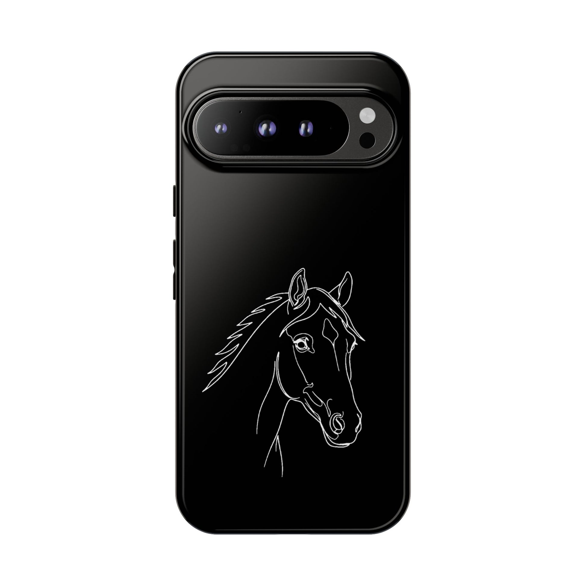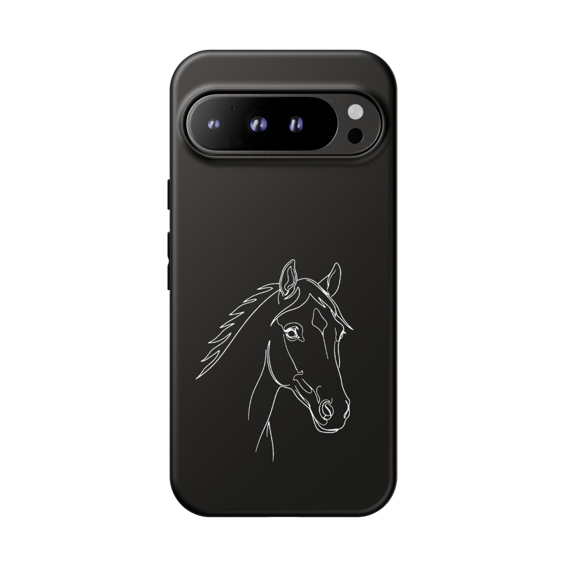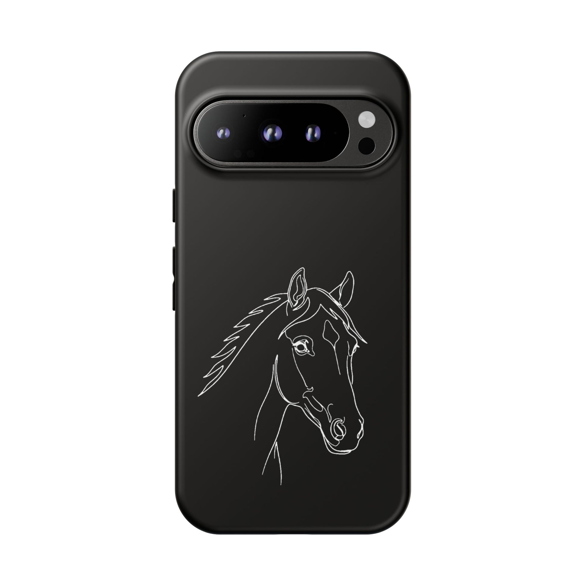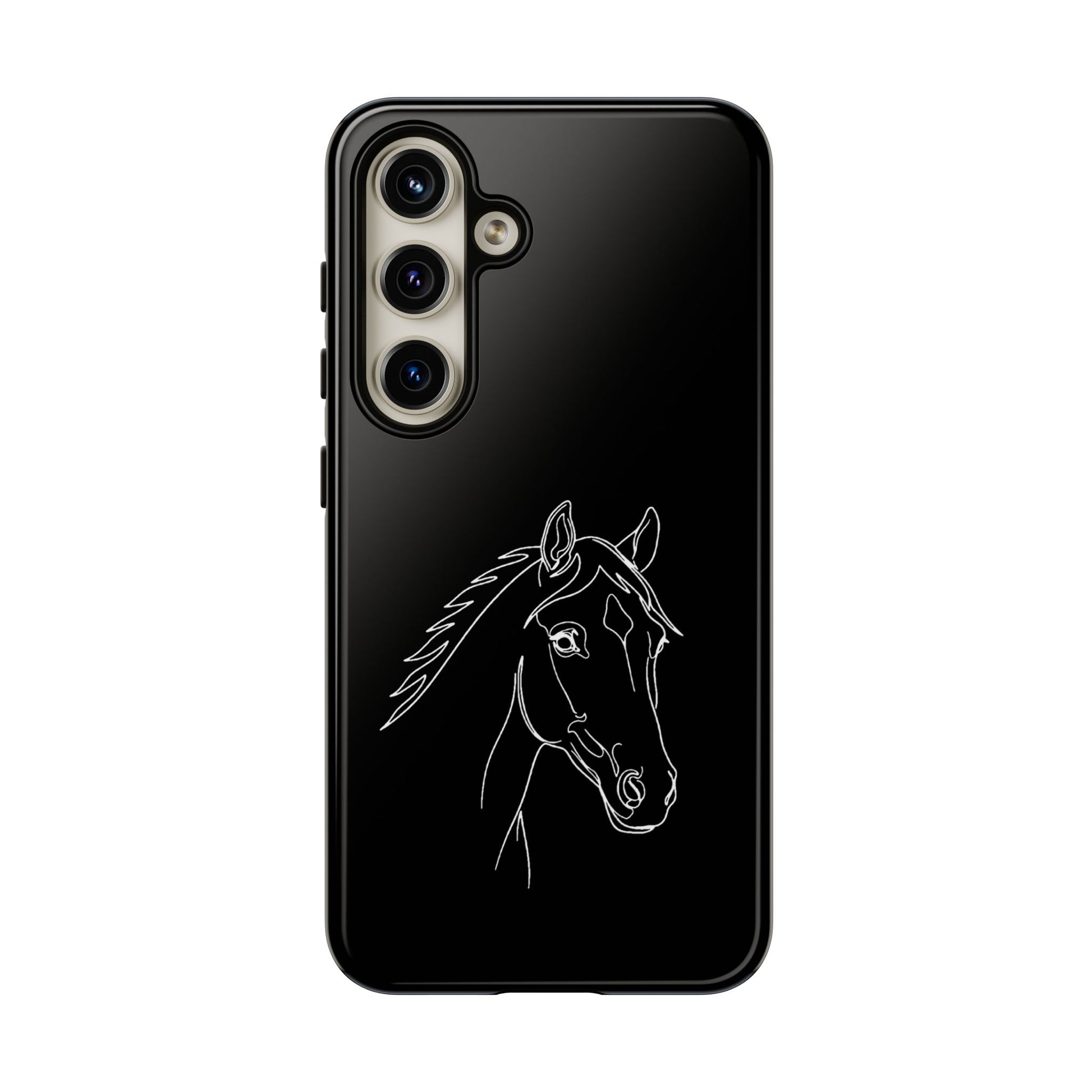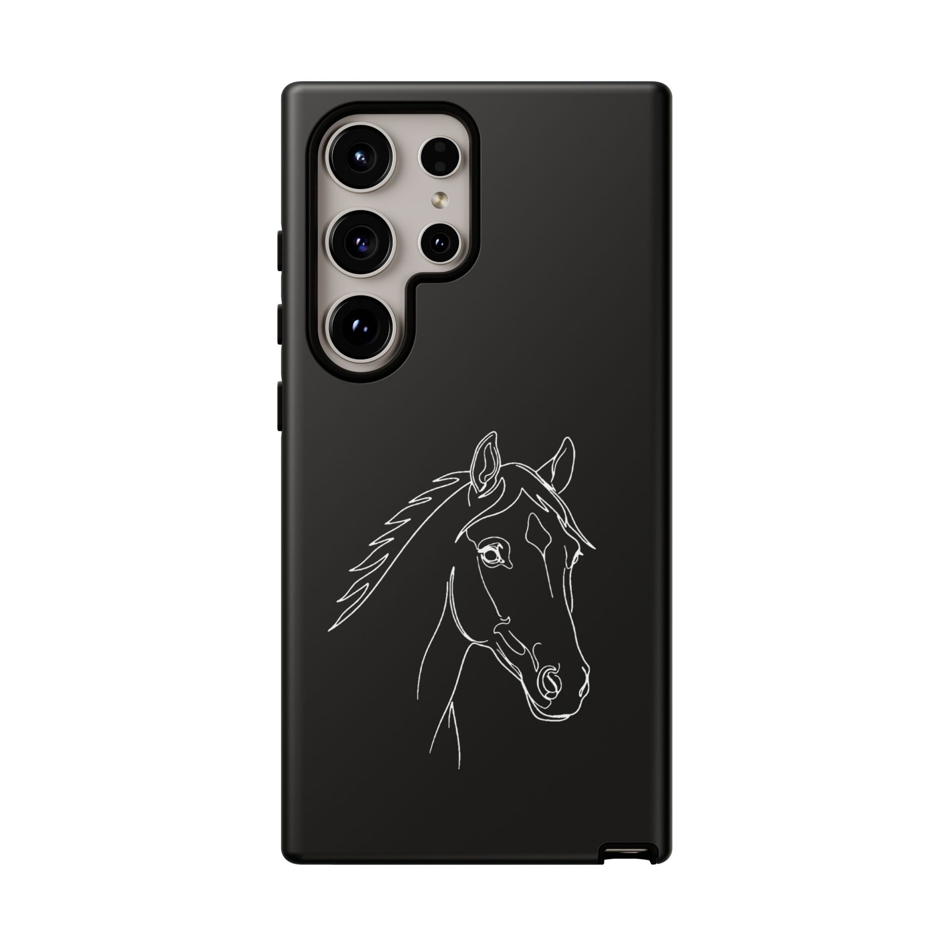 A slim, protective phone case with a hand-drawn horse sketch etched in soft white against a matte black background. The dual-layer build pairs a rigid polycarbonate shell with a shock-absorbing TPU silicone liner for everyday impact protection while maintaining a refined, equestrian-inspired look. The minimalist line-art horse sits off-center, lending quiet elegance to the case and letting the design speak to riders, trainers, and horse lovers who prefer subtle statement pieces. Lightweight and responsive, it keeps ports open and supports wireless charging so your routine stays uninterrupted. Weather-resistant inks and certified materials mean the case holds up on trail rides and city commutes alike when cared for according to handling notes.