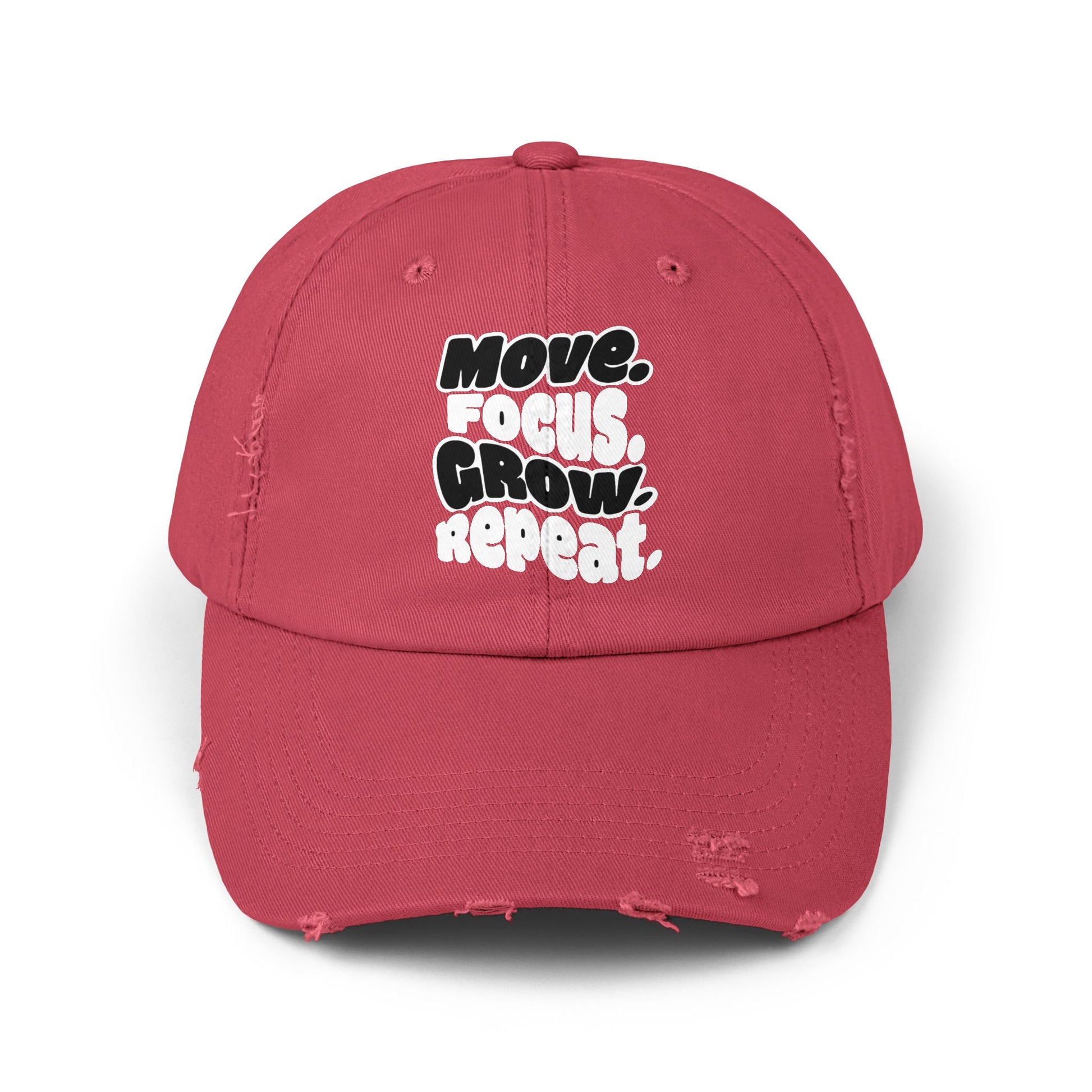 A lived-in, low-profile cap that carries a quiet message: move, focus, grow, repeat. Distressed edges and a soft, unstructured crown give this hat the feel of one you’ve owned for years—worn in, comfortable, and ready to accompany busy days and slow ones alike. The bold white DTF print pops against the black twill, while subtle fraying and a curved visor keep the look casual and authentic. Slide the hidden fabric strap and metal D-ring to find your fit, then wear it to workouts, walks, market runs, or weekday commutes when you want a simple reminder to keep moving forward.