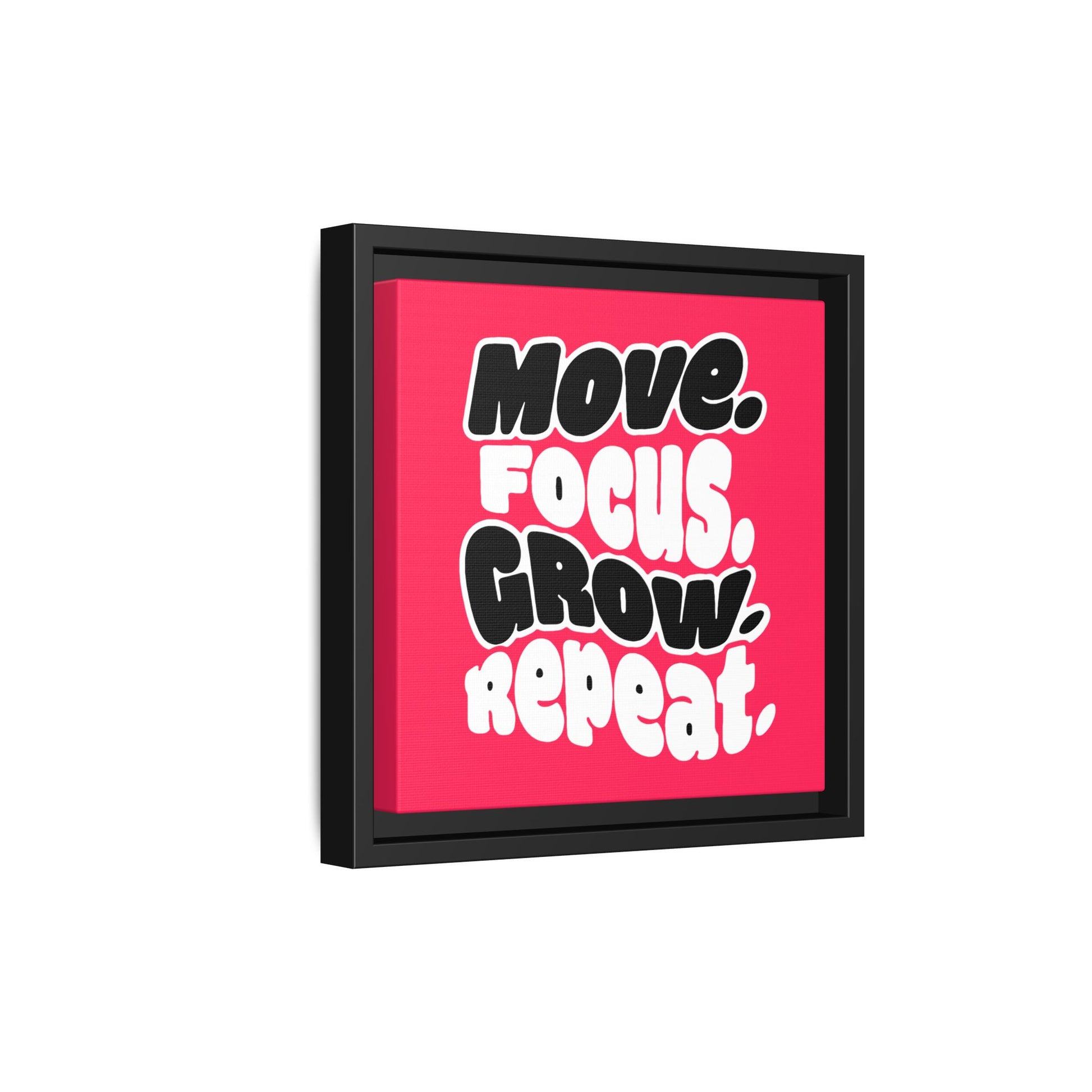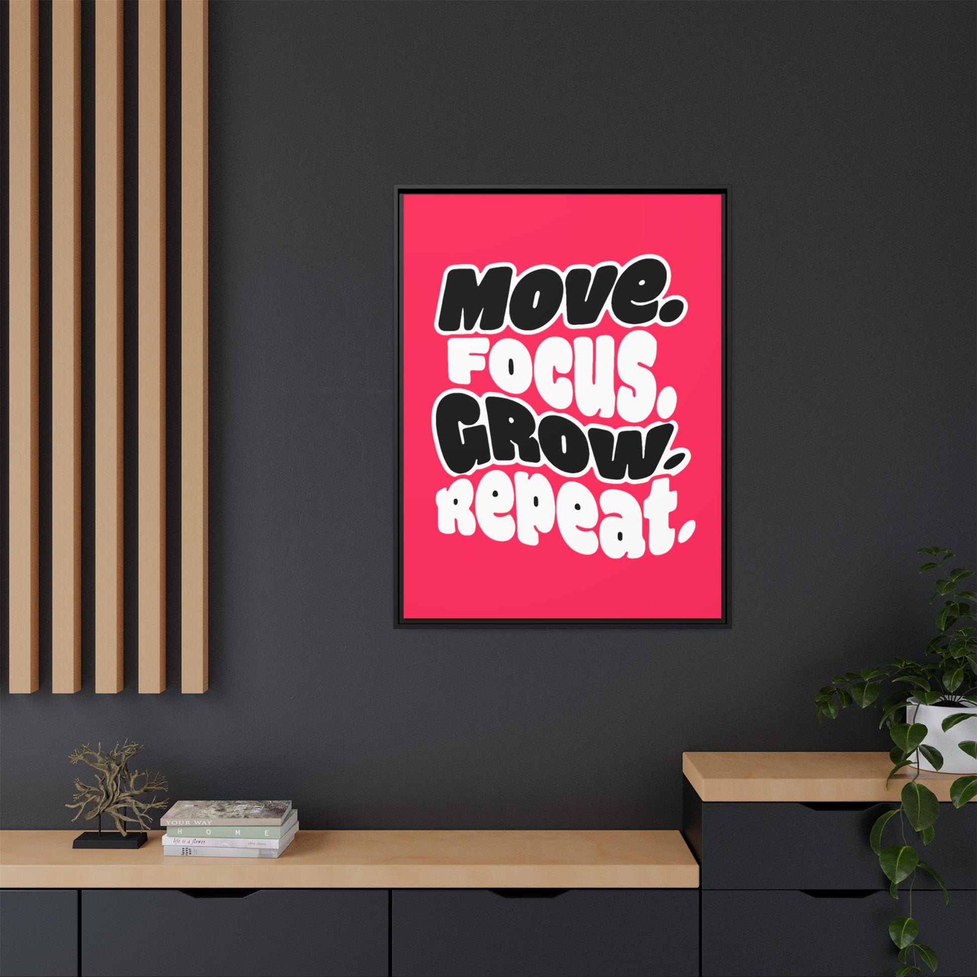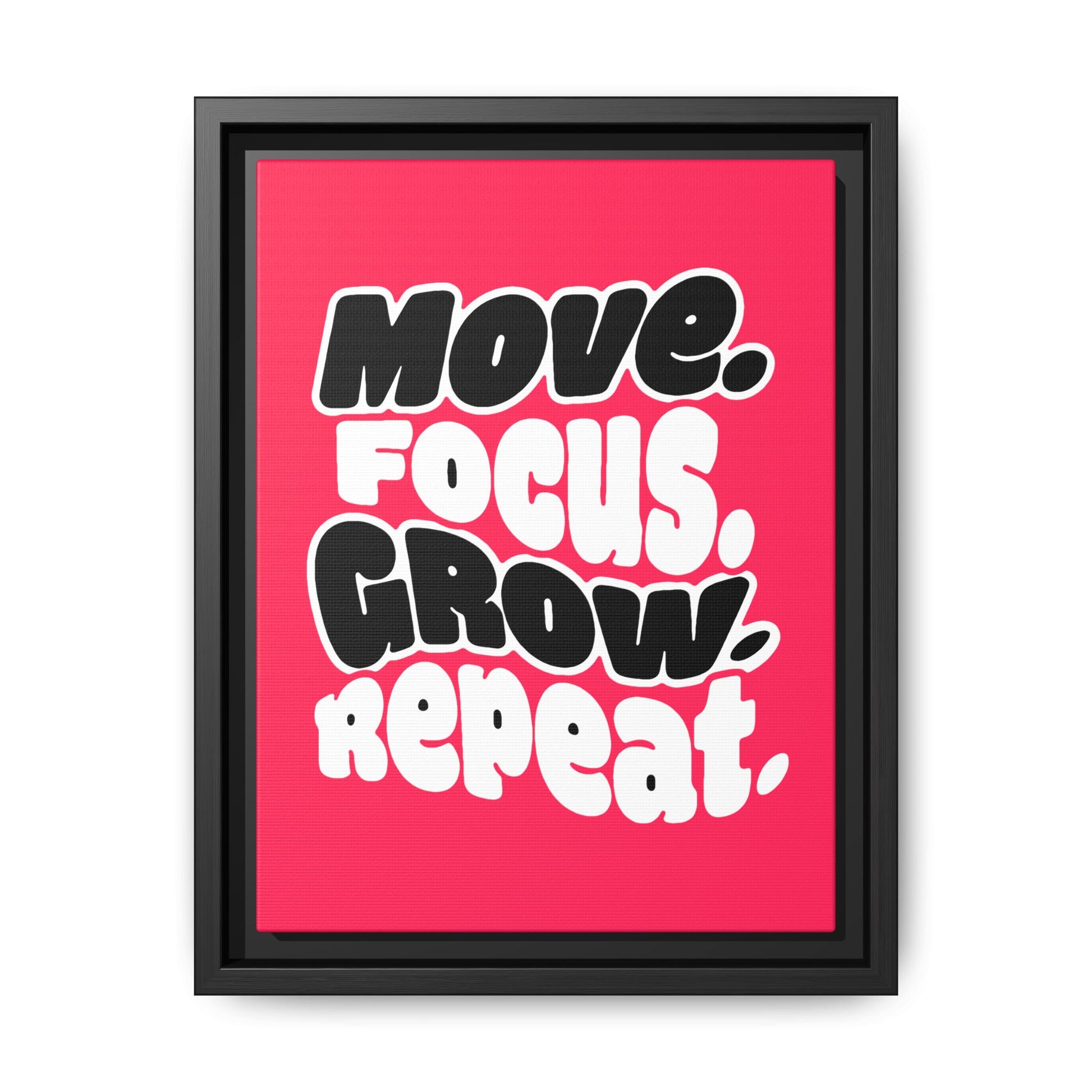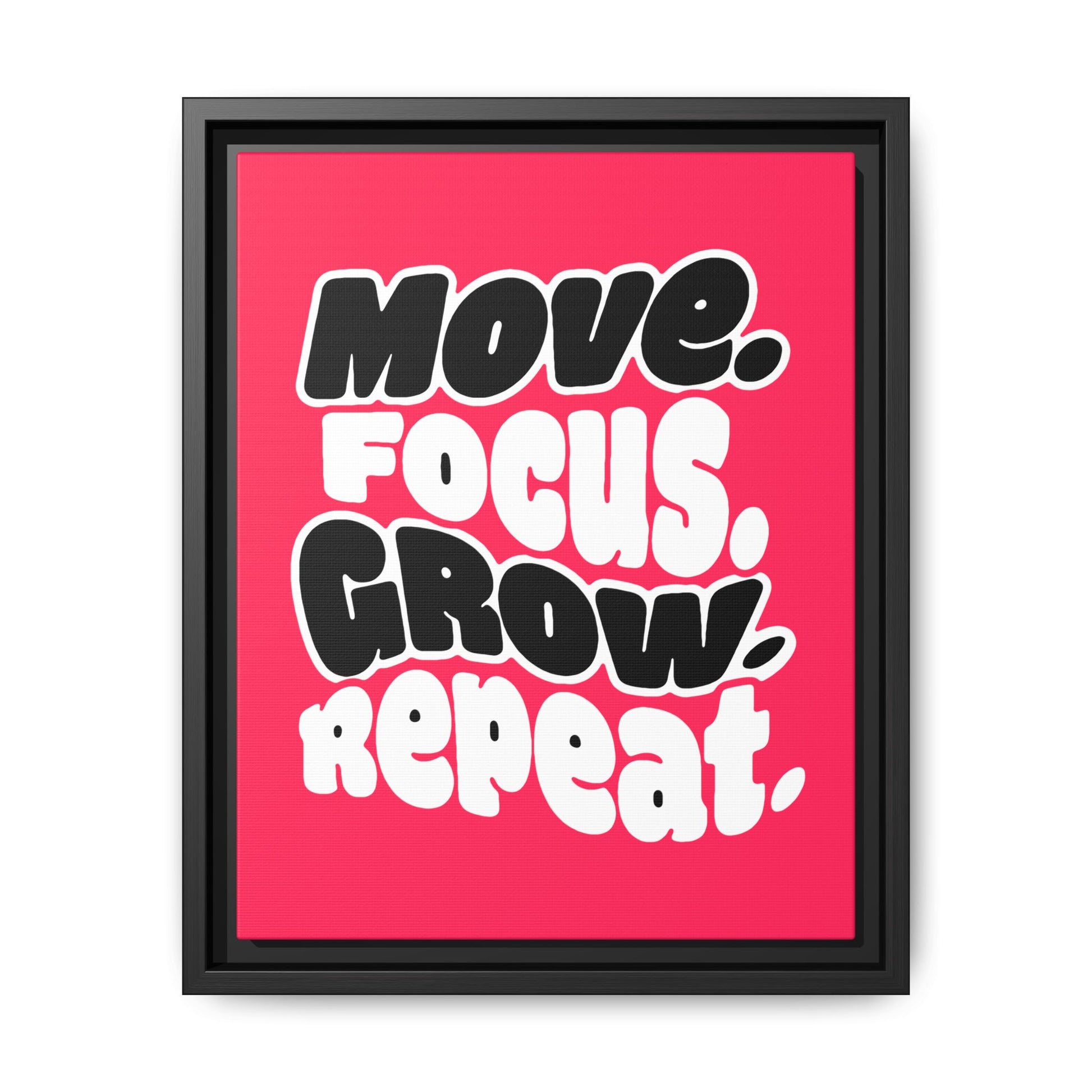 Bold, energetic wall art that brings motivational rhythm to a workspace, studio, or living room. This matte canvas print features chunky, retro-inspired lettering in high-contrast black and white against a vivid coral-pink background. Framed in a slim pine frame with a crisp black finish, the piece reads like a daily mantra—short, punchy, and impossible to ignore. It feels like the upbeat nudge you need before a workout, a morning planning session, or a creative sprint. Hang it where momentum matters: above a desk, near a home gym, or in a cozy reading nook. The textured matte surface keeps glare low while the vivid inks preserve the lively palette, so the message stays bright and clear day after day.
