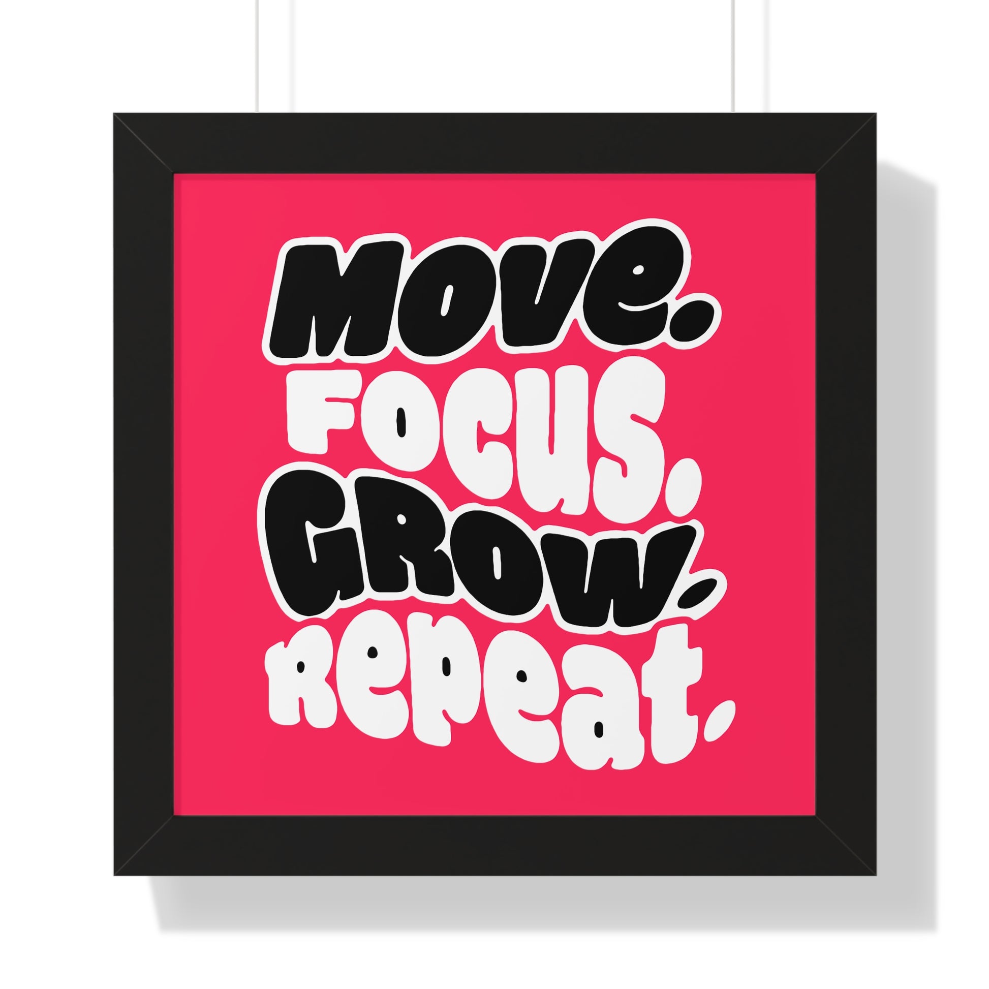 This framed vertical poster brings bold, upbeat energy to any wall. The vibrant coral-pink background and chunky, playful lettering declare a simple mantra: Move. Focus. Grow. Repeat. The matte, museum-grade paper and protective acrylic cover keep colors lively and crisp over time, while the slim frame options—black, white, or warm walnut—let the piece sit comfortably in modern workspaces, home studios, or motivational corners. Lightweight Ayous or sturdy MDF framing and built-in or included hanging hardware make it easy to place the poster exactly where you want it. It’s designed to feel like a pep talk on the wall: bright, direct, and quietly persistent.