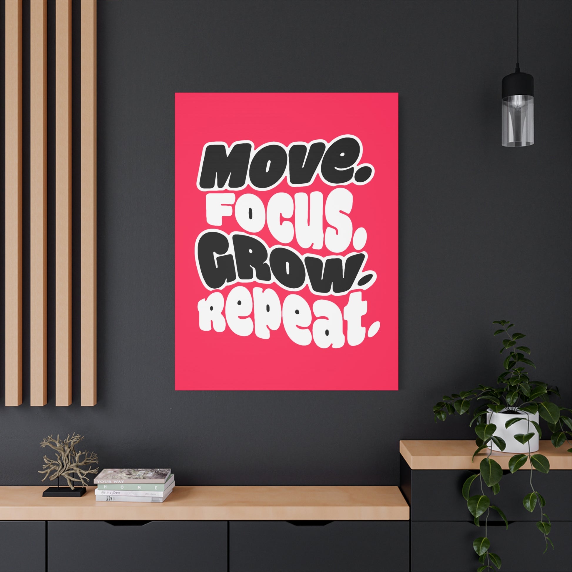 A bright, matte stretched canvas that brings upbeat energy to any workspace or studio. Bold, rounded lettering sits against a lively coral background, reading: “Move. Focus. Grow. Repeat.” The compact 1.25” depth gives a clean gallery look, while the soft rubber dots and included back hanger keep it secure and level on the wall. Printed with non-toxic latex inks on a cotton-poly canvas and stretched over responsibly sourced radiata pine, this piece balances punchy, motivational design with eco-minded materials. Choose vertical, horizontal, or square orientations from multiple sizes to fit a desk nook, home office, gym corner, or creative studio wall.