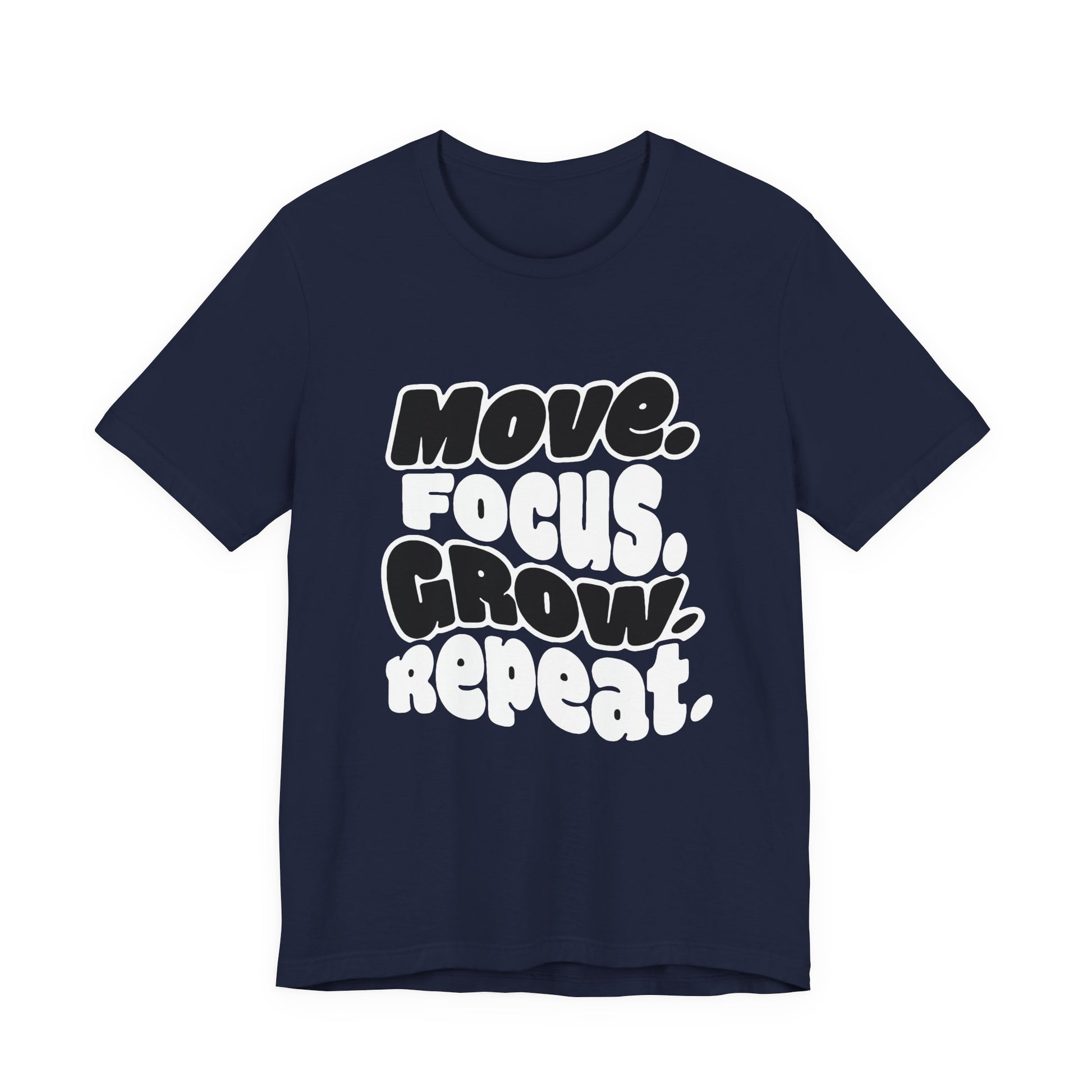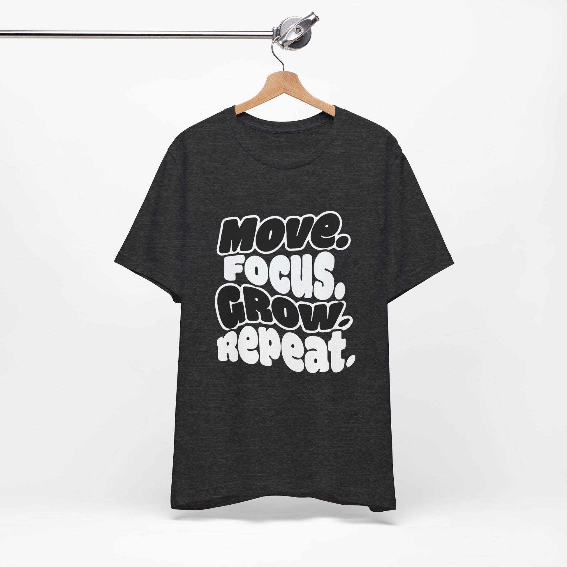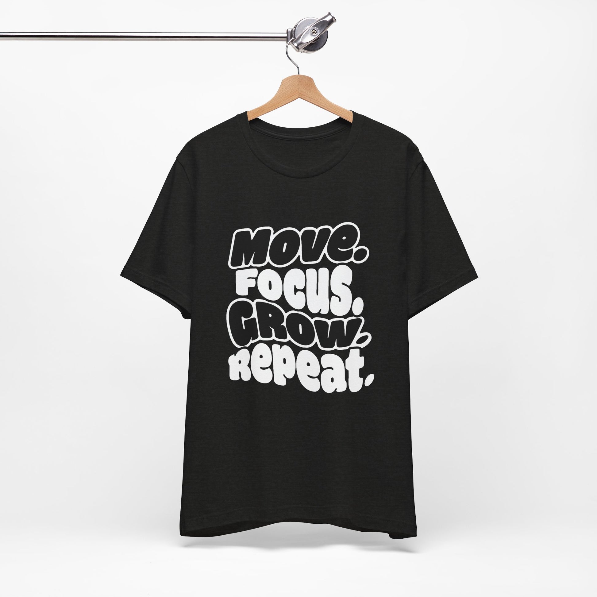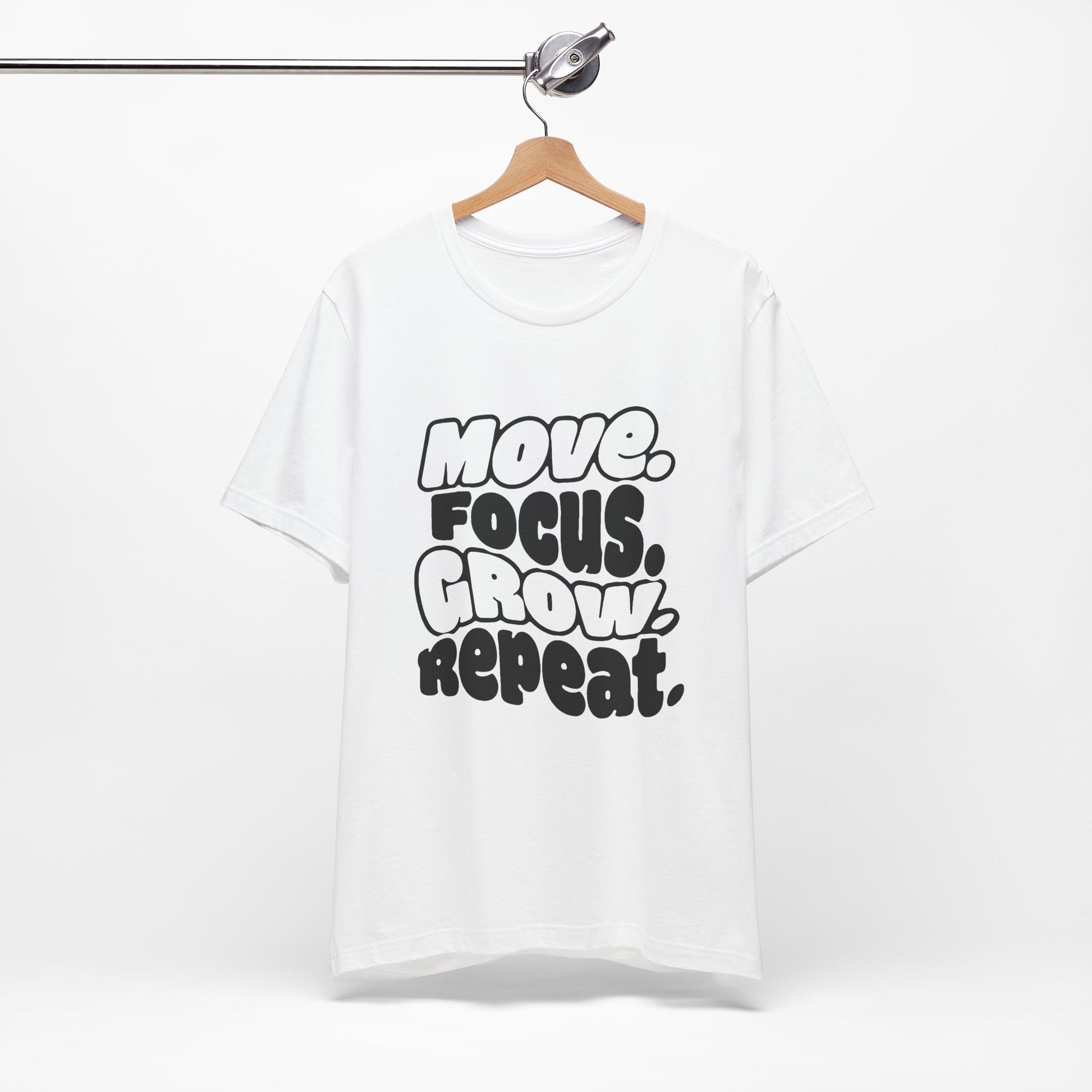 Soft, breathable tee with a bold, hand-lettered front that reads “Move. Focus. Grow. Repeat”—a simple mantra turned into wearable motivation. The lightweight Airlume combed and ring-spun cotton feels gentle on skin and layers easily under jackets or over long sleeves. A clean crew neckline and retail fit give a neat silhouette that works for everyday movement, studio sessions, or relaxed city errands. The graphic uses crisp printing so the playful, chunky typography stays sharp wash after wash. Ethically made blanks and a tear-away label keep comfort and conscience aligned.