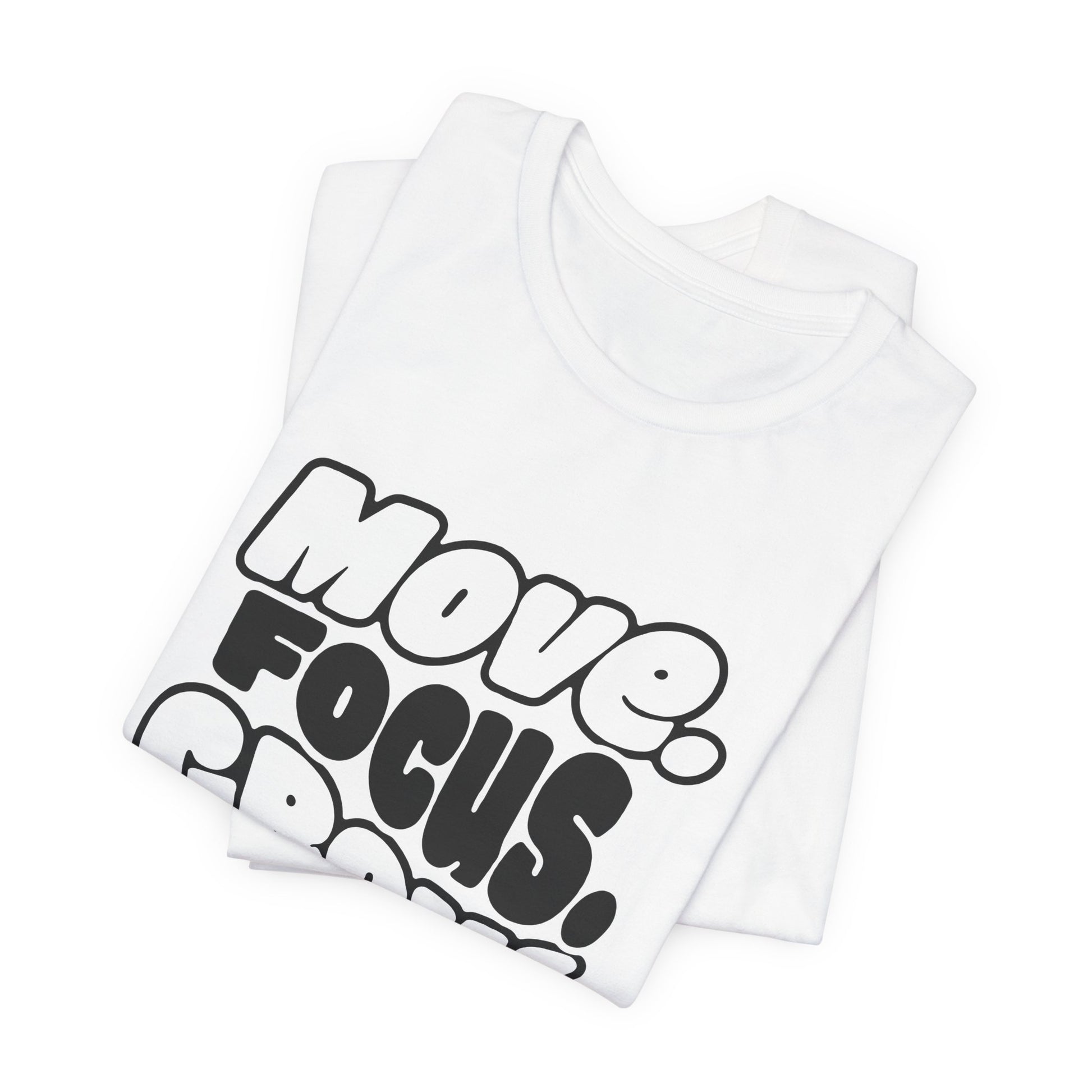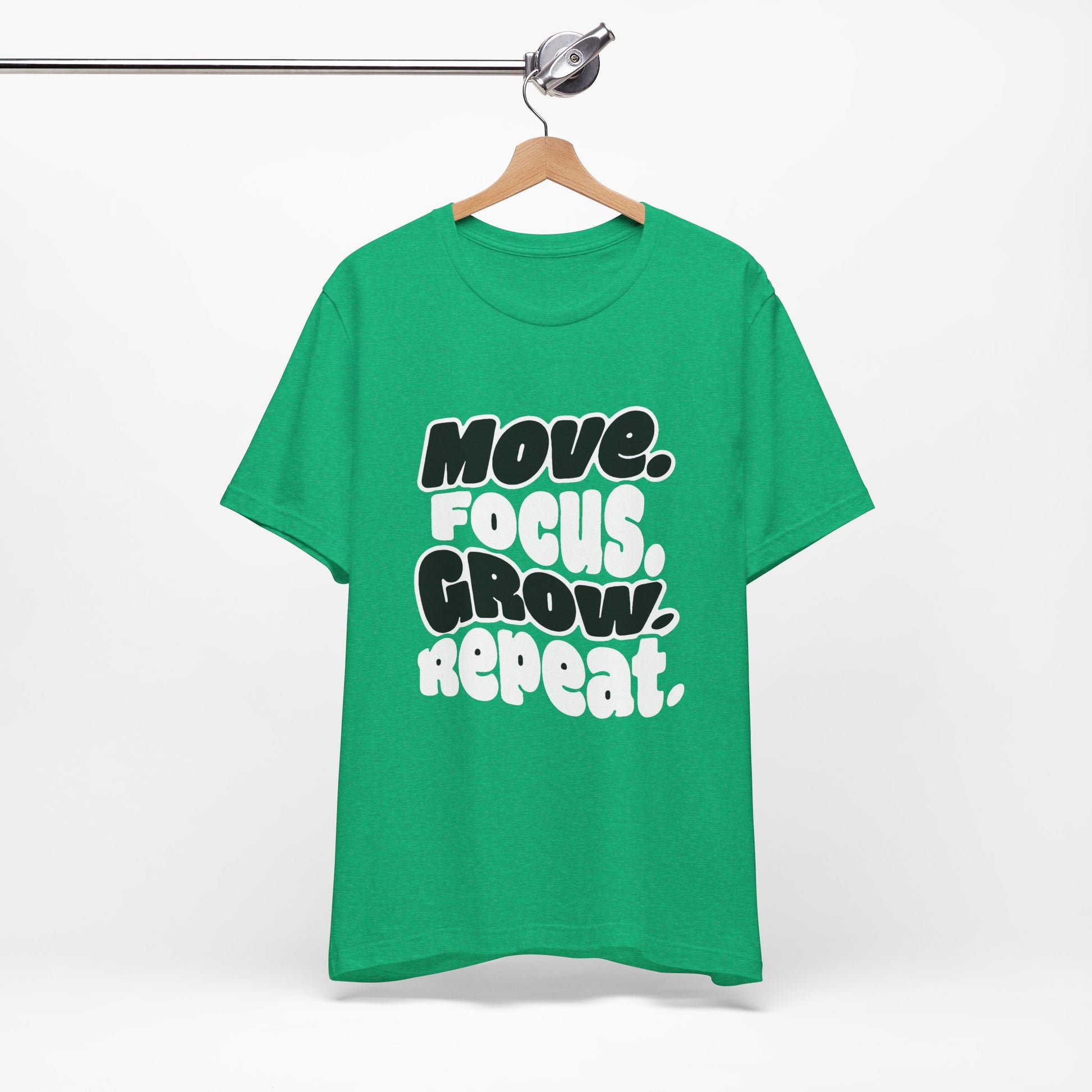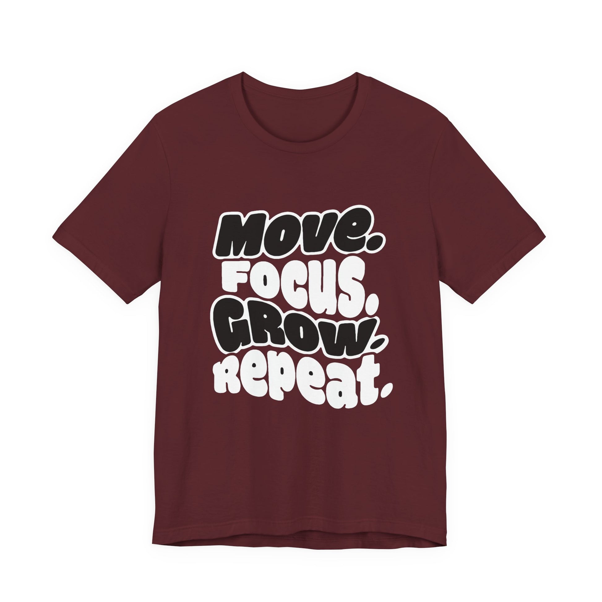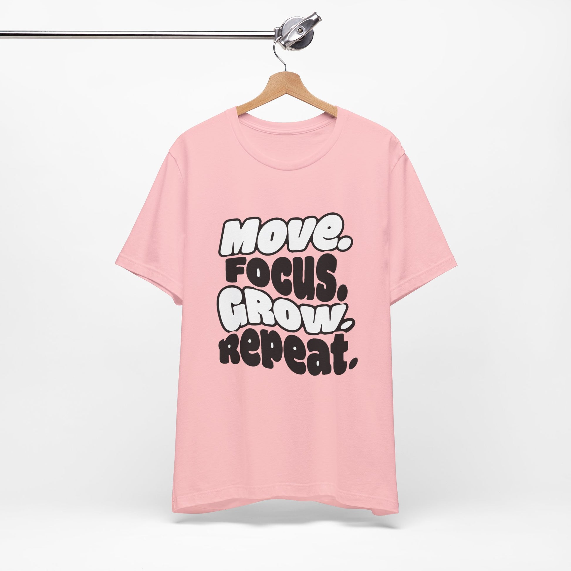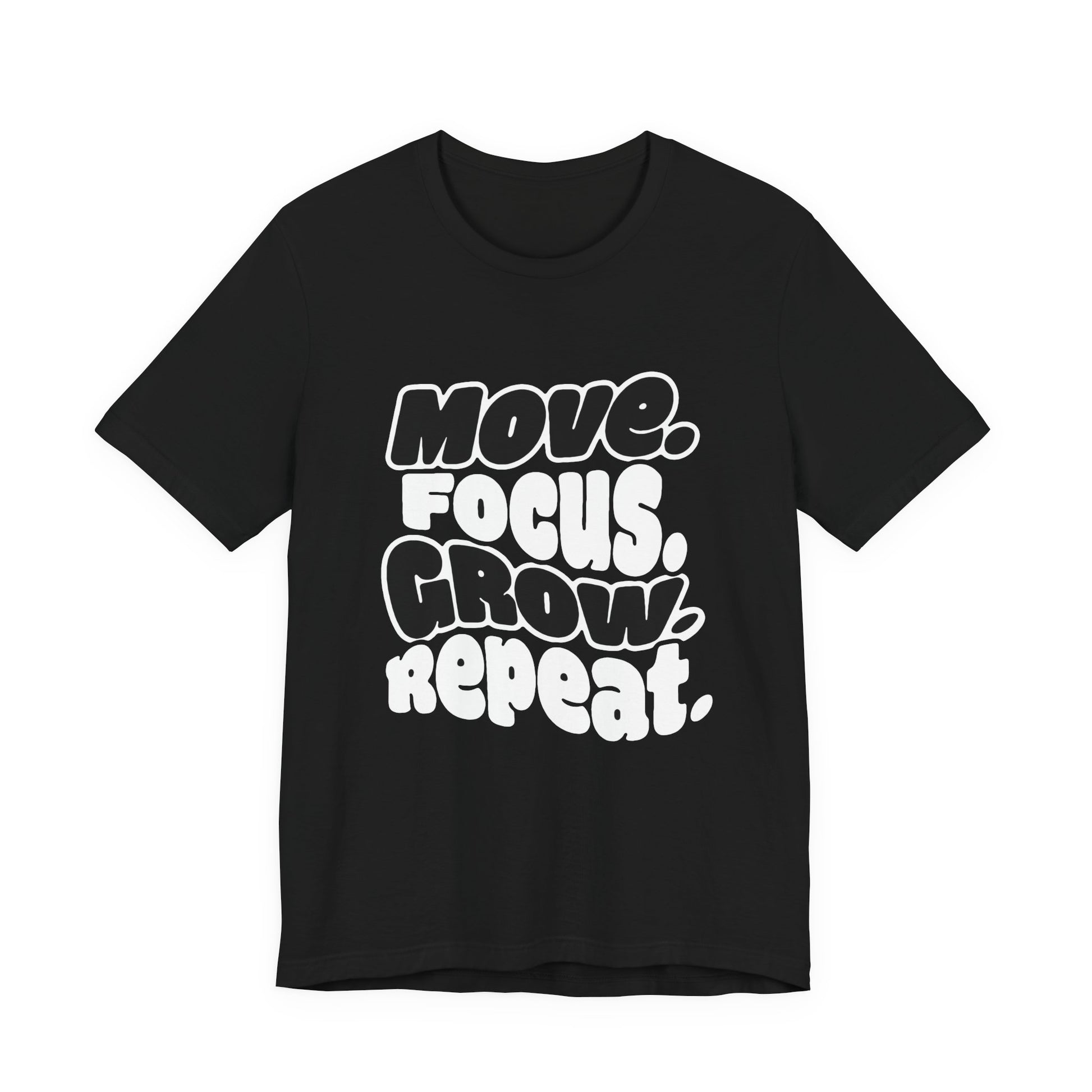 Soft, breathable tee with a bold, hand-lettered front that reads “Move. Focus. Grow. Repeat”—a simple mantra turned into wearable motivation. The lightweight Airlume combed and ring-spun cotton feels gentle on skin and layers easily under jackets or over long sleeves. A clean crew neckline and retail fit give a neat silhouette that works for everyday movement, studio sessions, or relaxed city errands. The graphic uses crisp printing so the playful, chunky typography stays sharp wash after wash. Ethically made blanks and a tear-away label keep comfort and conscience aligned.