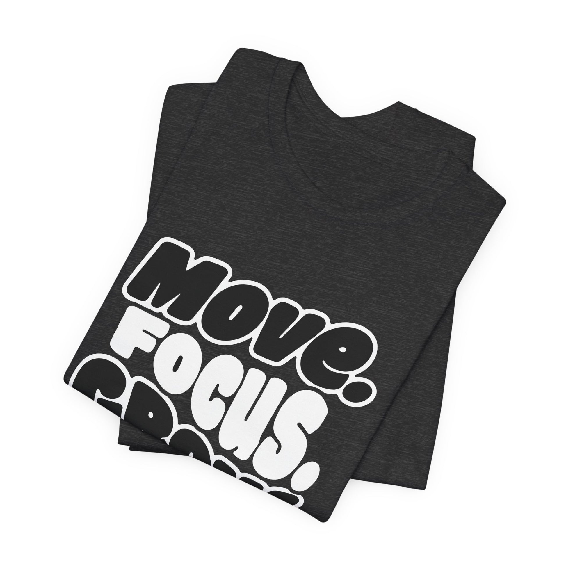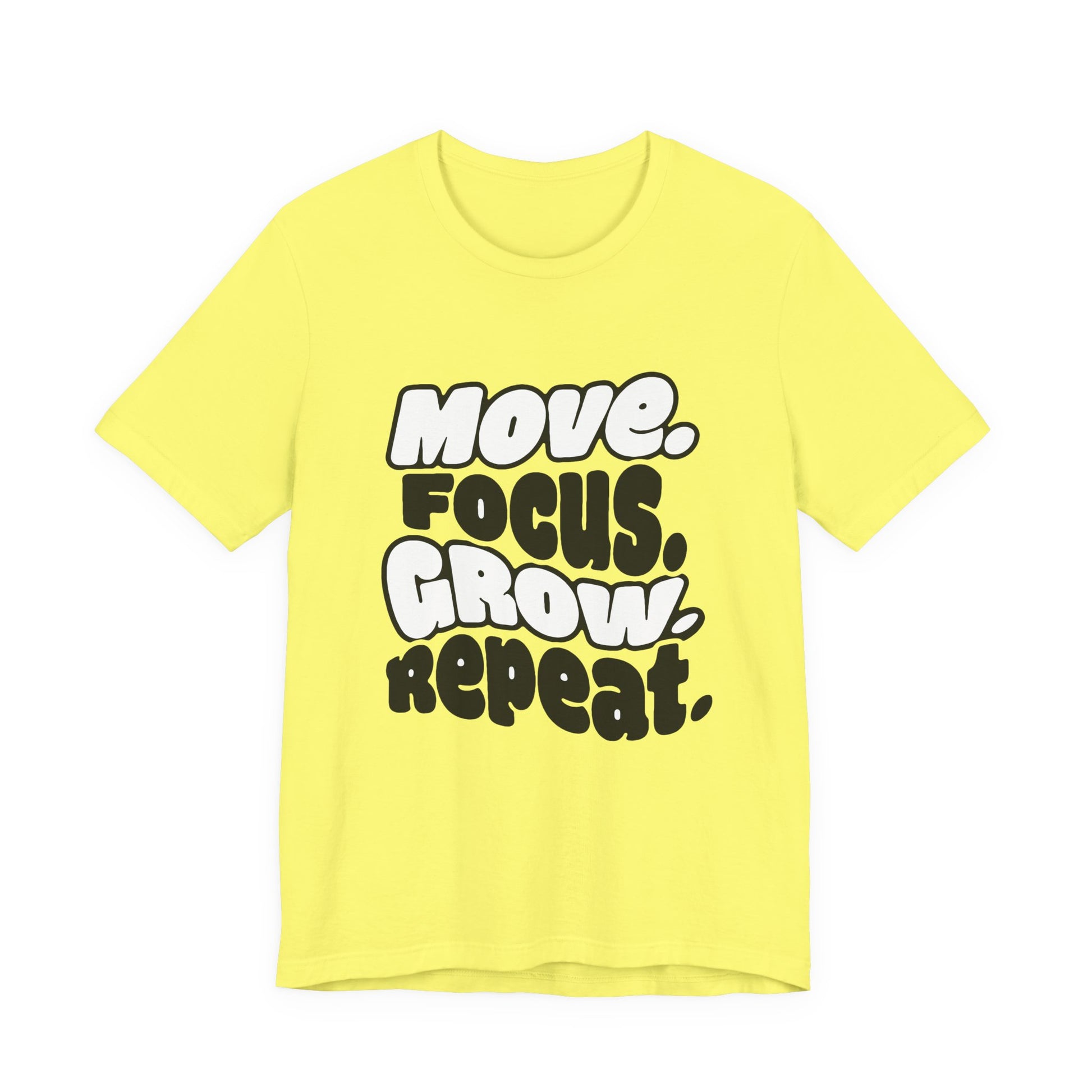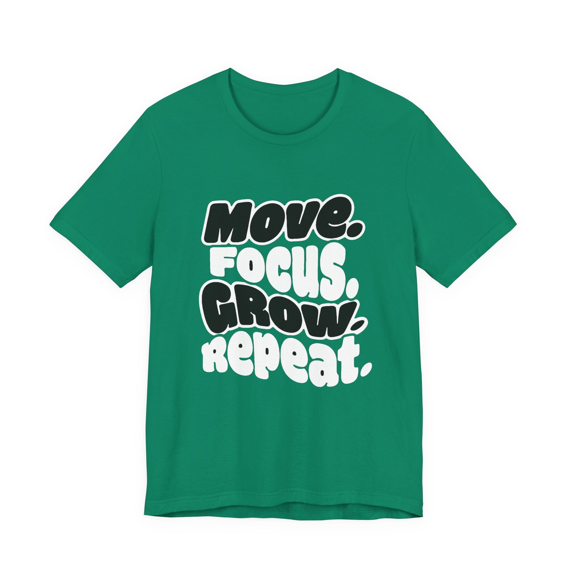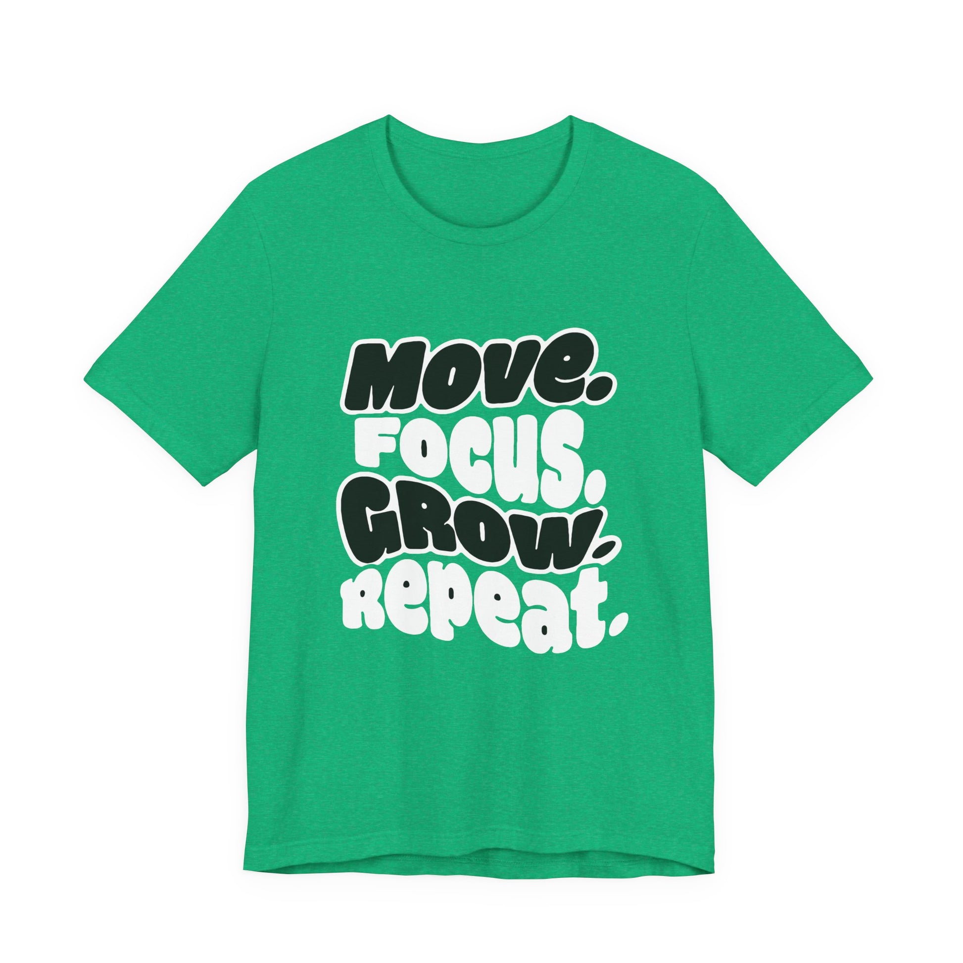 Soft, breathable tee with a bold, hand-lettered front that reads “Move. Focus. Grow. Repeat”—a simple mantra turned into wearable motivation. The lightweight Airlume combed and ring-spun cotton feels gentle on skin and layers easily under jackets or over long sleeves. A clean crew neckline and retail fit give a neat silhouette that works for everyday movement, studio sessions, or relaxed city errands. The graphic uses crisp printing so the playful, chunky typography stays sharp wash after wash. Ethically made blanks and a tear-away label keep comfort and conscience aligned.