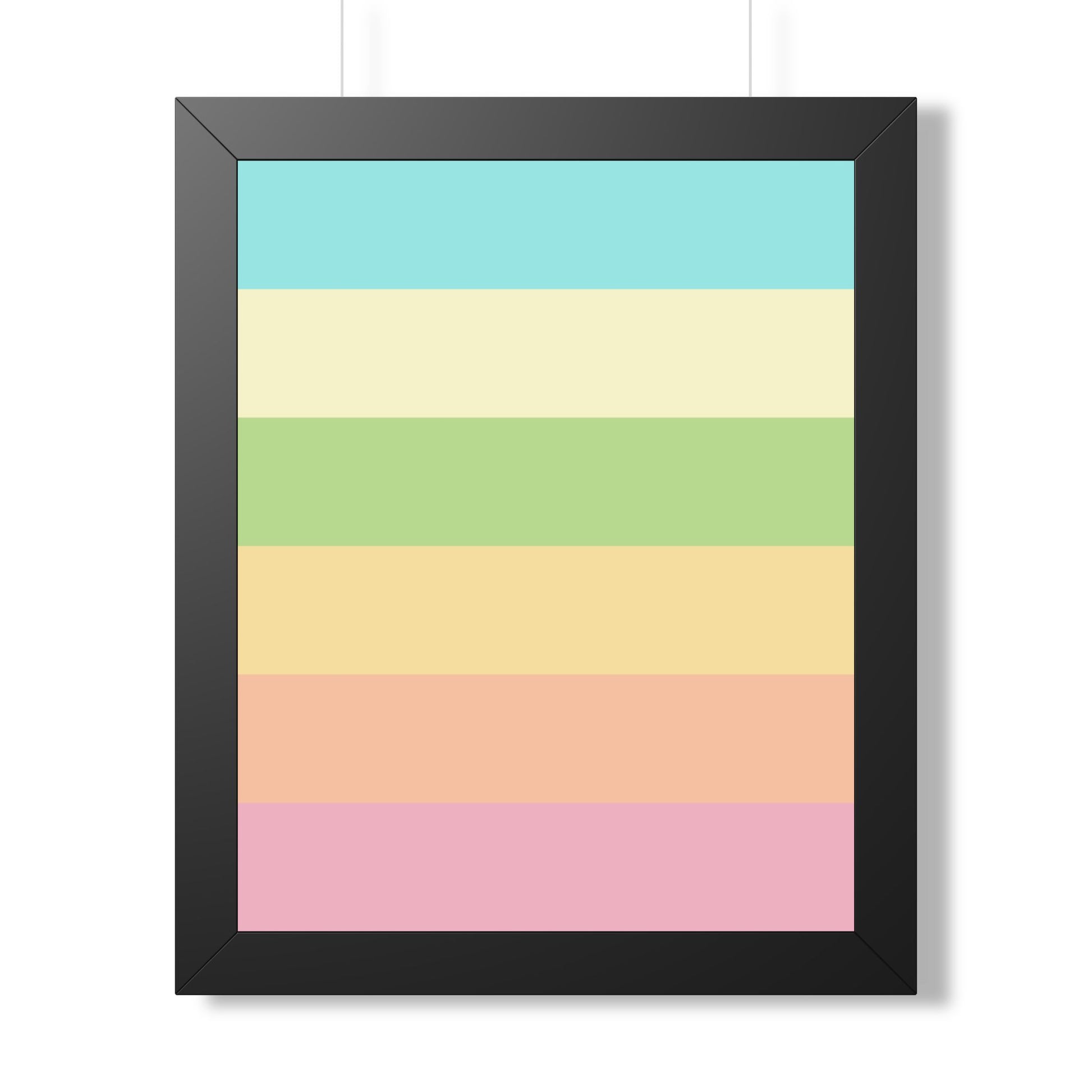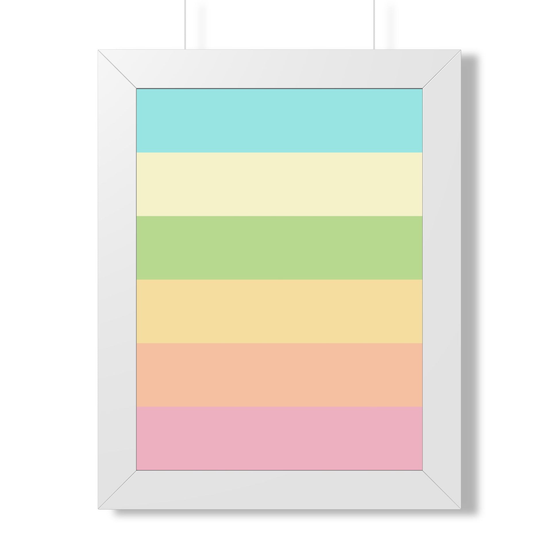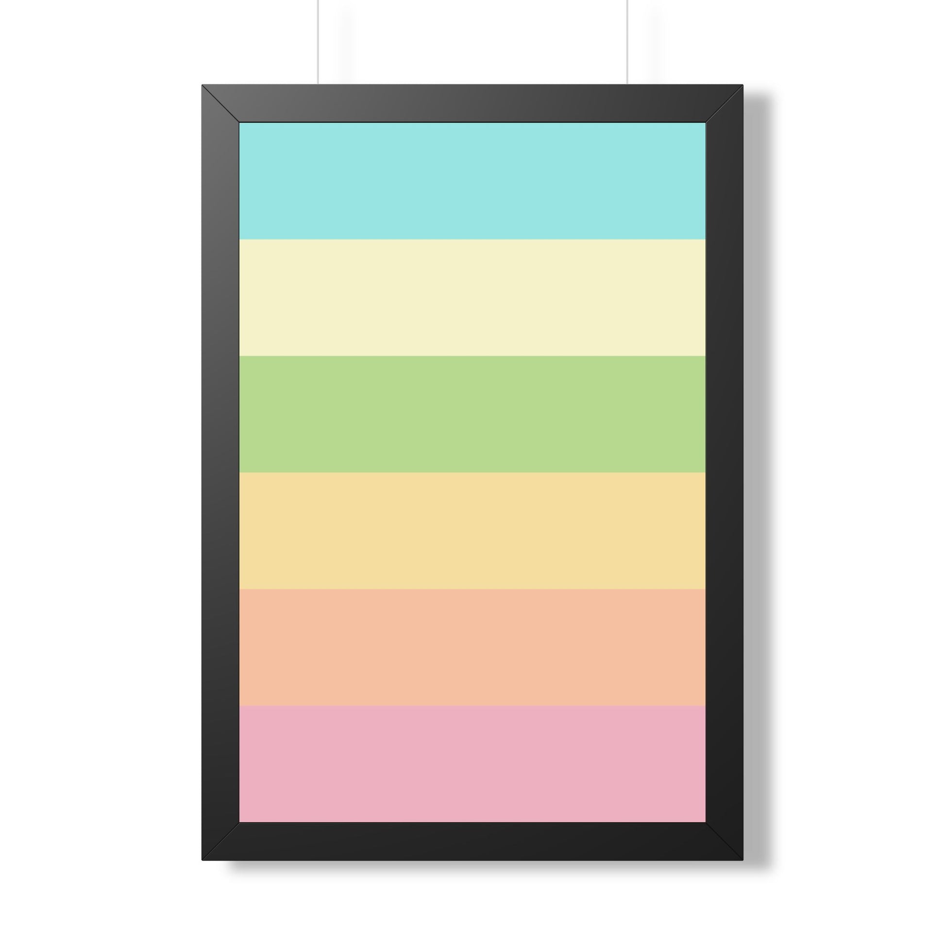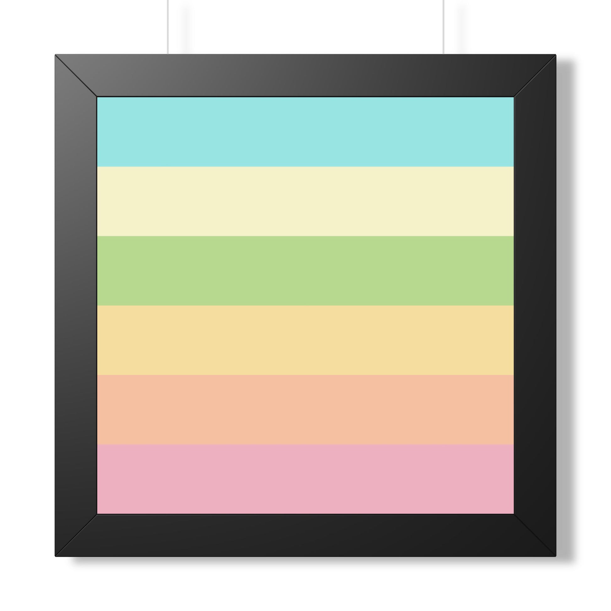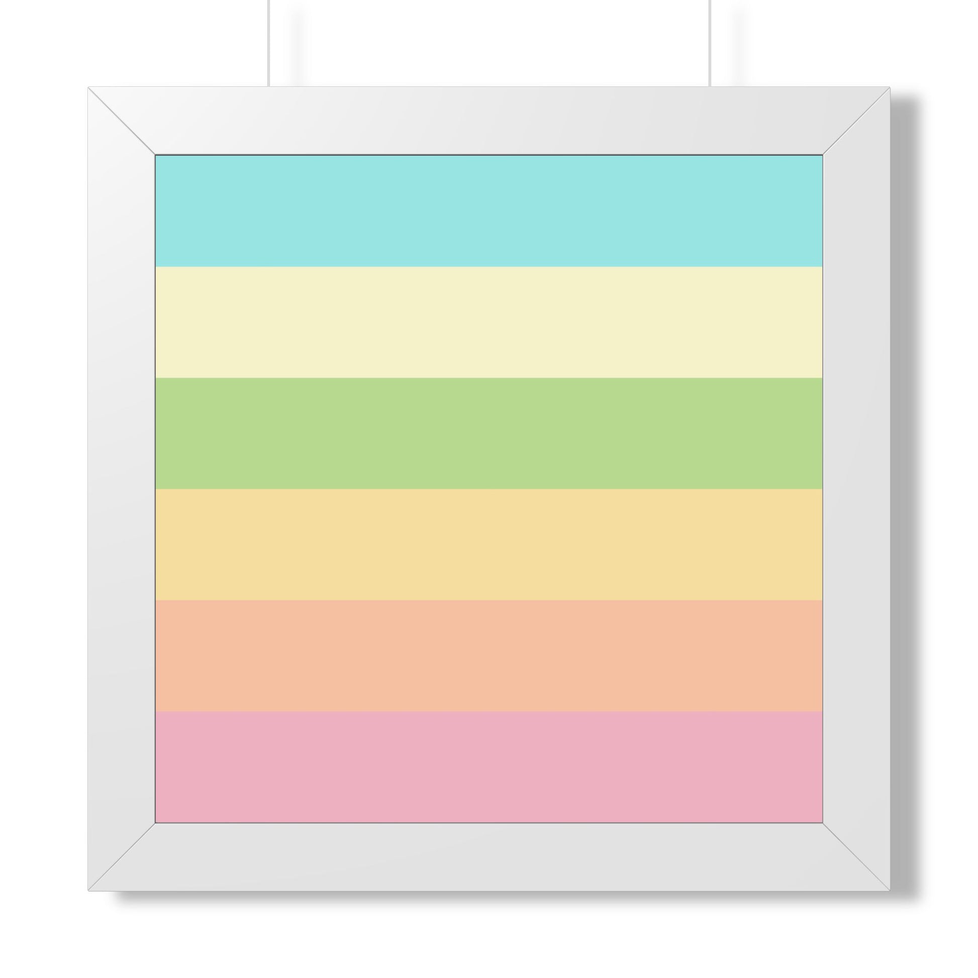 A calm, sunlit square poster framed in your choice of black, white, or warm walnut. Soft horizontal bands flow from minty aqua through creamy yellow and sage to gentle peach and rose, creating a soothing, retro-modern palette that settles into any living room, nursery, or office. Printed on museum-grade matte paper and protected behind clear acrylic, the artwork feels both delicate and durable. Lightweight frame options—MDF or Ayous wood—arrive ready to hang with built-in hardware or included fittings. This piece brings a quiet, optimistic rhythm to a blank wall and pairs naturally with plants, textured ceramics, and minimalist shelving.
