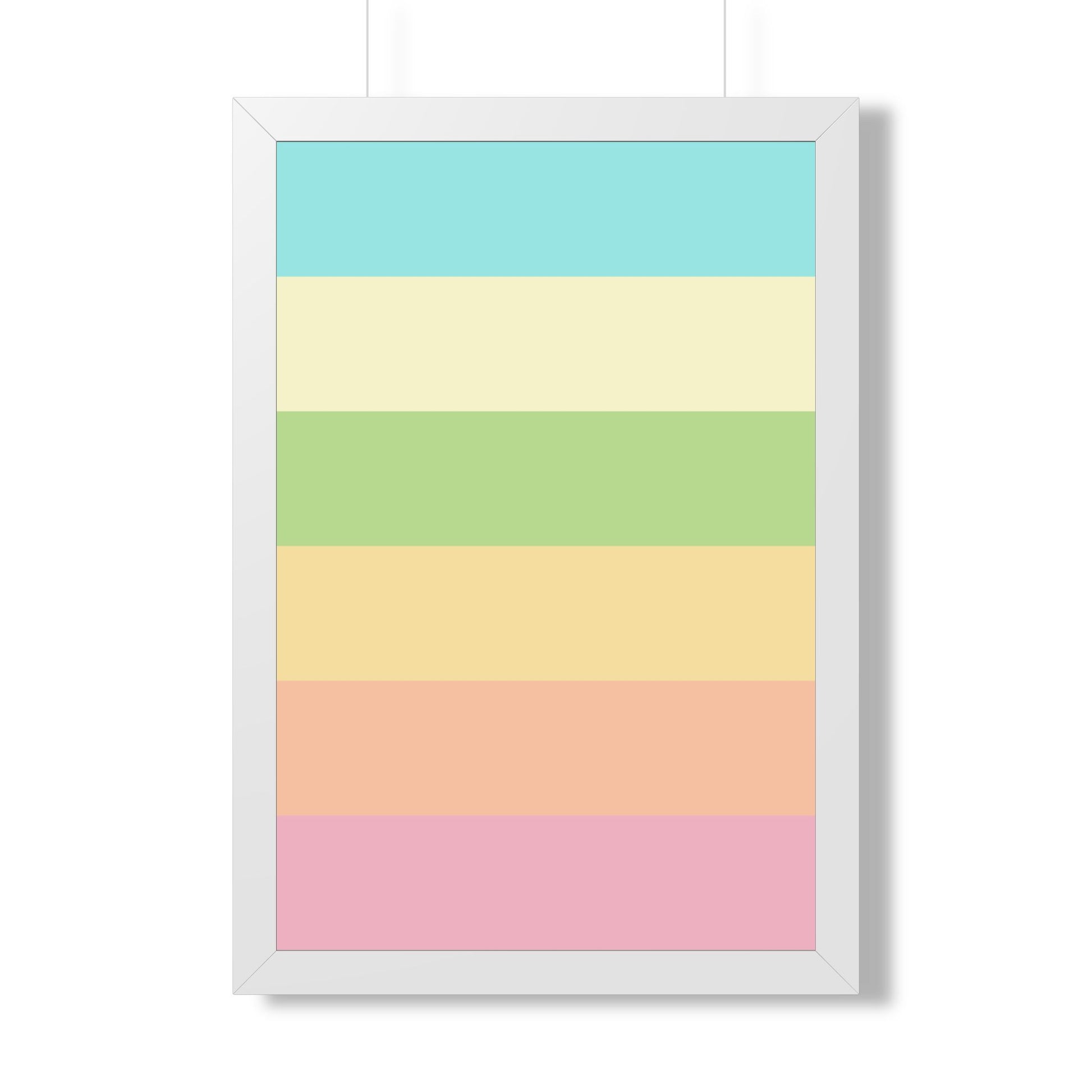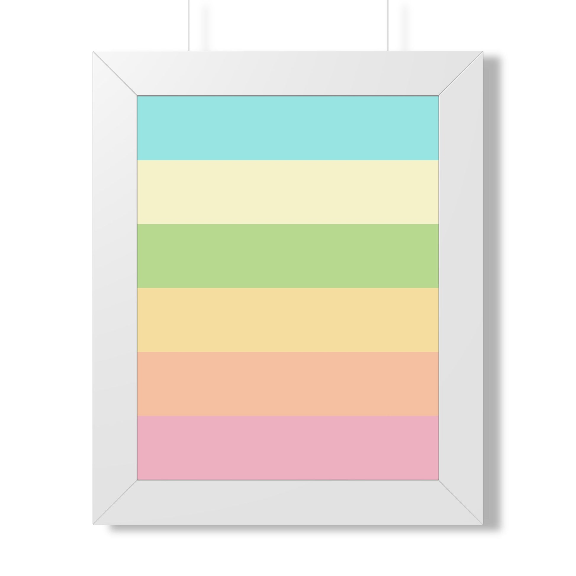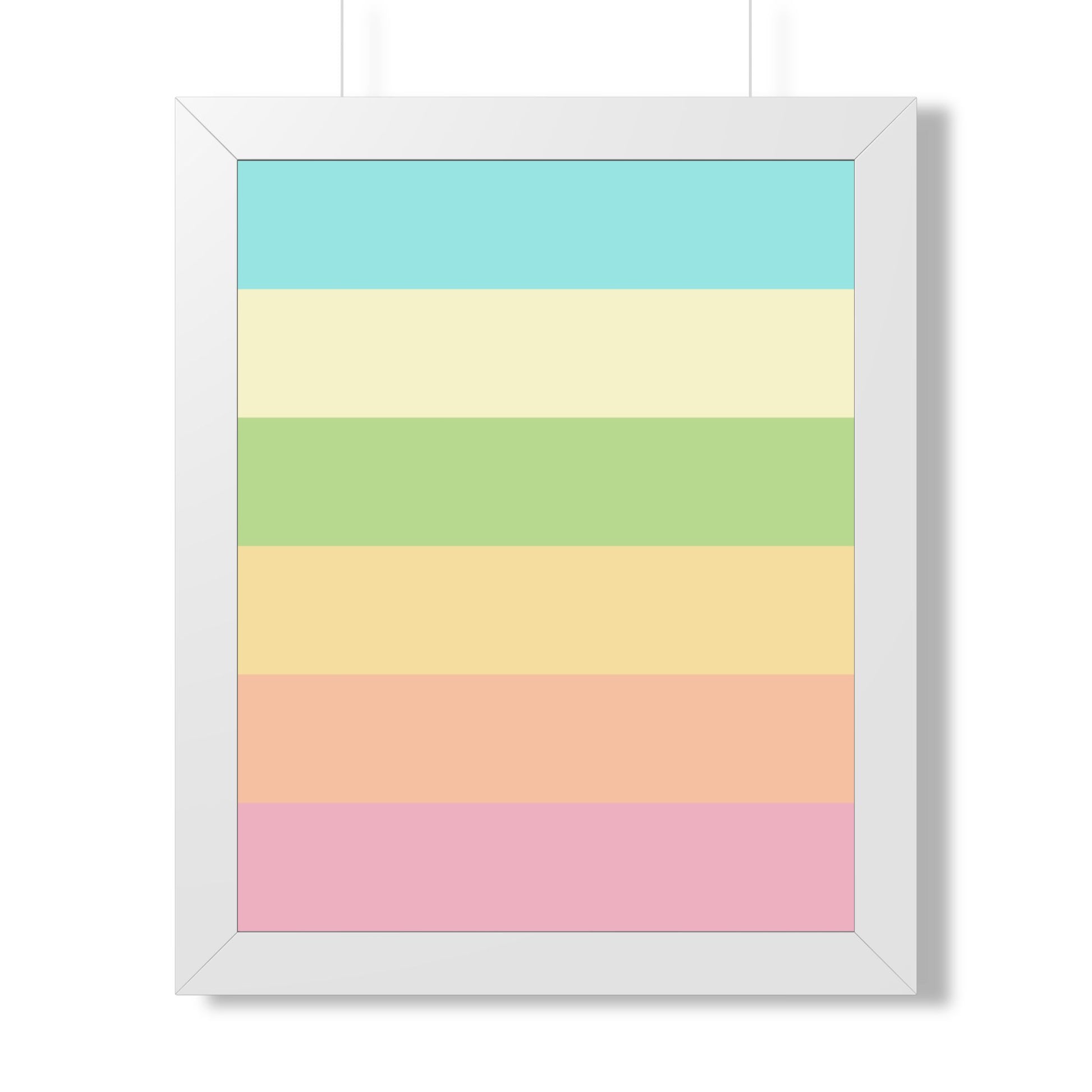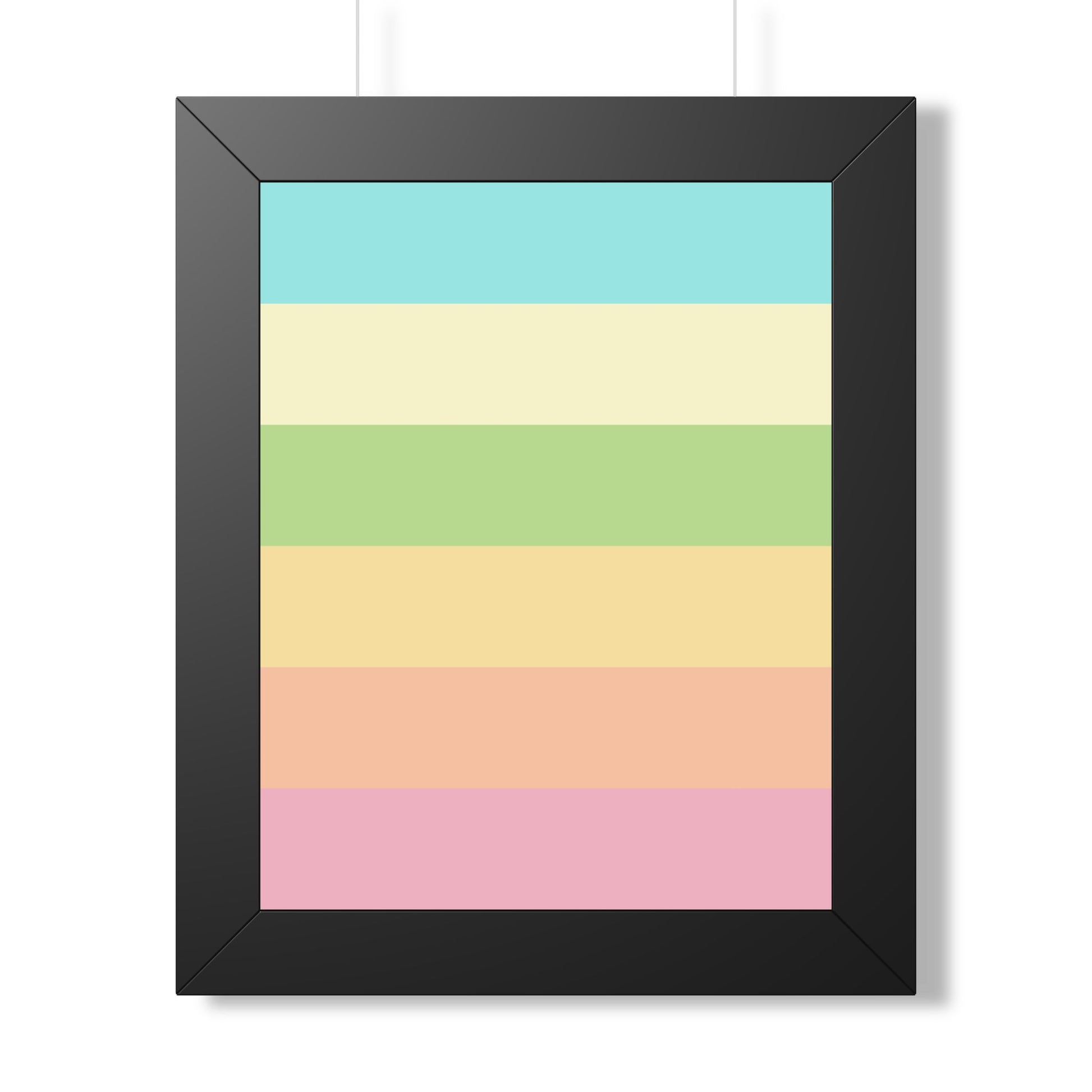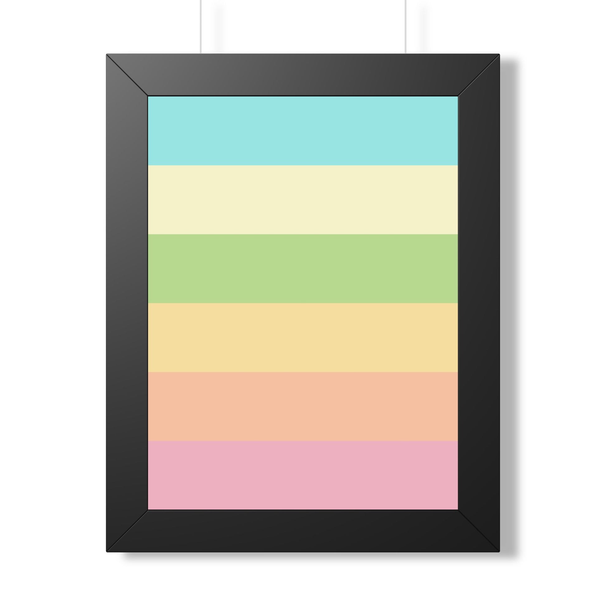 A calm, sunlit square poster framed in your choice of black, white, or warm walnut. Soft horizontal bands flow from minty aqua through creamy yellow and sage to gentle peach and rose, creating a soothing, retro-modern palette that settles into any living room, nursery, or office. Printed on museum-grade matte paper and protected behind clear acrylic, the artwork feels both delicate and durable. Lightweight frame options—MDF or Ayous wood—arrive ready to hang with built-in hardware or included fittings. This piece brings a quiet, optimistic rhythm to a blank wall and pairs naturally with plants, textured ceramics, and minimalist shelving.