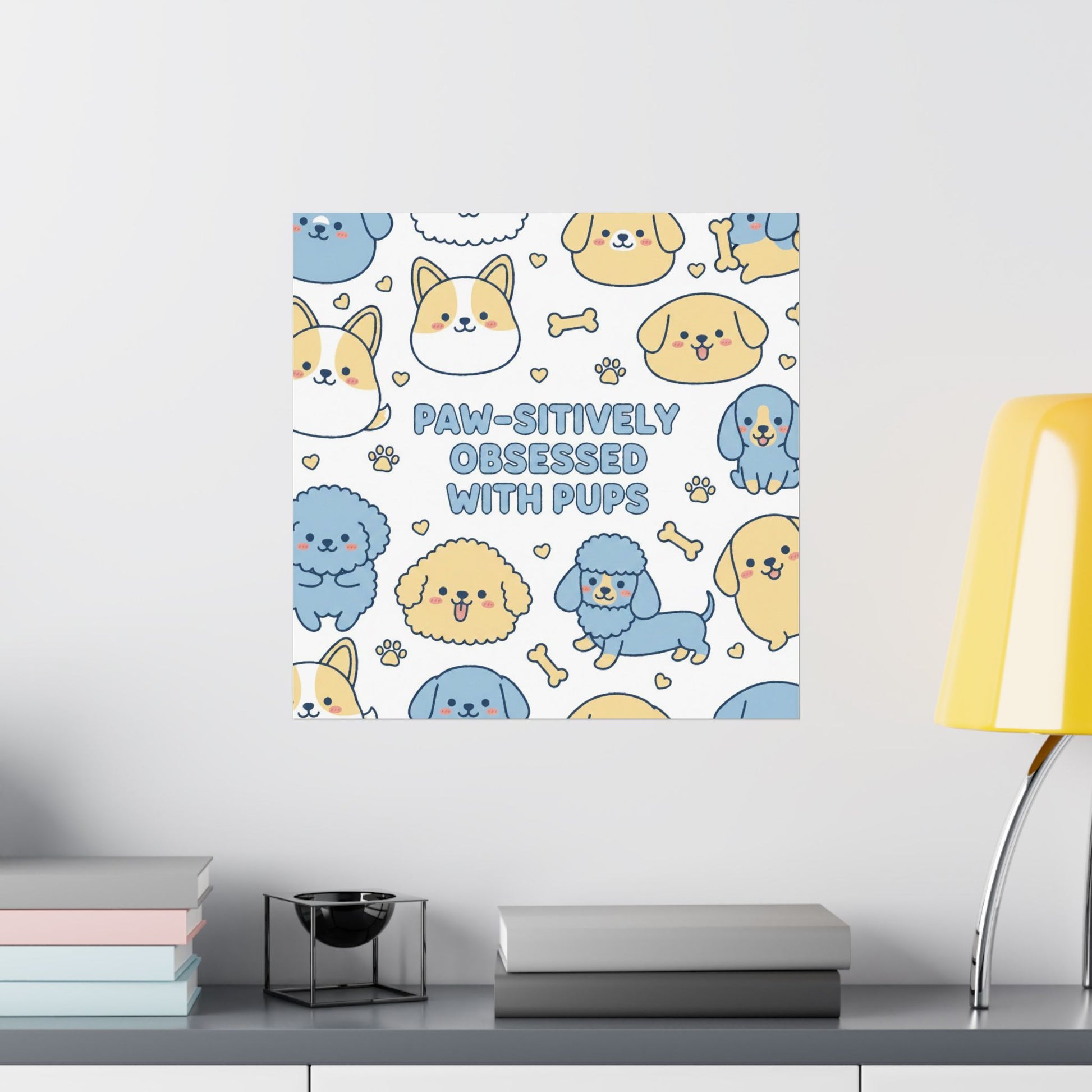 A soft-matte poster that brings whimsical puppy energy into any indoor space. Cheerful, hand-drawn pup faces—Corgis, poodles, dachshunds and more—repeat in a gentle palette of blues and buttery yellows around a playful central slogan: “Paw-sitively Obsessed With Pups.” The archival museum-grade paper and giclée printing keep colors bright and true while the light-absorbing matte finish reduces glare for easy wall display. Available in many sizes, this poster turns a plain wall into a cozy corner for dog lovers, nurseries, or casual living spaces.