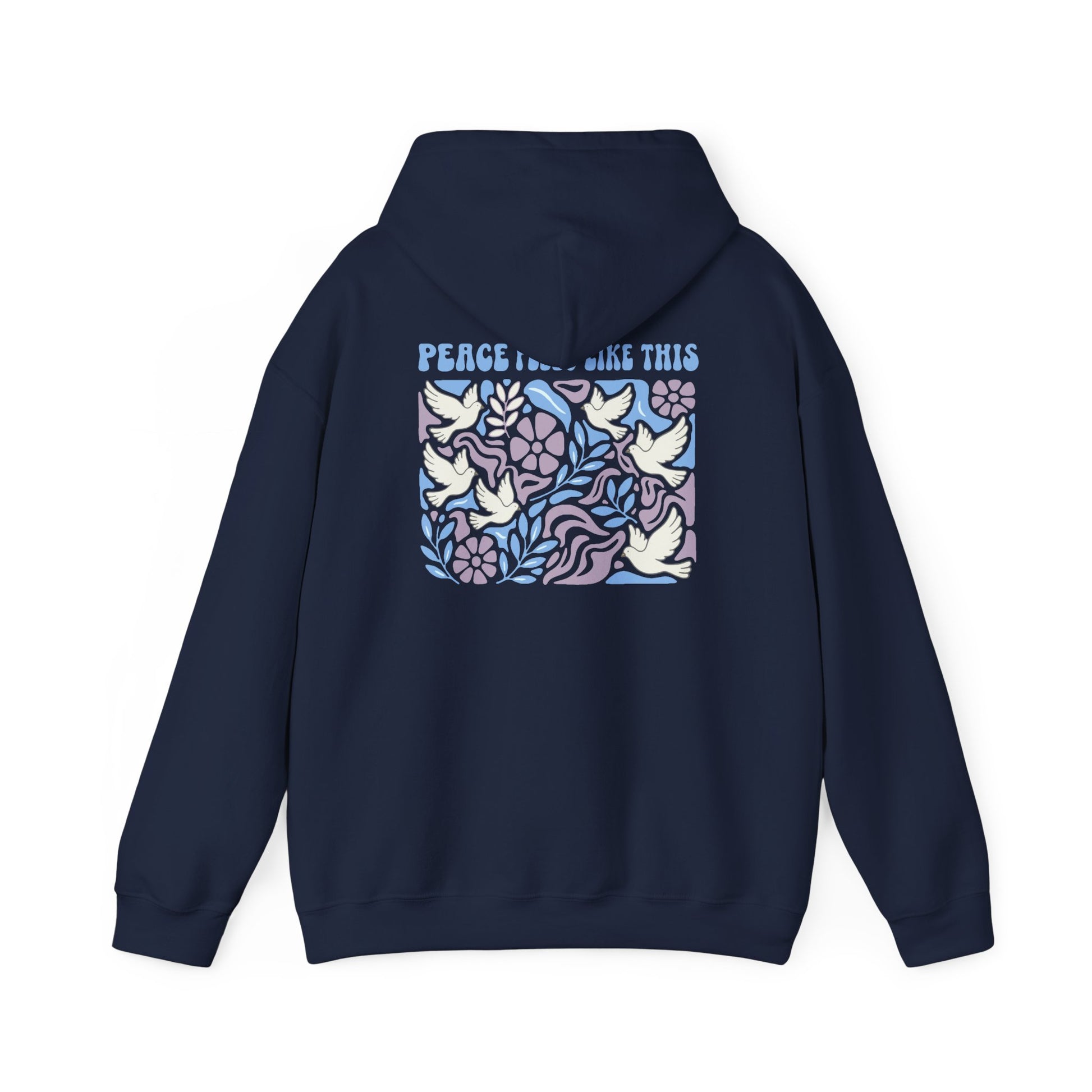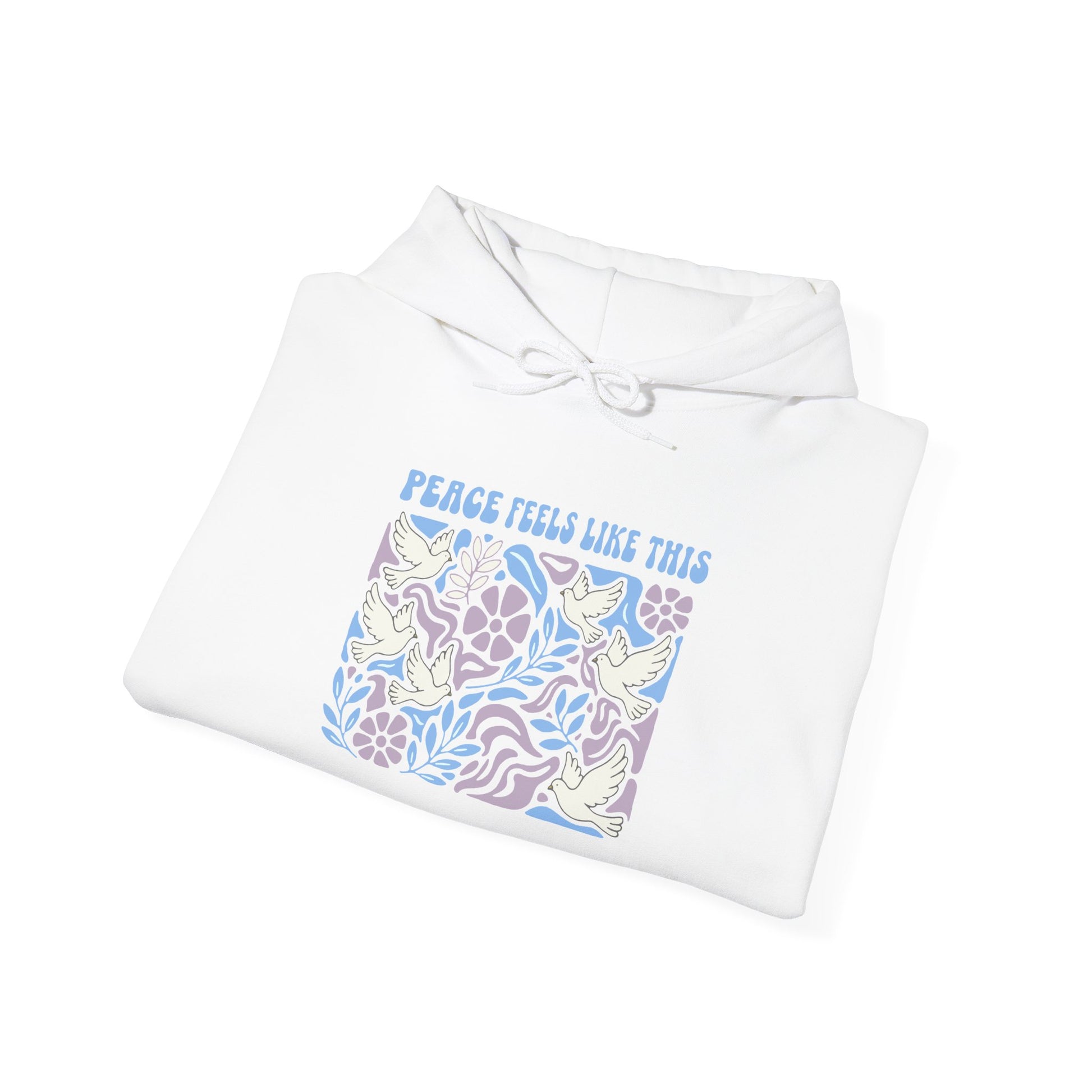 Wrap yourself in soft, comforting warmth with this cozy hooded sweatshirt featuring a dreamy pastel illustration and the gentle message “Peace, Please Like This.” The subtle, watercolor-inspired artwork blends floral and wave-like shapes in pale blues, lavenders, and creams—a quiet reminder to slow down and breathe. Lightweight-yet-structured fabric holds the print beautifully, while the roomy kangaroo pocket and double-lined hood invite relaxed, hands-in-pockets moments. Wear it on slow weekend mornings, evening walks by the canal, or low-key meetups with friends who appreciate gentle style and calm vibes.