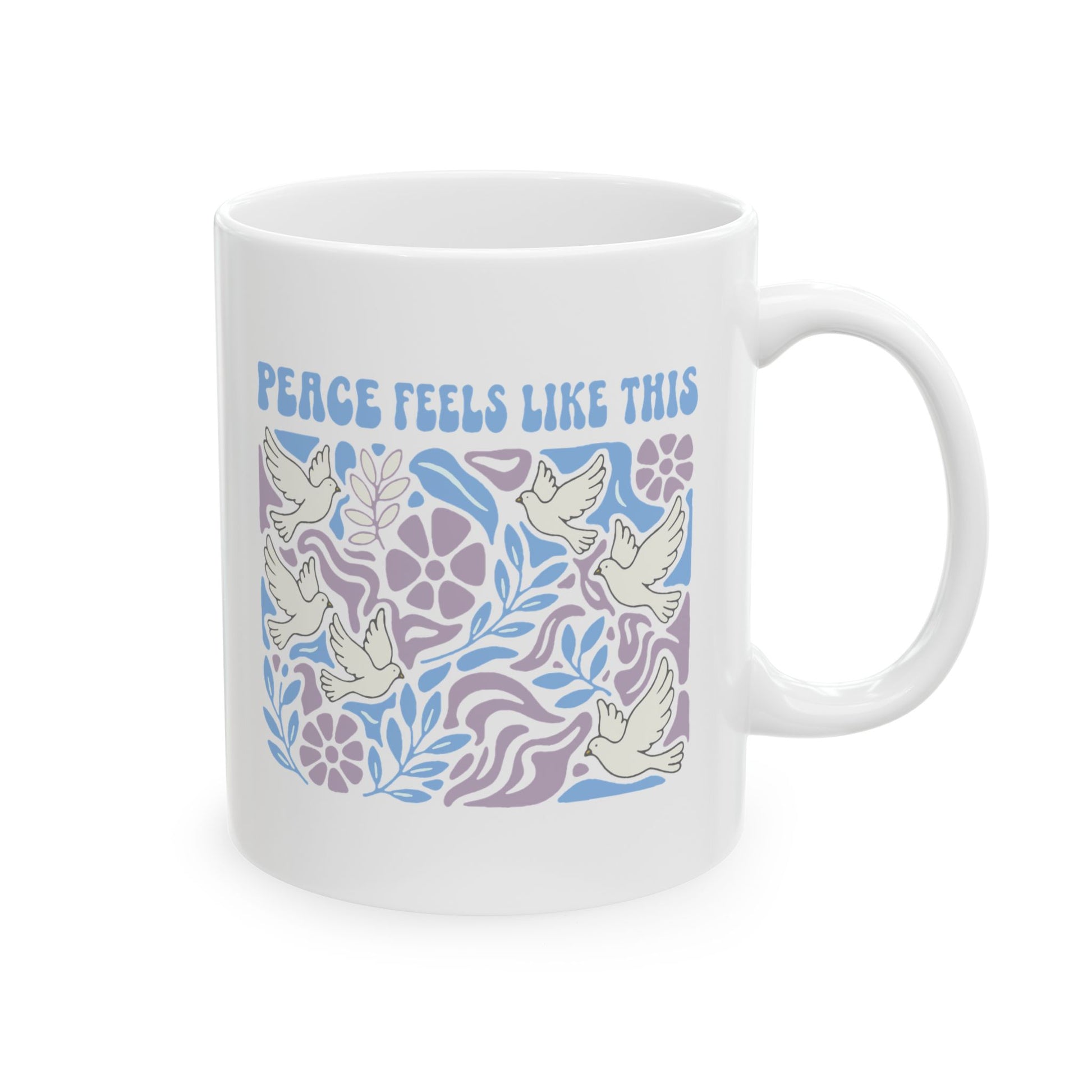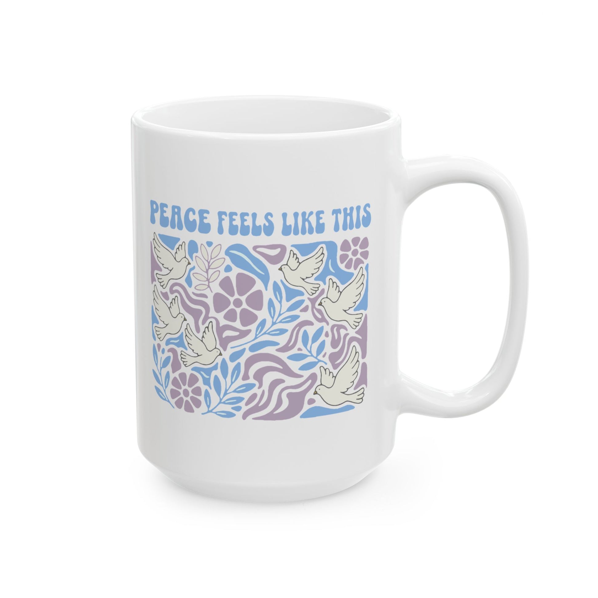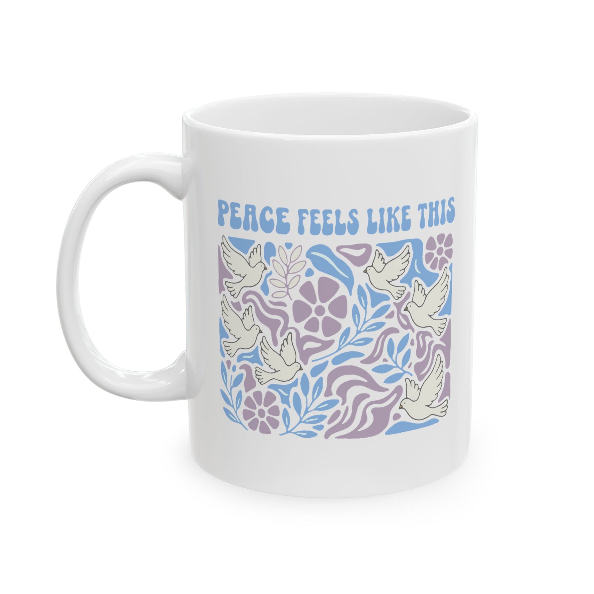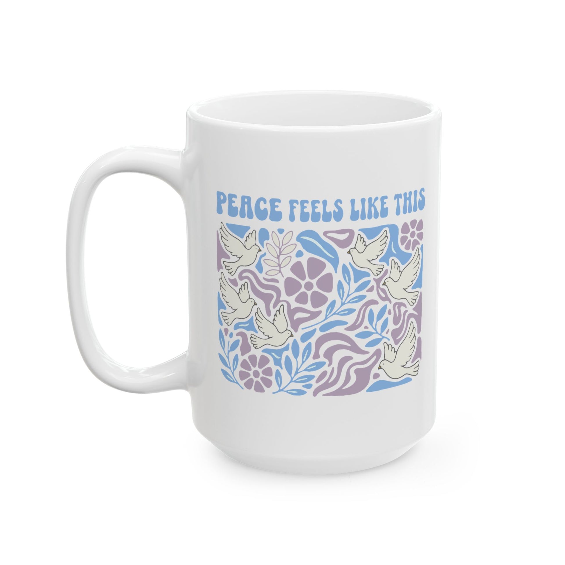 Soft pastel doves drift across a glossy white surface, carrying a calm, hopeful message between blooms and gentle waves. This ceramic mug turns a quiet morning coffee or an evening tea into a small, mindful ritual. The artwork’s soothing palette and simple lines create a peaceful pause—a reminder to breathe, reflect, and move through the day with a little more grace. It sits comfortably in hand, brightens a cluttered desk, and slips easily into the routine of someone who values warmth, calm, and thoughtful details.