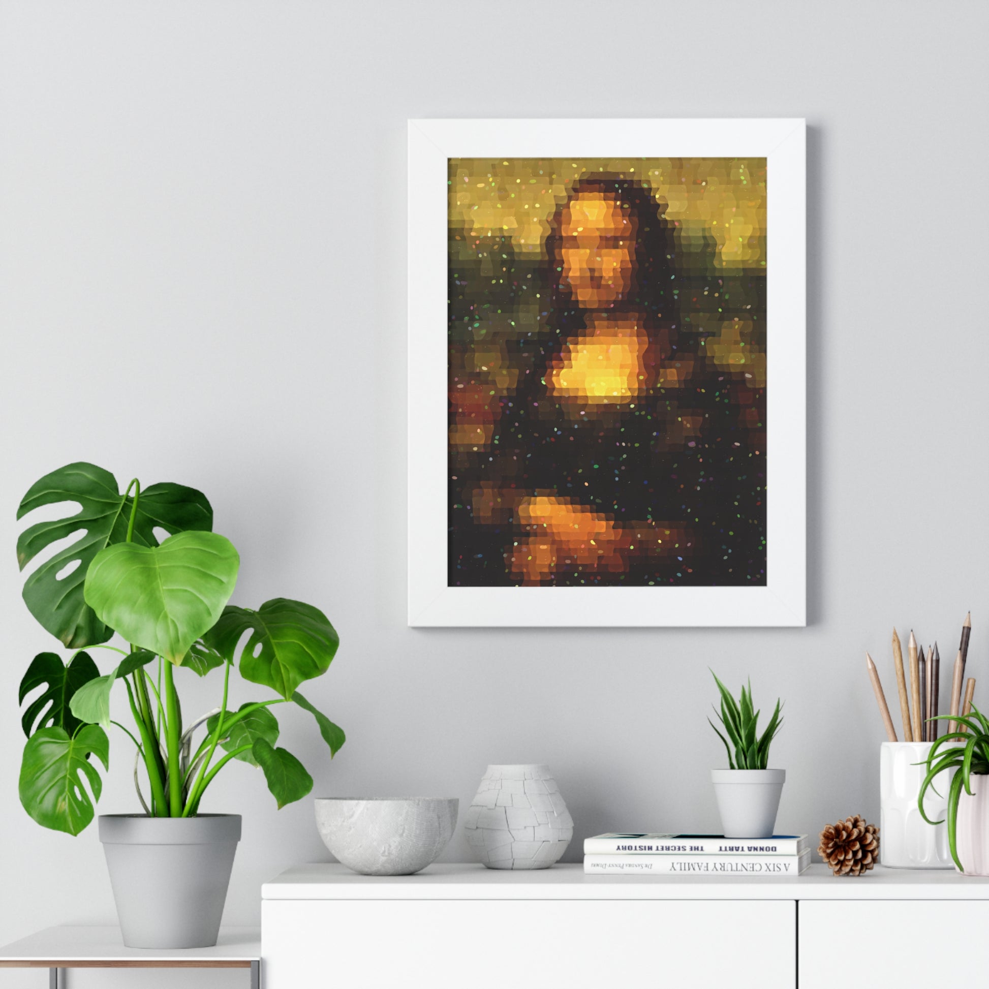 This framed vertical poster brings classic art into contemporary spaces with a warm, pixelated reinterpretation. Printed on museum-grade matte paper and sealed behind a protective acrylic cover, the image keeps soft, muted tones while adding a modern, mosaic-like texture that invites closer inspection. The slim frame—available in black, walnut, or white—creates a clean vertical silhouette that fits narrow walls, stair landings, entryways, or home workspaces. Lightweight yet sturdy, the frame includes built-in hanging hardware (or packaged hardware depending on choice) so it arrives ready to display. The overall effect is quietly nostalgic: familiar subject matter reimagined for a home that values artful detail and subtle personality.