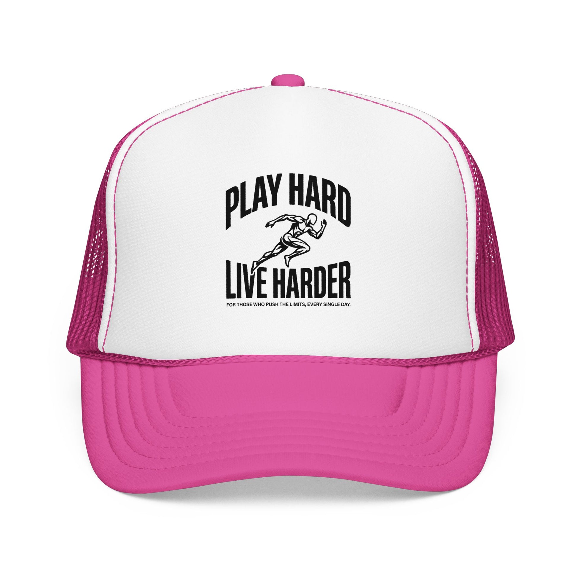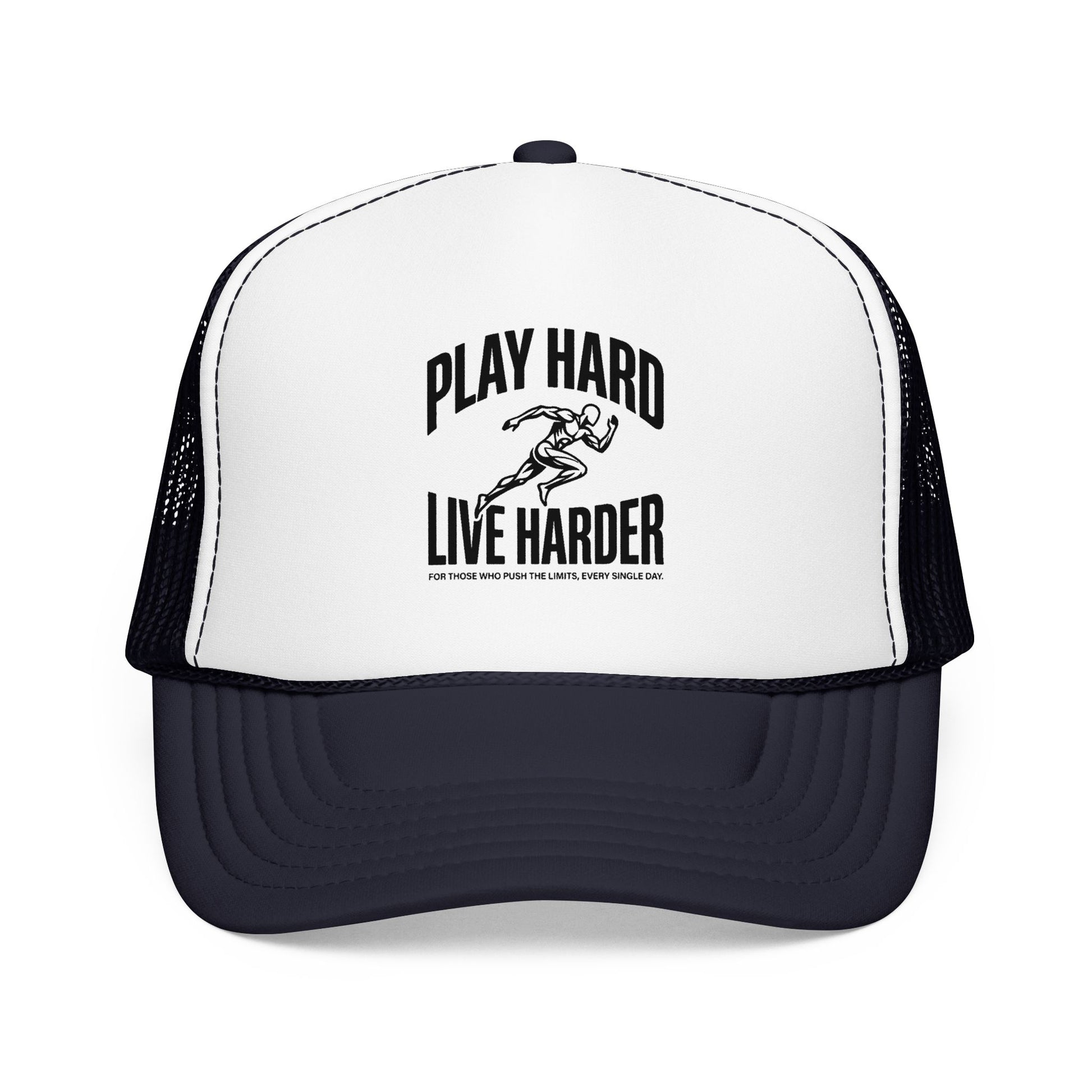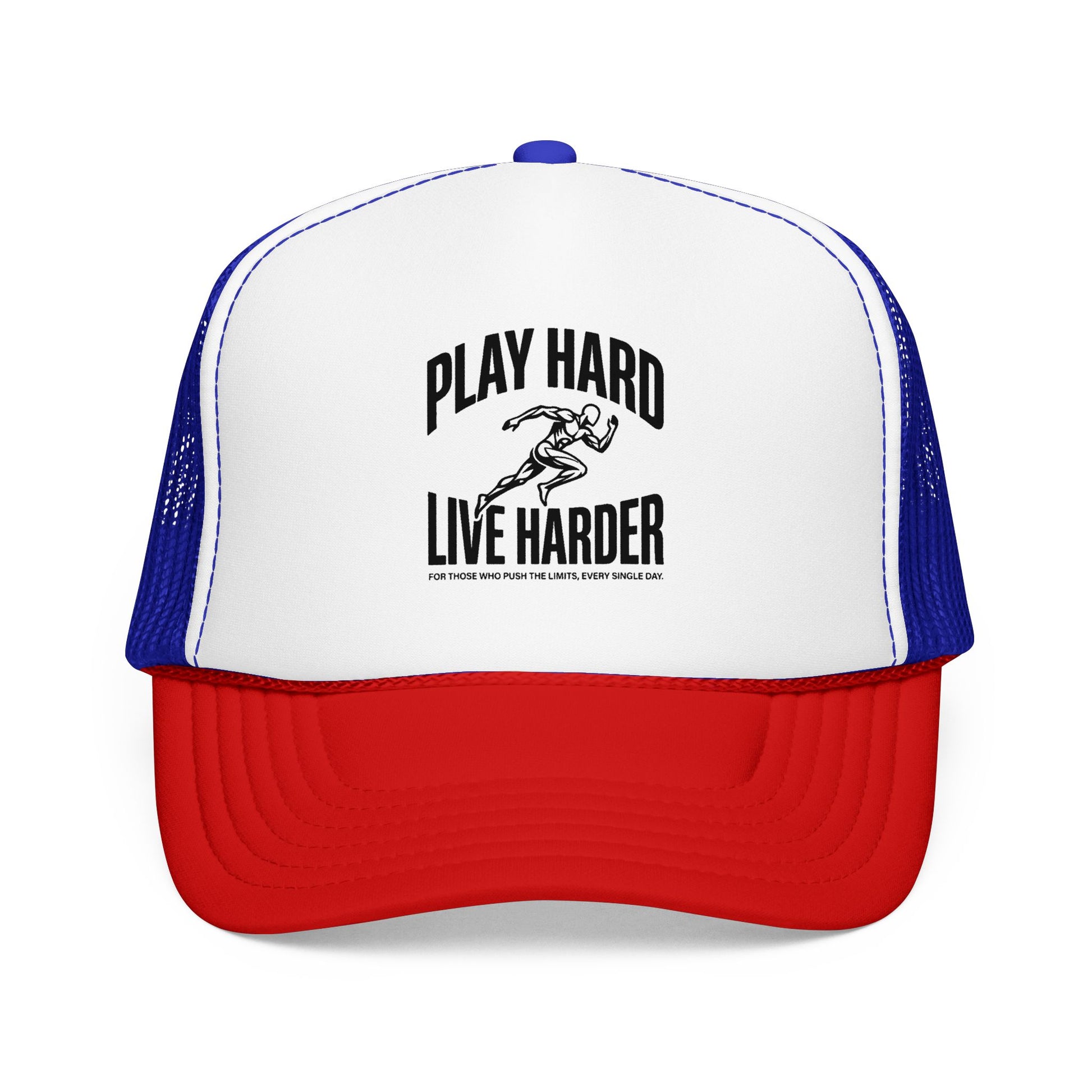A bold foam trucker hat made for people who chase sweat, stories, and the next good challenge. The structured, high-profile front holds a distressed 'PLAY HARD LIVE HARDER' graphic that reads like a rallying cry — gritty, energetic, ready for miles. Breathable mesh at the back keeps things cool during long training days or festival afternoons. The pre-curved visor and padded foam front give the hat a vintage-meets-tough look that stays put through hikes, runs, and road trips. Adjustable snap closure lets you dial in a comfortable fit, while the thick, laminated foam front keeps the graphic crisp and prominent. Wear it on early morning runs, summer bike rides, or pulled low at the end of a long day — it’s the kind of cap that sounds like footsteps on gravel and victory at the finish line.