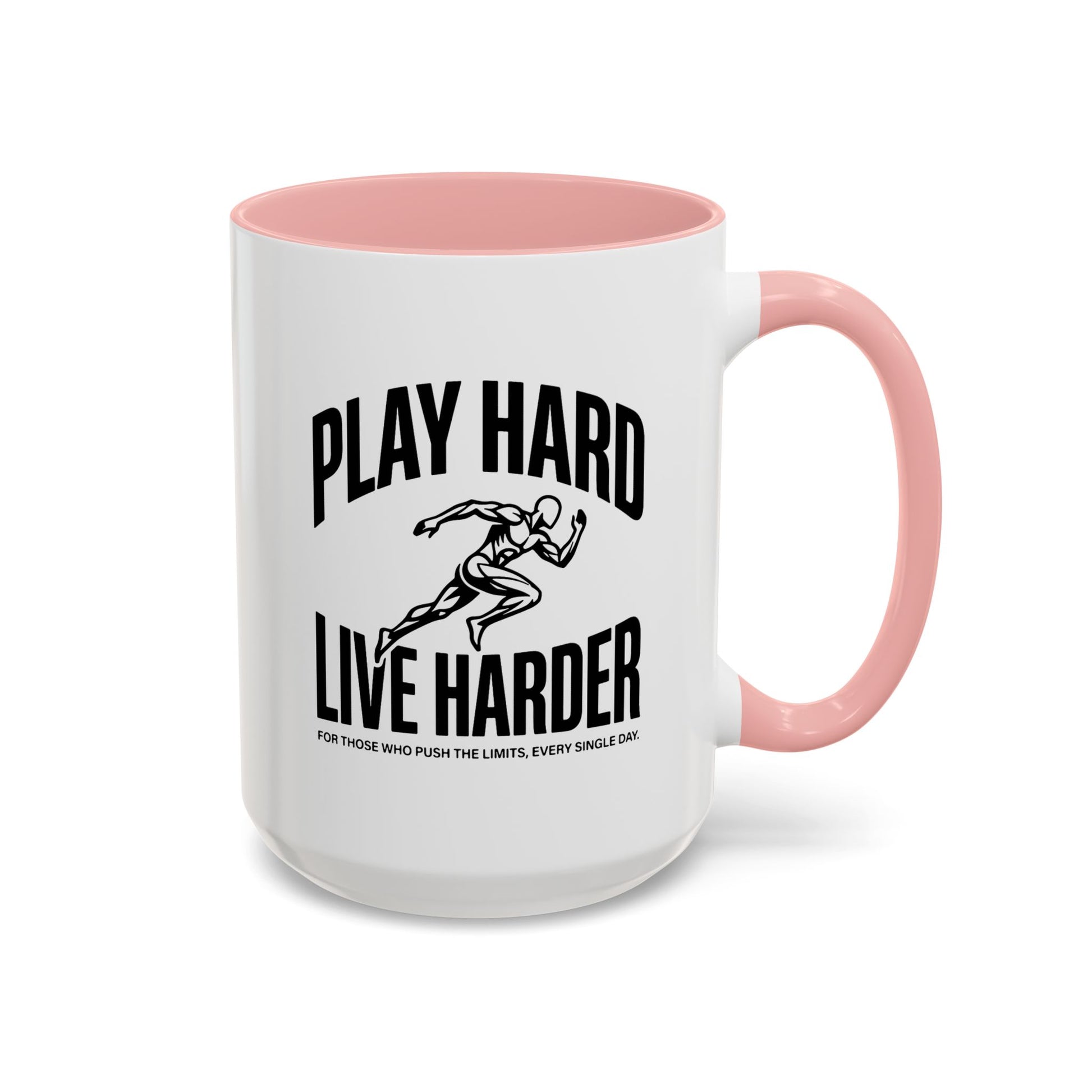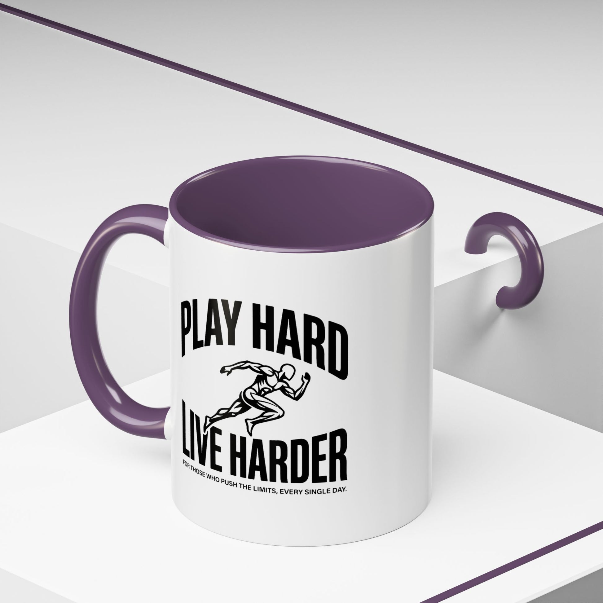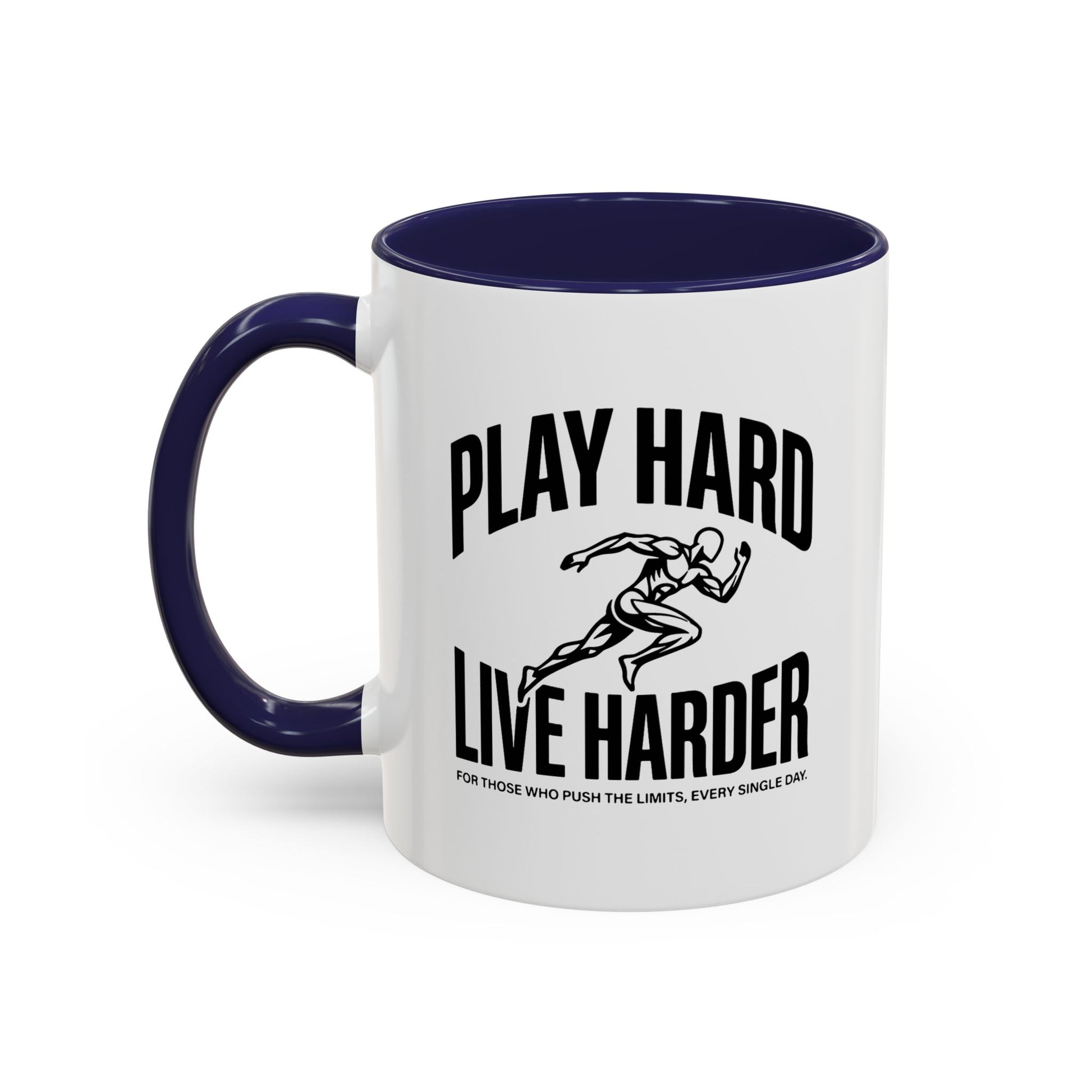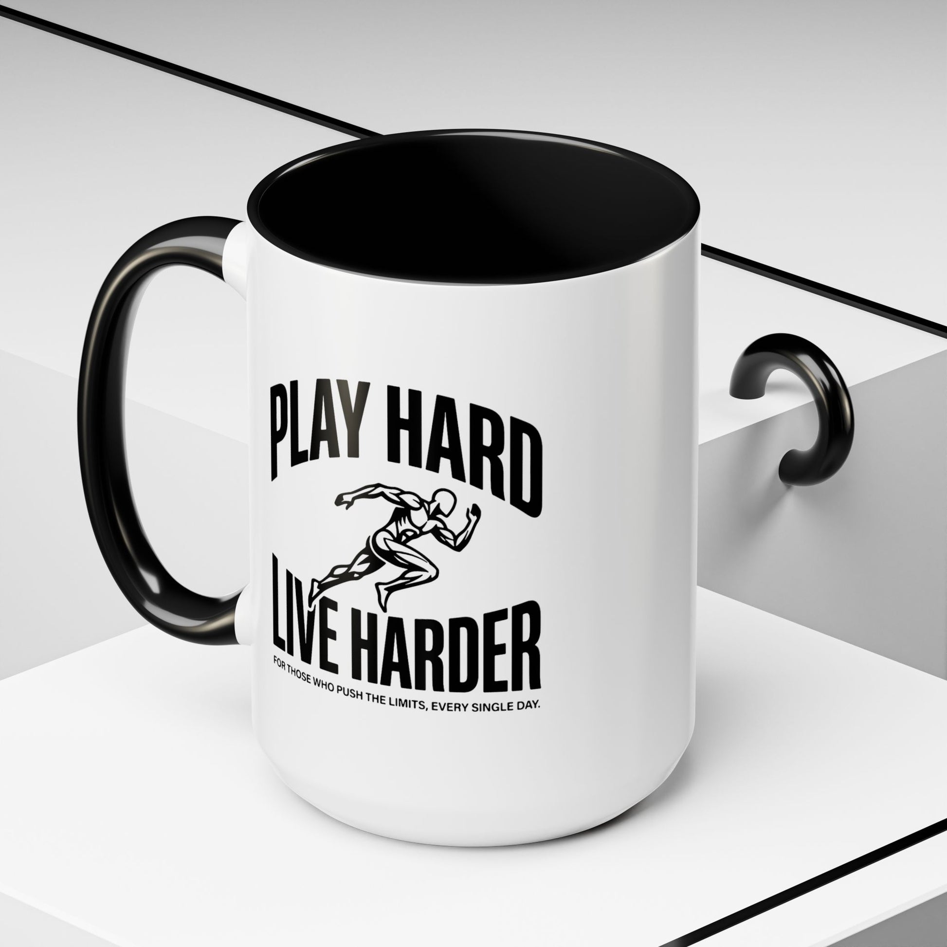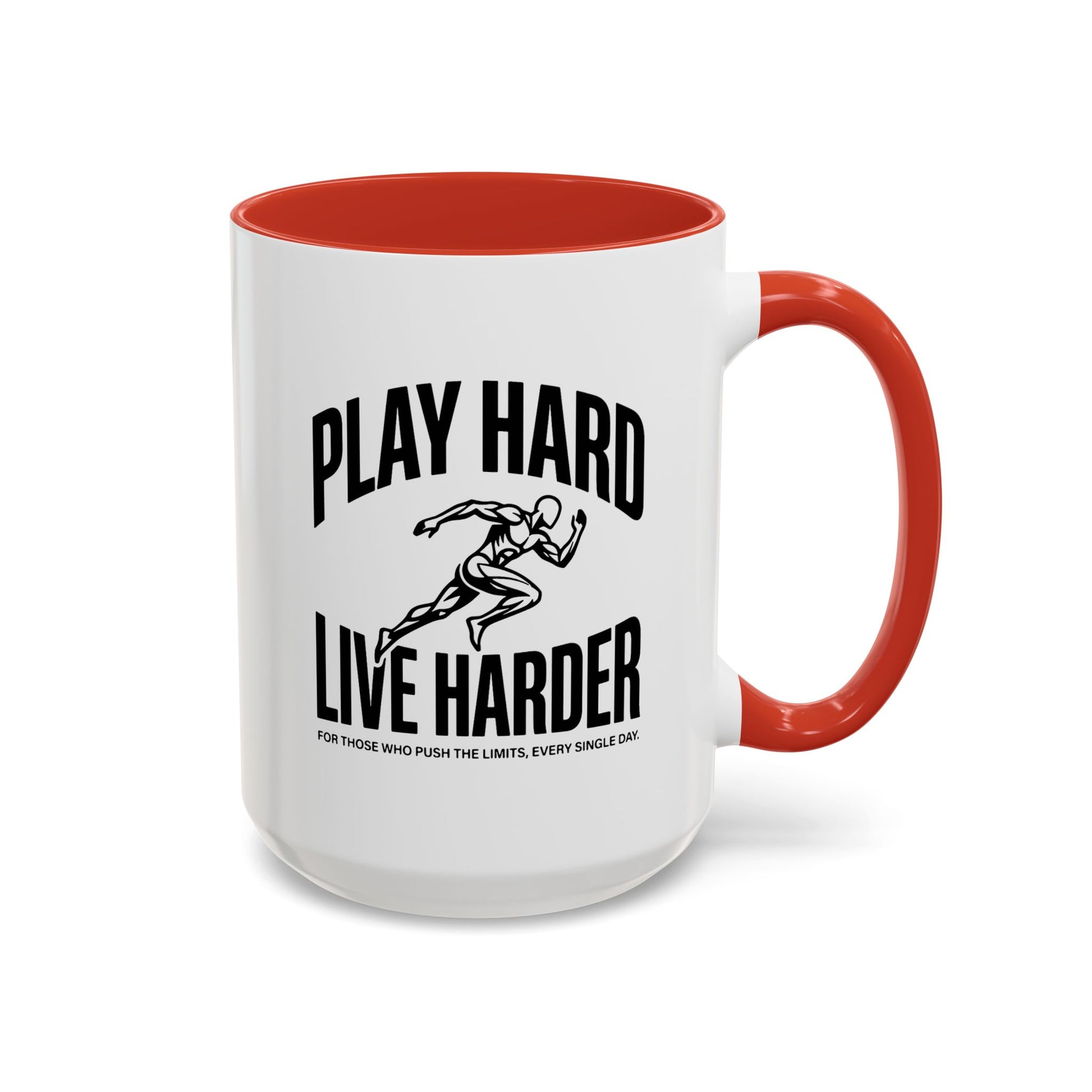 This ceramic accent mug carries a bold, energetic spirit. The high-contrast interior and handle frame a clean white exterior printed with a dynamic “Play Hard, Live Harder” running figure — a quiet nudge to move, train, and treat each day like progress. It feels solid in the hand, glossy and bright, and holds a good pour of coffee or tea to fuel a morning run or refuel after a workout. Use it at your kitchen counter, on the office desk, or packed into a gym bag for a familiar lift when you need motivation.