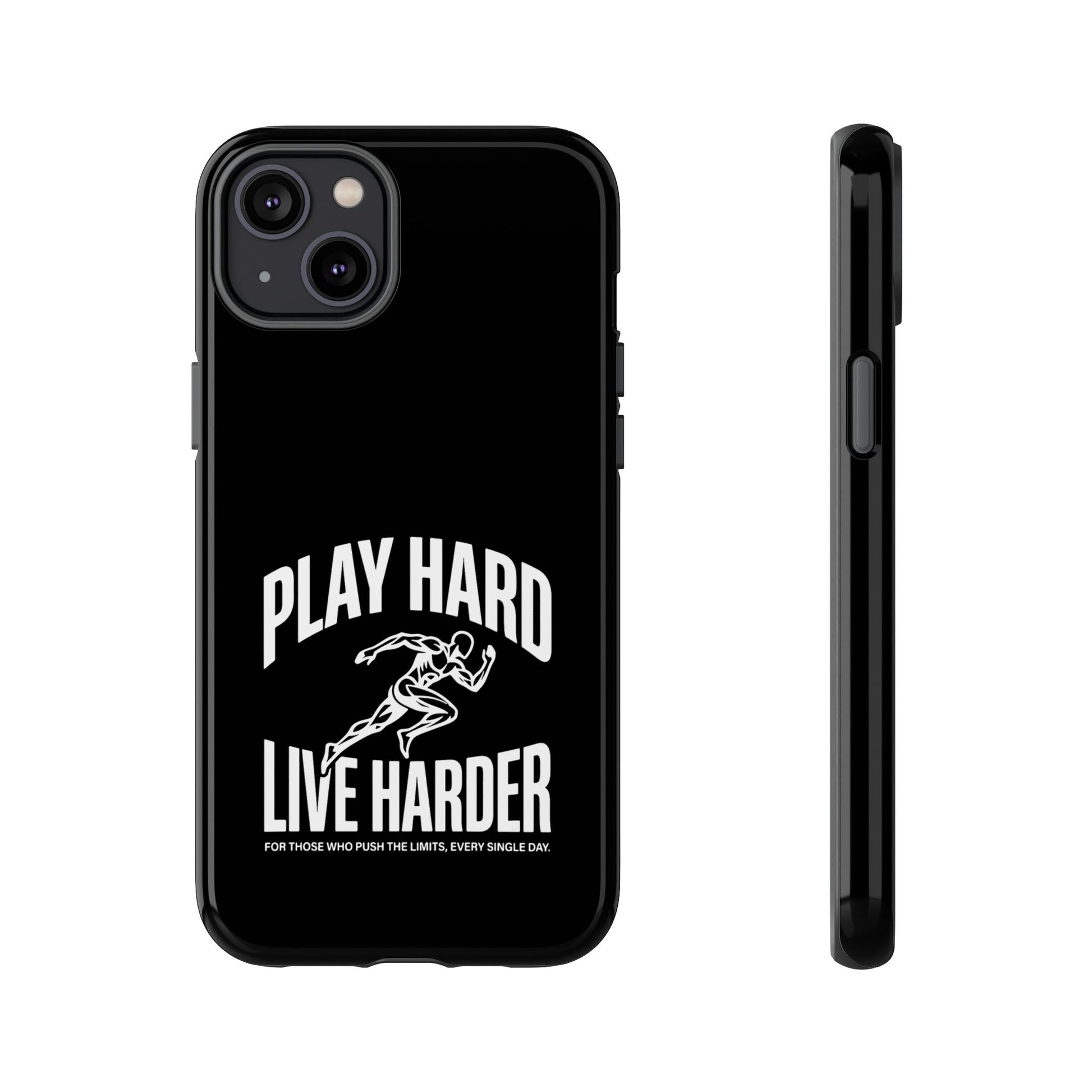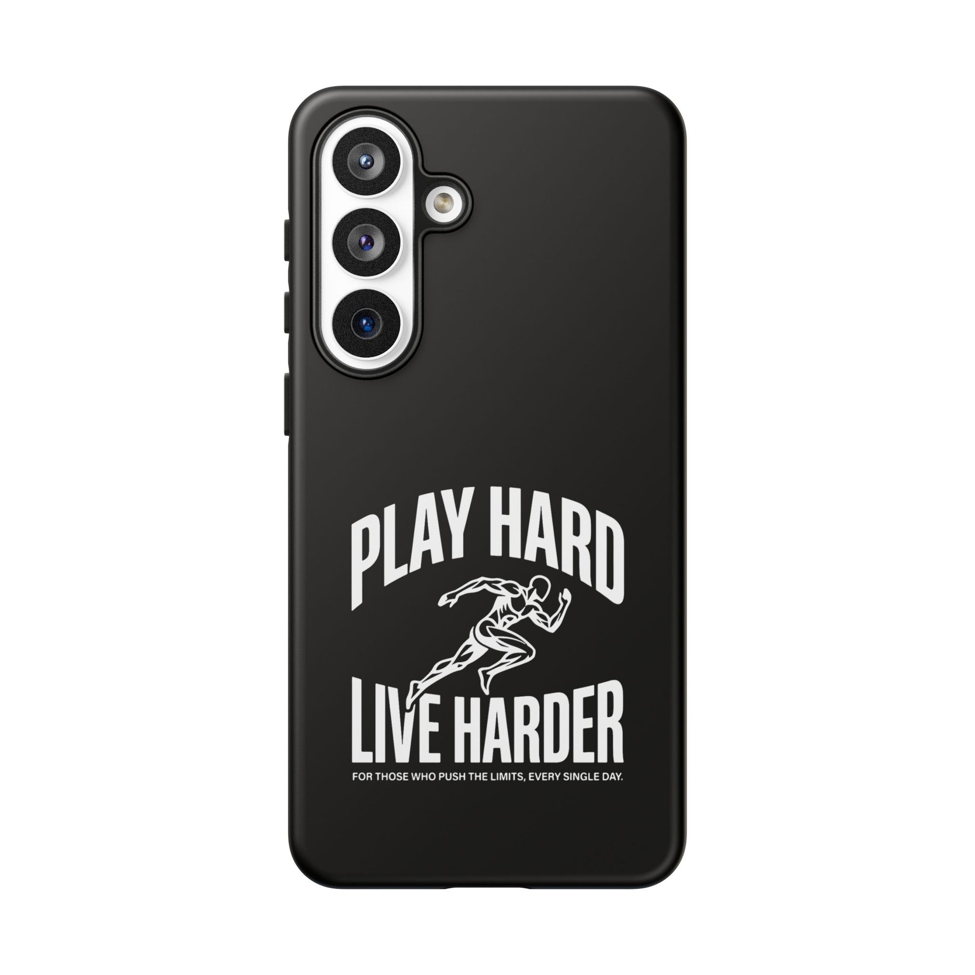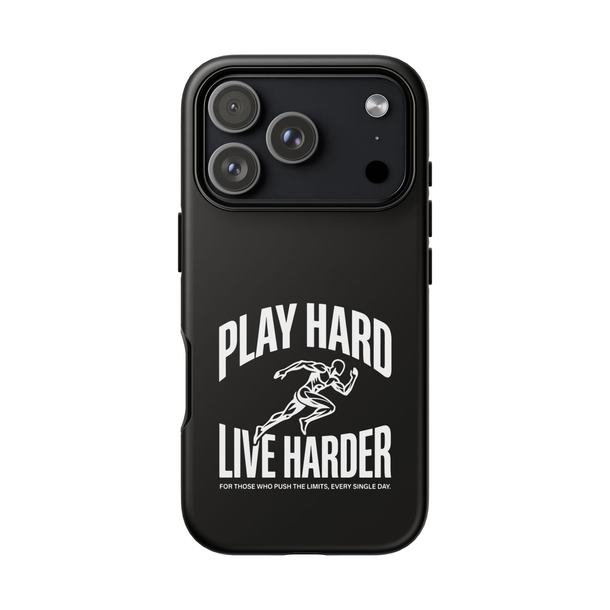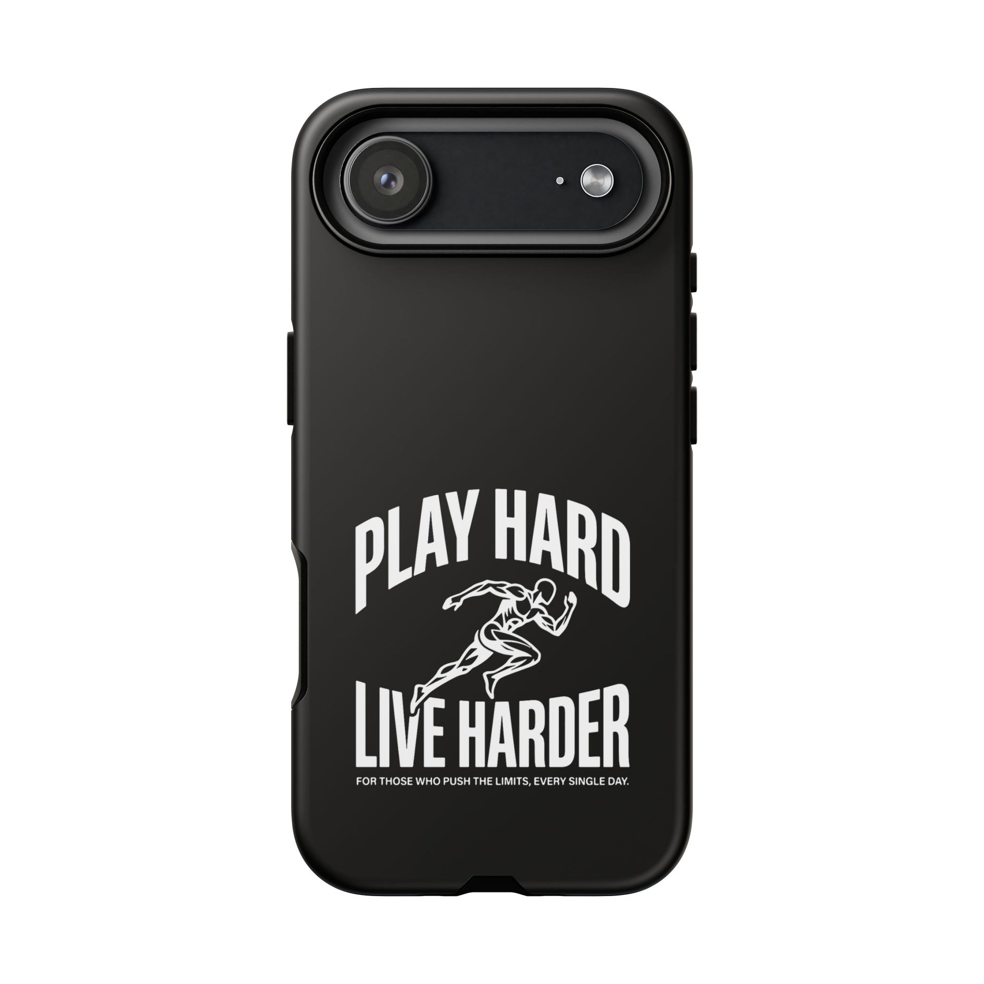 A tough, no-nonsense phone case built for people who push limits. This dual-layer protective case combines a rigid polycarbonate shell with a TPU silicone liner to cushion impacts while keeping a slim profile. The bold monochrome design — a sprinting figure with the rallying words “PLAY HARD / LIVE HARDER” — reads like a badge of intent. UV-protected printing keeps the high-contrast artwork sharp outdoors, and clear port openings preserve everyday use and wireless charging. Lightweight, grippy, and certified for safety, it’s the kind of case that stays out of the way while your day gets intense.