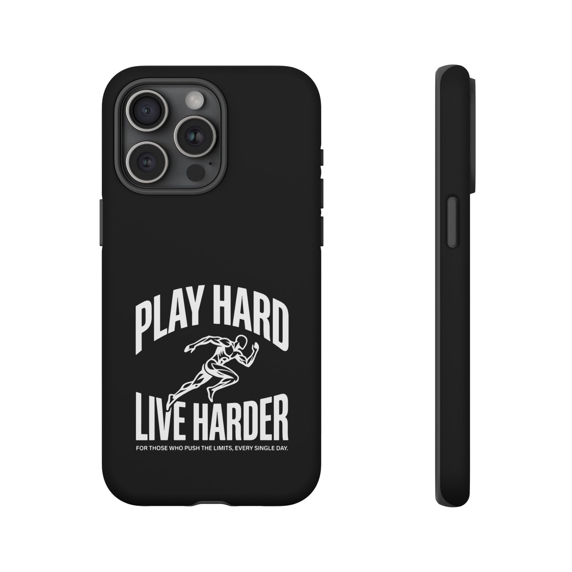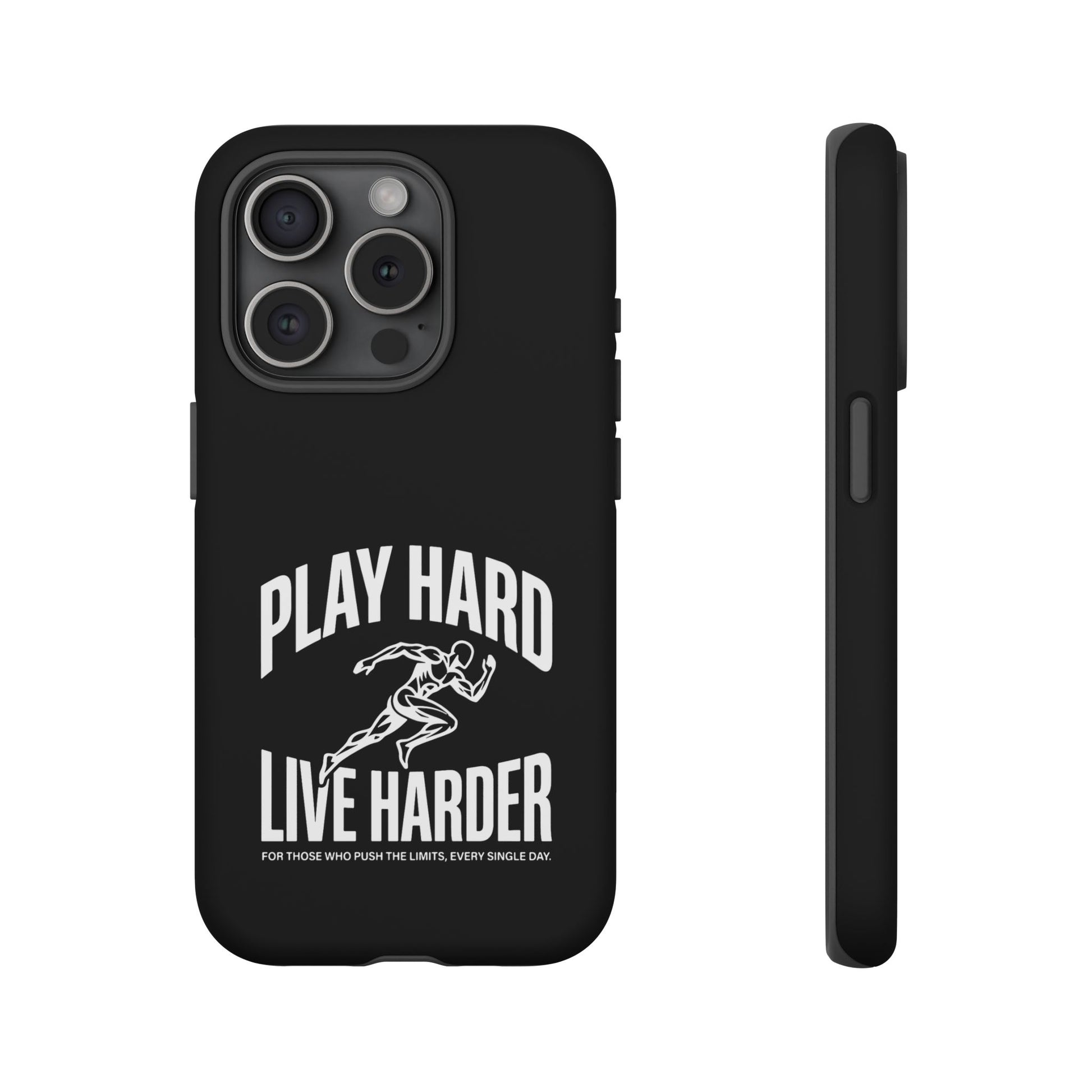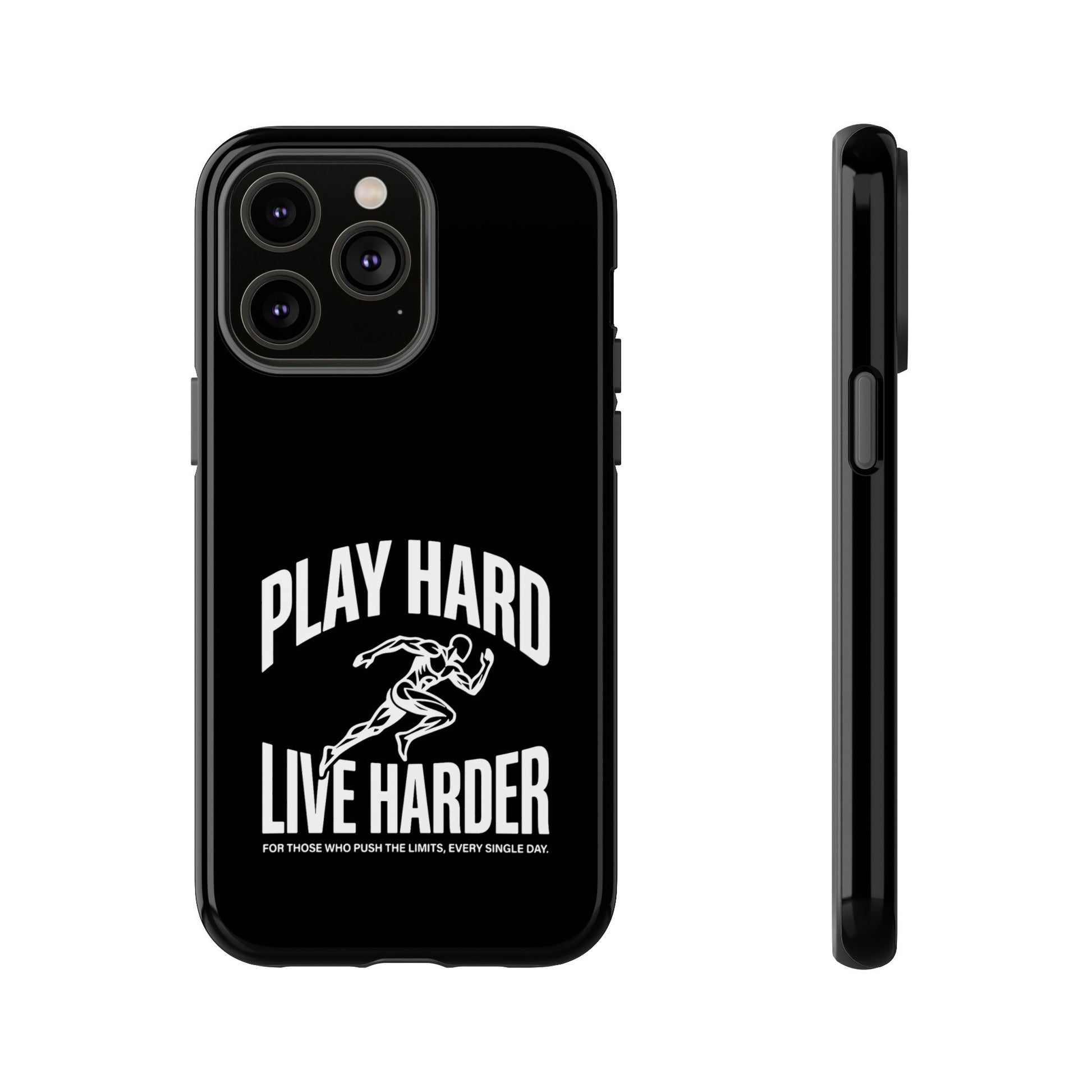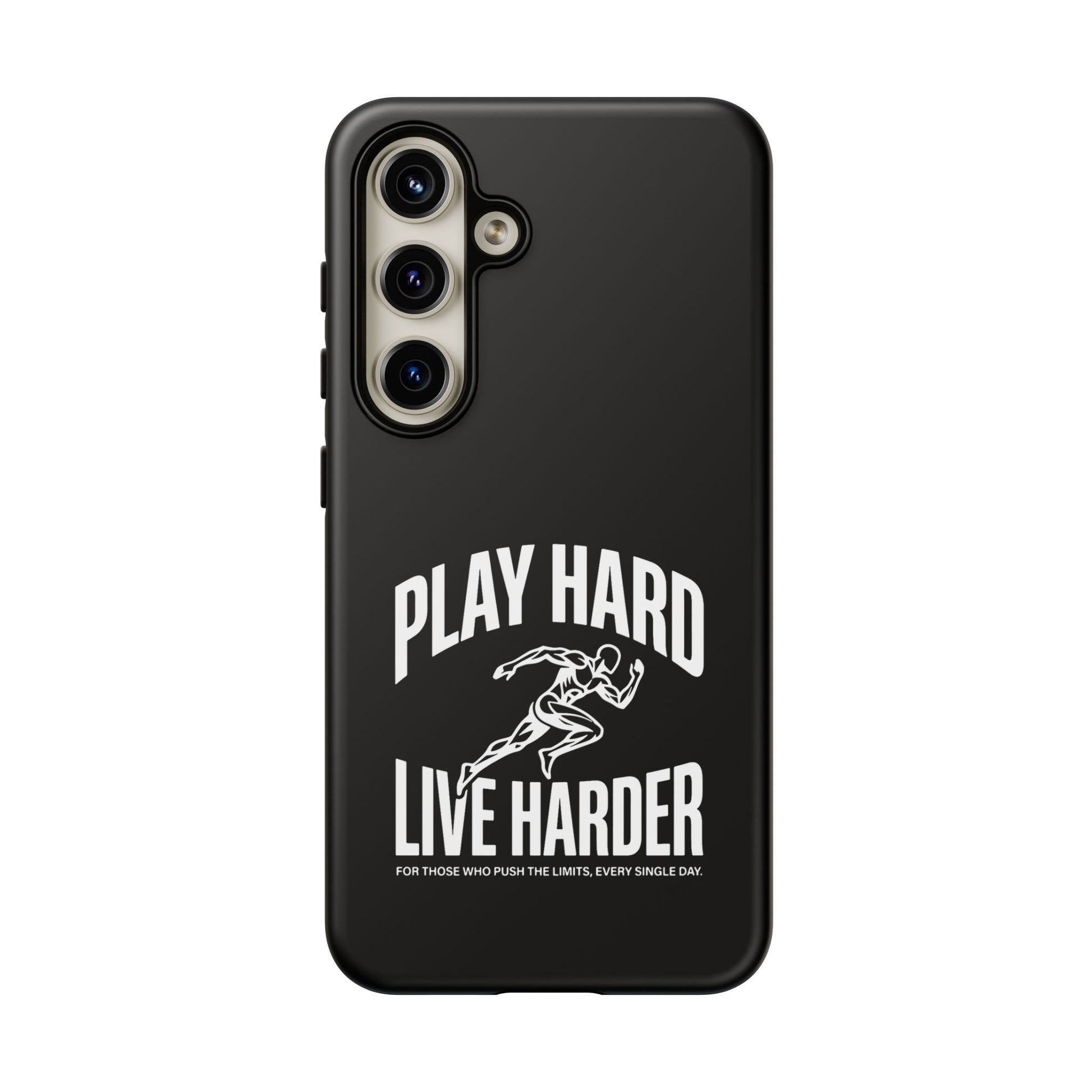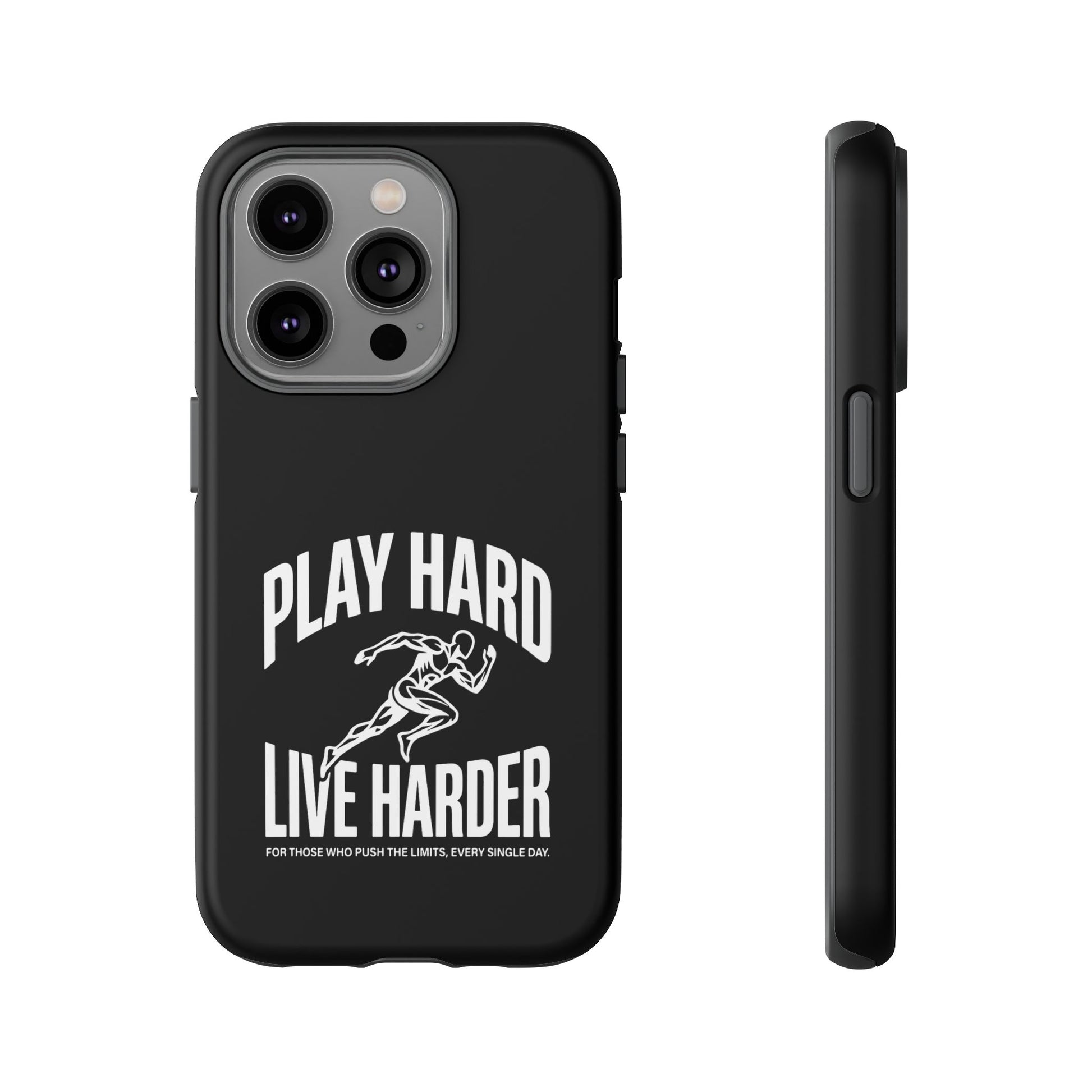 A tough, no-nonsense phone case built for people who push limits. This dual-layer protective case combines a rigid polycarbonate shell with a TPU silicone liner to cushion impacts while keeping a slim profile. The bold monochrome design — a sprinting figure with the rallying words “PLAY HARD / LIVE HARDER” — reads like a badge of intent. UV-protected printing keeps the high-contrast artwork sharp outdoors, and clear port openings preserve everyday use and wireless charging. Lightweight, grippy, and certified for safety, it’s the kind of case that stays out of the way while your day gets intense.