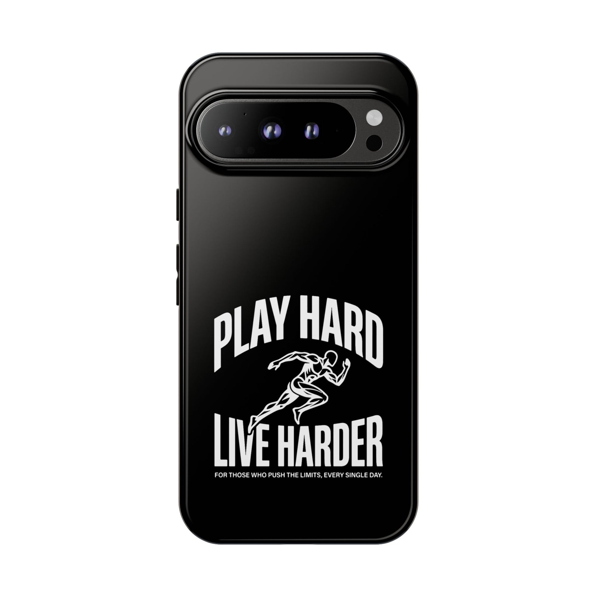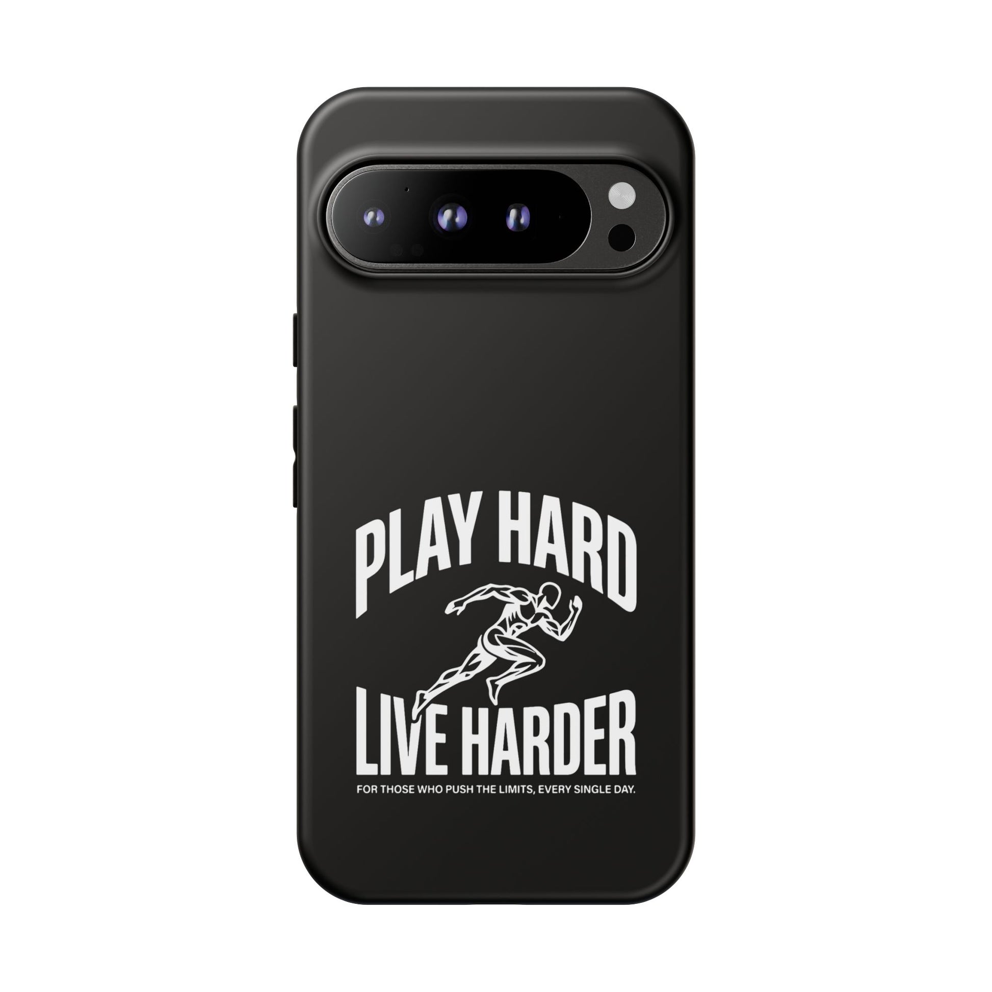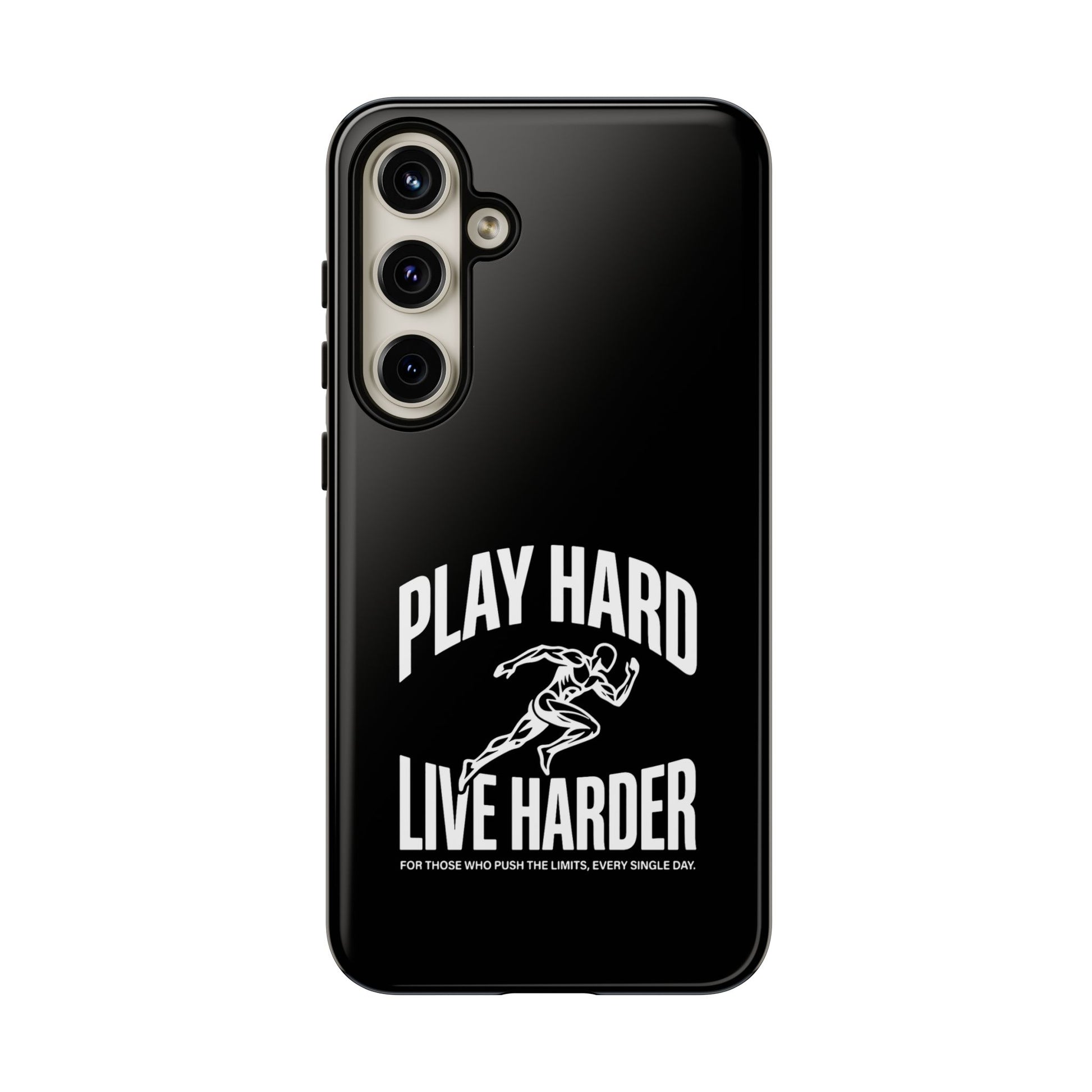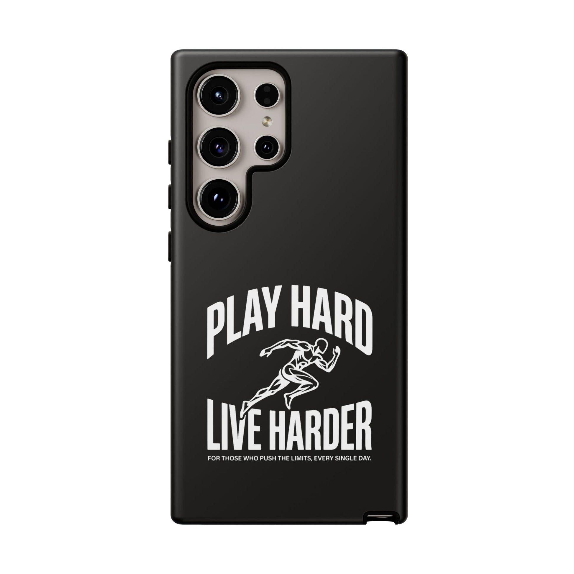 A tough, no-nonsense phone case built for people who push limits. This dual-layer protective case combines a rigid polycarbonate shell with a TPU silicone liner to cushion impacts while keeping a slim profile. The bold monochrome design — a sprinting figure with the rallying words “PLAY HARD / LIVE HARDER” — reads like a badge of intent. UV-protected printing keeps the high-contrast artwork sharp outdoors, and clear port openings preserve everyday use and wireless charging. Lightweight, grippy, and certified for safety, it’s the kind of case that stays out of the way while your day gets intense.