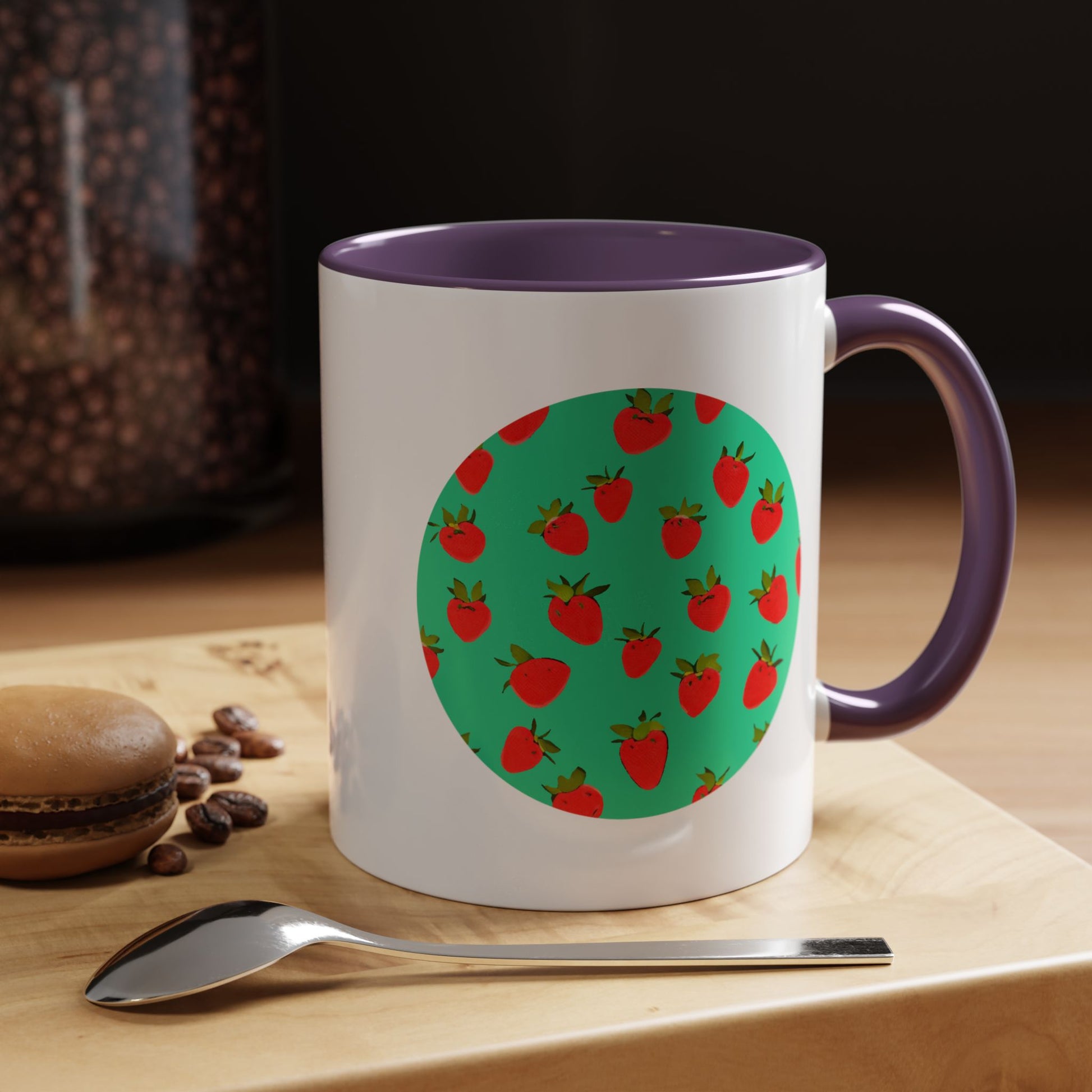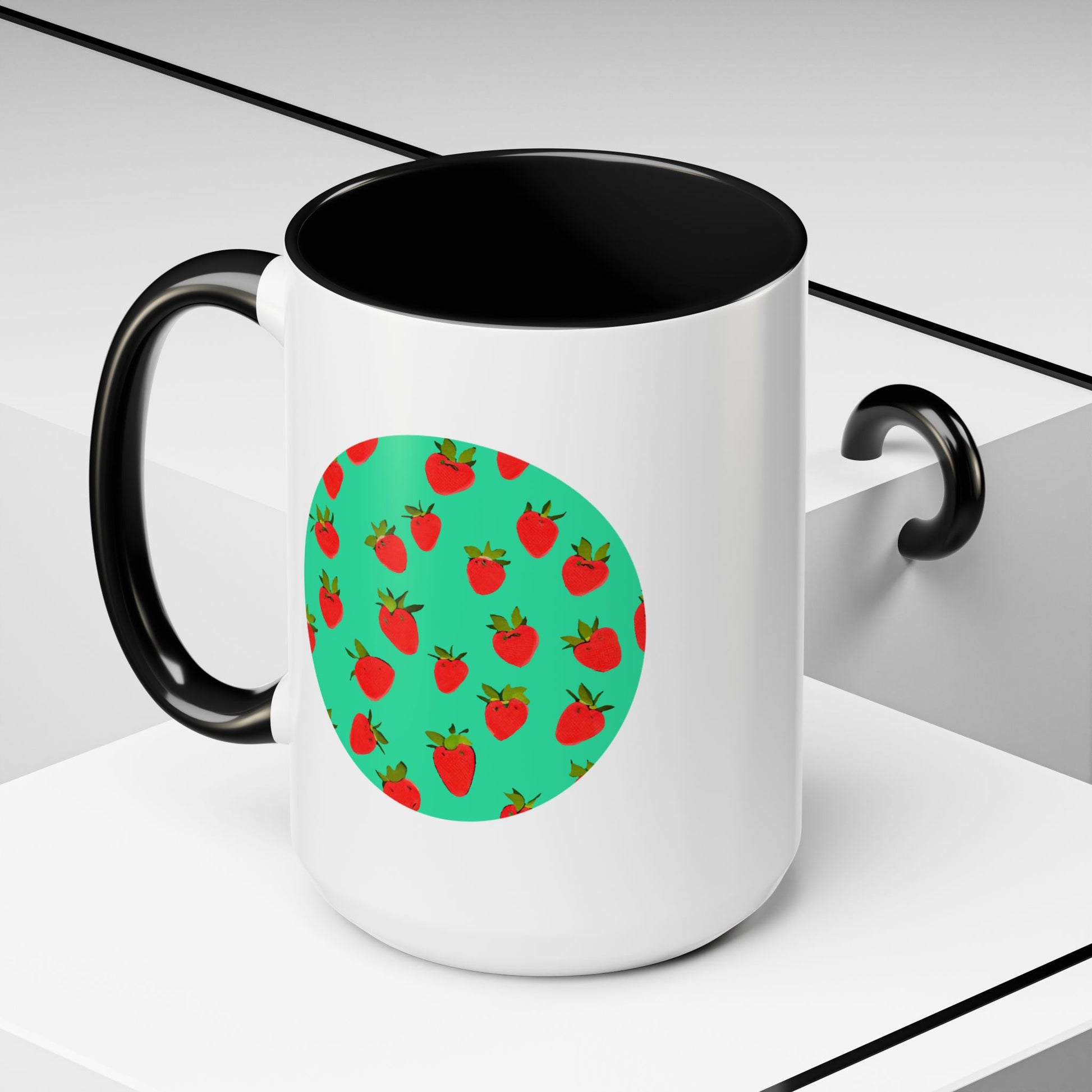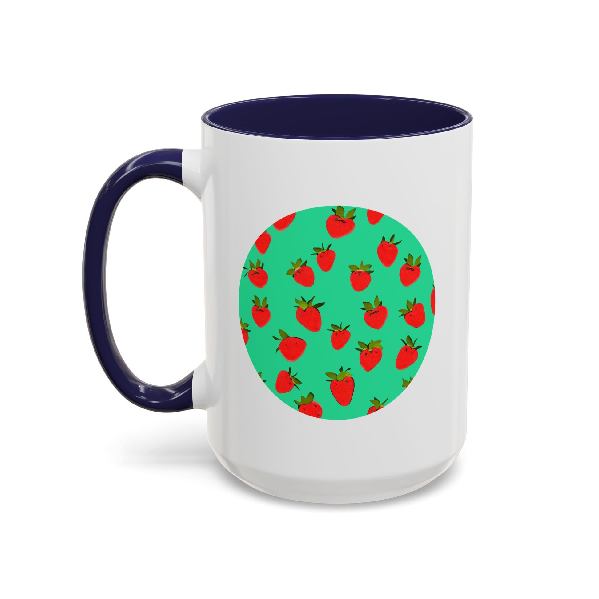 Bright, playful, and made for everyday moments — this ceramic coffee mug brings a pop of color to your mornings. A crisp circle of cheerful strawberries sits against a mint-green backdrop, framed by the glossy white body and a contrasting colored handle and interior. The sturdy C-shaped handle feels secure in your hand while the 11oz or 15oz size holds your favorite brew, tea, or cozy cocoa. Dishwasher- and microwave-safe, it’s built for regular use and keeps its vibrant print through daily life. Lead- and BPA-free with a high-gloss finish, this mug adds a little garden-fresh joy to breakfast counters, work desks, or relaxed weekend patio mornings.