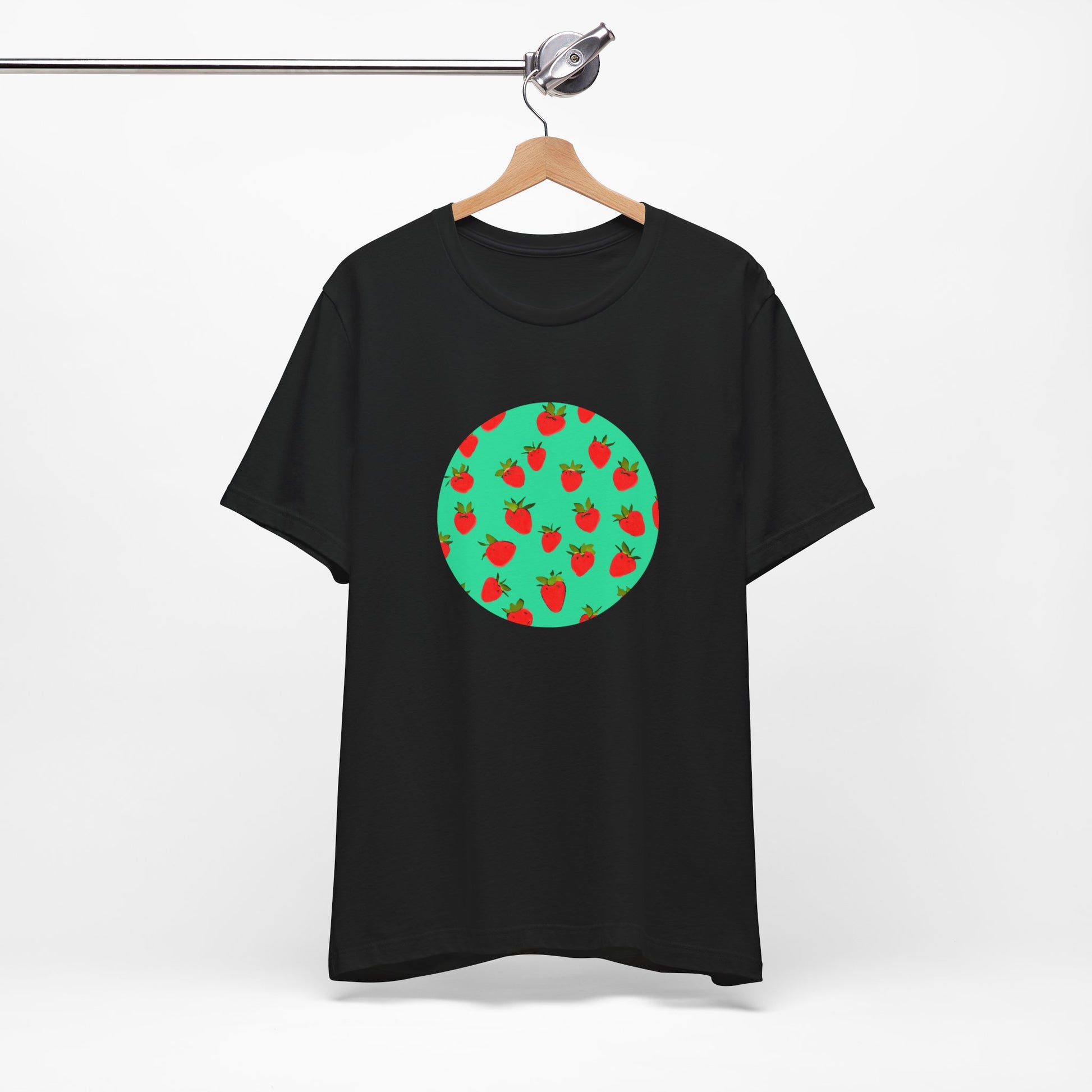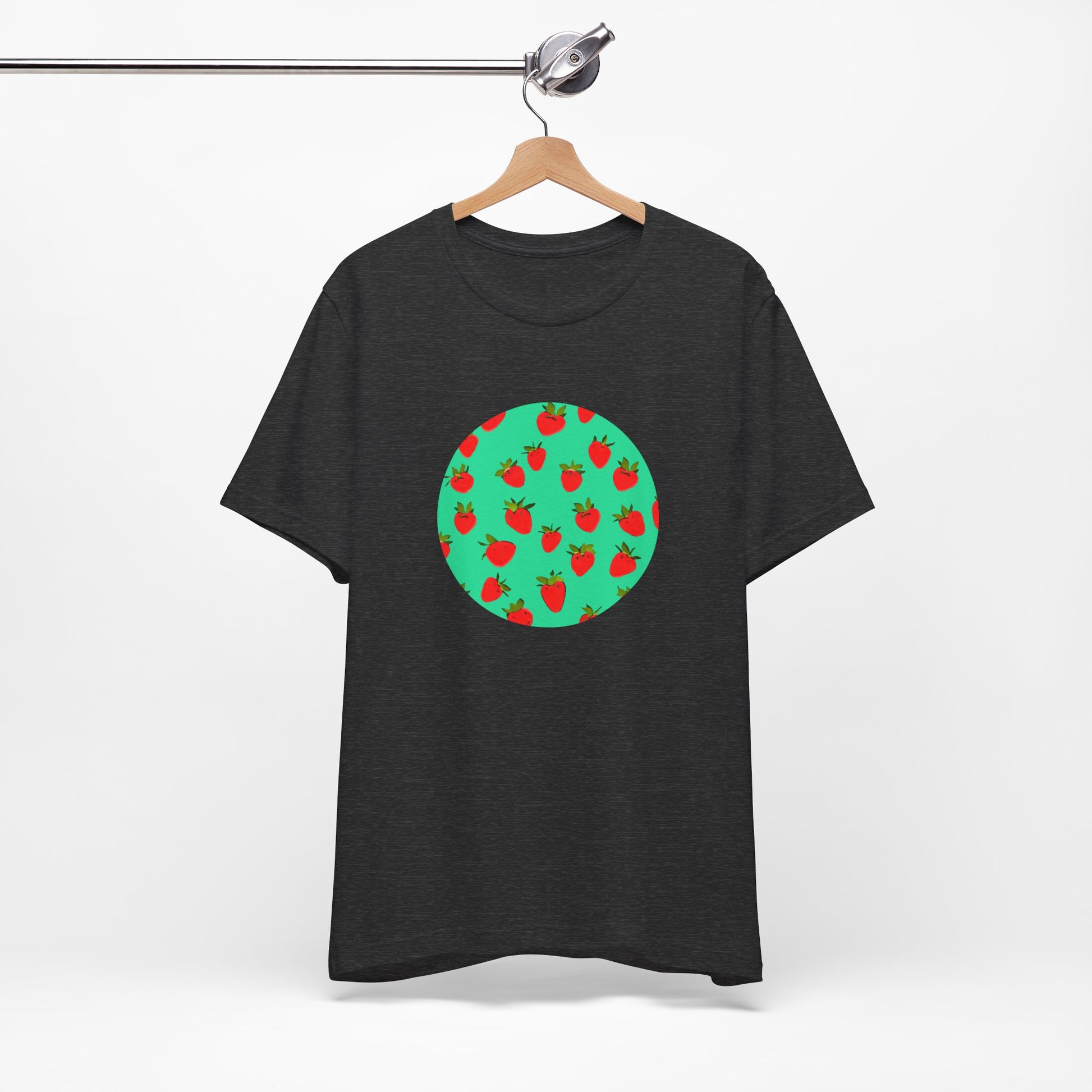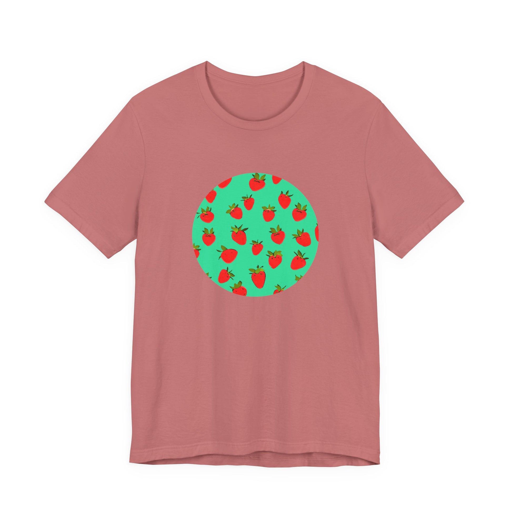 This lightweight jersey tee brings a playful, sunlit energy to everyday wear. A circular cluster of bright strawberries pops against a mint-green field, like a summer patch captured in a single, graphic moment. The crew neck and retail fit keep the silhouette clean and easy to layer under a jacket or wear solo with rolled sleeves. Breathable Airlume combed cotton feels soft against the skin and moves with you—from market runs to lazy porch mornings. Small details like side seams, a ribbed collar, and a tear-away label show care in construction, while responsibly made materials and REACH-compliant sourcing let you wear it with a clear conscience. Slide into this tee when you want a little cheerful color that reads comfortably casual and quietly considered.