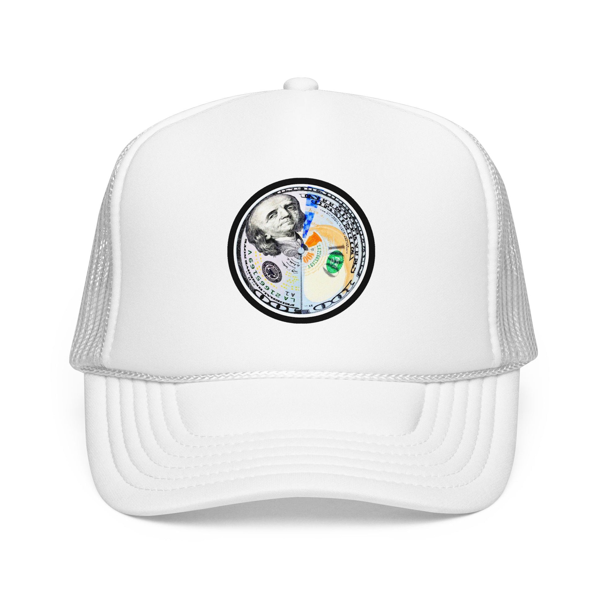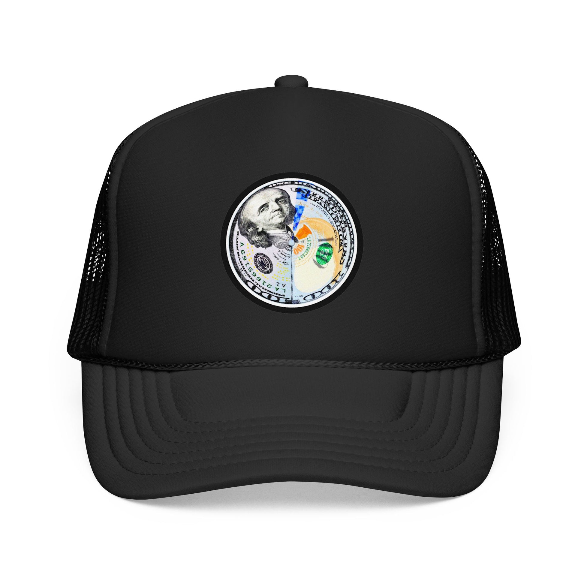 This foam trucker hat brings a bit of streetwise swagger to your everyday wear. A seamless high-density foam front panel showcases a bold circular patch art—half Benjamin Franklin, half colorful modern collage—so you get vintage edge with pop energy. The structured, high-profile silhouette and pre-curved visor hold their shape while the mesh back keeps air flowing on long days. It sits comfortably with an adjustable snap and built-in sweatband, so it’s ready for road trips, late-night runs to the city, or layering with a worn denim jacket. Wear it low over your eyes for a relaxed look, or push it back and let the graphic start conversations.