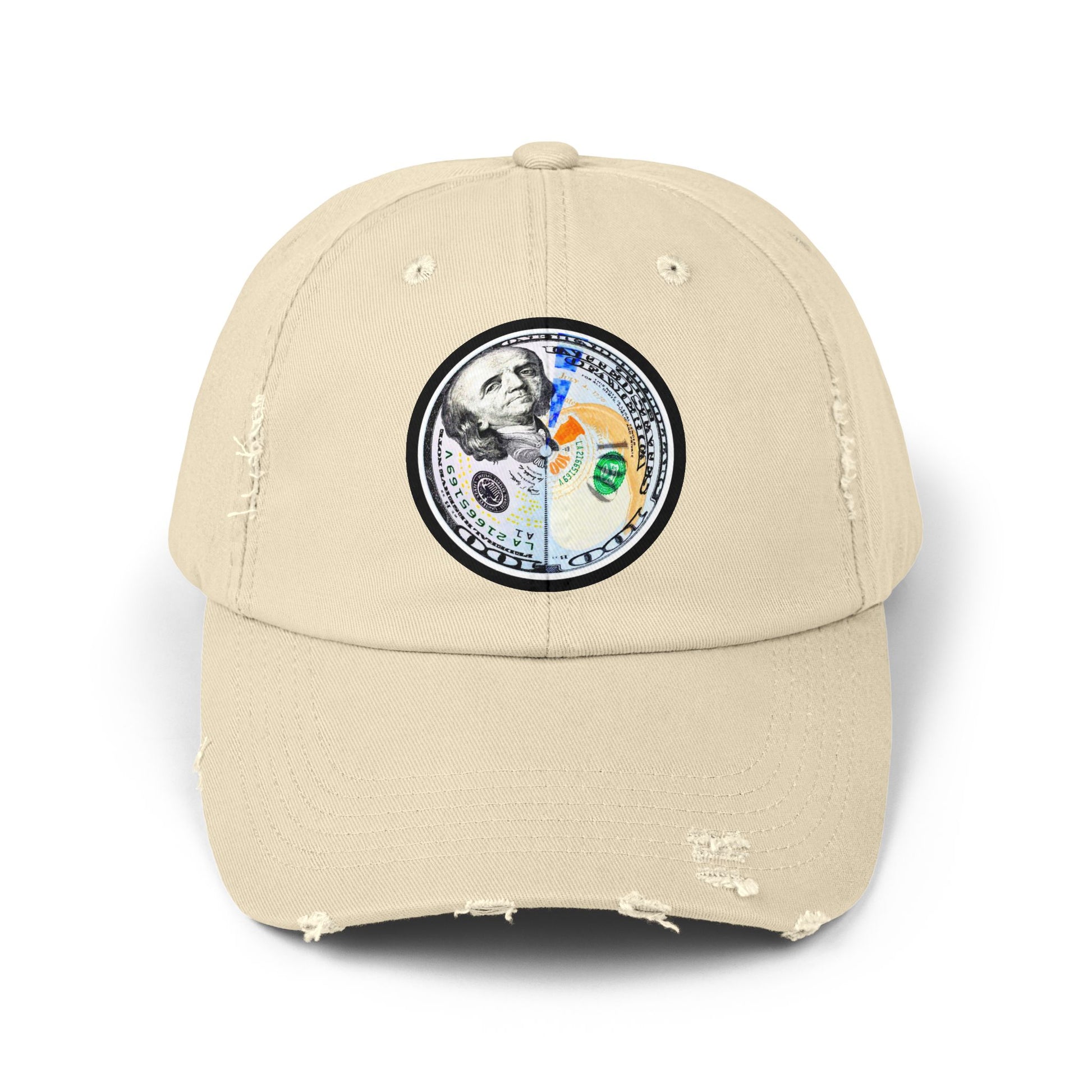 A worn-in black cap that carries attitude without shouting. The soft, unstructured body and low profile settle comfortably over your head, while subtle distressing along the visor and panels gives this hat an easy, lived-in look. Front-and-center is a small, circular DTF-printed emblem—a split-image coin motif—that adds a compact, streetwise focal point. The metal D-ring closure hides neatly under the strap for a clean back profile. Each hat’s character varies slightly because of the finishing process, so you get a one-of-a-kind vintage vibe every time.