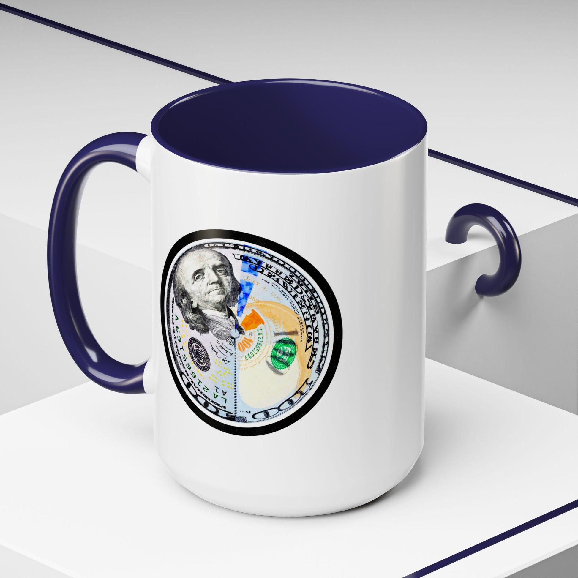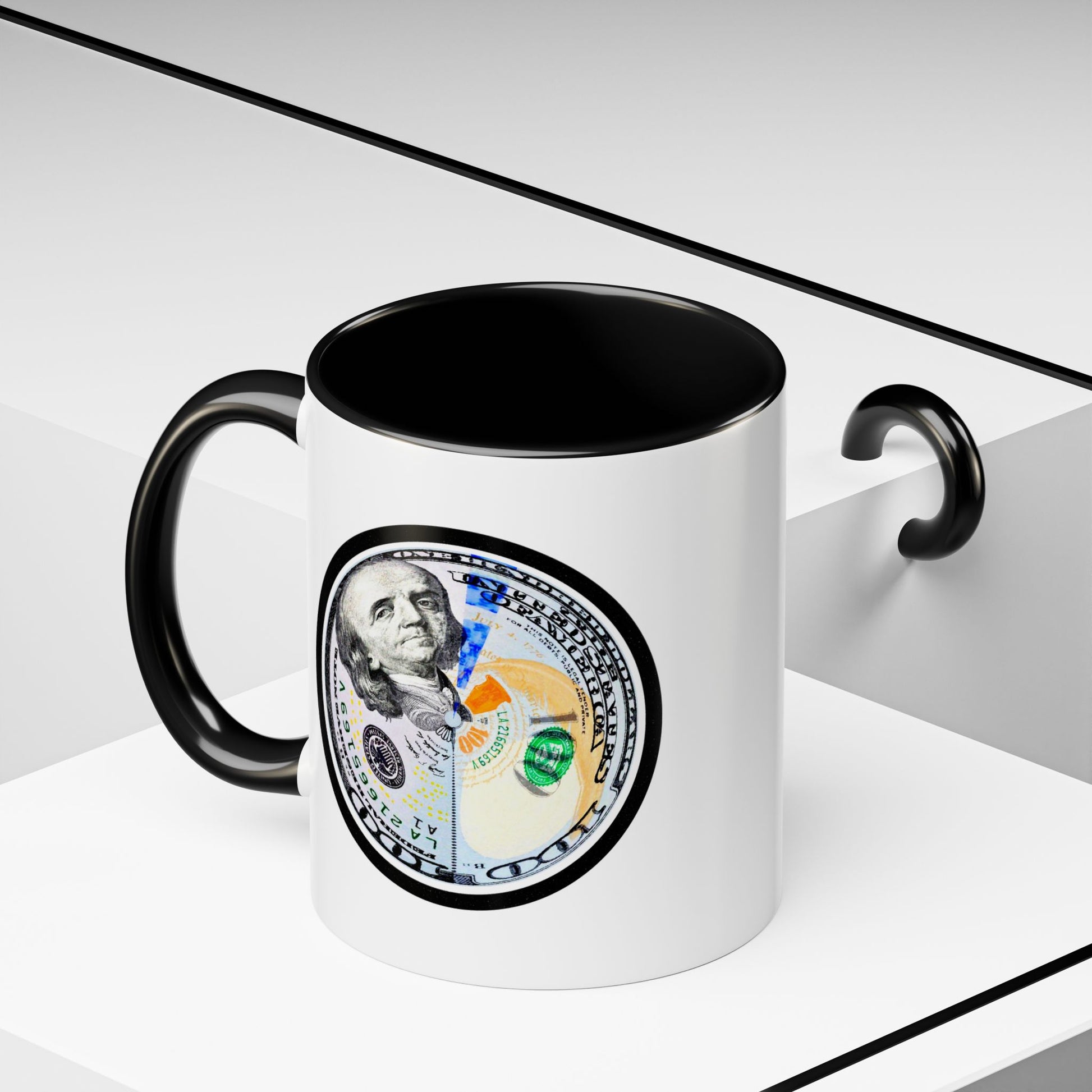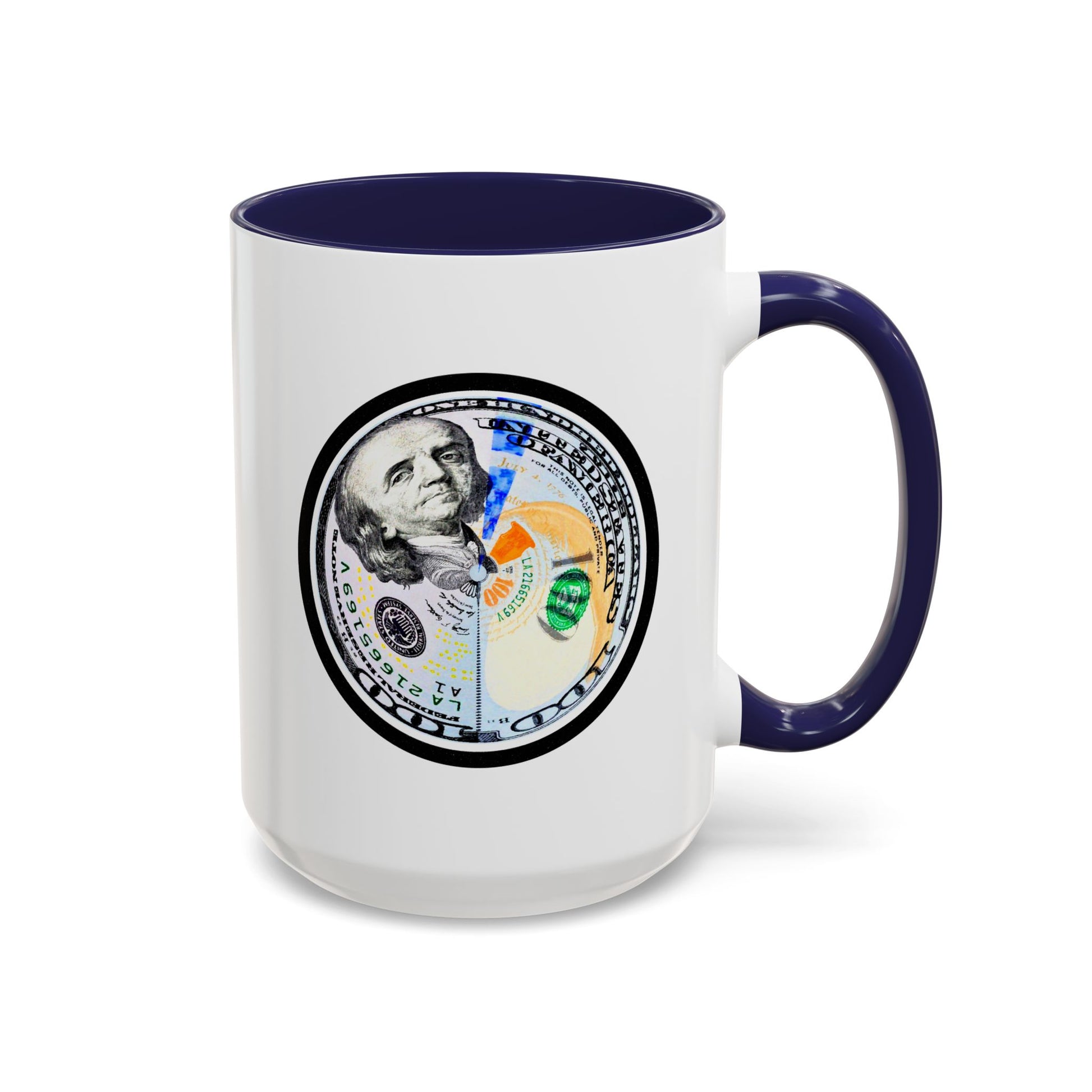 A bold, glossy ceramic mug built for mornings that mean business. The contrasting black interior and handle frame a circular, high-resolution bill motif that reads playful and confident—for coffee sipped while planning moves, counting wins, or simply enjoying a little visual wit. It feels sturdy in the hand with a classic C-shaped handle and bright color contrast that brings energy to your routine. Dishwasher- and microwave-safe, it balances everyday practicality with a touch of attitude that suits someone who likes their caffeine with character.