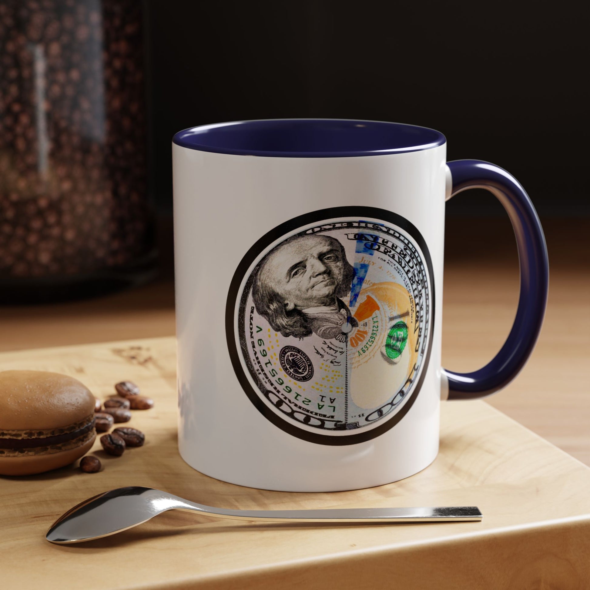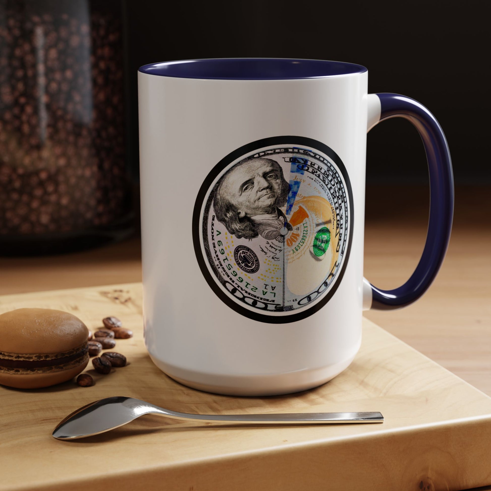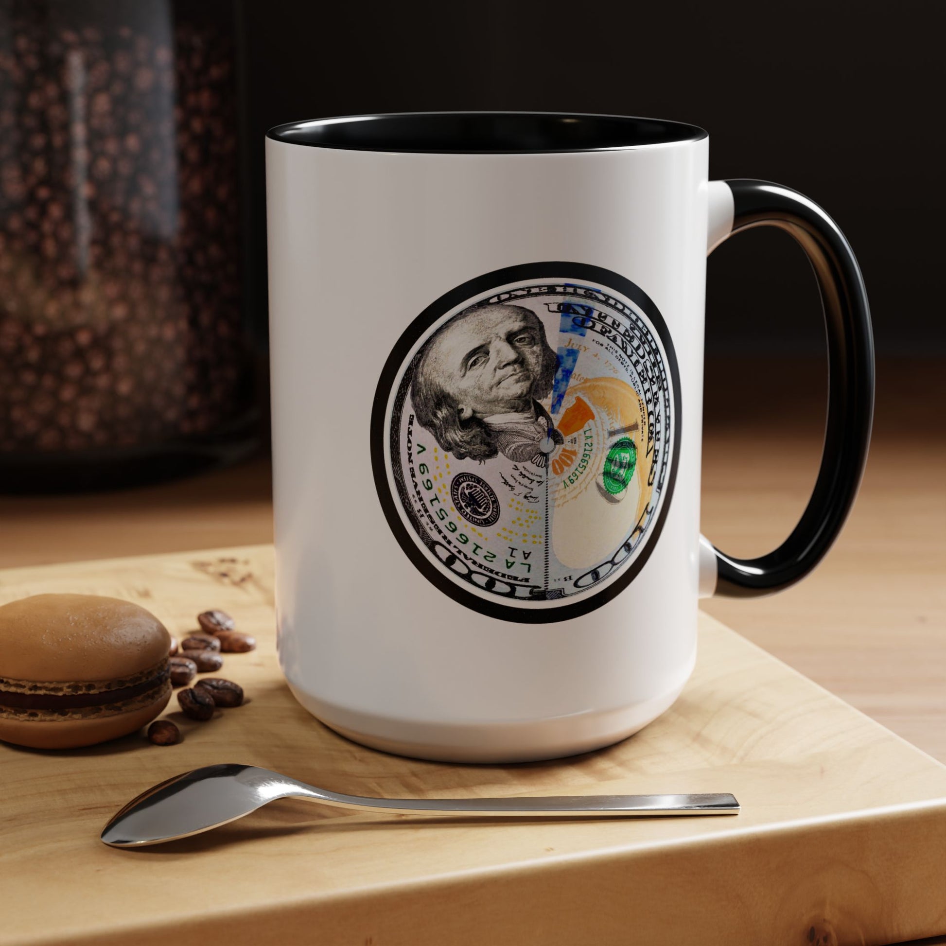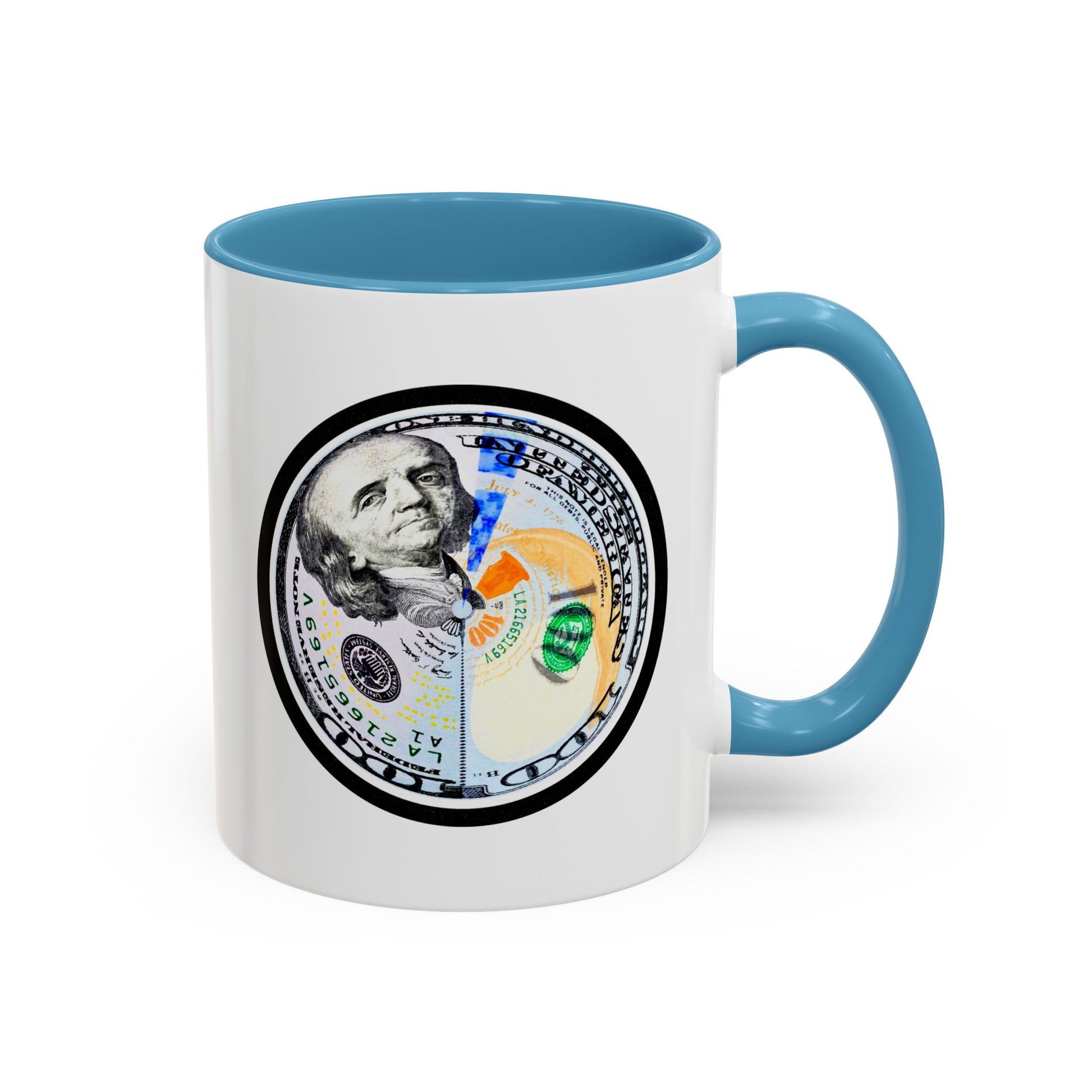 A bold, glossy ceramic mug built for mornings that mean business. The contrasting black interior and handle frame a circular, high-resolution bill motif that reads playful and confident—for coffee sipped while planning moves, counting wins, or simply enjoying a little visual wit. It feels sturdy in the hand with a classic C-shaped handle and bright color contrast that brings energy to your routine. Dishwasher- and microwave-safe, it balances everyday practicality with a touch of attitude that suits someone who likes their caffeine with character.
