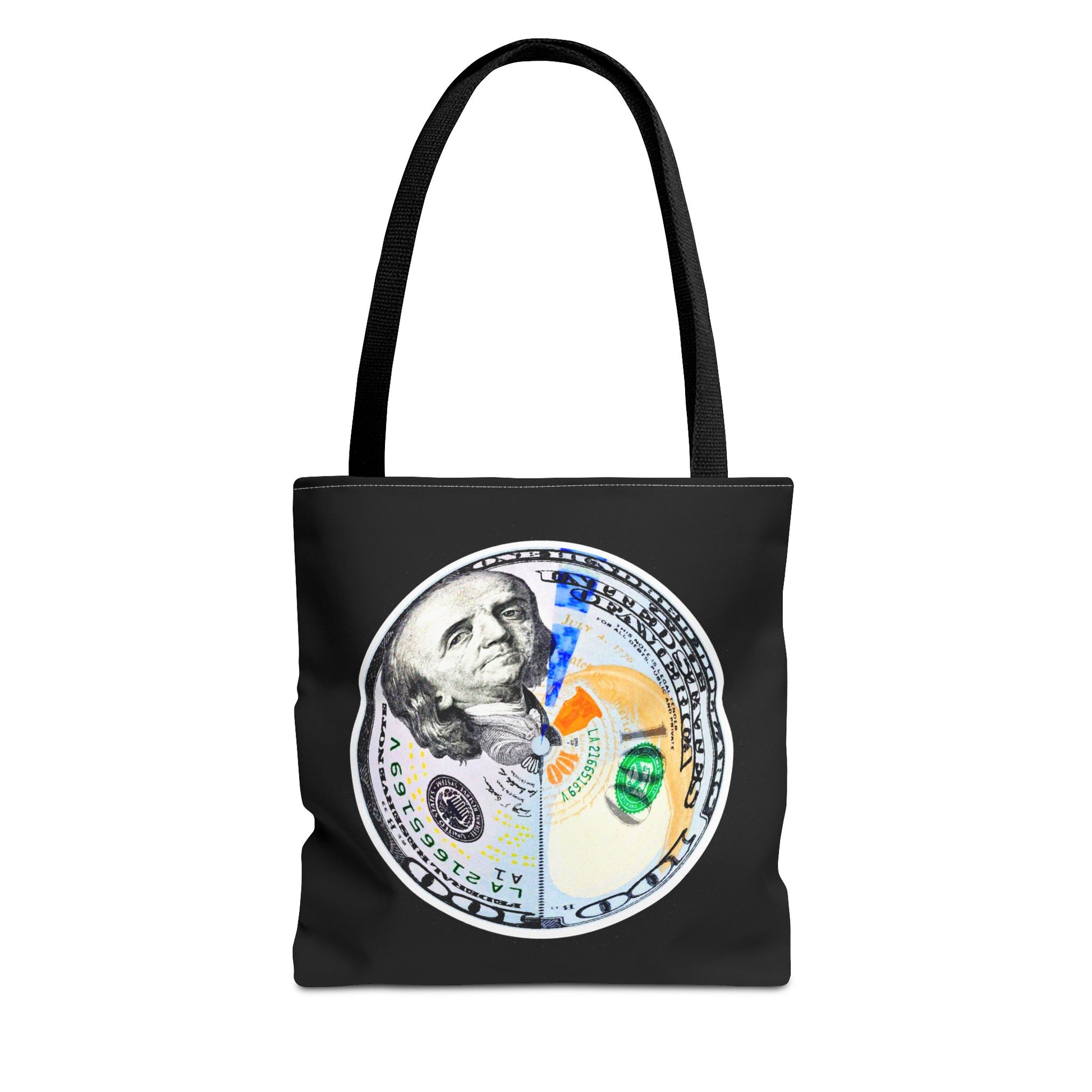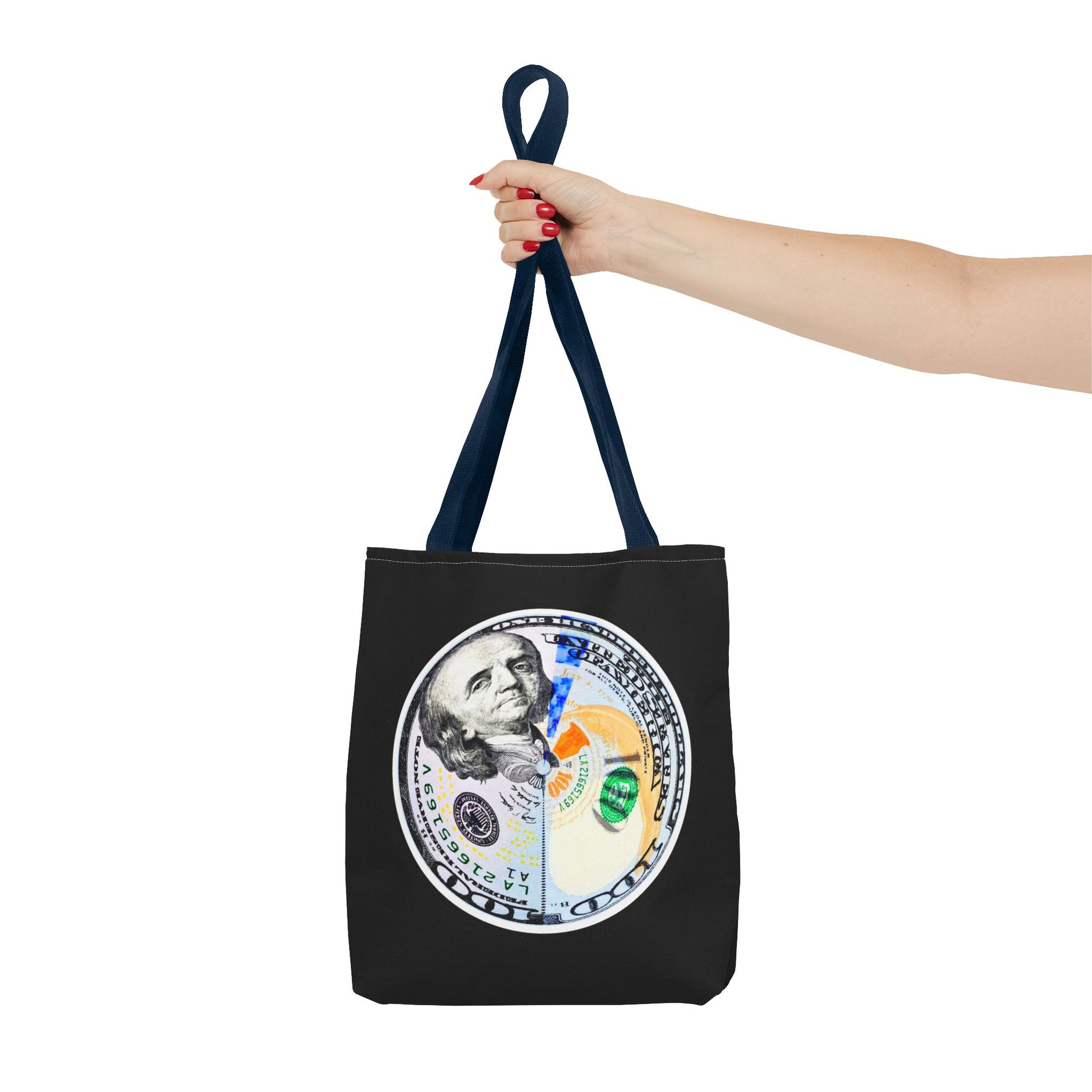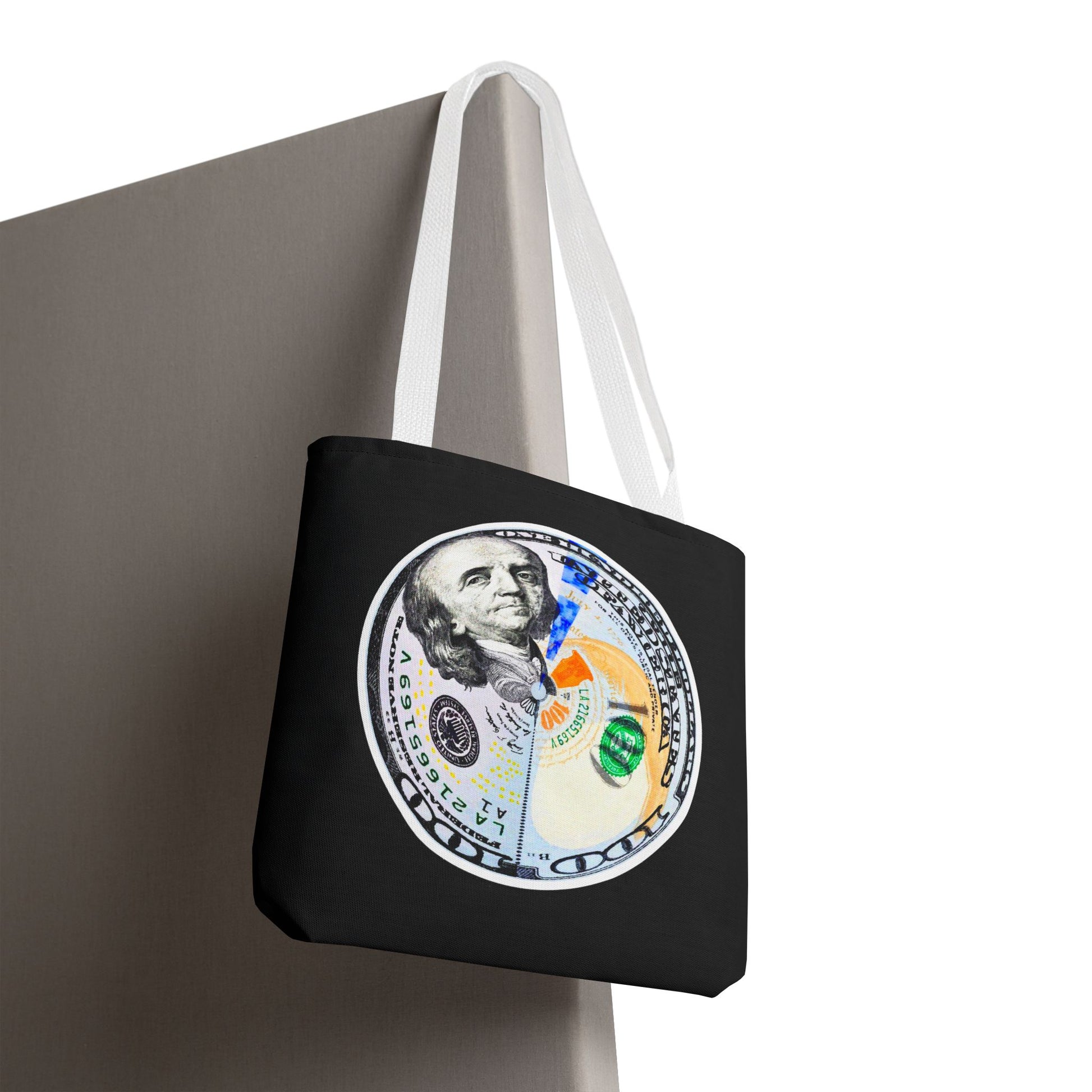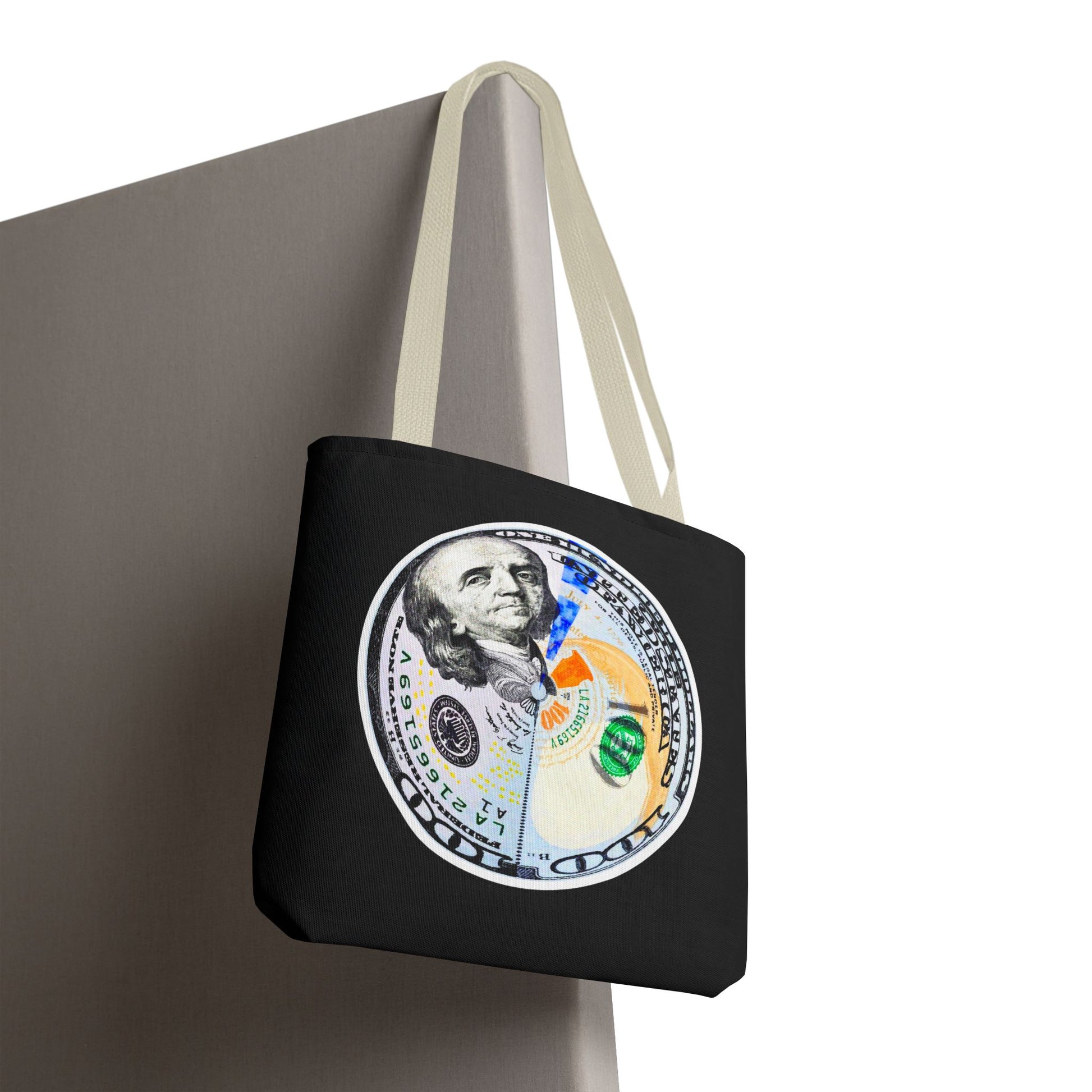A bold, everyday tote that carries both attitude and utility. The roomy, boxed-corner silhouette holds groceries, notebooks, or market finds without sagging. A striking circular money-inspired graphic sits against a deep black field, adding playful contrast and metropolitan edge to your daily carry. Sturdy cotton handles with reinforced stitching feel secure on the shoulder, while the polyester body and non-woven laminate interior make cleanup simple and keep the shape intact. Choose from five handle colors and three sizes to match how you live—commuters, students, and street-style lovers will appreciate the mix of toughness and visual flair. Small size variations may apply due to handmade construction.