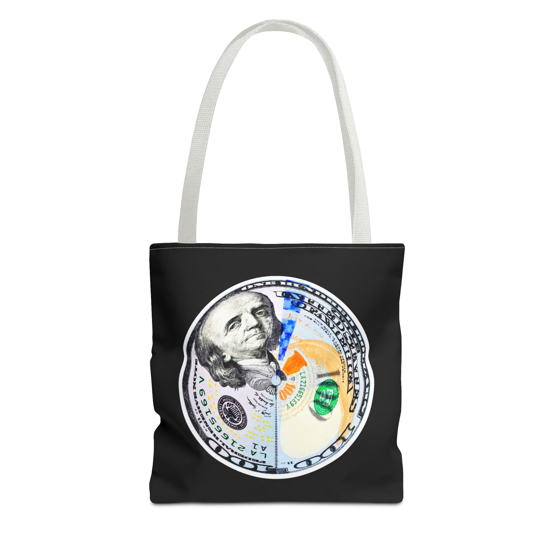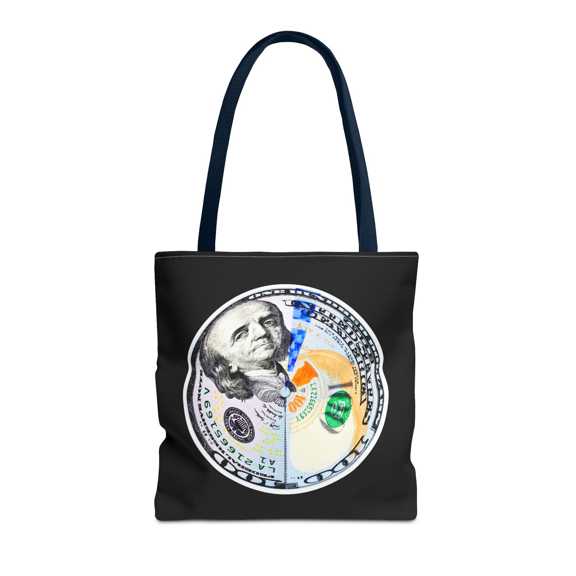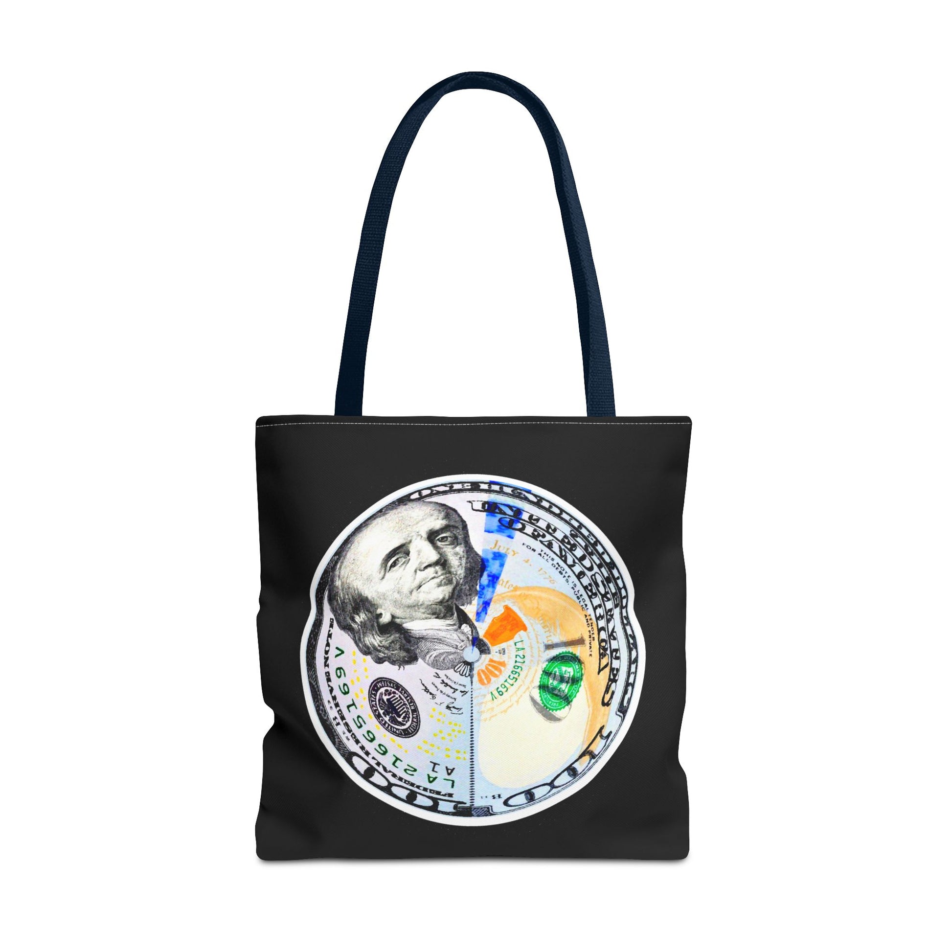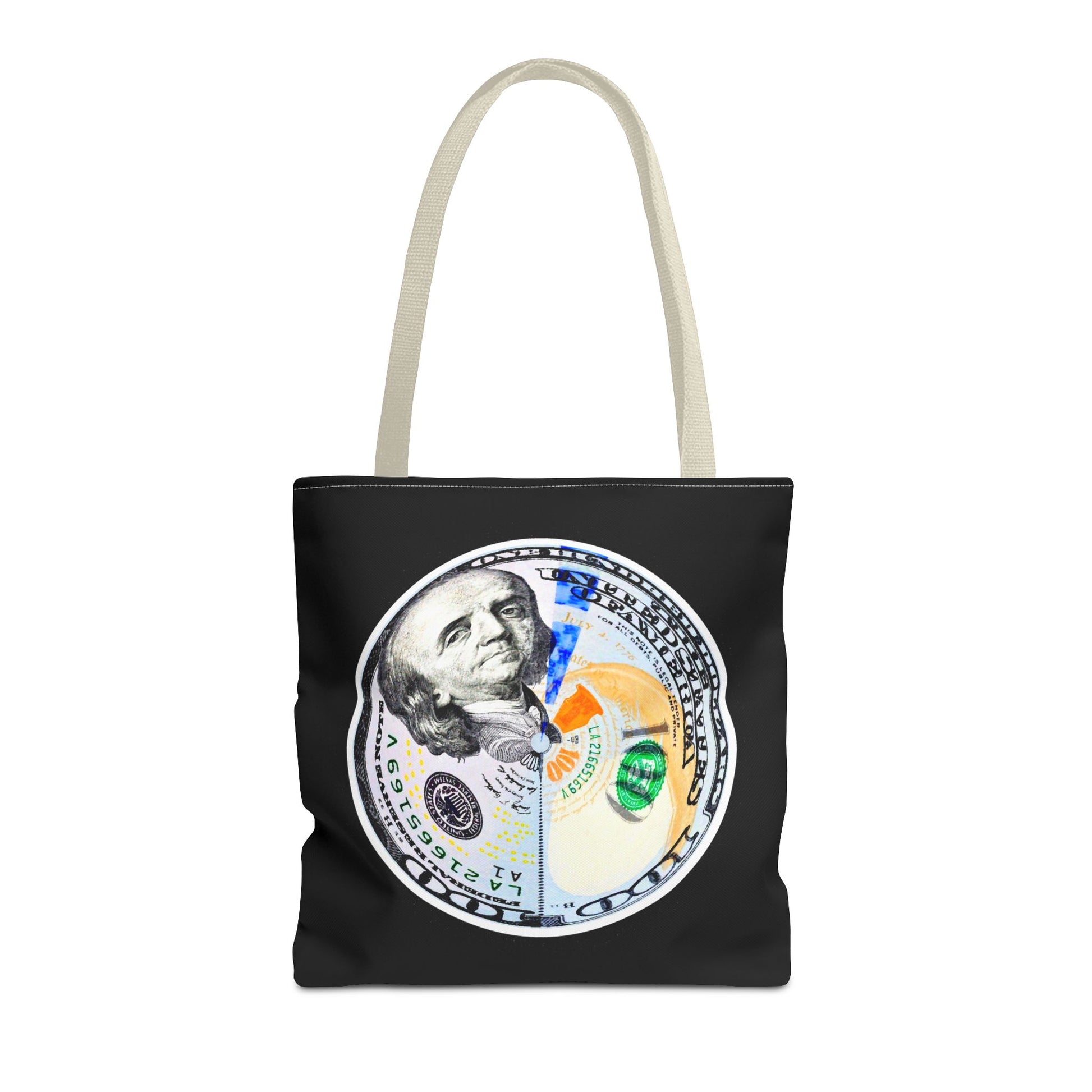 A bold, everyday tote that carries both attitude and utility. The roomy, boxed-corner silhouette holds groceries, notebooks, or market finds without sagging. A striking circular money-inspired graphic sits against a deep black field, adding playful contrast and metropolitan edge to your daily carry. Sturdy cotton handles with reinforced stitching feel secure on the shoulder, while the polyester body and non-woven laminate interior make cleanup simple and keep the shape intact. Choose from five handle colors and three sizes to match how you live—commuters, students, and street-style lovers will appreciate the mix of toughness and visual flair. Small size variations may apply due to handmade construction.