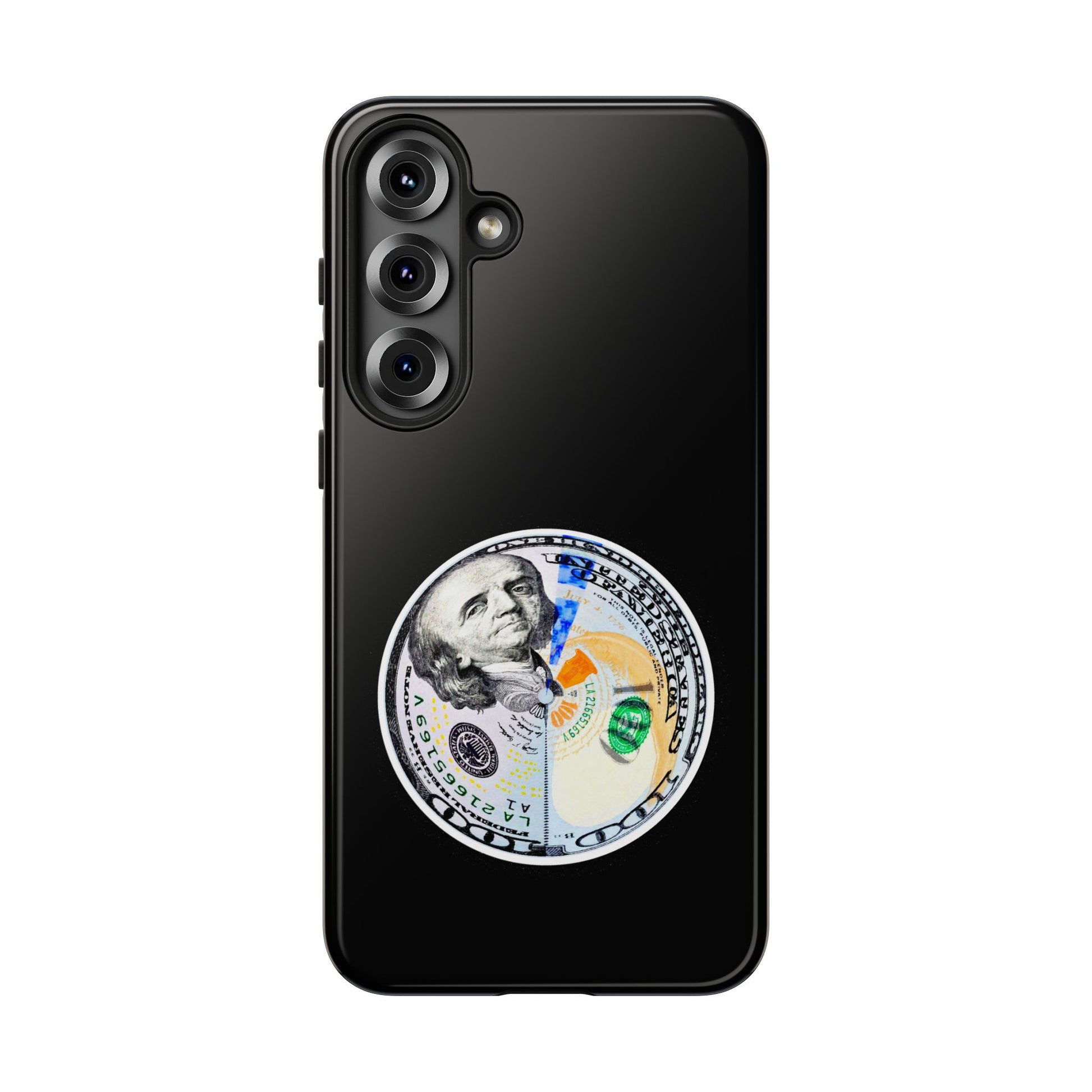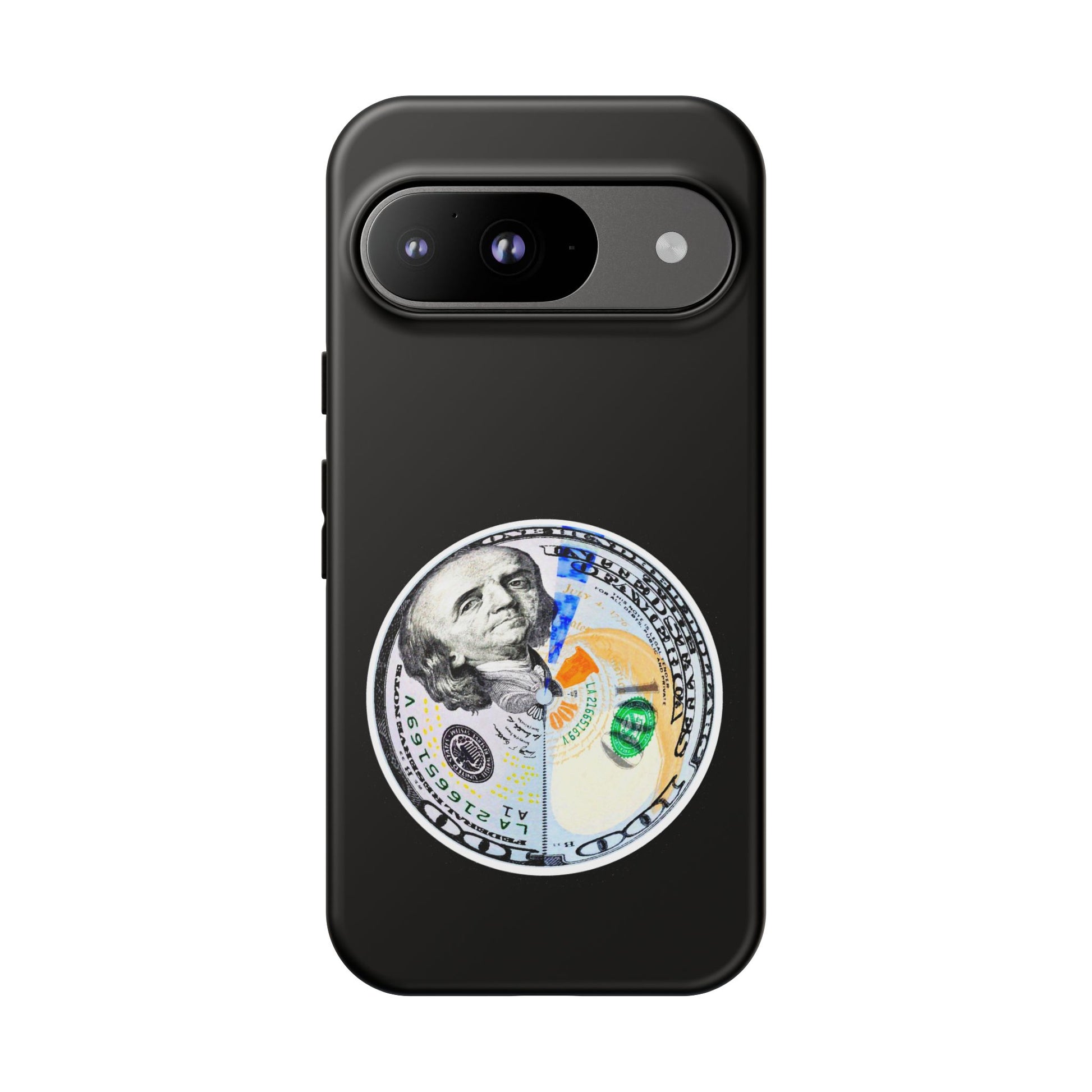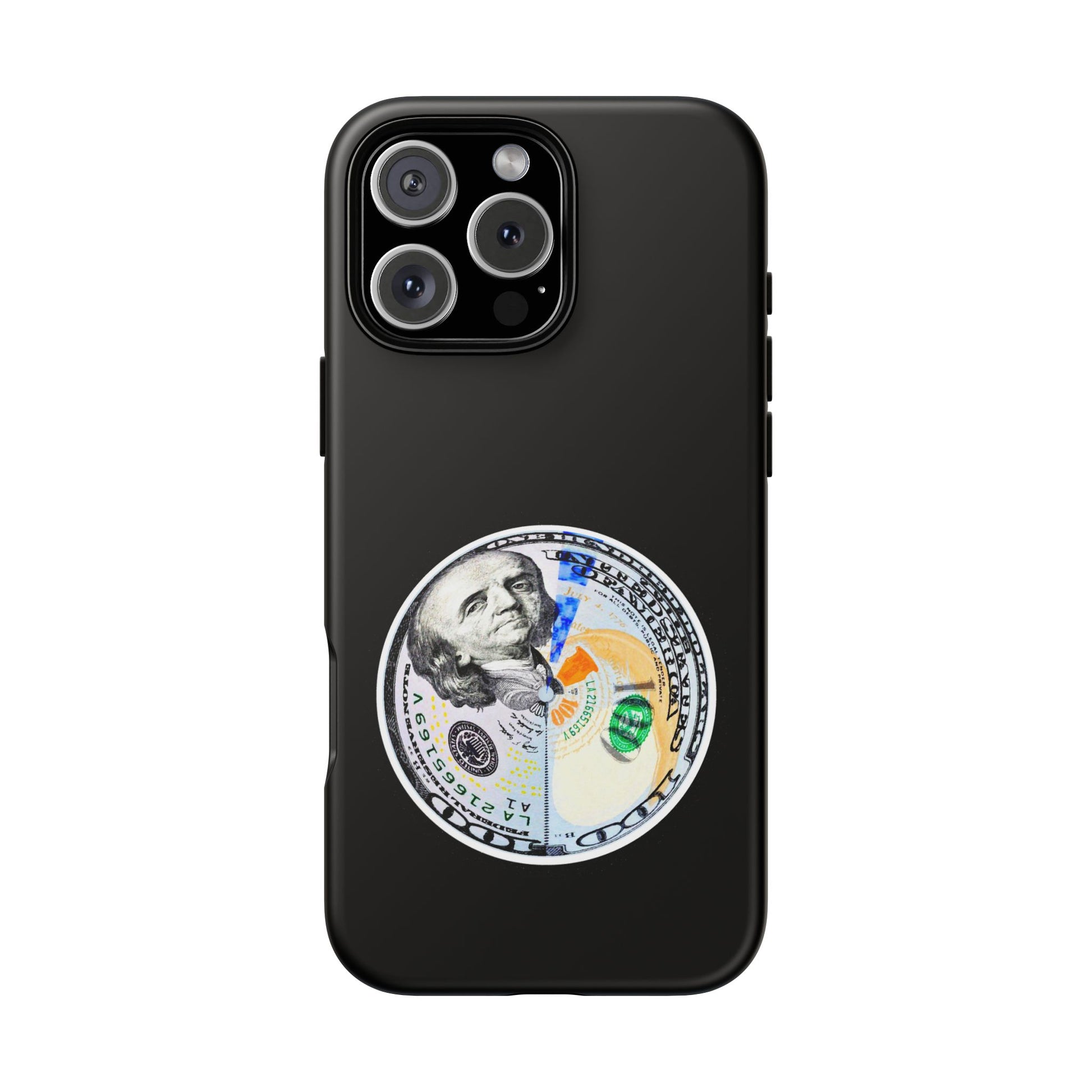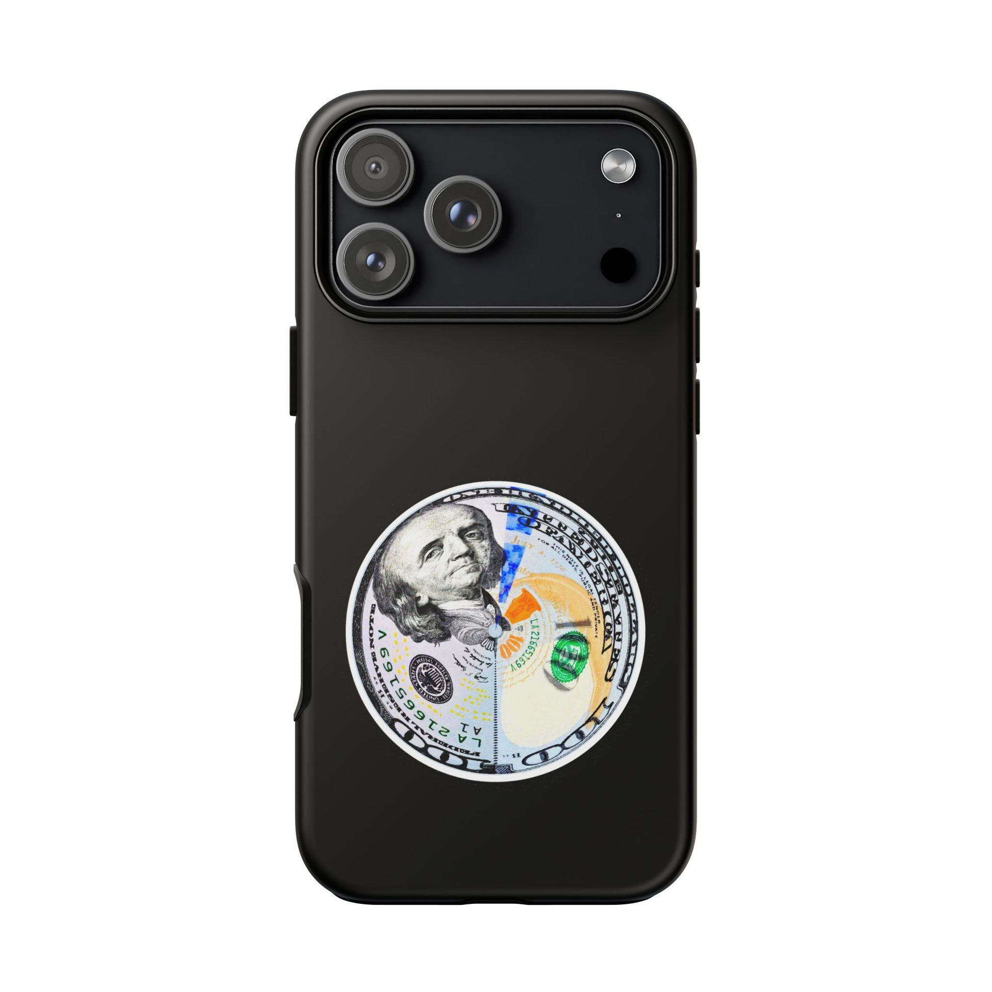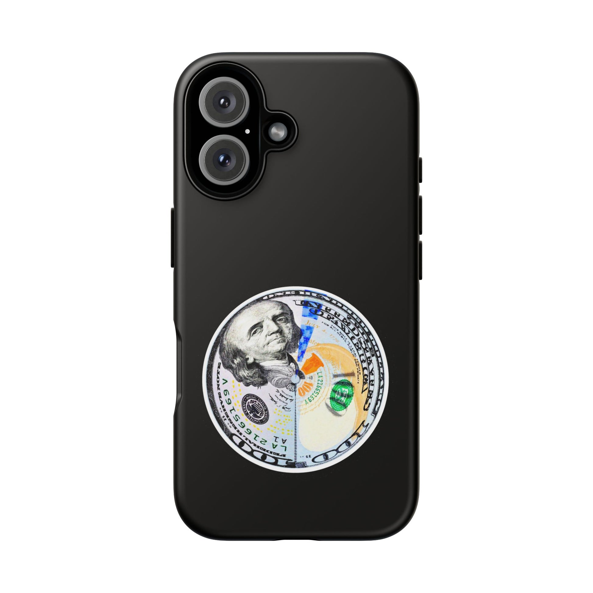 This protective phone case blends bold street attitude with reliable protection. The graphic—an artful split-dollar motif—sits centered on a smooth black shell, giving a crisp, modern contrast. Dual-layer construction (polycarbonate shell + TPU silicone liner) cushions against drops, while the 3D wrap keeps the artwork vivid. Weatherproof UV coating preserves colors outdoors, and precise cutouts leave ports clear for everyday charging and use. The slim profile supports wireless charging and fits newer iPhone models, including the iPhone 17 series. Practical care notes are included to keep the finish looking sharp.
