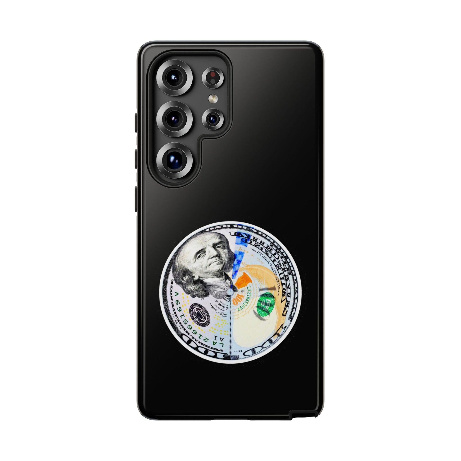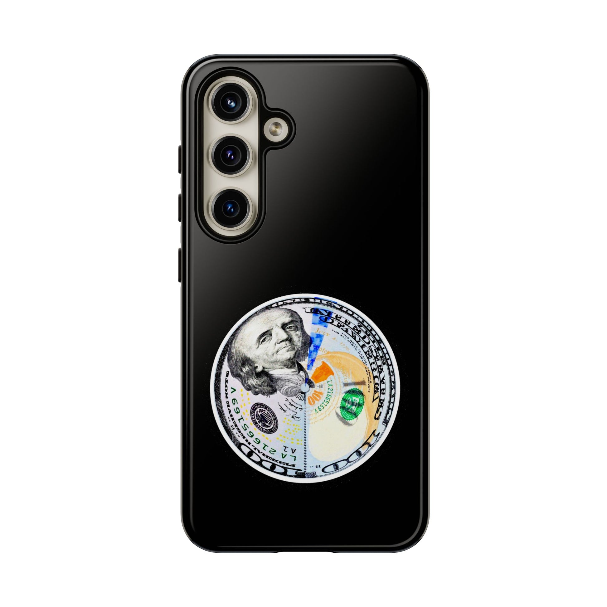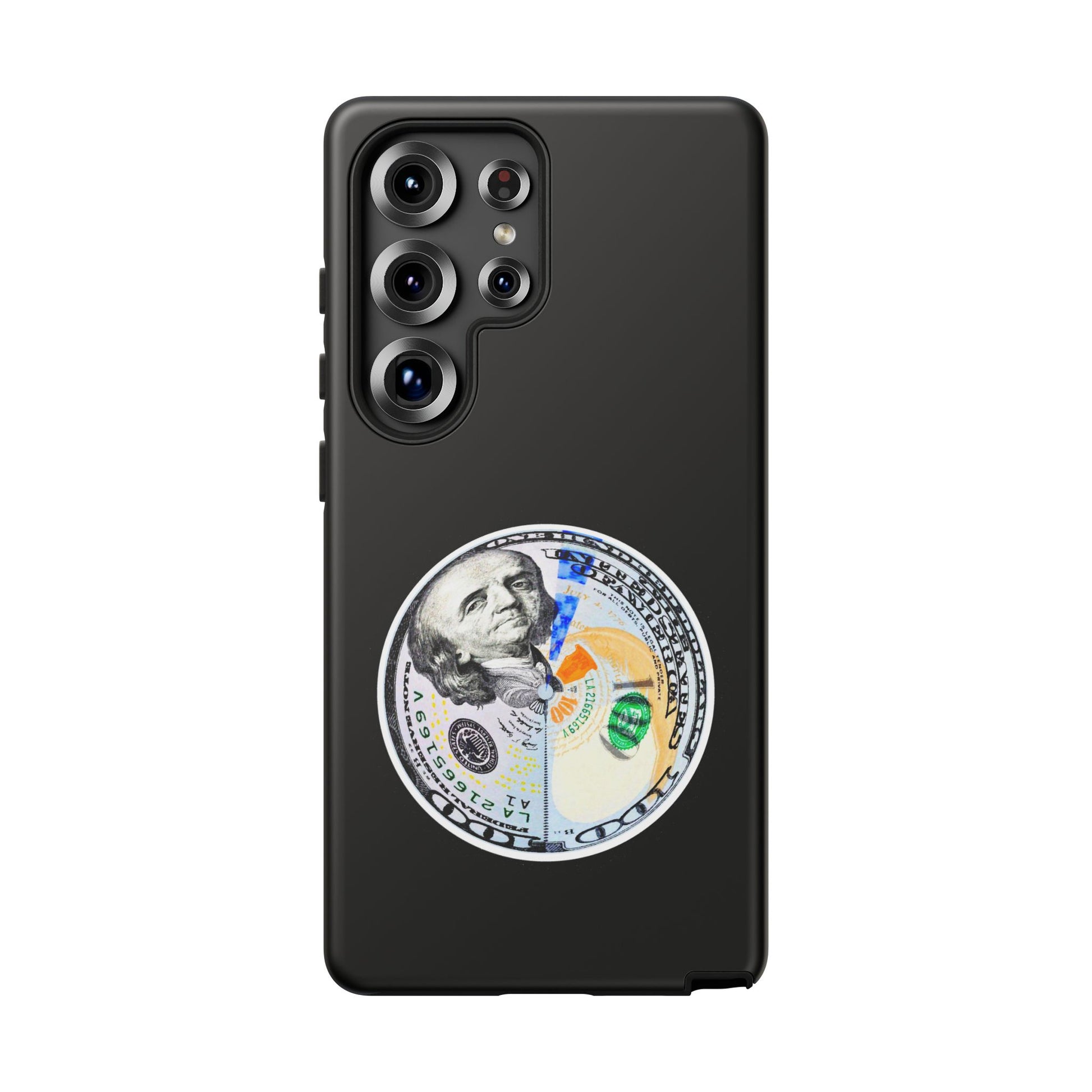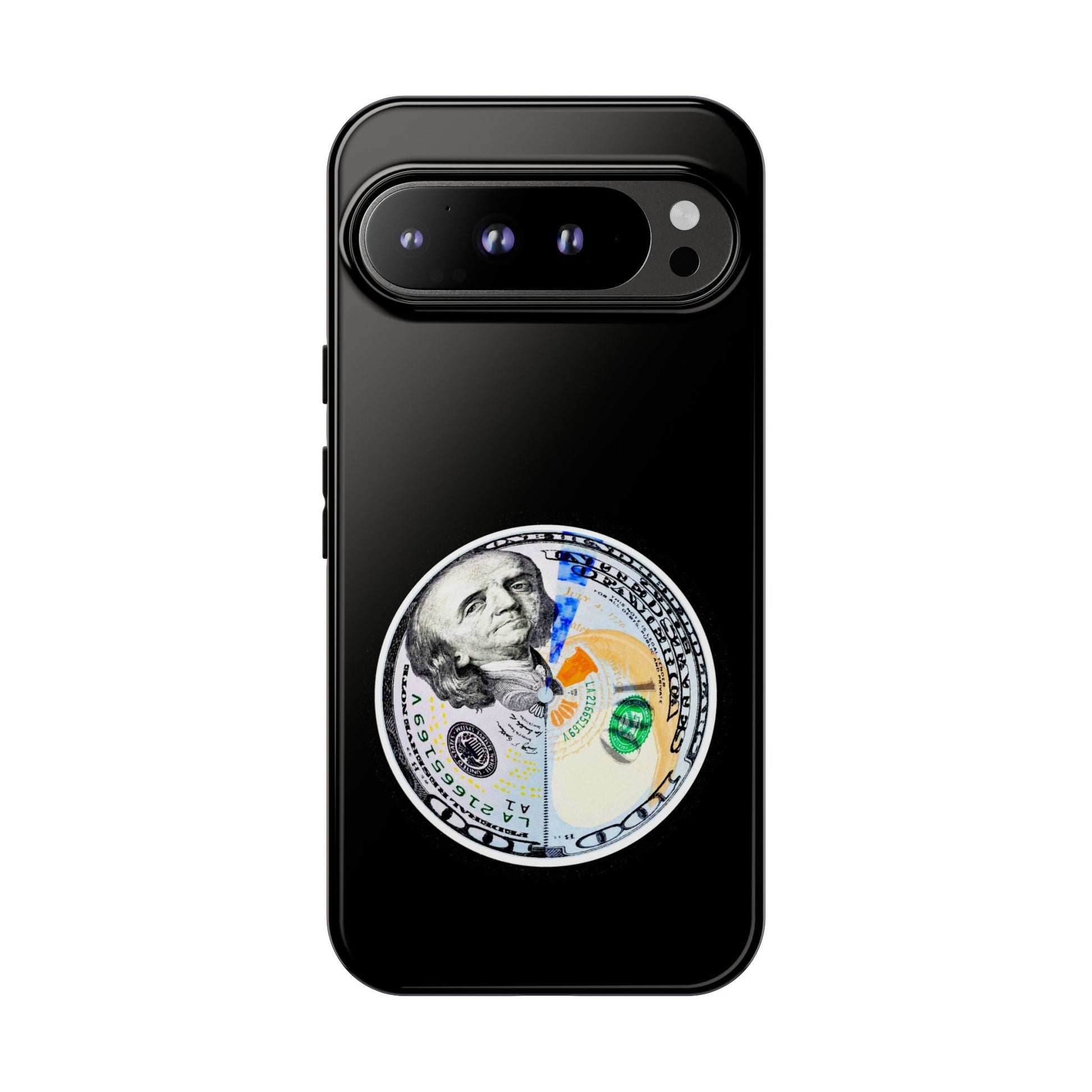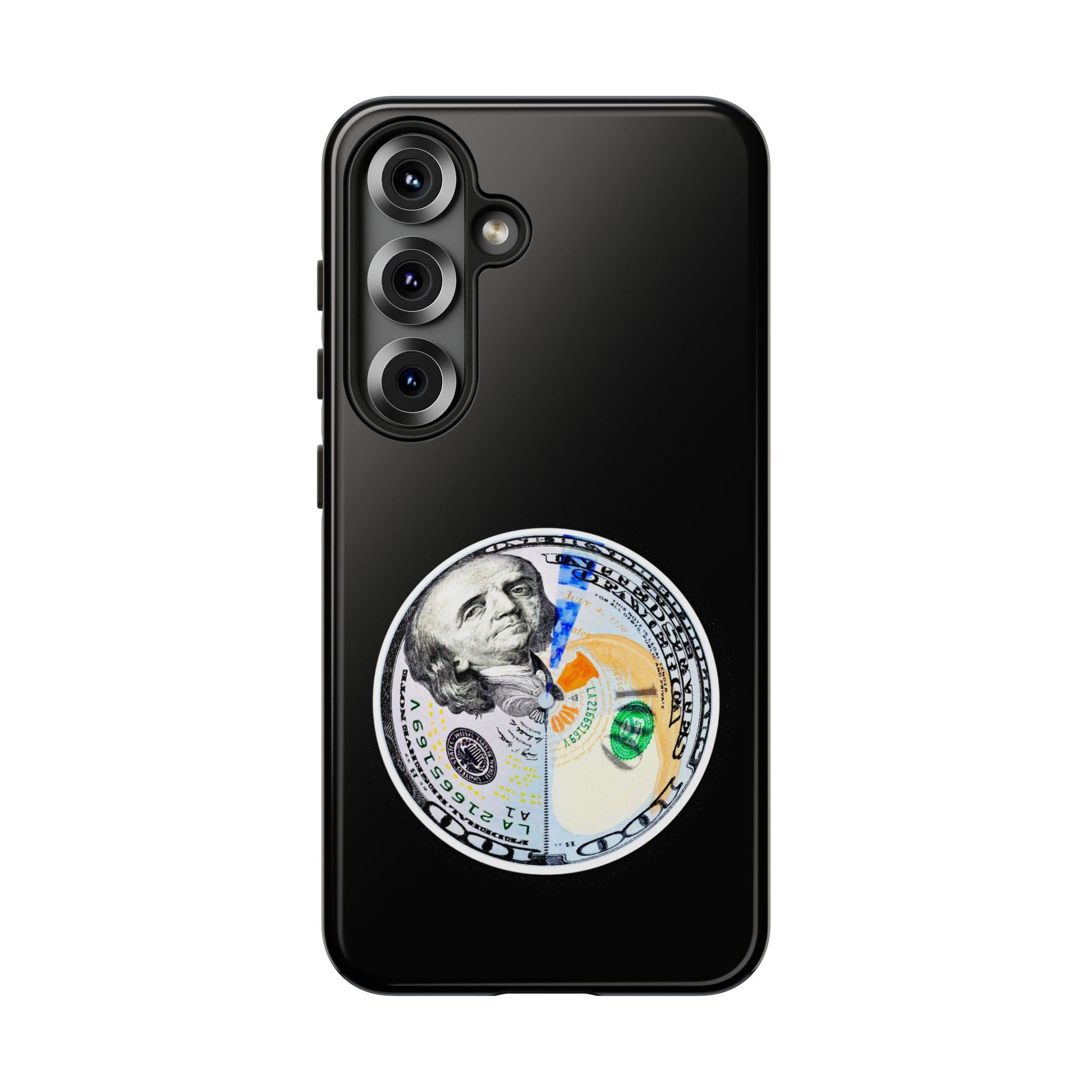 This protective phone case blends bold street attitude with reliable protection. The graphic—an artful split-dollar motif—sits centered on a smooth black shell, giving a crisp, modern contrast. Dual-layer construction (polycarbonate shell + TPU silicone liner) cushions against drops, while the 3D wrap keeps the artwork vivid. Weatherproof UV coating preserves colors outdoors, and precise cutouts leave ports clear for everyday charging and use. The slim profile supports wireless charging and fits newer iPhone models, including the iPhone 17 series. Practical care notes are included to keep the finish looking sharp.
