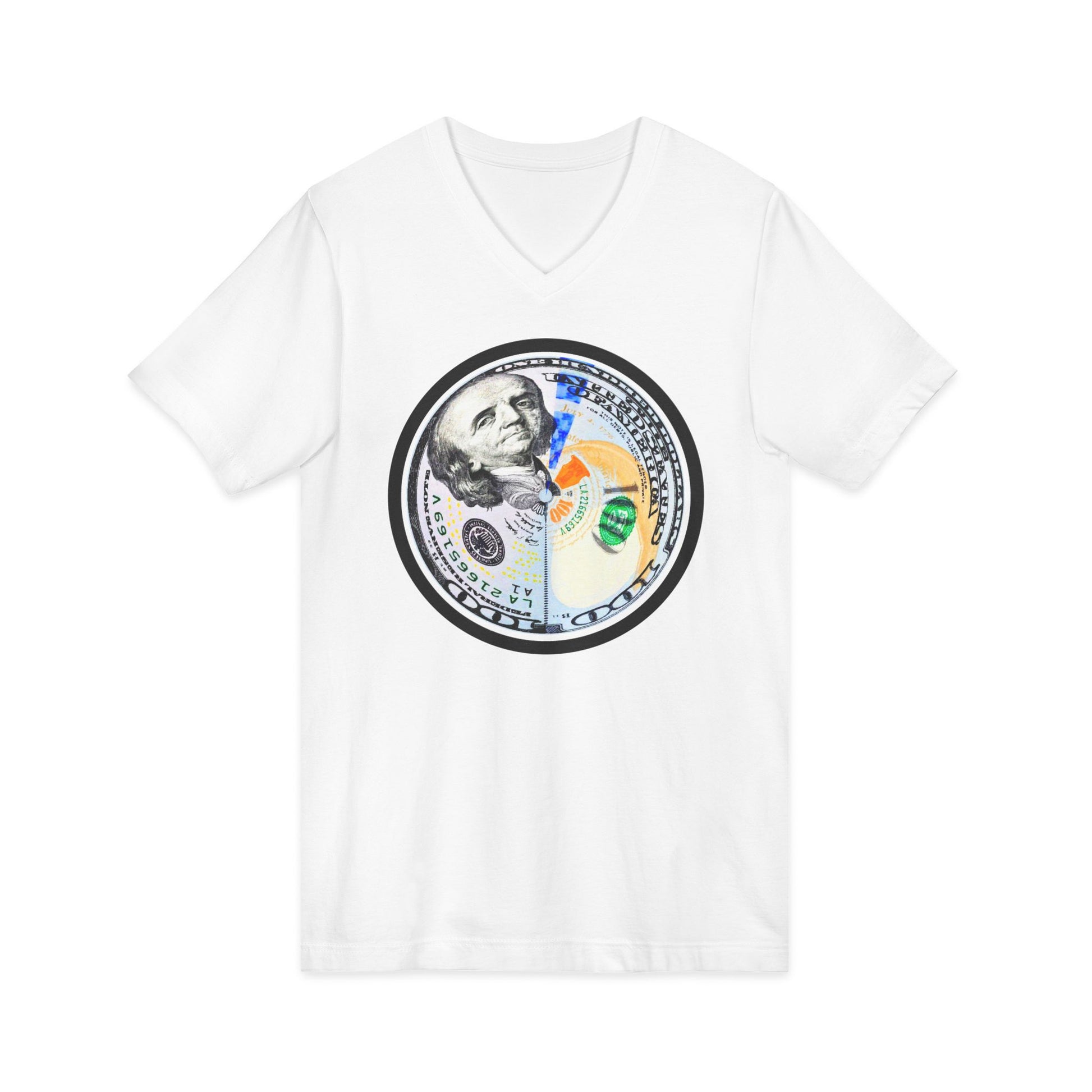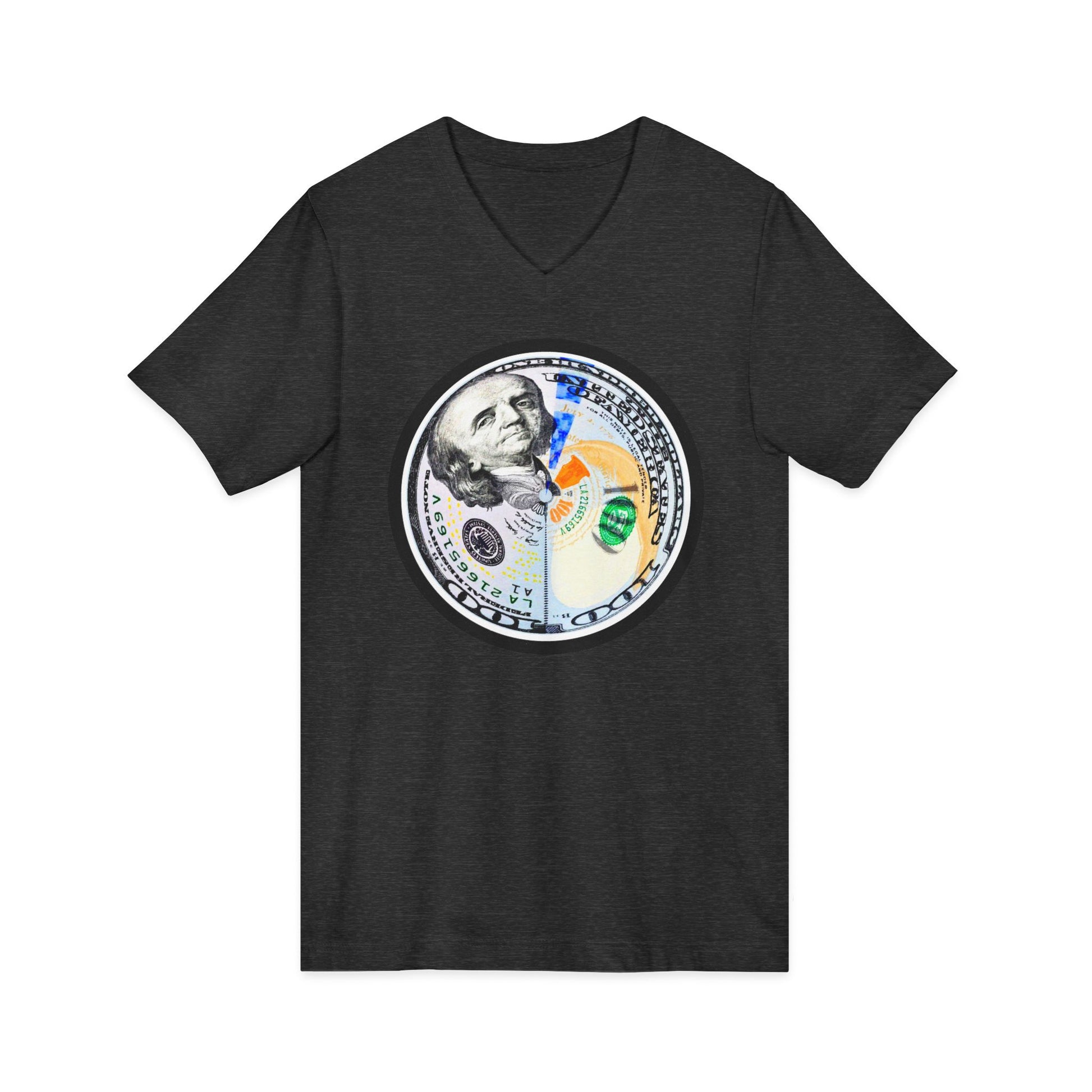 A lightweight V-neck tee with a small, circular front print that blends vintage astronaut iconography with a splash of hand-painted color. It feels like a quiet nod to curiosity—worn on a slow weekend walk, layered under a jacket for an evening lecture, or folded into a travel bag for a morning at the museum. The cut sits close to the body without clinging, and the soft cotton keeps movement easy. The art is subtle enough to spark conversation without shouting; it sits over the heart like a private emblem for people who love exploration, design, and understated storytelling.