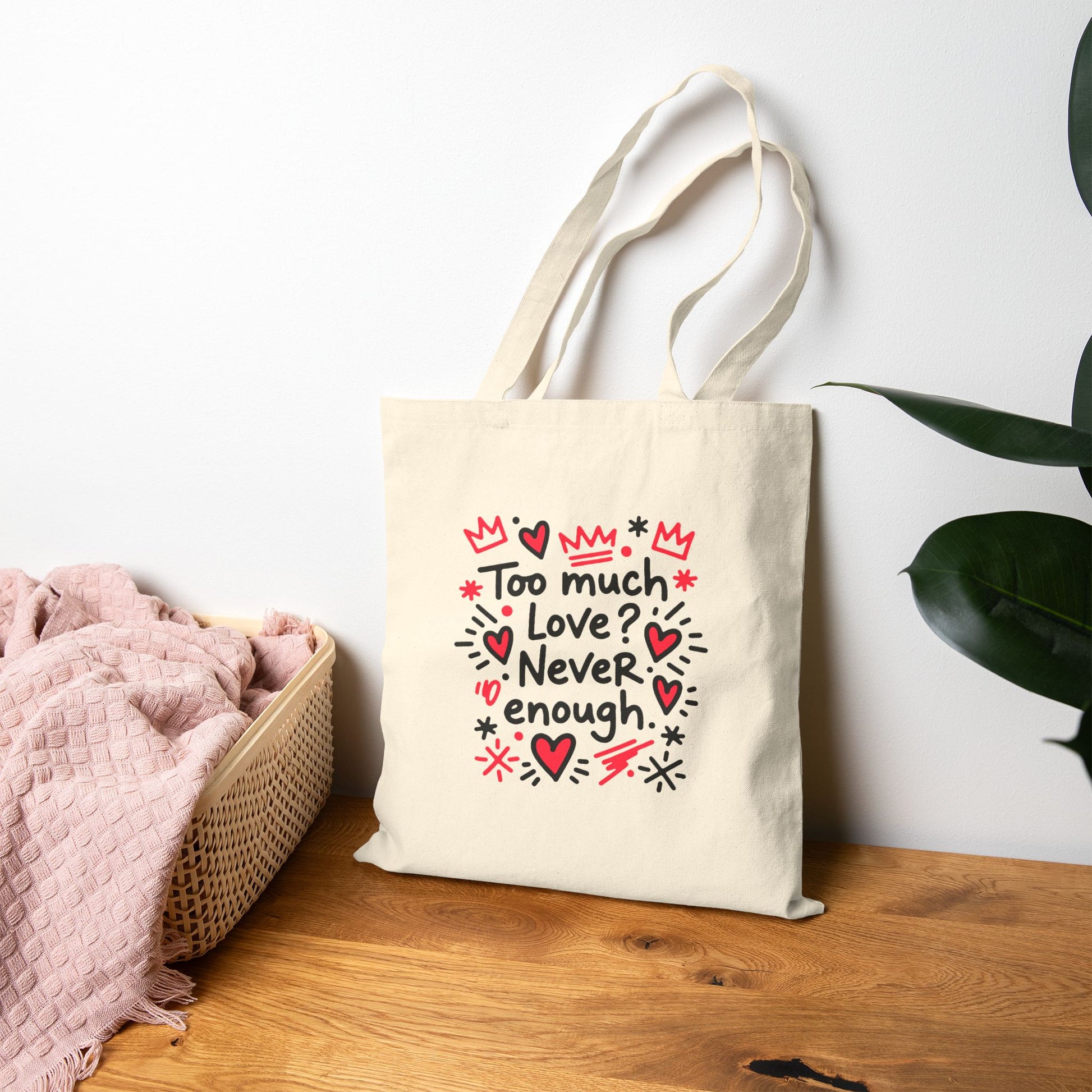 This heavyweight cotton canvas tote carries more than things—it carries feeling. Natural, sturdy fabric and long, reinforced handles make everyday errands feel intentional. The playful hand-drawn design—hearts, crowns, and handwritten lettering that reads “Too much love? “Never enough”—sits front and center in warm reds and soft blacks, adding a cheerful, slightly rebellious note to coffee runs, library visits, and market days. It lies flat when stored, slips over a shoulder without pulling, and wears small scuffs like a badge of well-loved use. For anyone who lives loud with affection and wants a simple, durable bag that echoes their warmth, this tote quietly celebrates that spirit.
