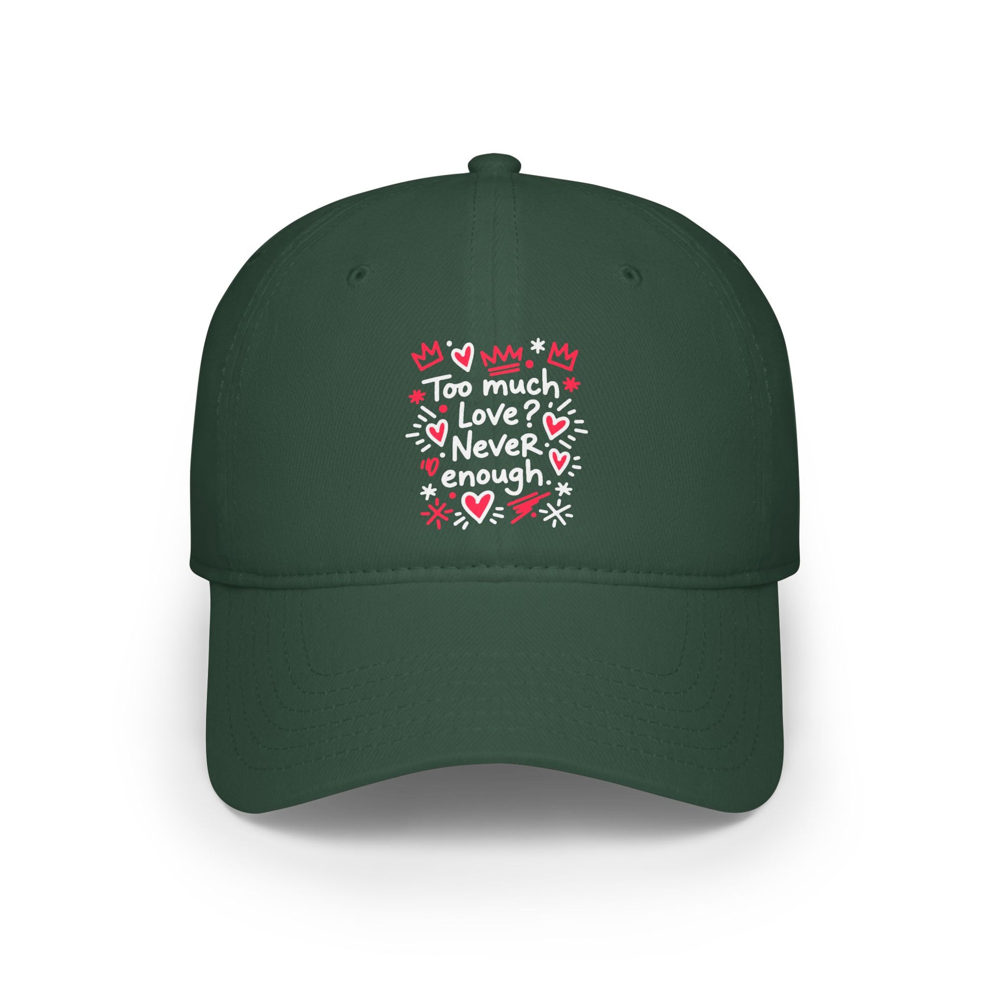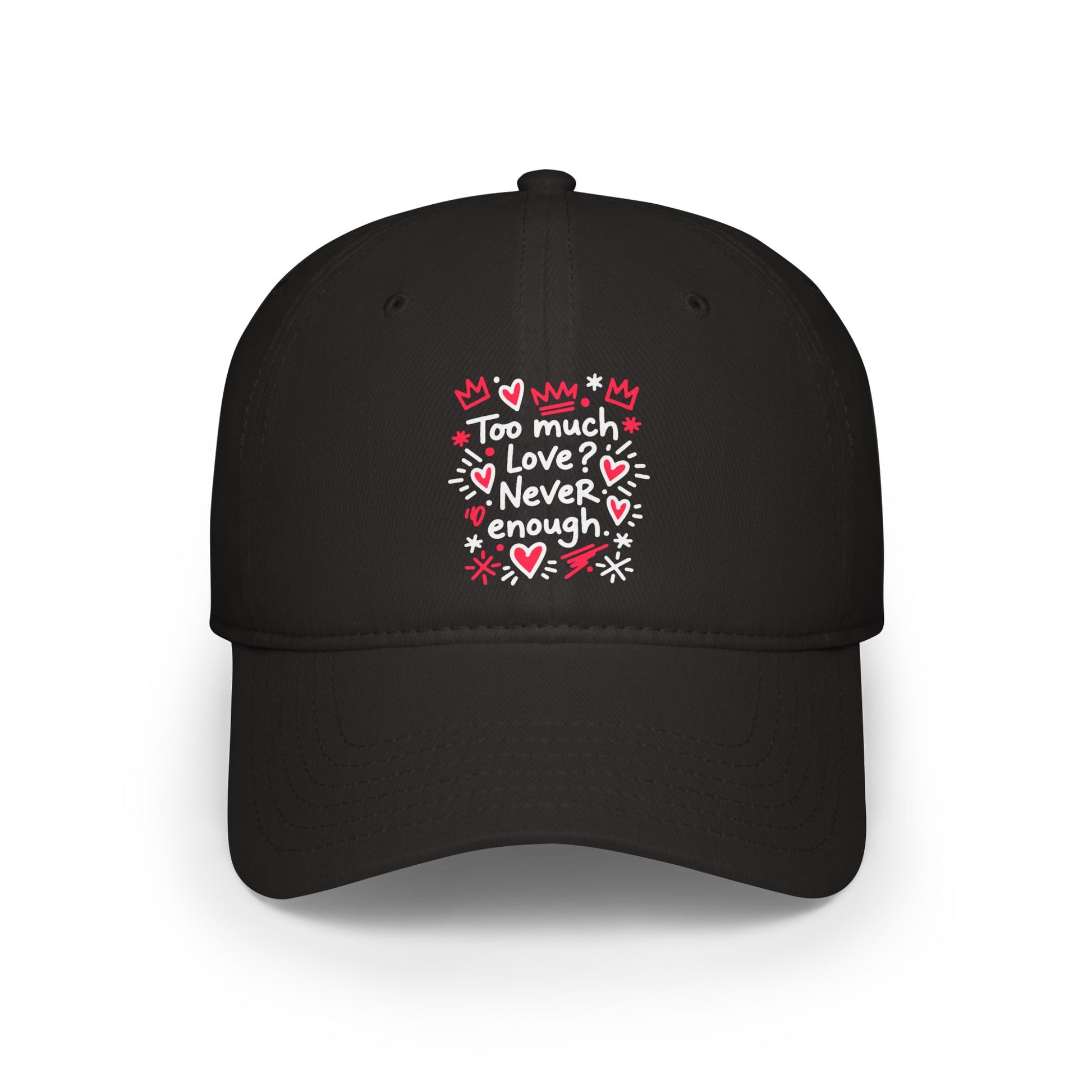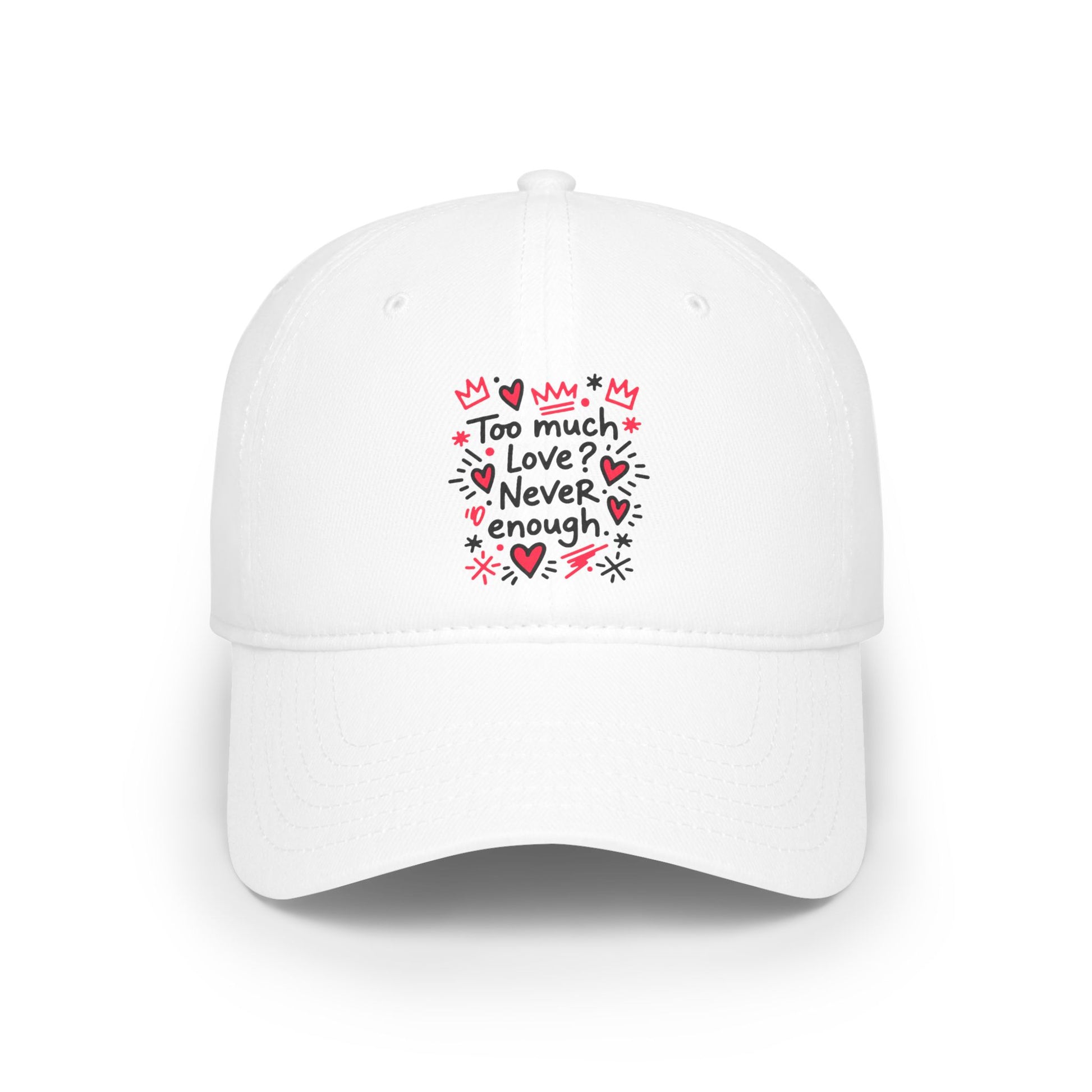 Soft, low-profile baseball cap embroidered with a playful, hand-drawn love motif. The compact crown sits close to the head for a relaxed, lived-in look, while the curved brim keeps sun and glare at bay. Small hearts, crowns, and energetic doodles surround the phrase “Too much love? Never enough,” giving the cap a warm, slightly rebellious vibe—like a little declaration you wear instead of saying it aloud. Lightweight cotton twill and reinforced seams make this a cap you’ll reach for on slow weekend mornings, quick coffee runs, or when you want a casual finishing touch that speaks to someone who loves boldly and shows it.