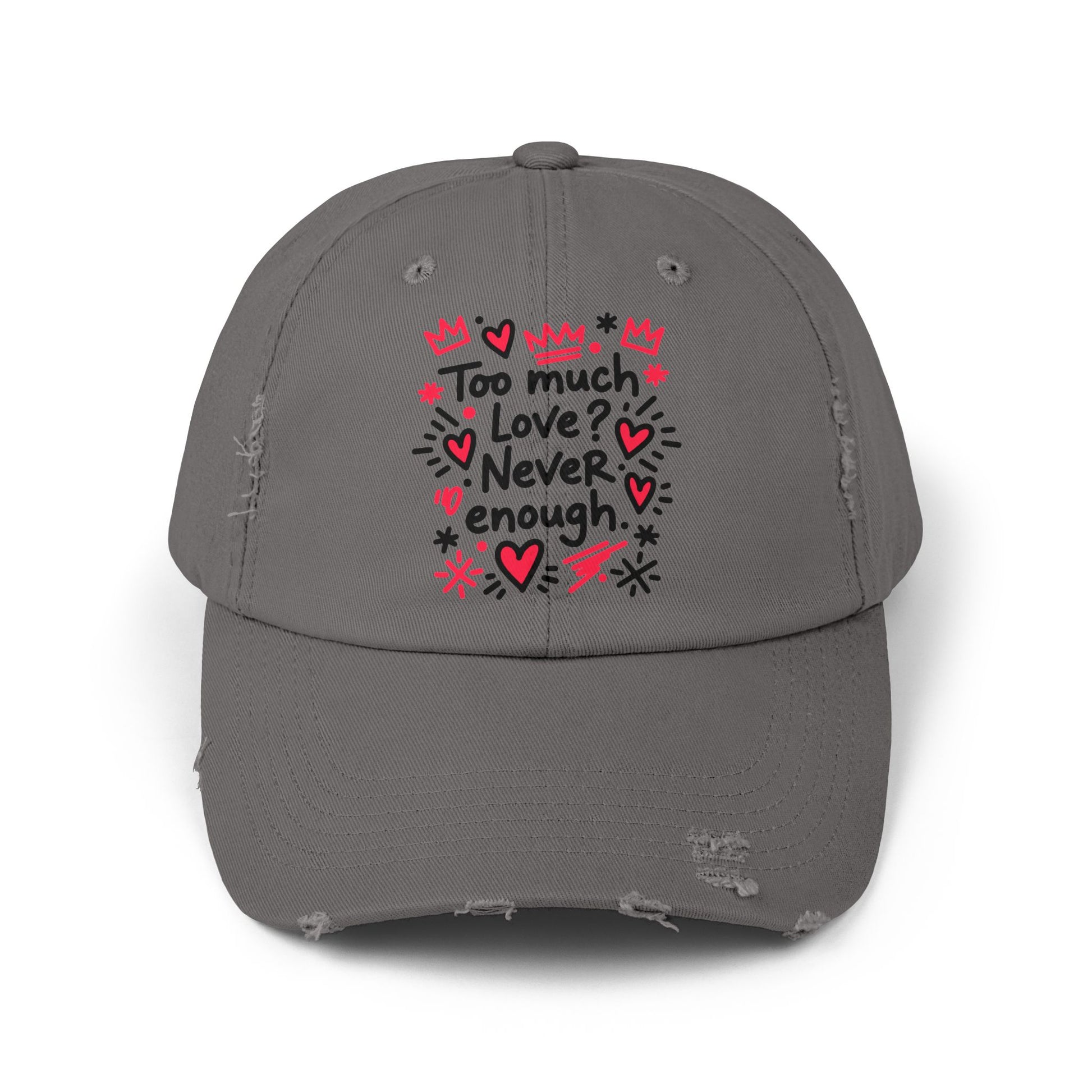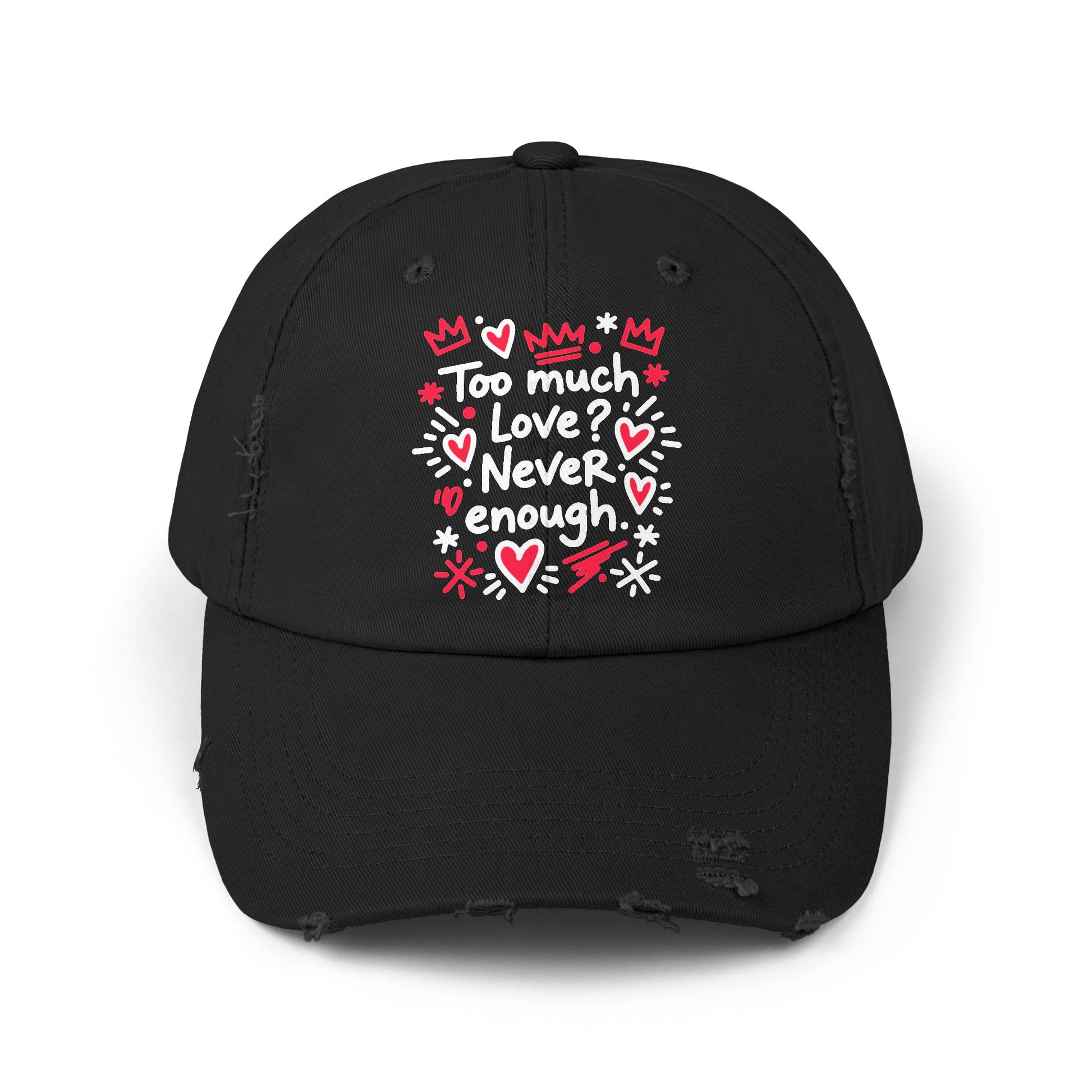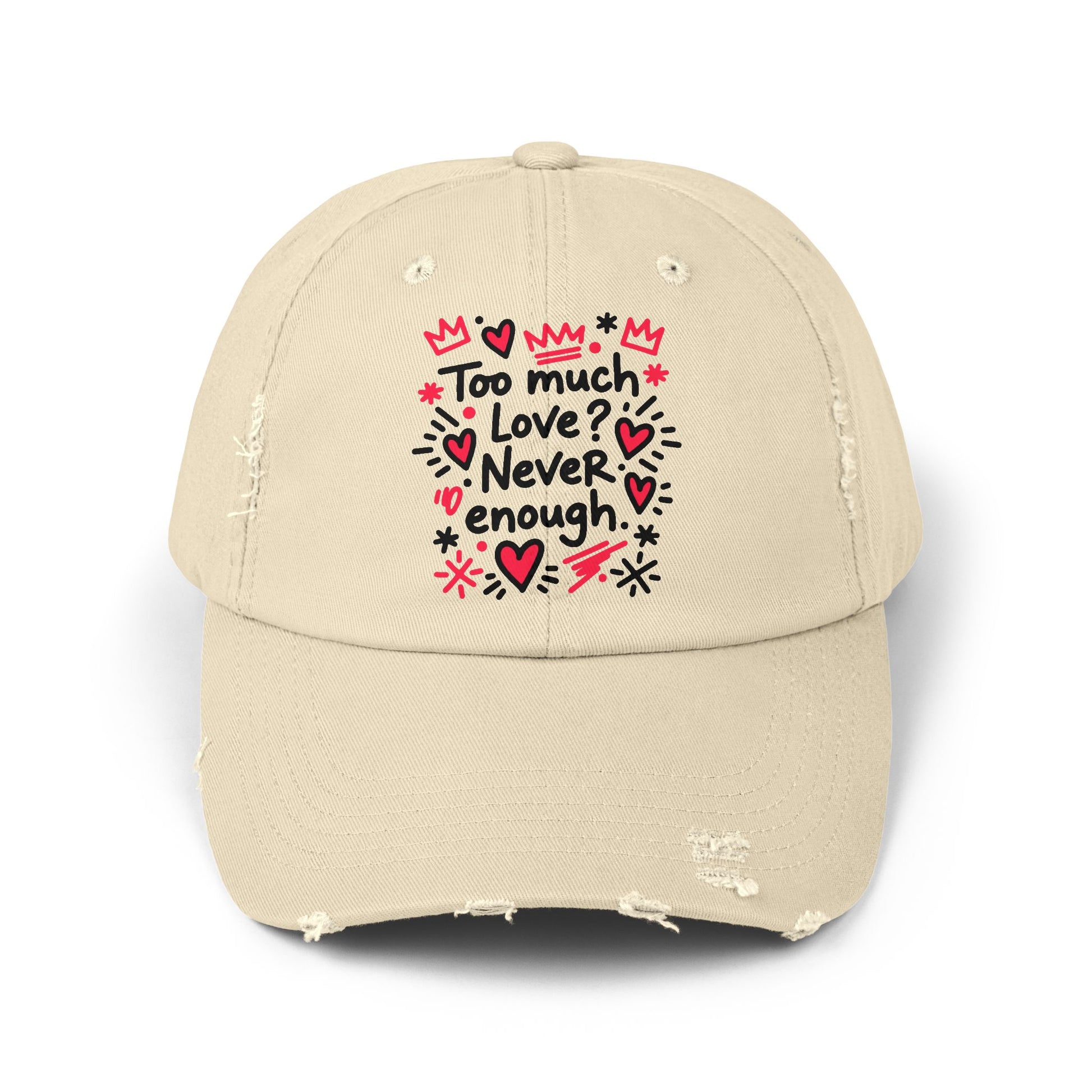 This distressed cotton cap carries a playful, hand-drawn message—"Too much love? Never ”enough”—surrounded by doodled hearts, crowns, and stars. Lightweight and broken-in, it sits low on the head with a relaxed silhouette and curved visor that softens every look. Wear it on days when you want to broadcast warmth and whimsy without taking yourself too seriously. The faded edges and subtle wear give it a lived-in charm that pairs naturally with denim, cozy sweaters, or a weekend tee. The hidden fabric strap with a metal D-ring lets you fine-tune the fit, while the DTF-printed artwork keeps the colors vivid through regular wear. Because each hat is finished by hand, small variations in distress and tone make every piece feel personal and earned.