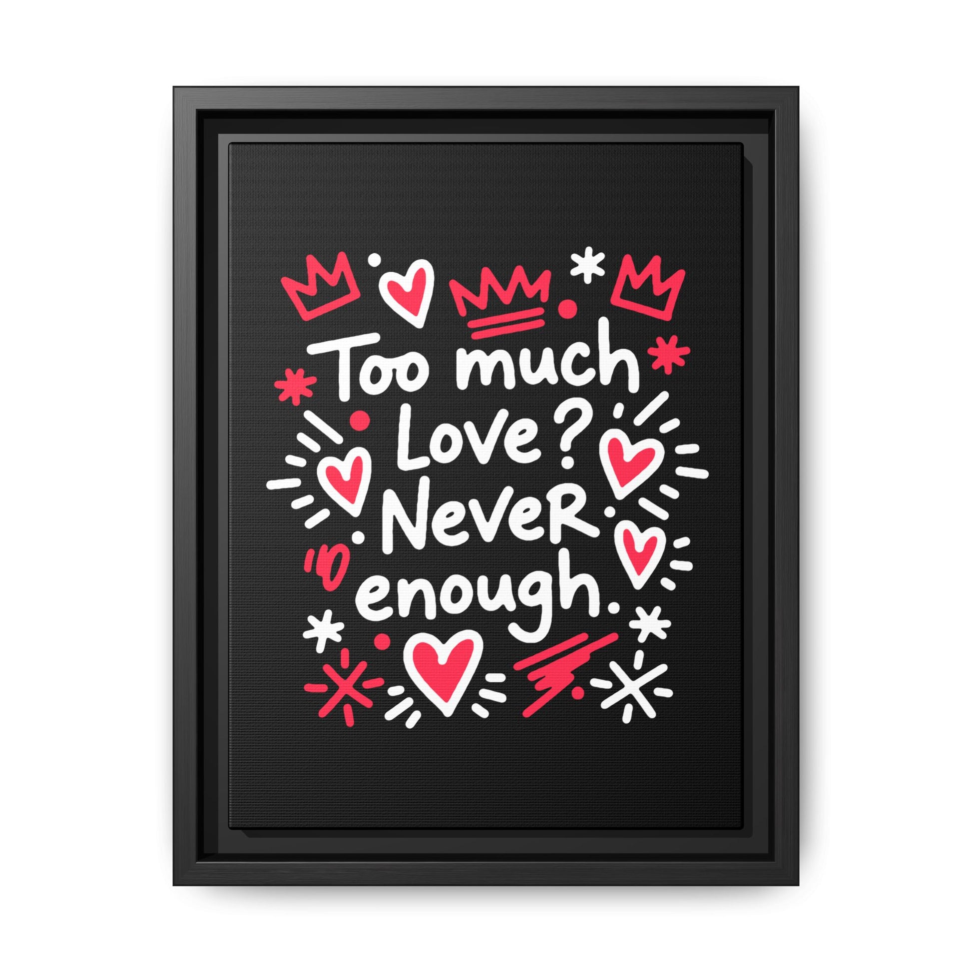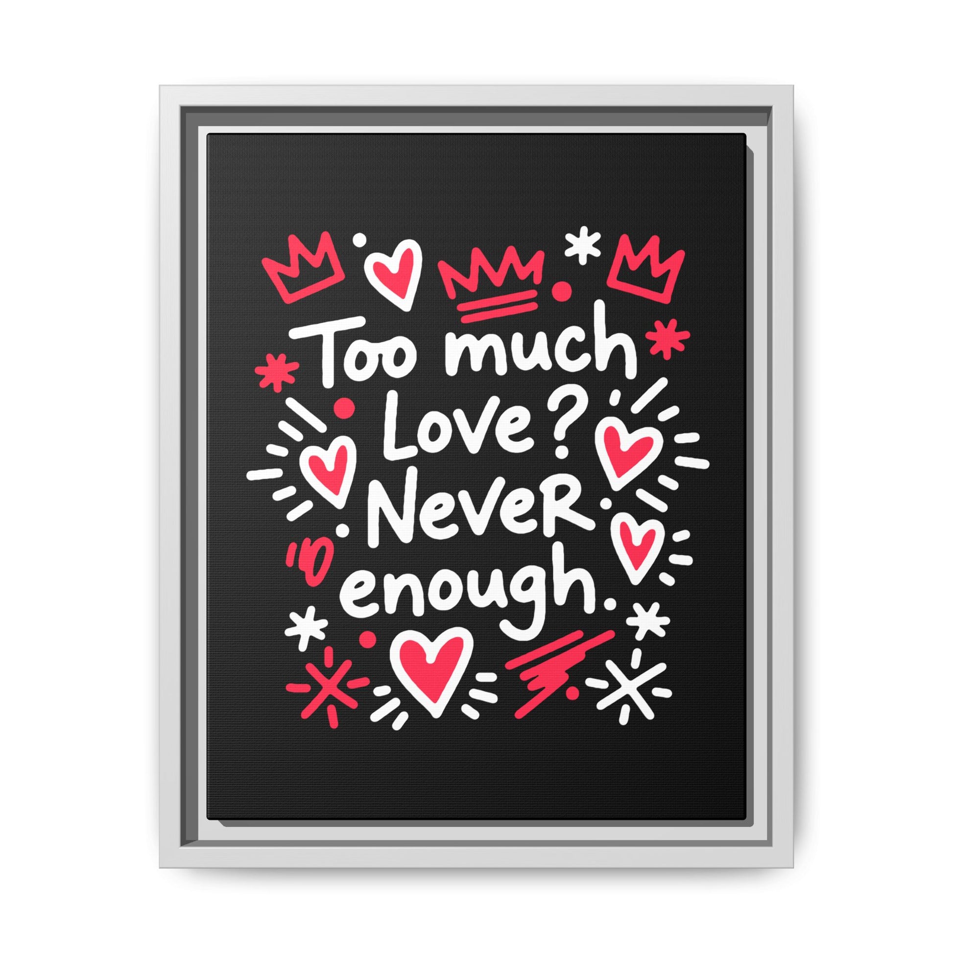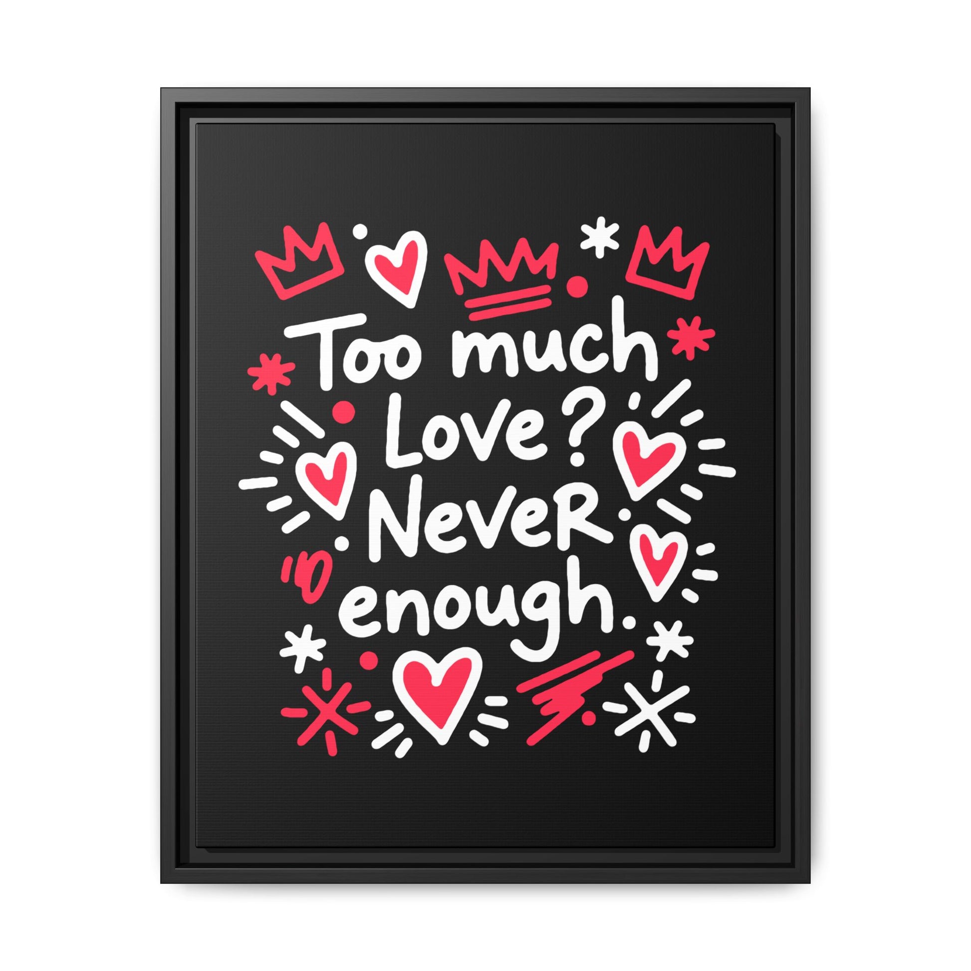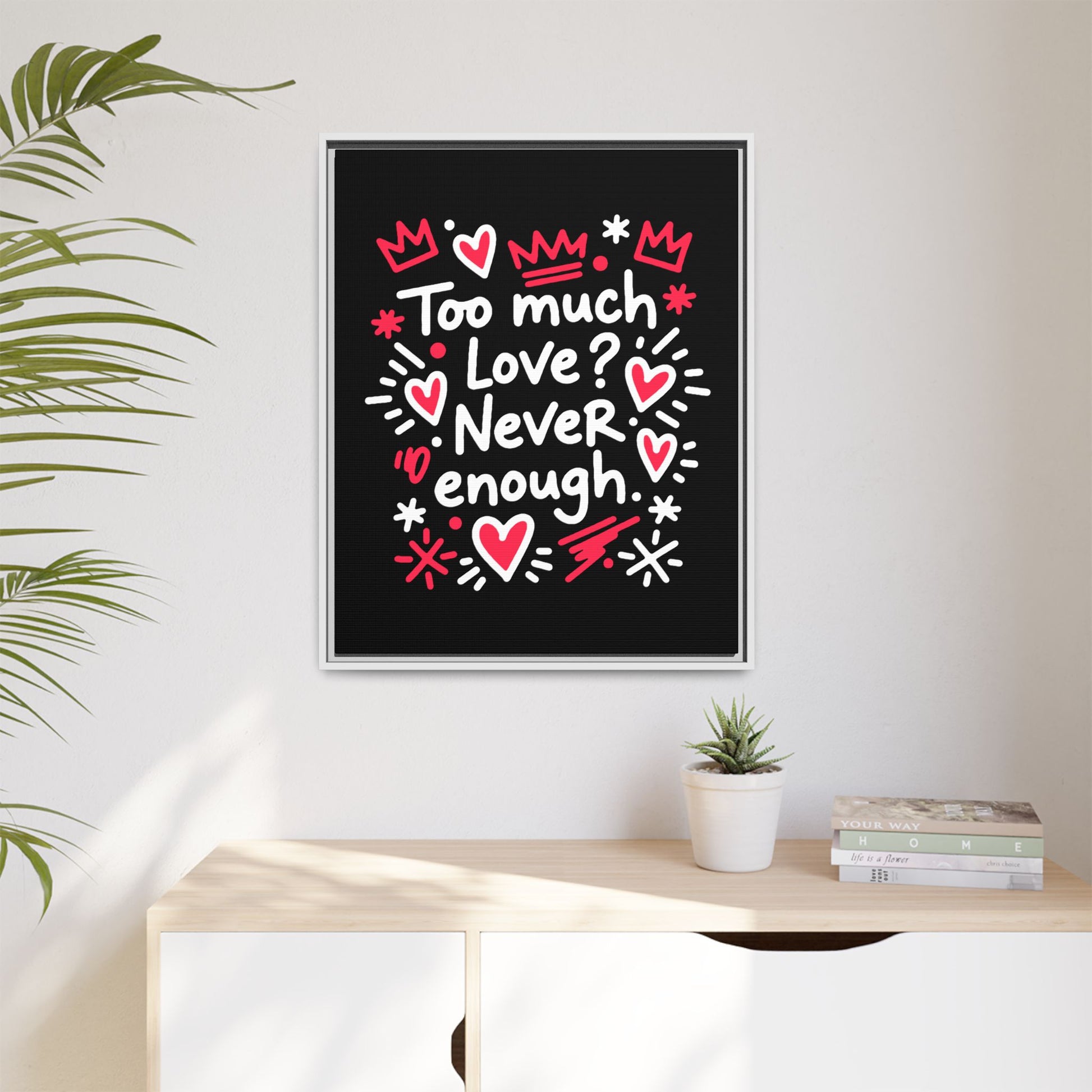 A framed matte canvas print that brings hand-drawn charm and bold contrast to any wall. The black background makes the white and red doodle lettering pop—playful crowns, hearts, and sparkles surround the phrase “Too much love? Never enough.” Lightweight yet sturdy, the pine frame adds a clean, modern outline, and the sawtooth hardware makes hanging effortless. Made with a durable cotton/poly canvas composite and UL-certified Greenguard Gold latex inks, this piece keeps colors vivid while meeting high safety and sustainability standards. Choose orientation and frame color to match a cozy bedroom, a lively office corner, or a gallery wall that celebrates spirited, affectionate design.