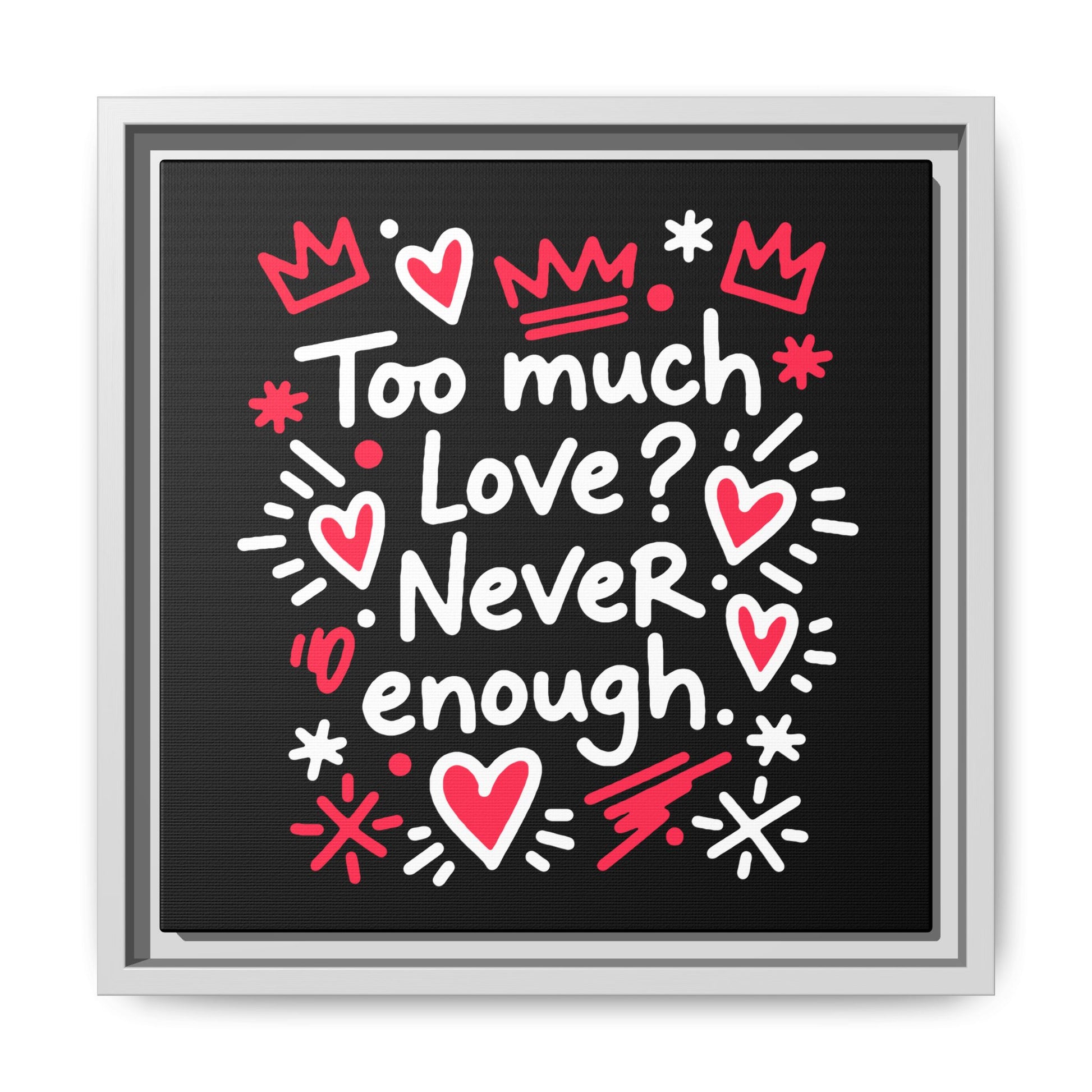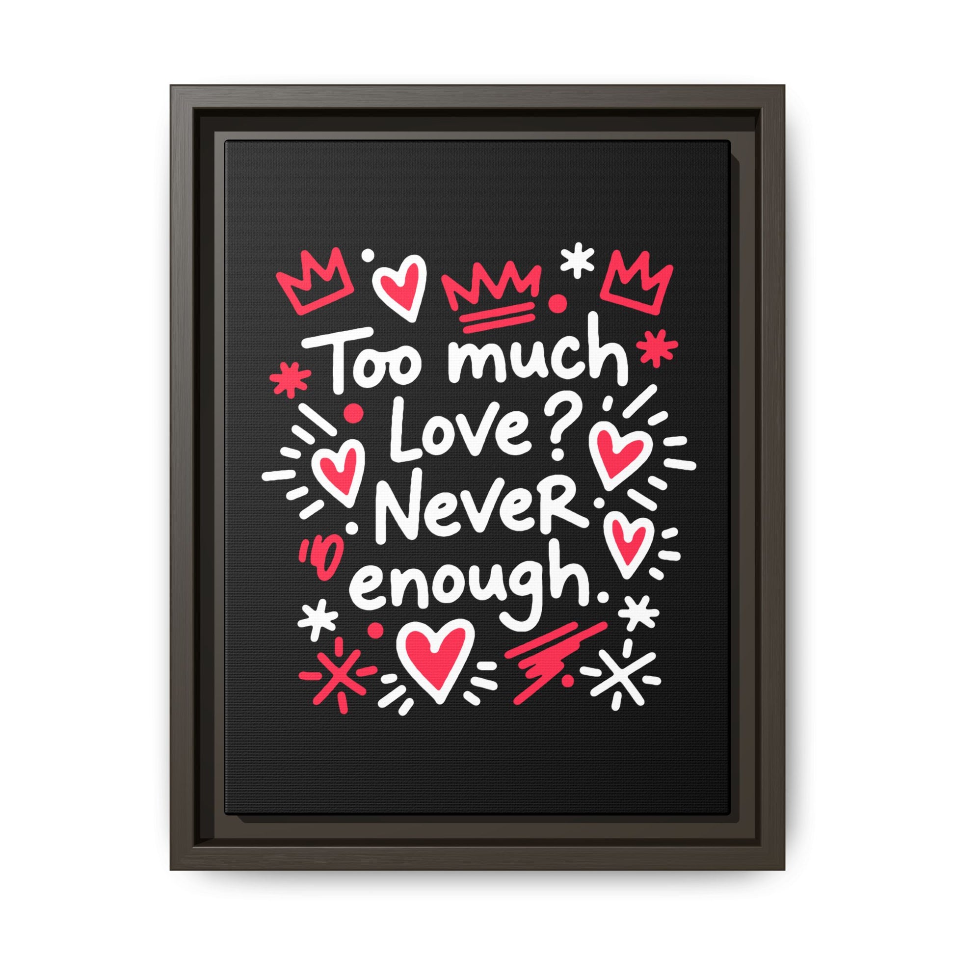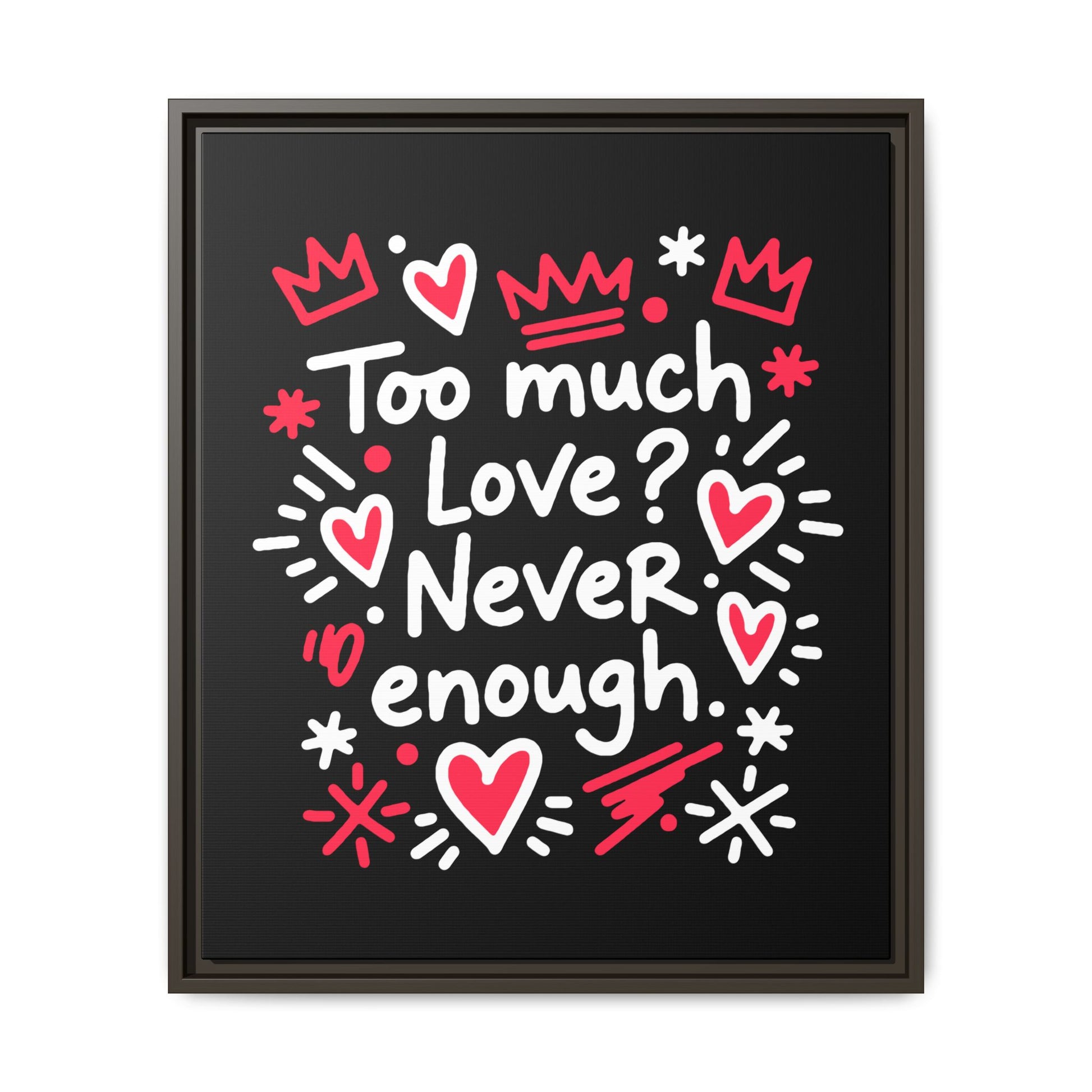 A framed matte canvas print that brings hand-drawn charm and bold contrast to any wall. The black background makes the white and red doodle lettering pop—playful crowns, hearts, and sparkles surround the phrase “Too much love? Never enough.” Lightweight yet sturdy, the pine frame adds a clean, modern outline, and the sawtooth hardware makes hanging effortless. Made with a durable cotton/poly canvas composite and UL-certified Greenguard Gold latex inks, this piece keeps colors vivid while meeting high safety and sustainability standards. Choose orientation and frame color to match a cozy bedroom, a lively office corner, or a gallery wall that celebrates spirited, affectionate design.