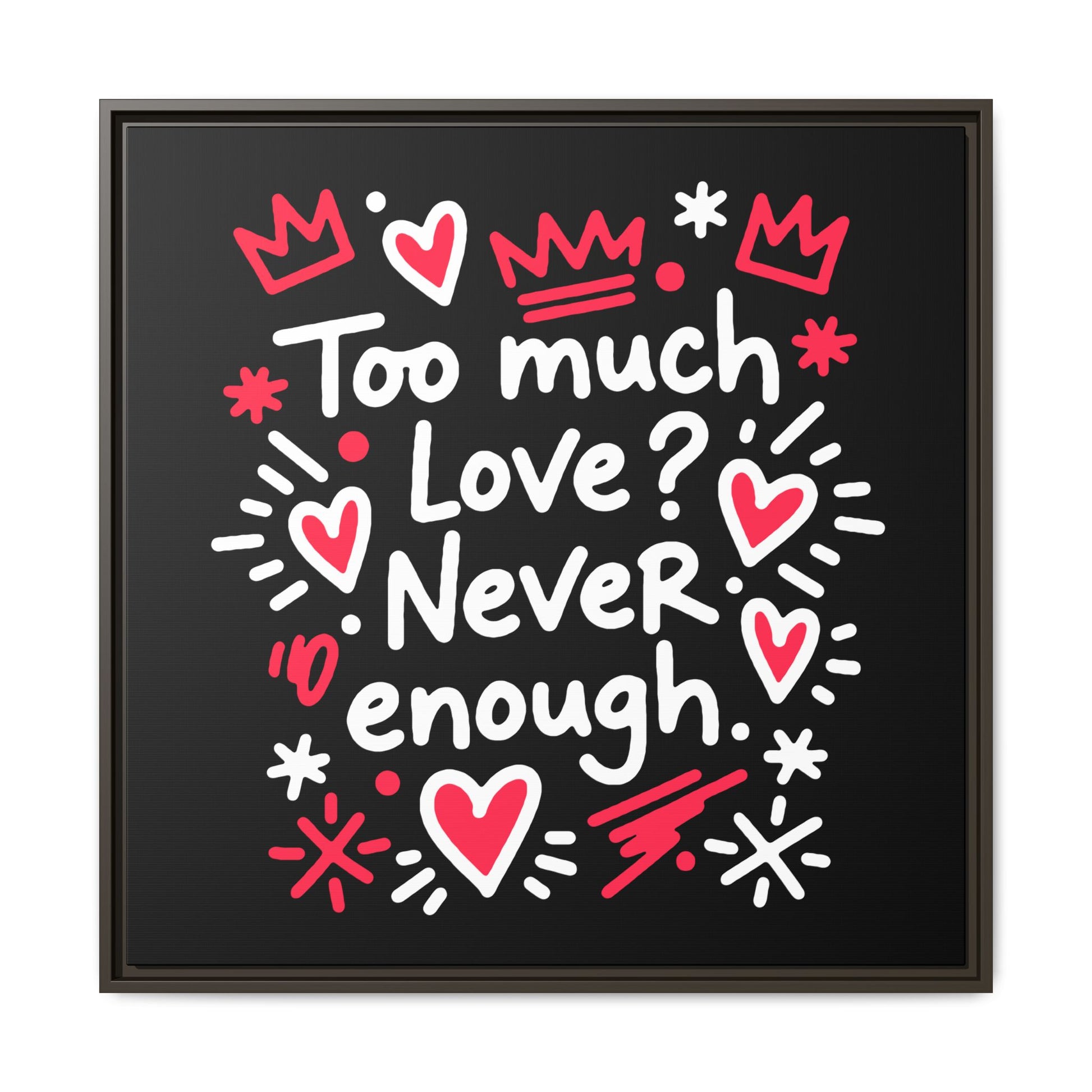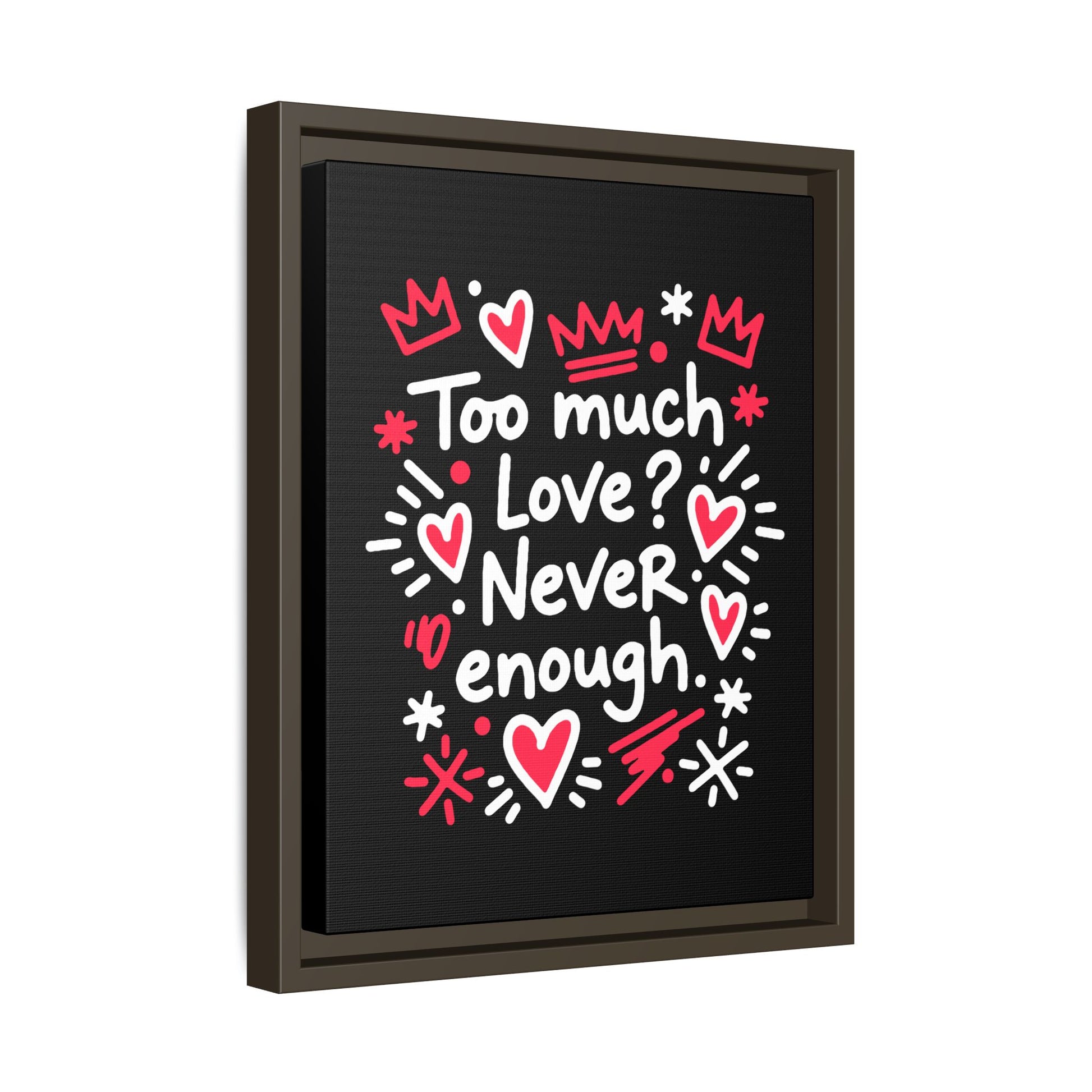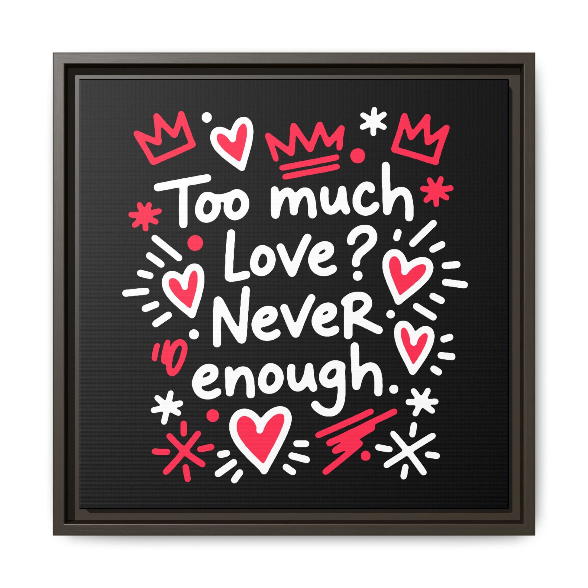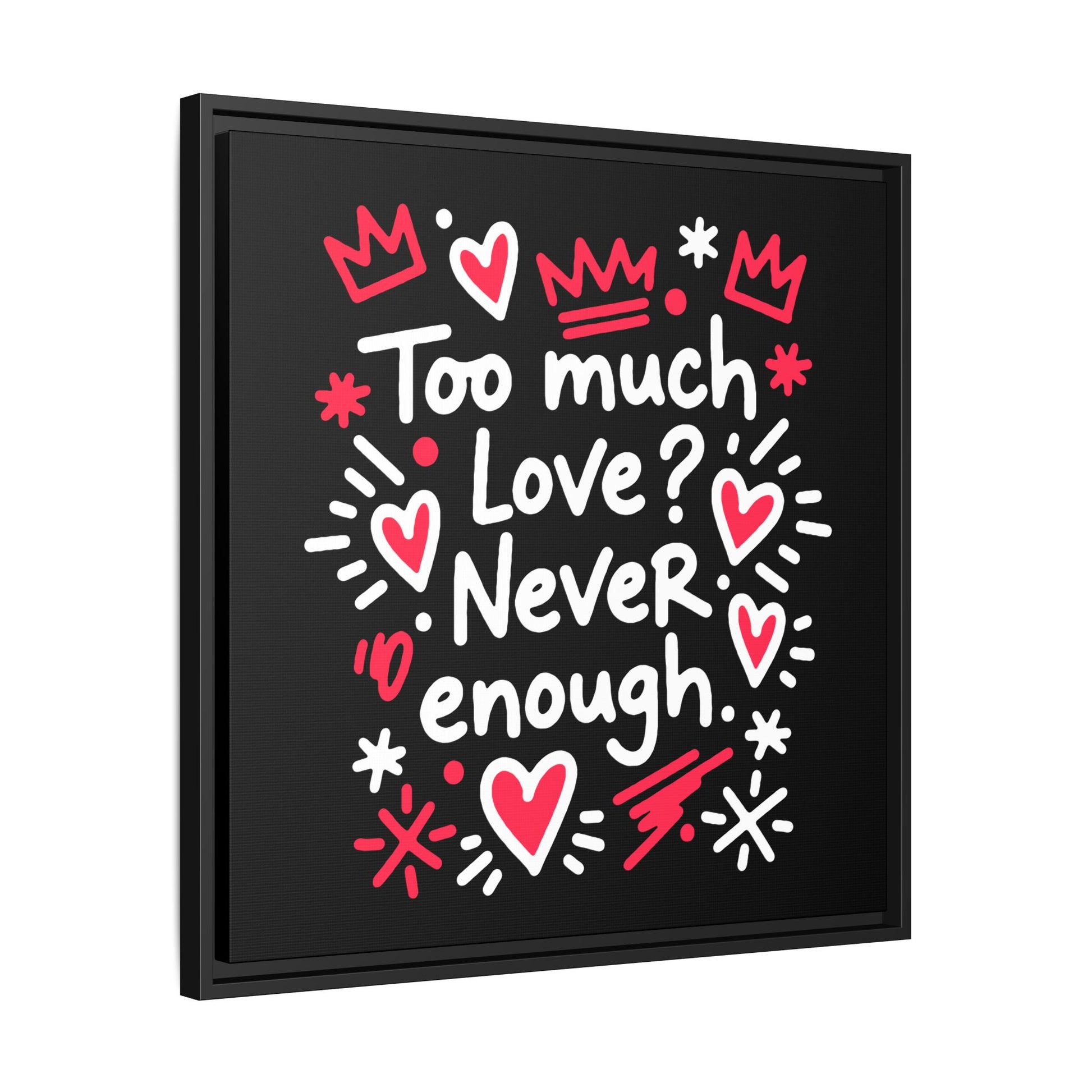 A framed matte canvas print that brings hand-drawn charm and bold contrast to any wall. The black background makes the white and red doodle lettering pop—playful crowns, hearts, and sparkles surround the phrase “Too much love? Never enough.” Lightweight yet sturdy, the pine frame adds a clean, modern outline, and the sawtooth hardware makes hanging effortless. Made with a durable cotton/poly canvas composite and UL-certified Greenguard Gold latex inks, this piece keeps colors vivid while meeting high safety and sustainability standards. Choose orientation and frame color to match a cozy bedroom, a lively office corner, or a gallery wall that celebrates spirited, affectionate design.