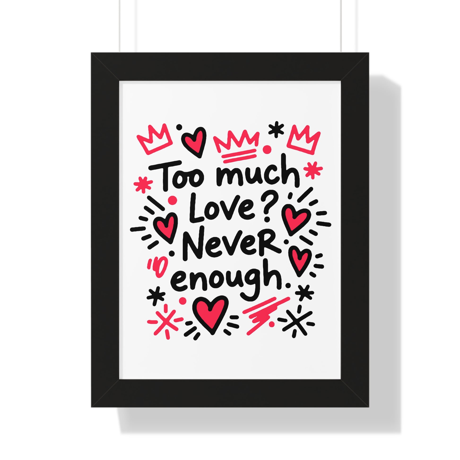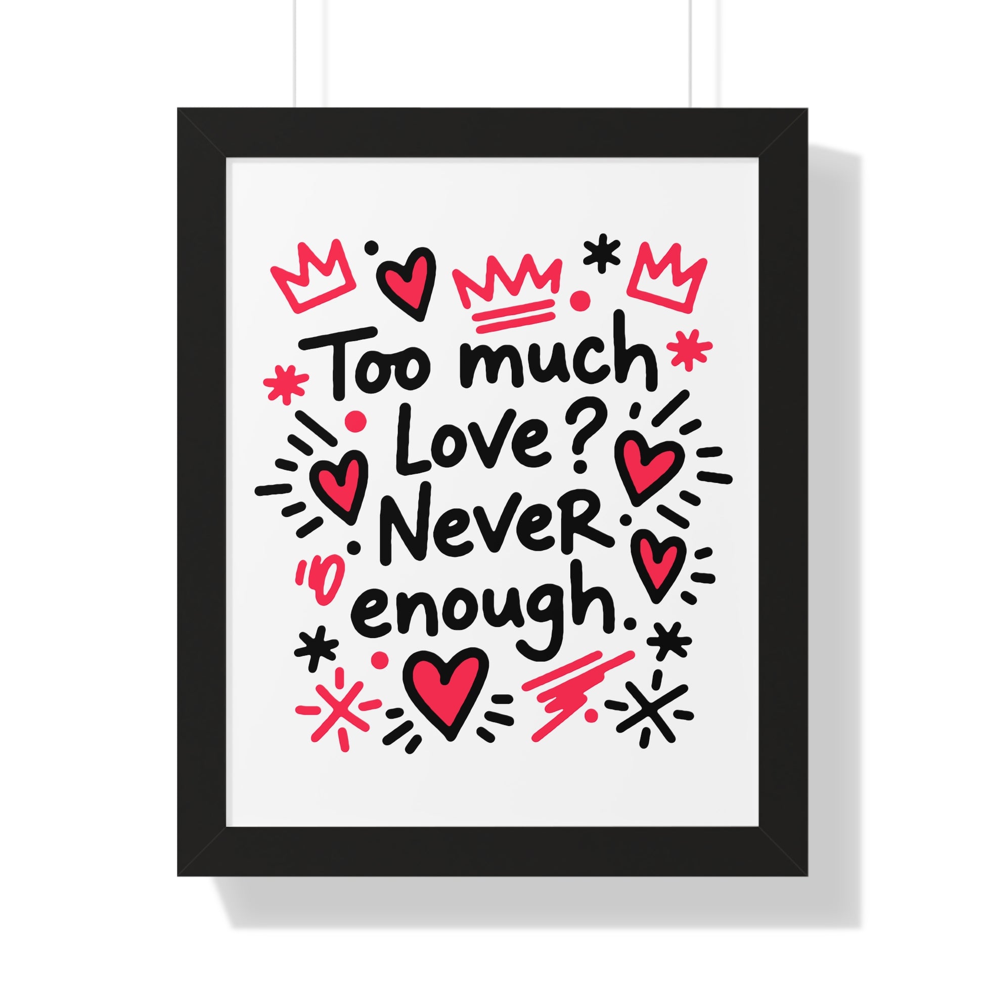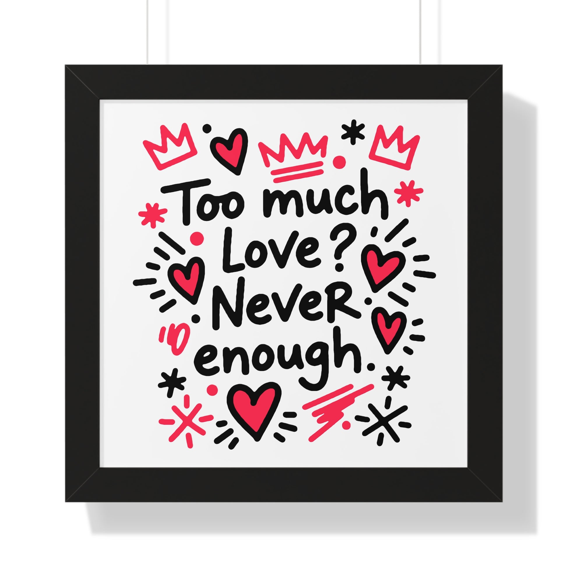This vertical framed poster brings bold, hand-drawn energy into a room with playful hearts, crowns, and confident lettering that reads “Too much love? Never enough.” Printed on museum-quality matte paper and protected behind a clear acrylic cover, the piece feels spontaneous and warm while keeping a polished, gallery-ready finish. Choose a black, white, or walnut frame in lightweight Ayous wood or sturdy MDF to match your decor. It hangs easily with built-in hardware or included hanging pieces, arriving ready to display above a desk, in a hallway, or as part of a cozy gallery wall for someone who celebrates big feelings and joyful expression.