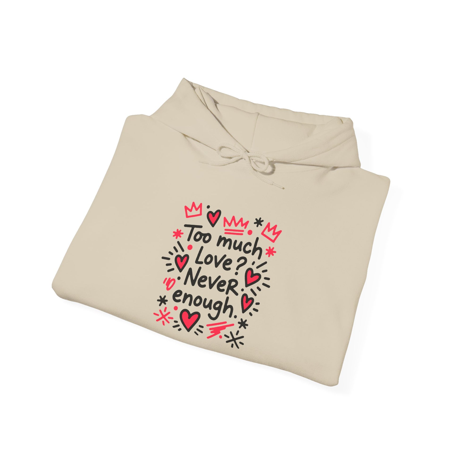 Soft, warm, and quietly expressive—this hoodie wears its heart on the front. A clean white pullover with a hand-drawn-style graphic reading “Too much love? Never enough,” surrounded by tiny hearts, crowns, and doodled stars. The roomy kangaroo pocket and double-lined hood make it a go-to layer for slow mornings, midnight walks, or cozy nights in. It slips easily into the wardrobes of people who celebrate gentle optimism and like clothing that feels like a small, wearable note of encouragement.