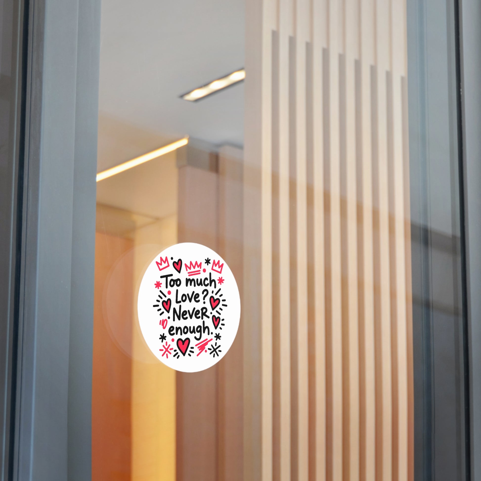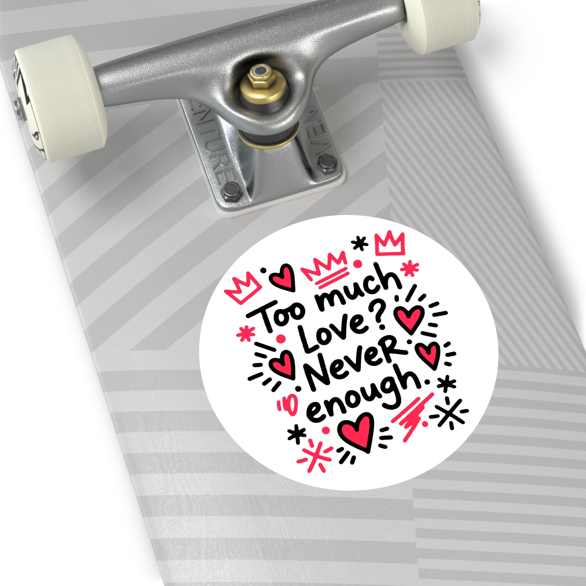 Bright, hand-drawn energy in a simple circle. This matte round vinyl sticker reads “Too much love? Never enough,” surrounded by playful hearts, crowns, and doodles in bold black and warm red. It sticks to water bottles, laptops, journals, and phone cases—bringing a little confident, affectionate sparkle wherever you place it. The matte surface feels smooth to the touch, and the muted sheen keeps reflections low while the colors stay vibrant under the protective laminate. Use it to mark your favorite things or to leave a tiny, joyful reminder for someone who needs one.