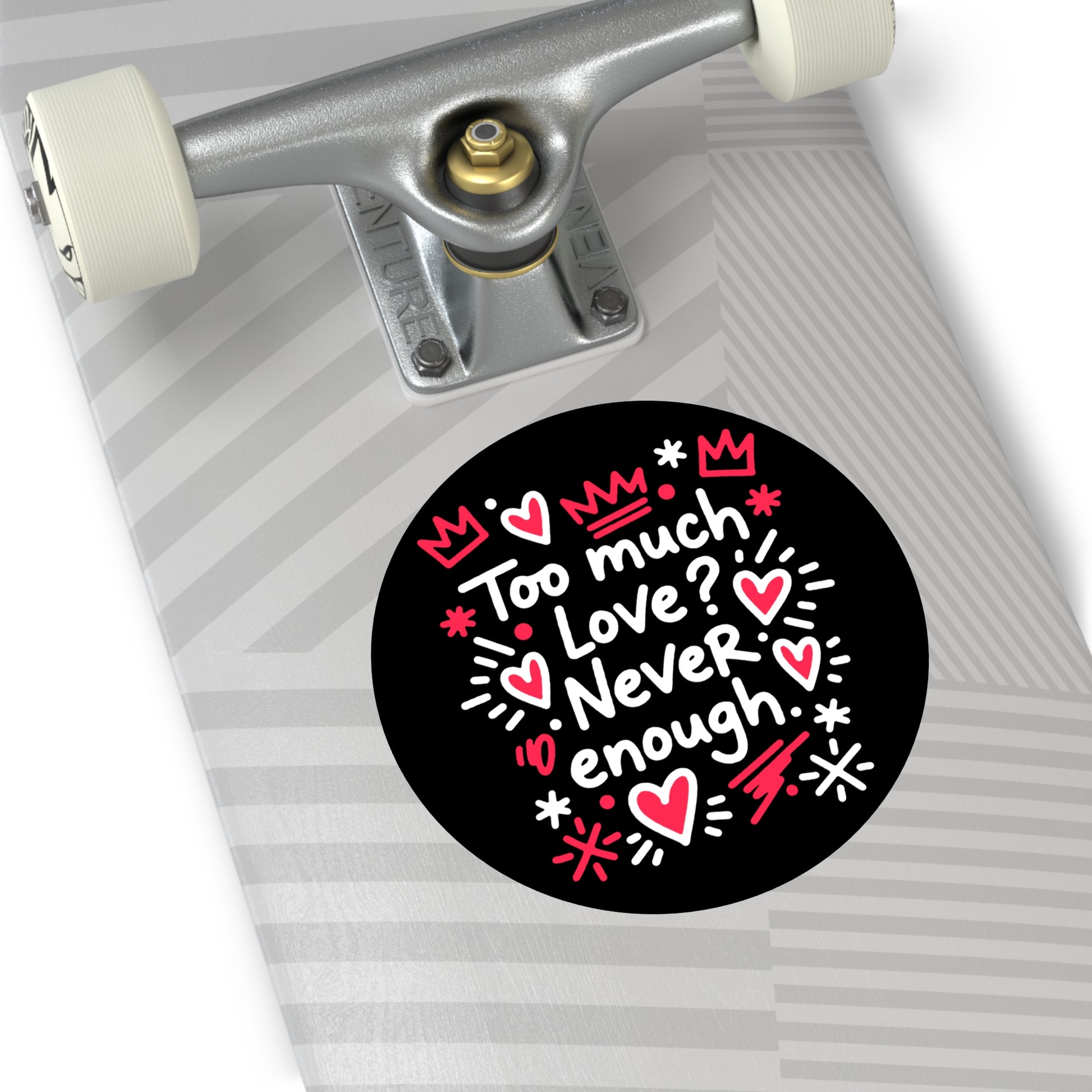 A round matte vinyl sticker that speaks like a handwritten love note: bold white lettering and playful red doodles on a deep black background that read, “Too much love? Never enough.” It feels energetic and sincere—like leaving a small, bright secret on a laptop, water bottle, journal, or guitar case. The sticker’s smooth matte surface and protective UV laminate keep the colors rich while resisting sun and rain, so the message stays vivid whether it’s tagging a commuter mug or brightening a bedroom mirror. Lightweight and easy to apply, it peels cleanly and sticks firmly with waterproof adhesive, bringing a touch of affectionate, slightly rebellious charm to everyday things.